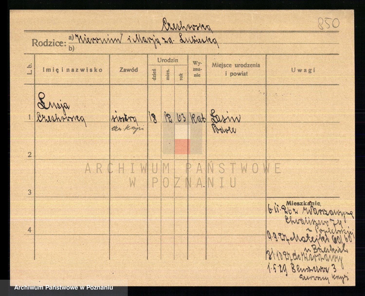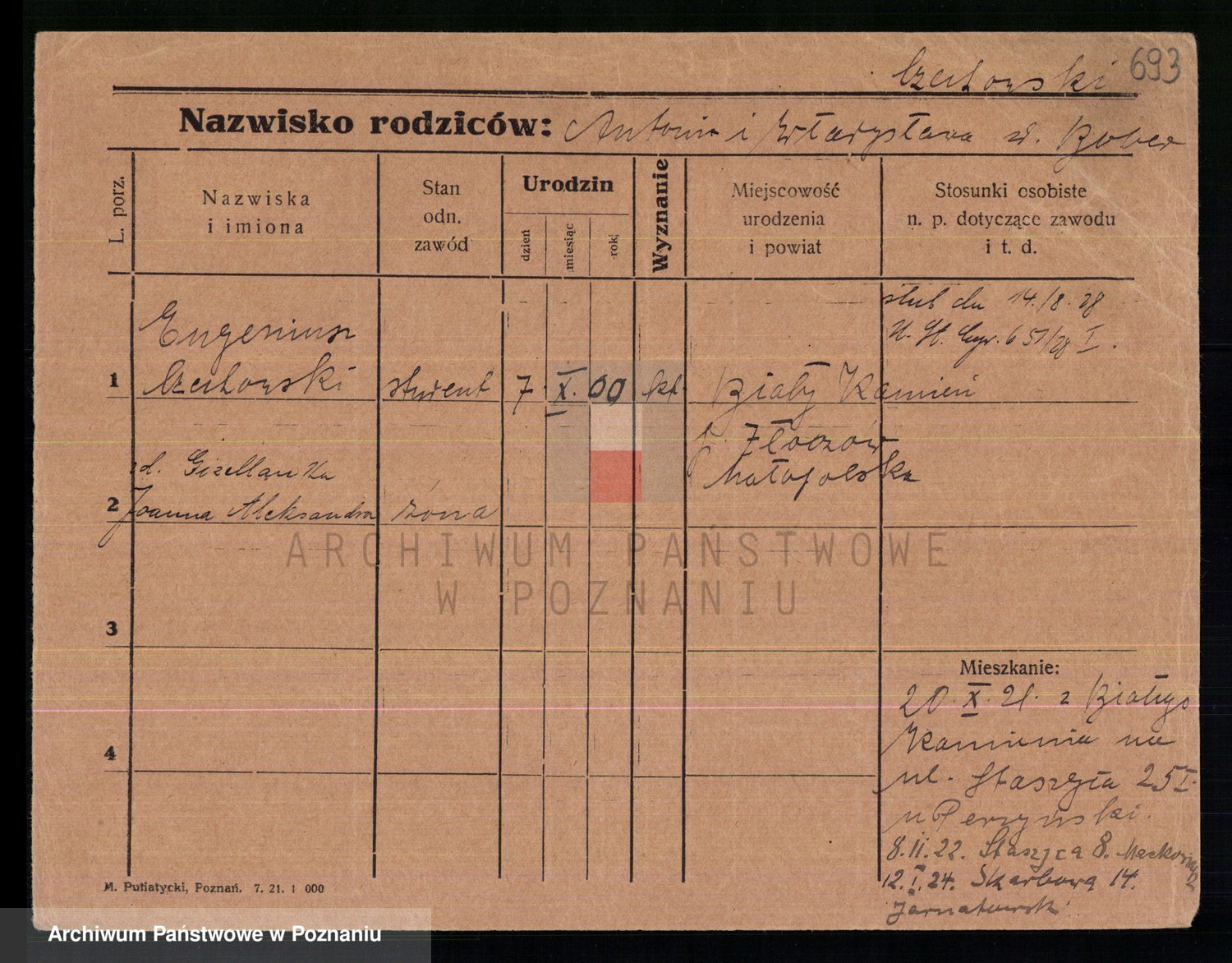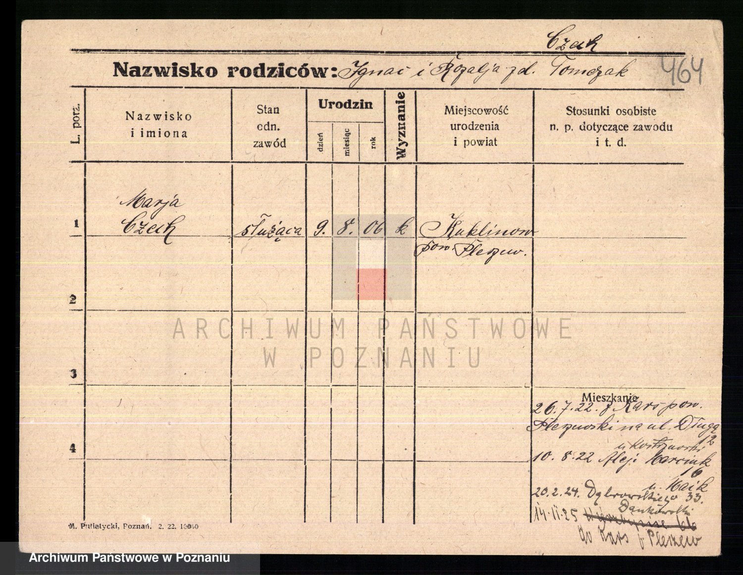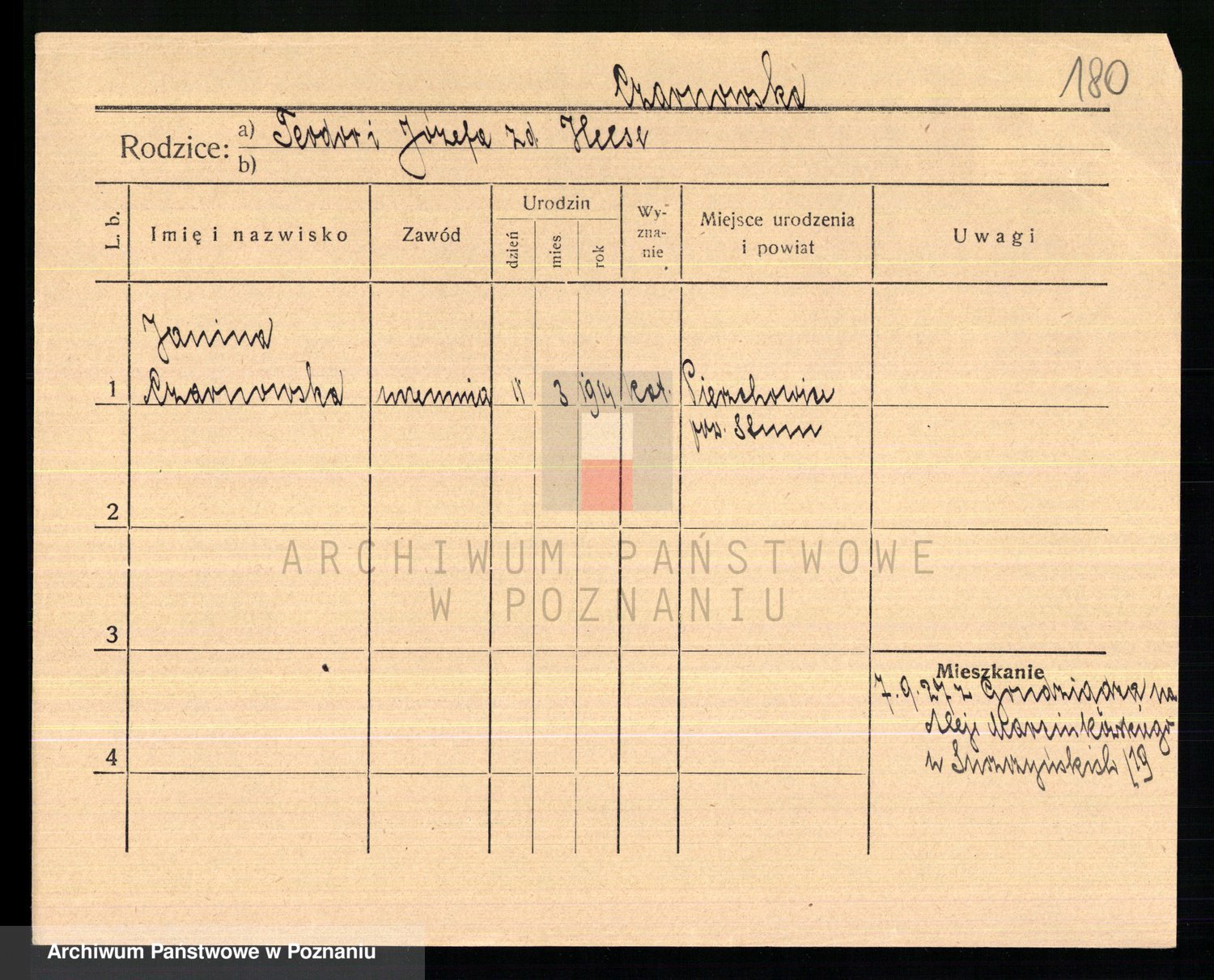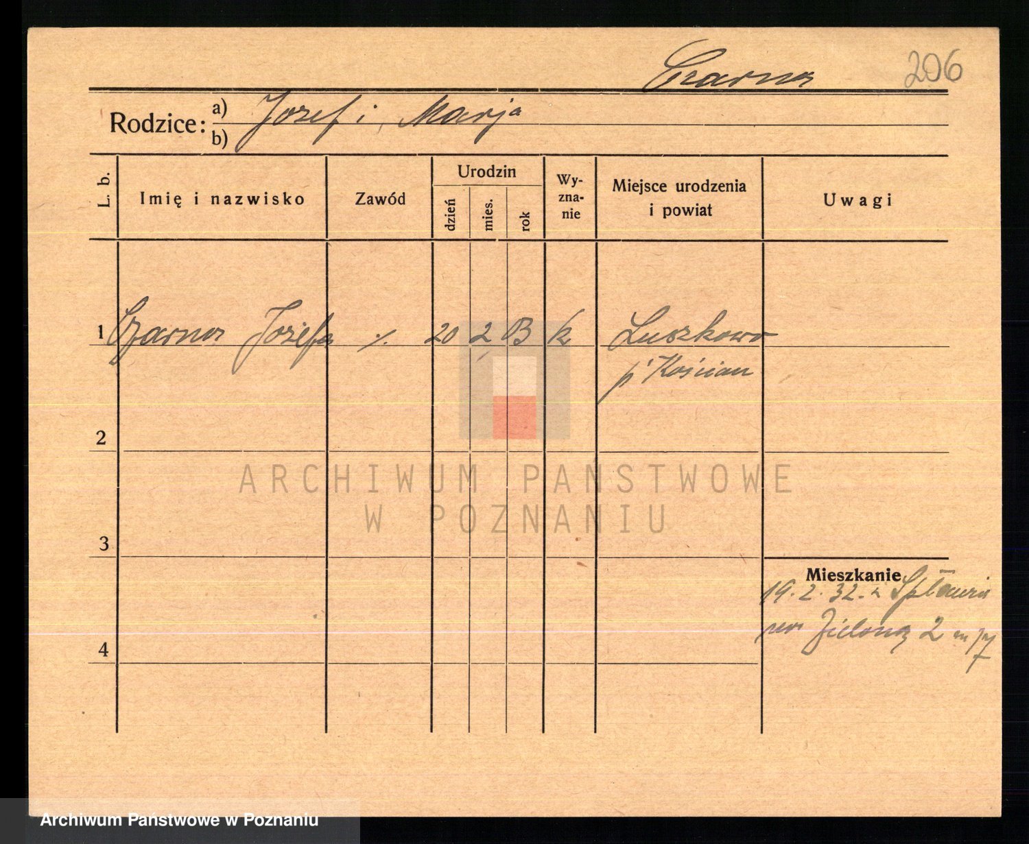 Podgląd karty osobowej dostępny jest po kliknięciu na nazwisko lub ikonkę karty. Można dokonywać powiększenia (ikony na górze) lub przechodzić między kolejnymi skanami (strzałki po bokach).