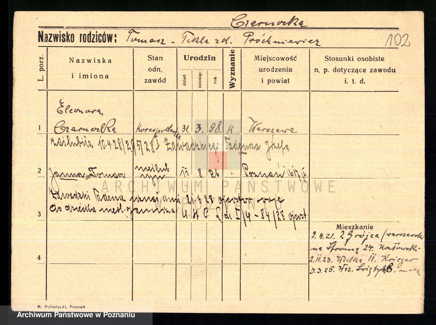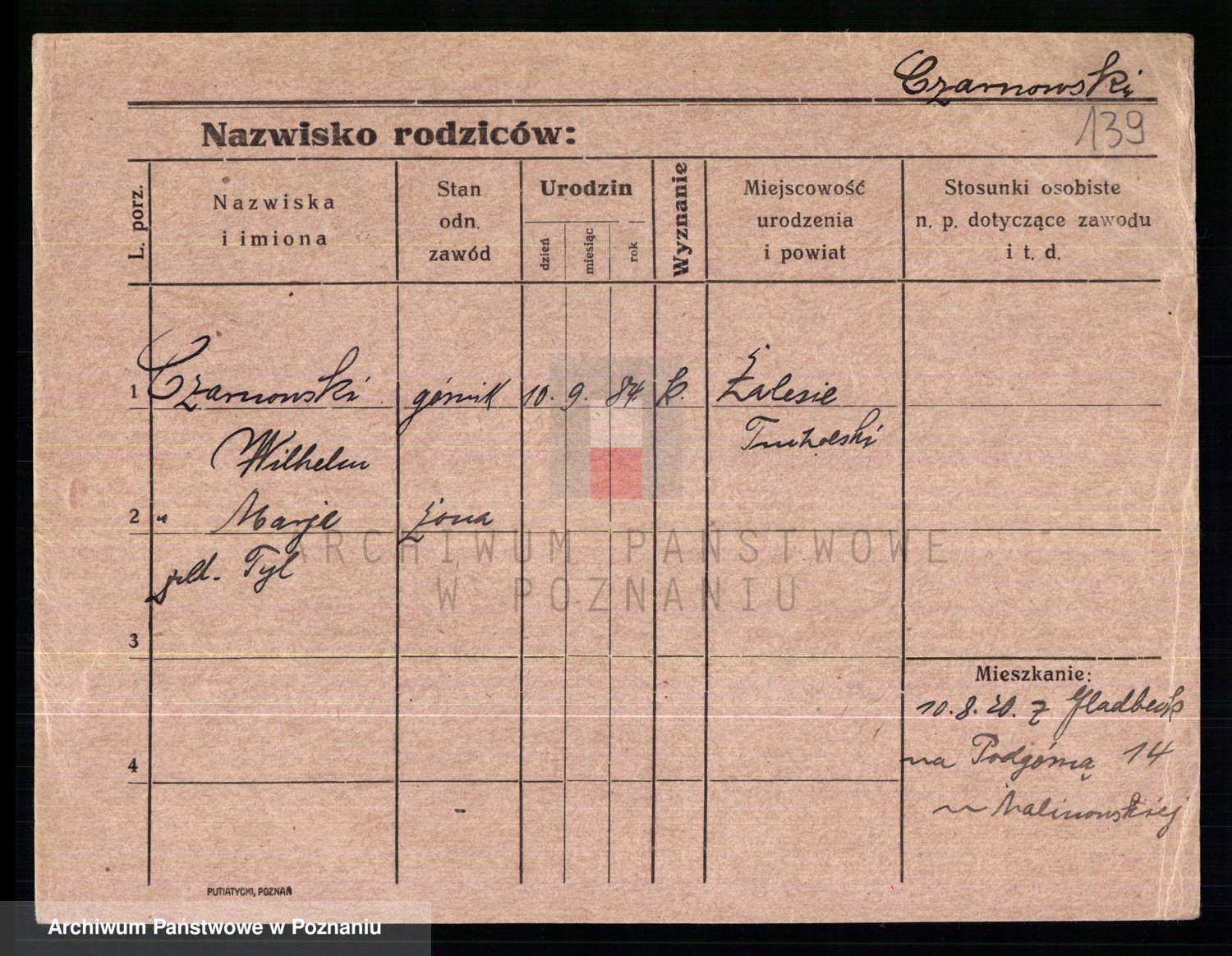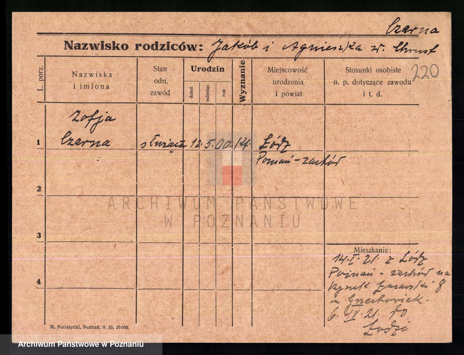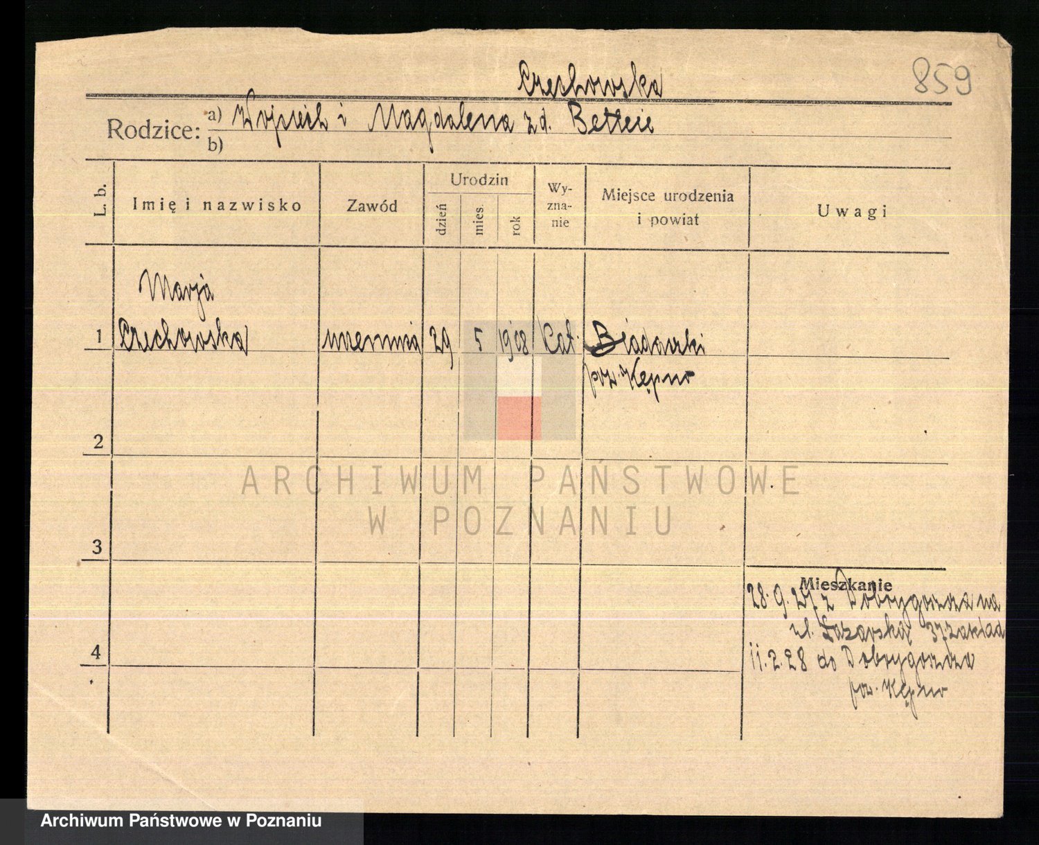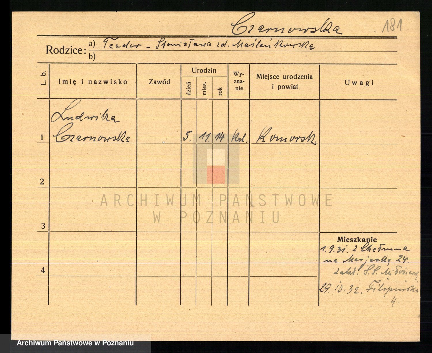 Podgląd karty osobowej dostępny jest po kliknięciu na nazwisko lub ikonkę karty. Można dokonywać powiększenia (ikony na górze) lub przechodzić między kolejnymi skanami (strzałki po bokach).