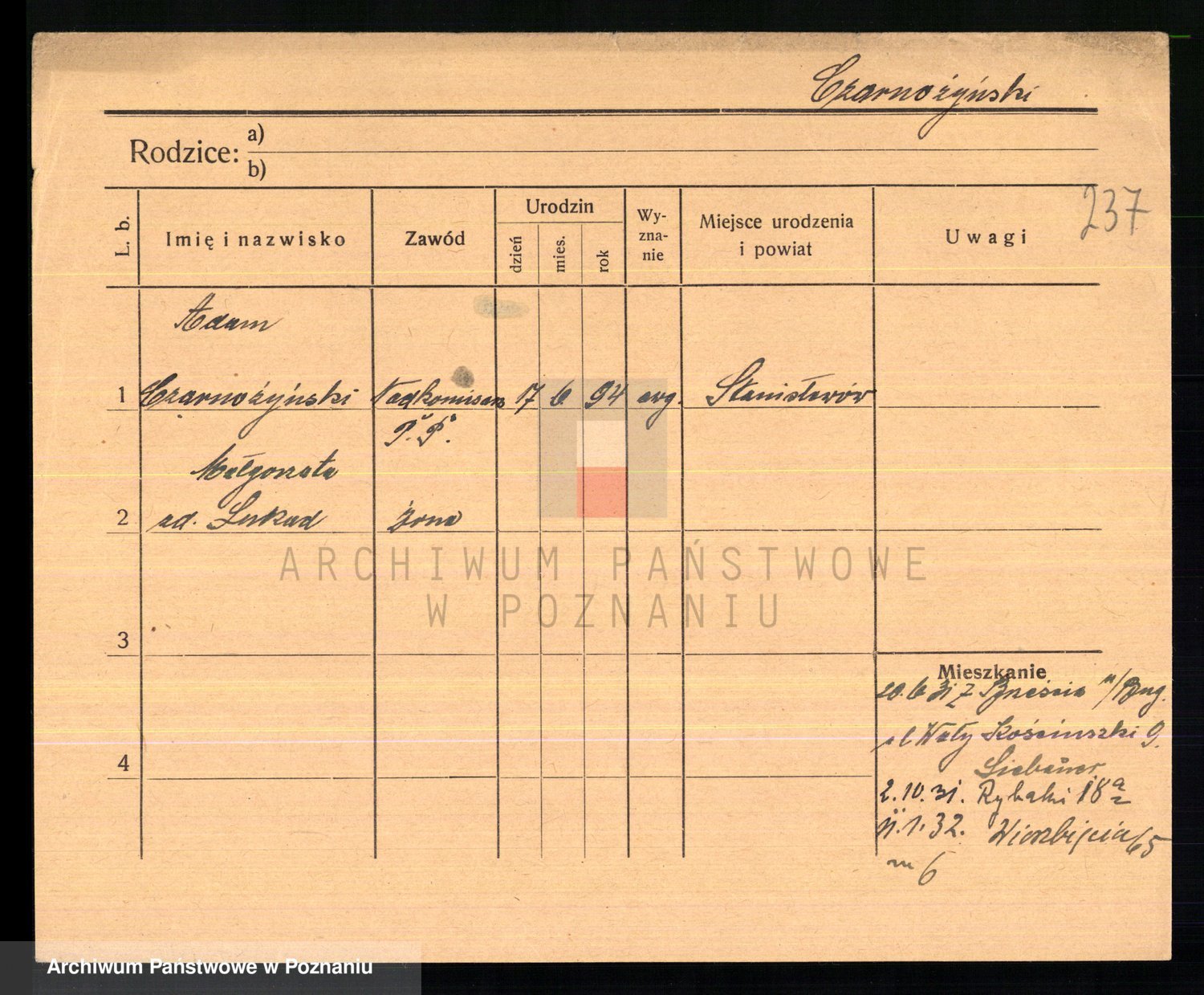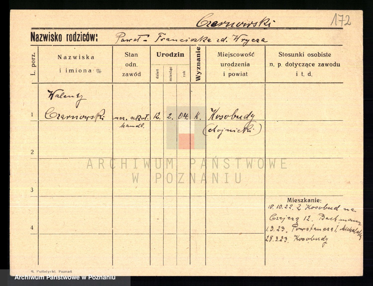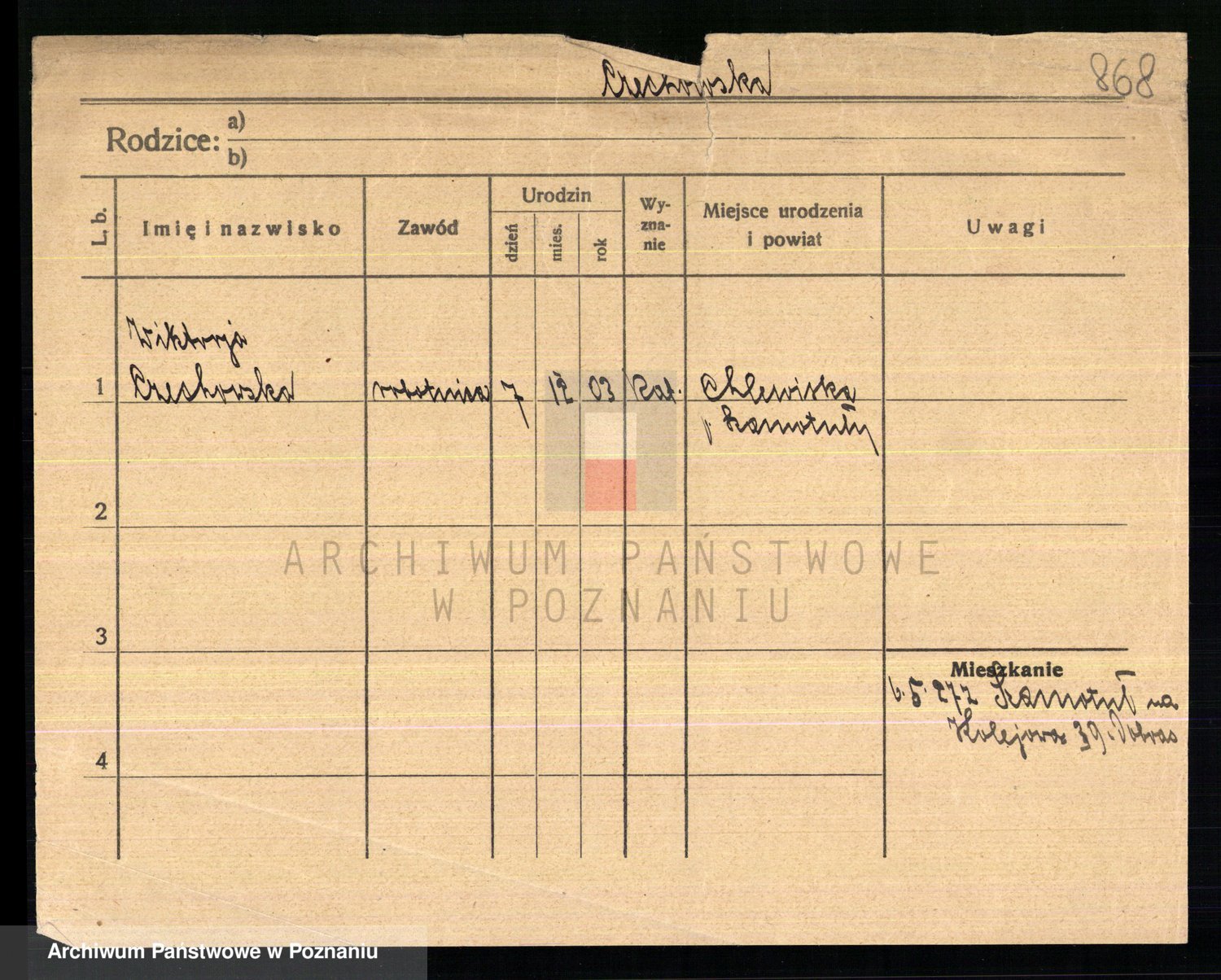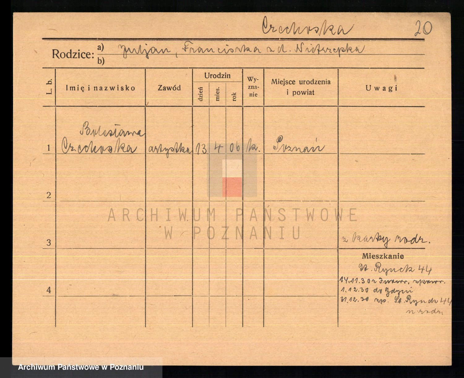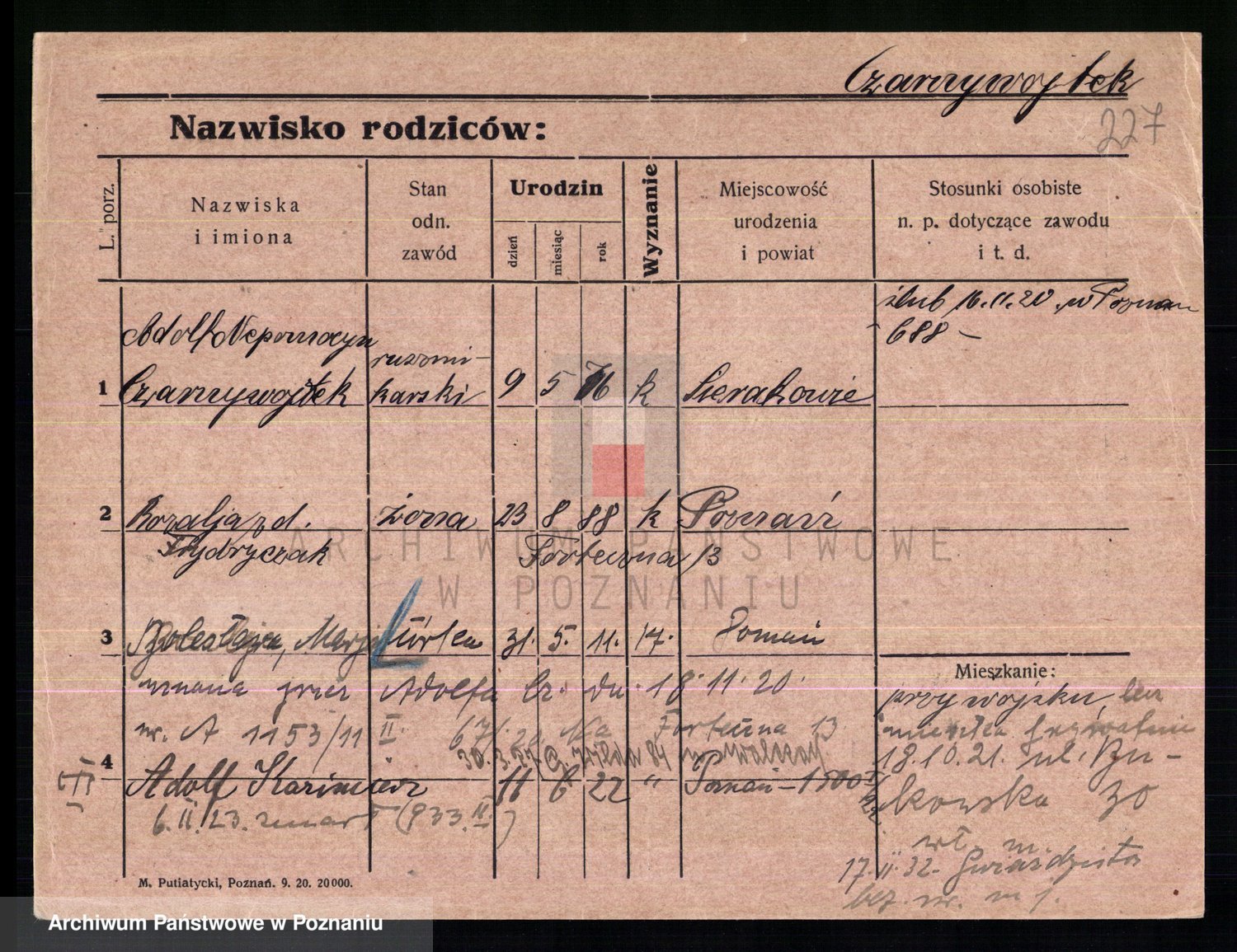 Podgląd karty osobowej dostępny jest po kliknięciu na nazwisko lub ikonkę karty. Można dokonywać powiększenia (ikony na górze) lub przechodzić między kolejnymi skanami (strzałki po bokach).