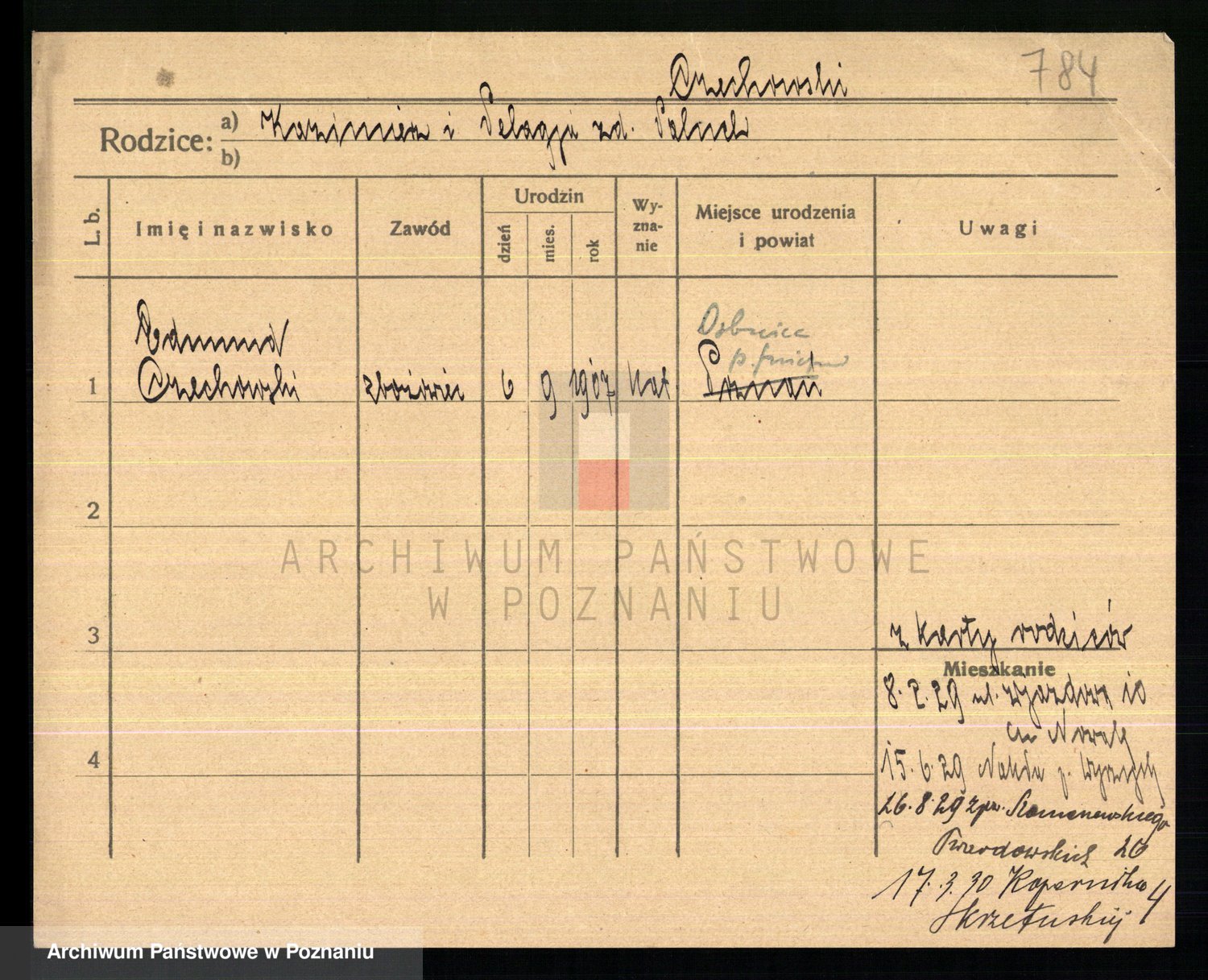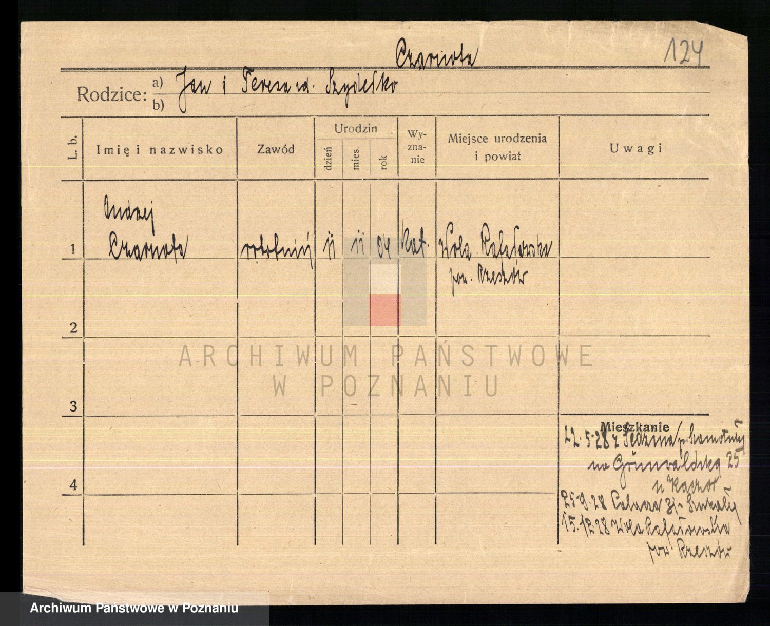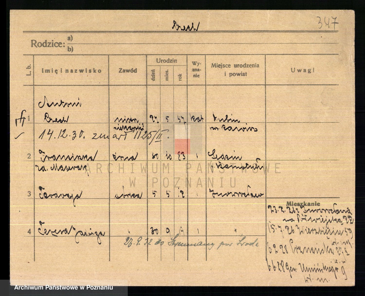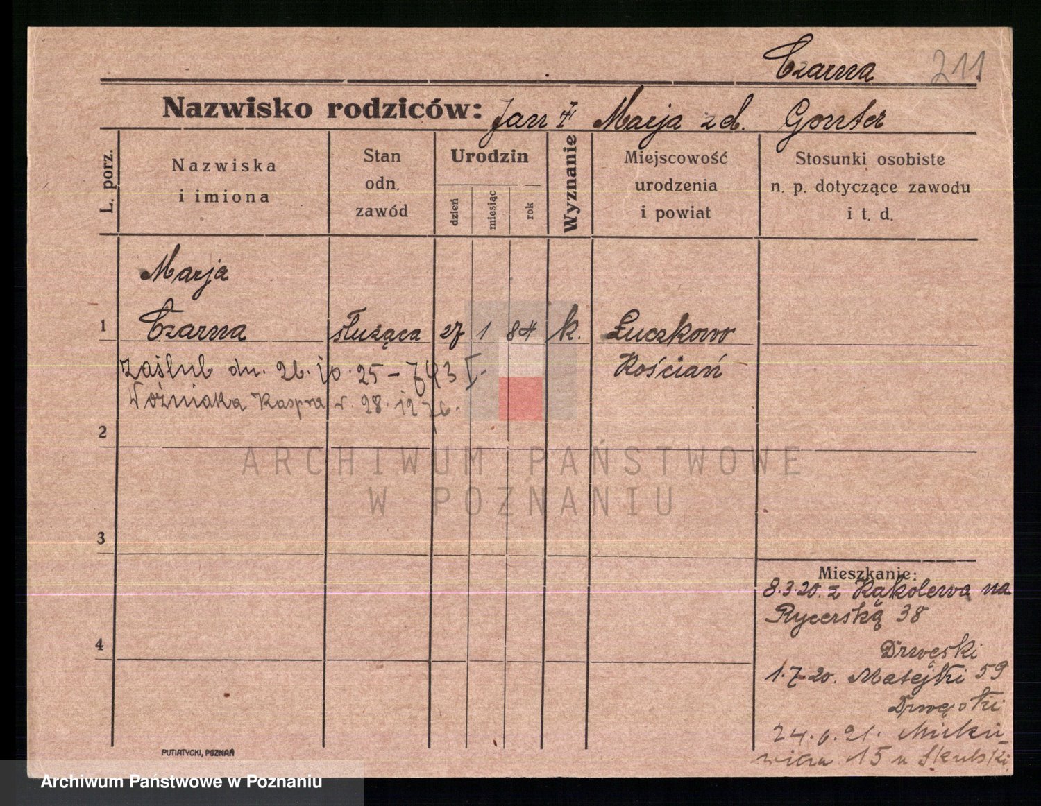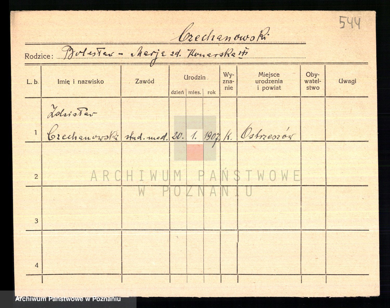 Podgląd karty osobowej dostępny jest po kliknięciu na nazwisko lub ikonkę karty. Można dokonywać powiększenia (ikony na górze) lub przechodzić między kolejnymi skanami (strzałki po bokach).