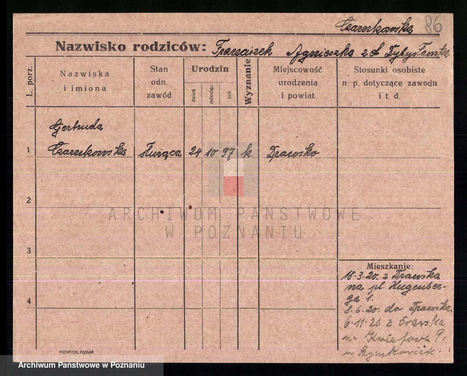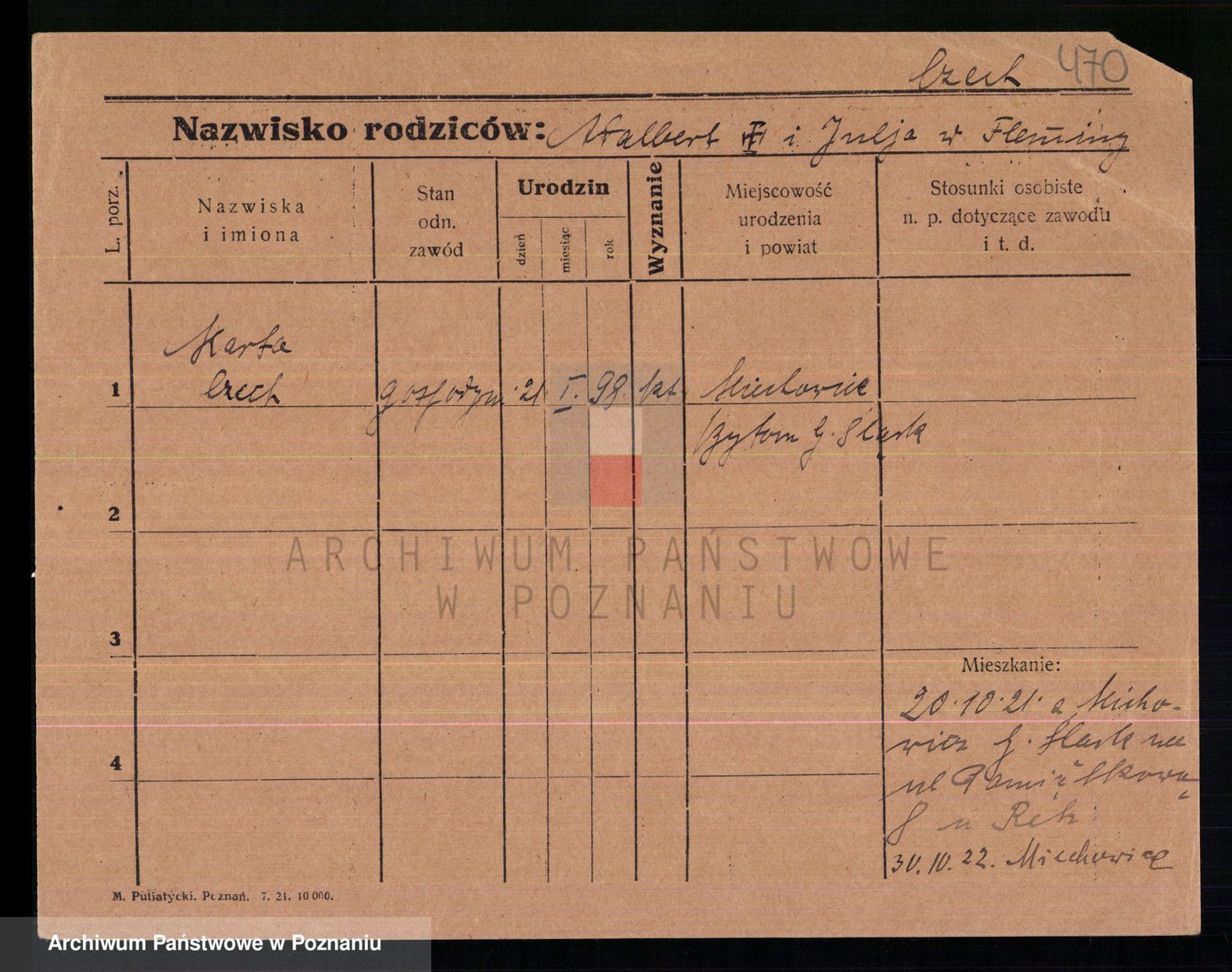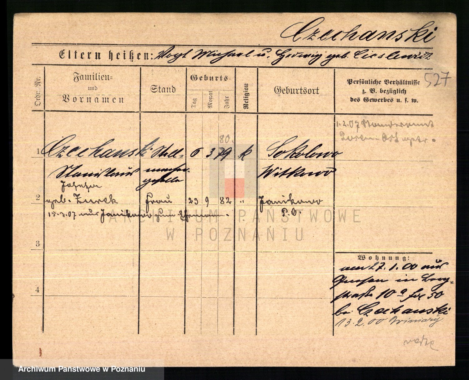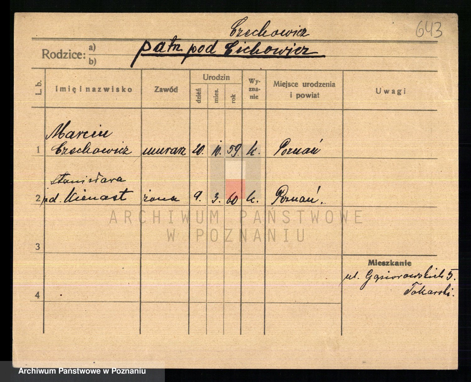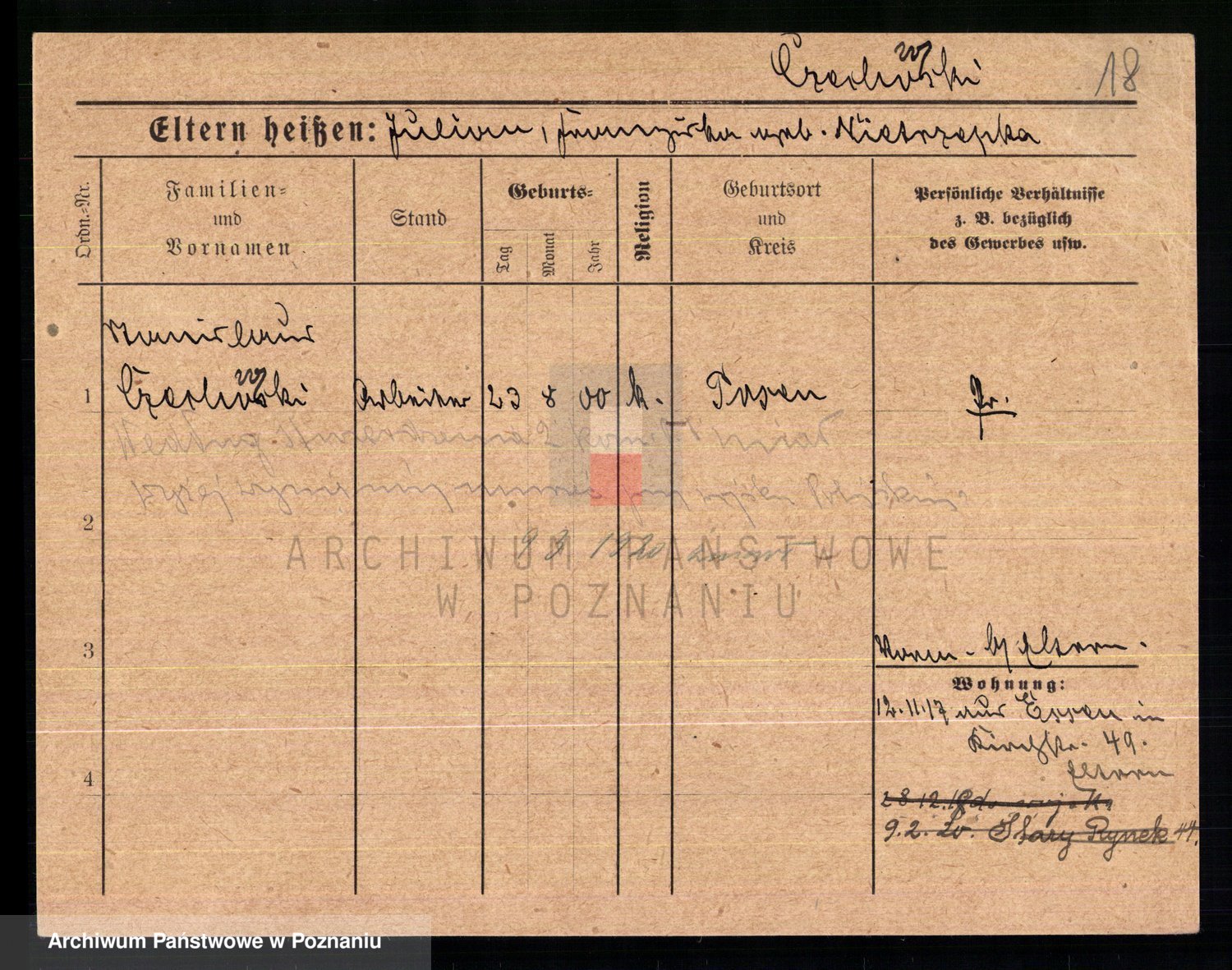 Podgląd karty osobowej dostępny jest po kliknięciu na nazwisko lub ikonkę karty. Można dokonywać powiększenia (ikony na górze) lub przechodzić między kolejnymi skanami (strzałki po bokach).