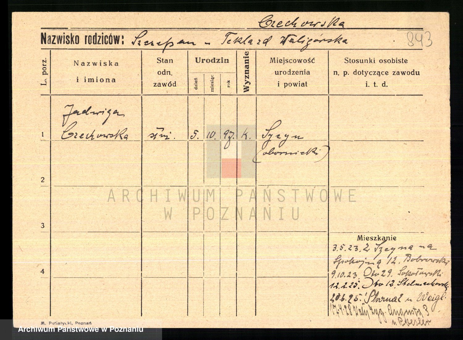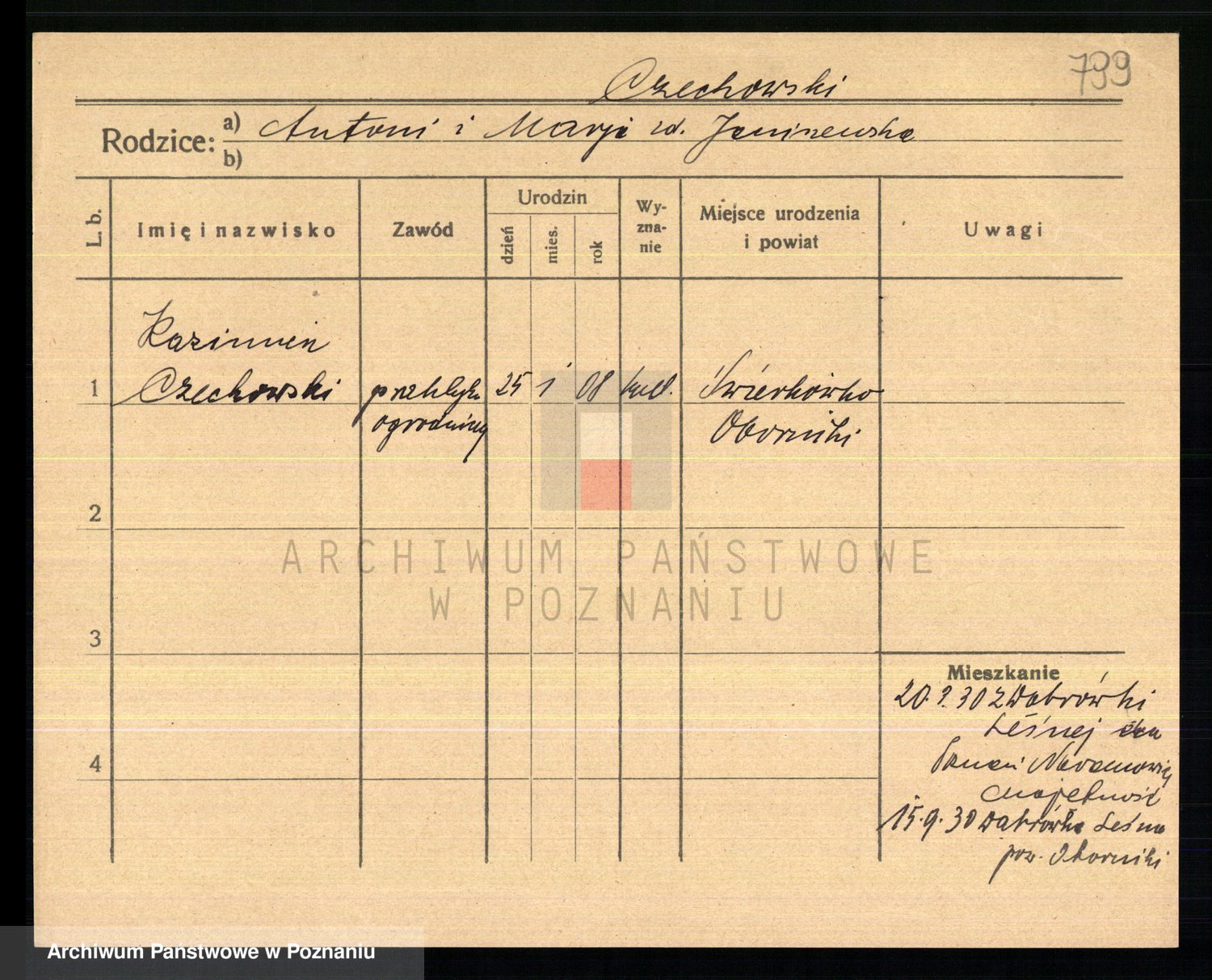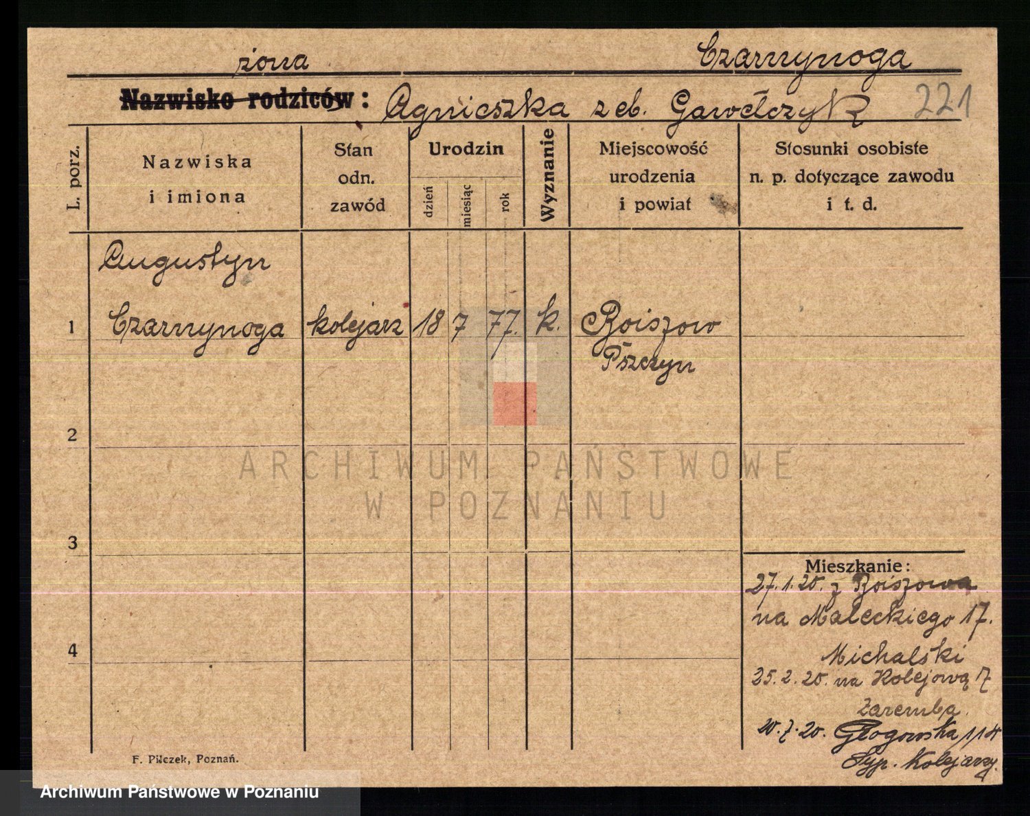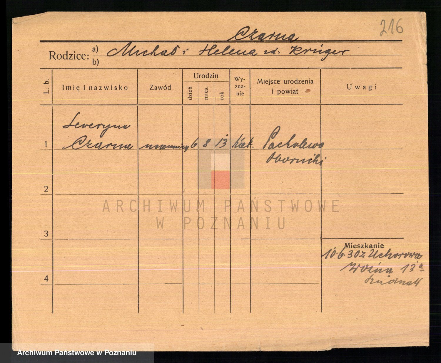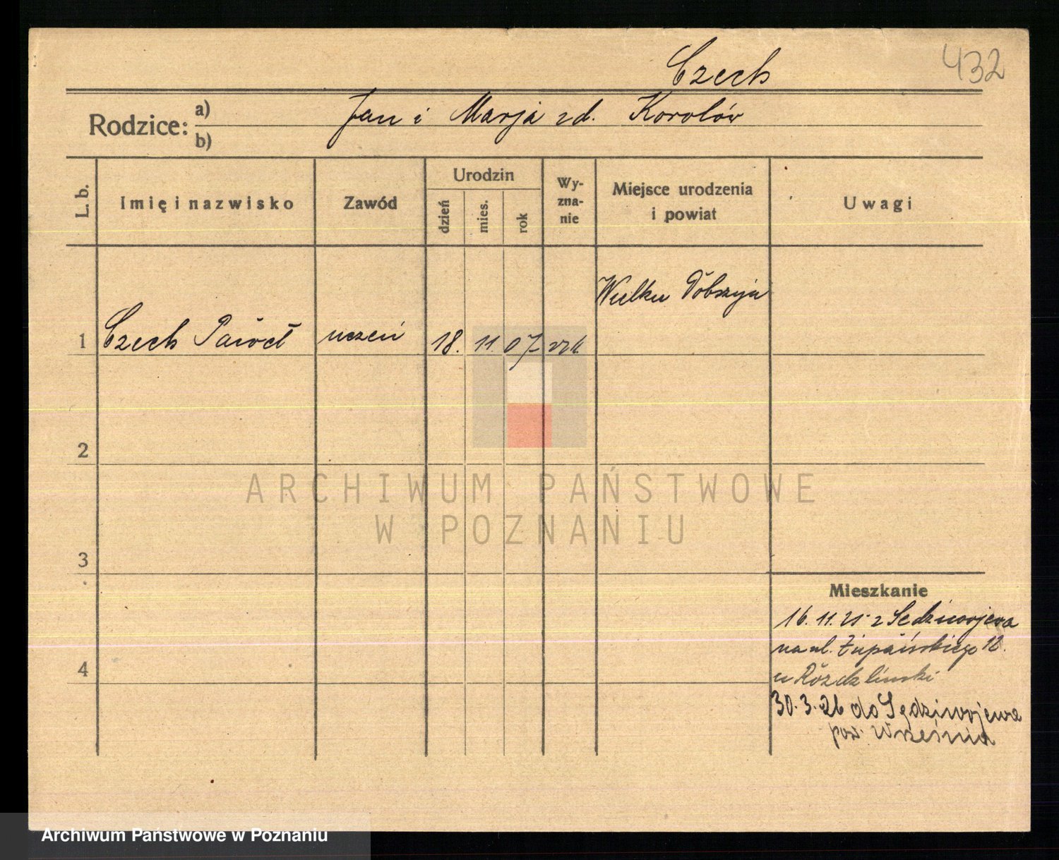 Podgląd karty osobowej dostępny jest po kliknięciu na nazwisko lub ikonkę karty. Można dokonywać powiększenia (ikony na górze) lub przechodzić między kolejnymi skanami (strzałki po bokach).