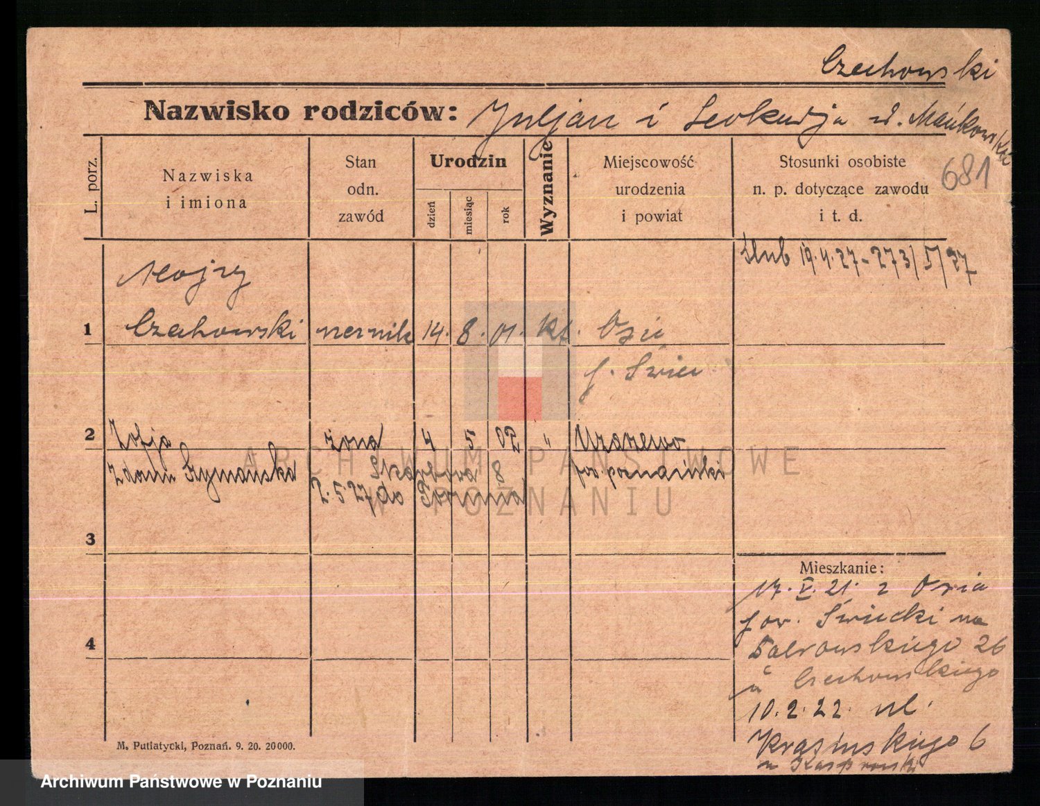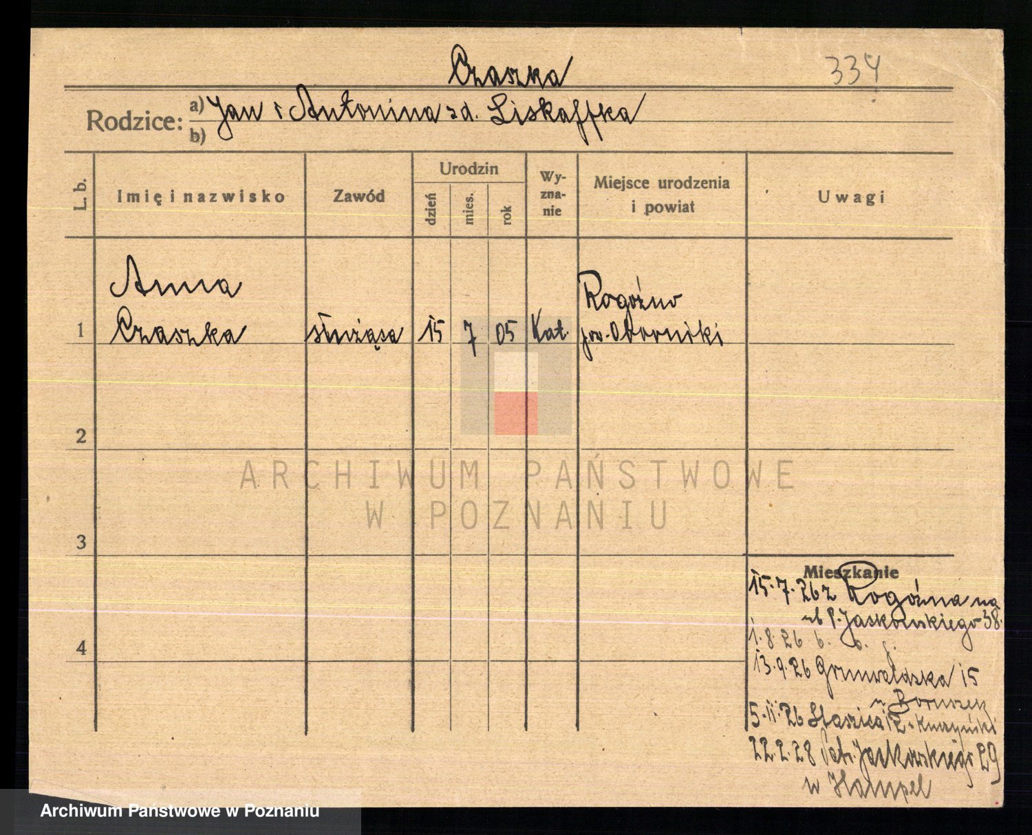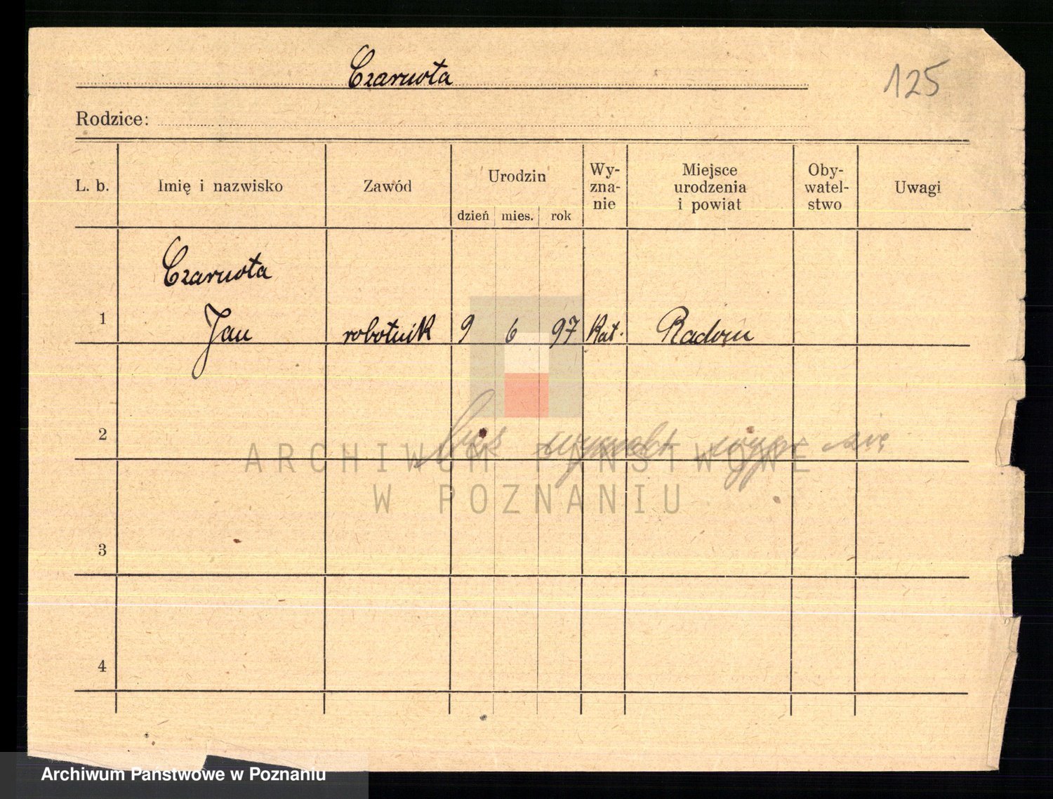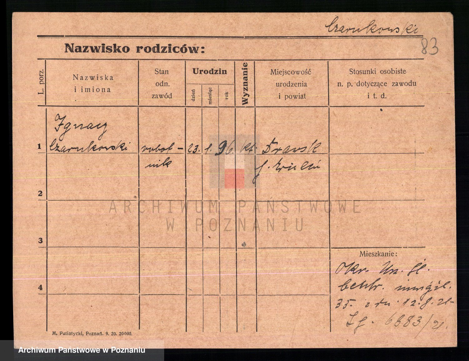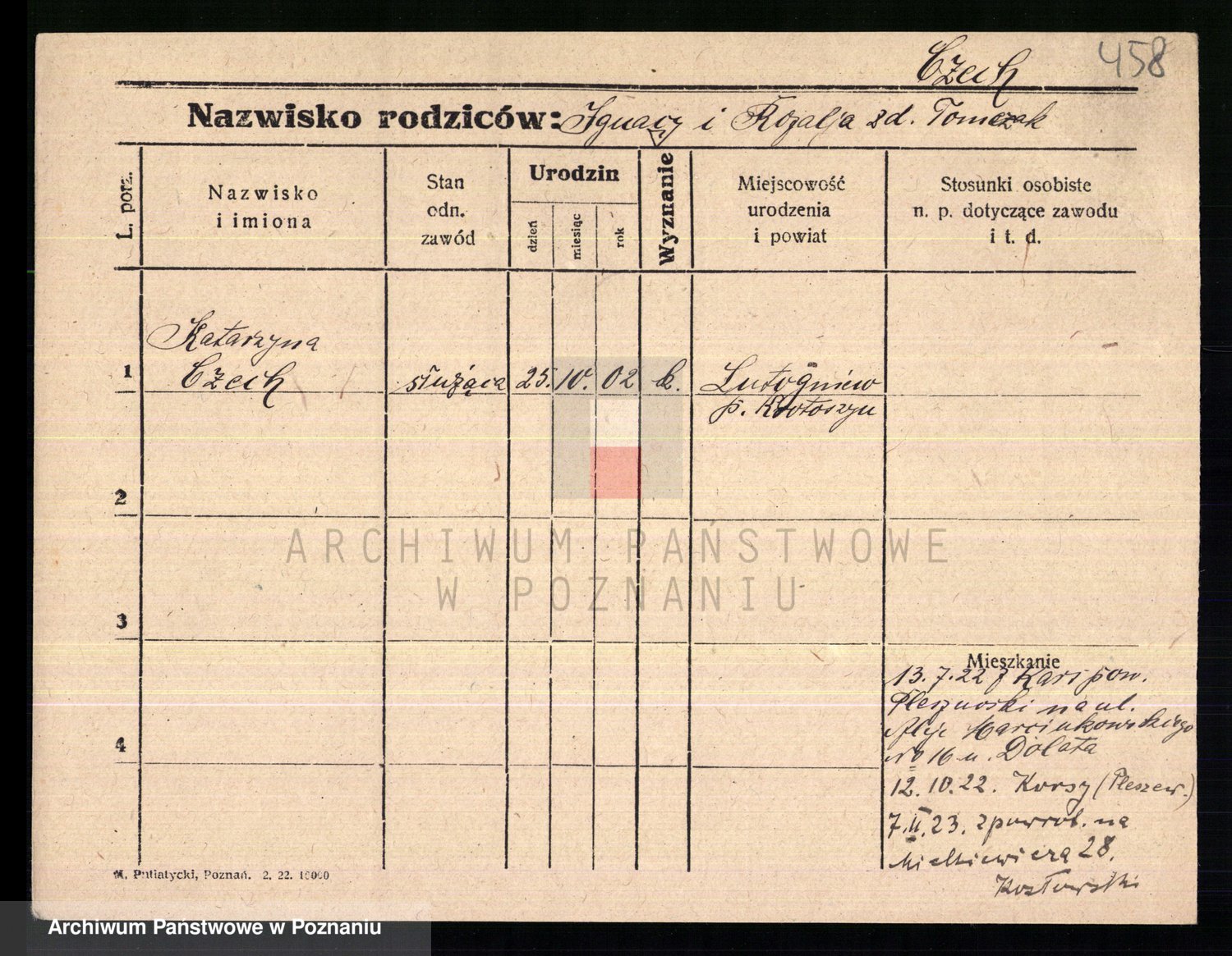 Podgląd karty osobowej dostępny jest po kliknięciu na nazwisko lub ikonkę karty. Można dokonywać powiększenia (ikony na górze) lub przechodzić między kolejnymi skanami (strzałki po bokach).
