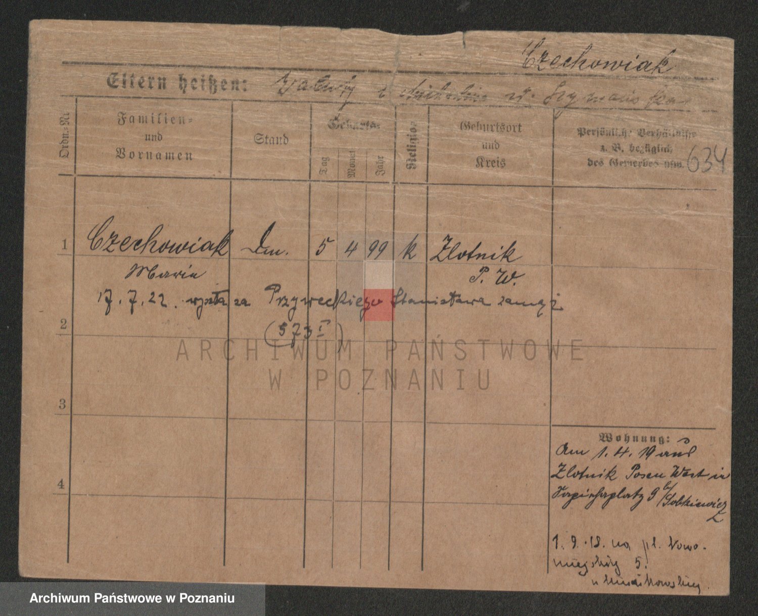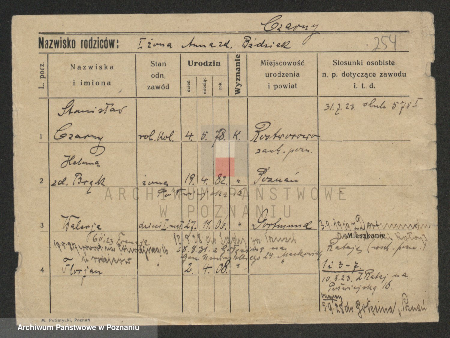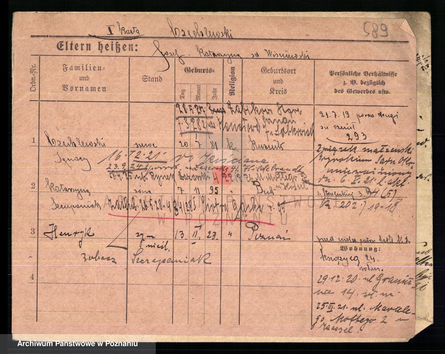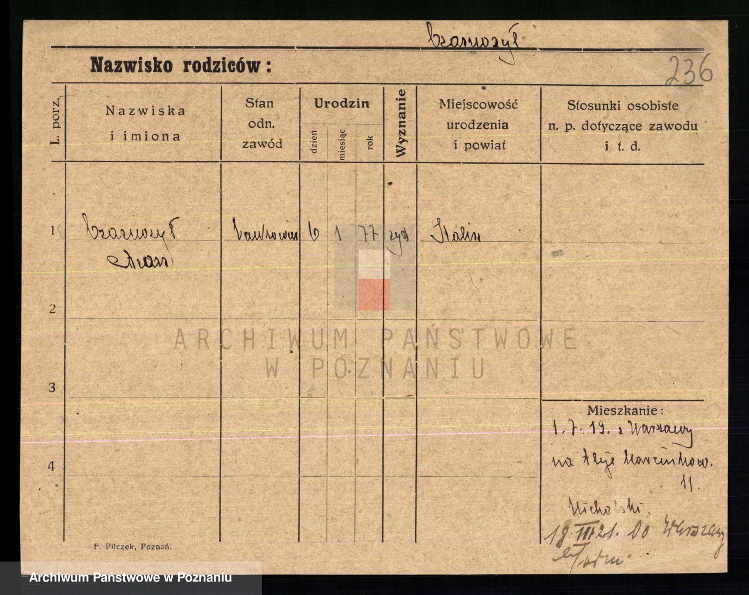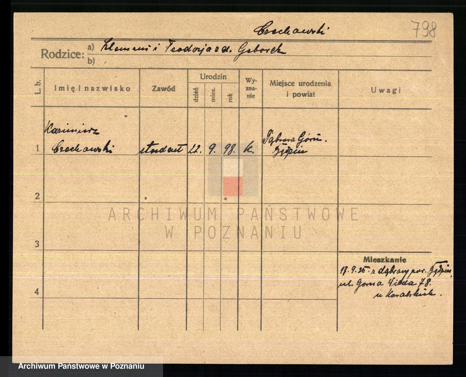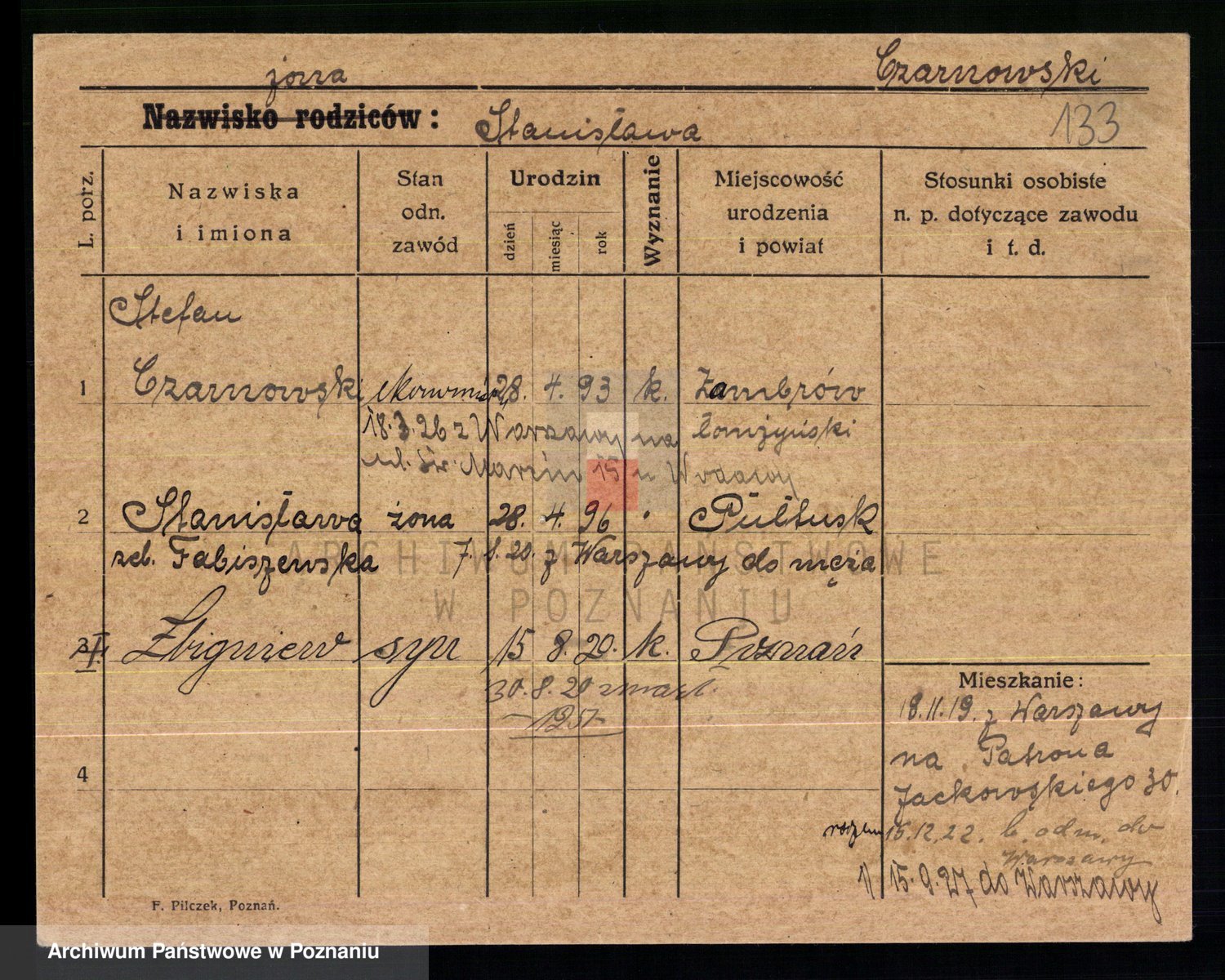 Podgląd karty osobowej dostępny jest po kliknięciu na nazwisko lub ikonkę karty. Można dokonywać powiększenia (ikony na górze) lub przechodzić między kolejnymi skanami (strzałki po bokach).