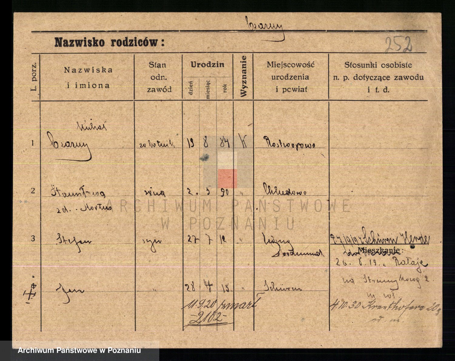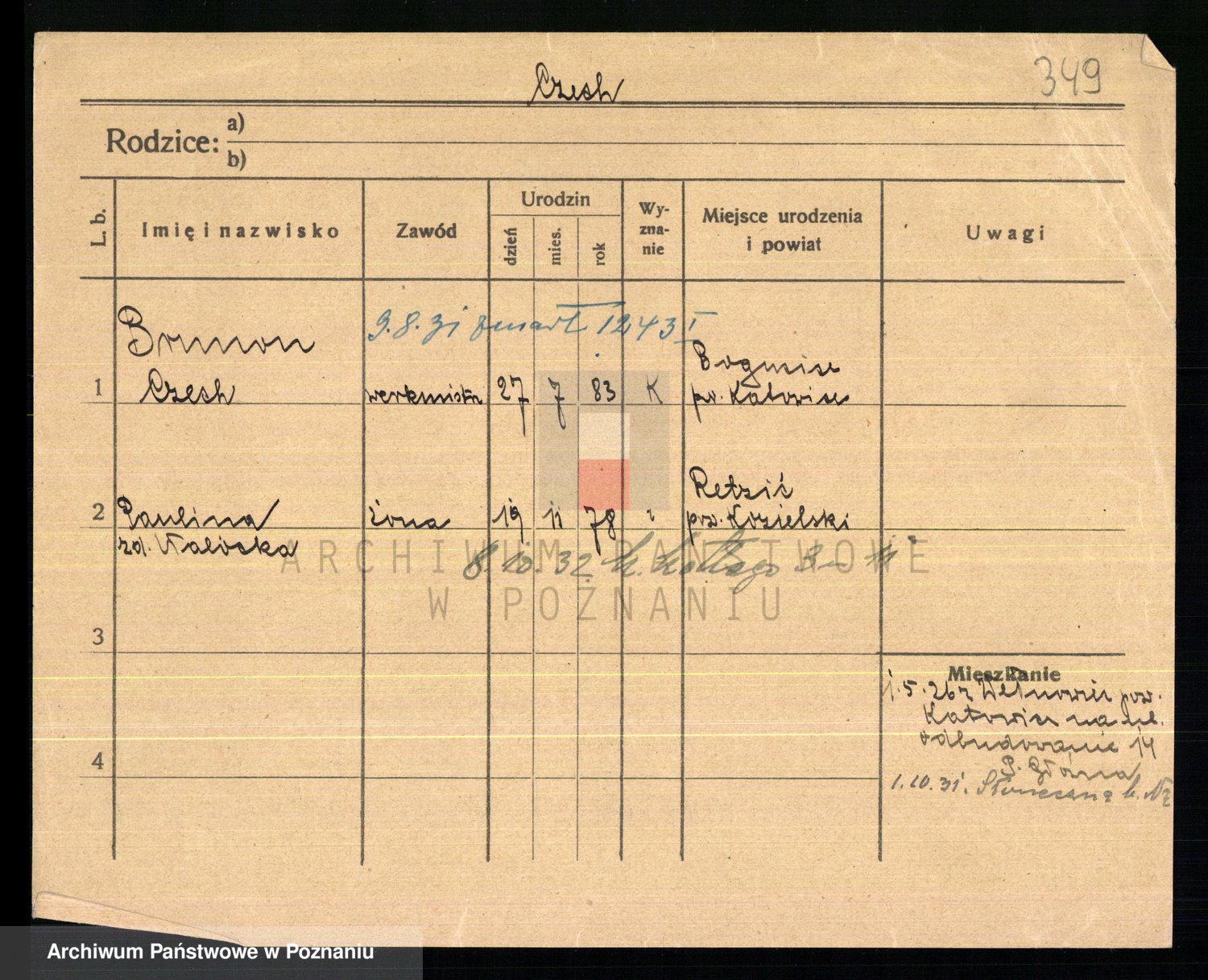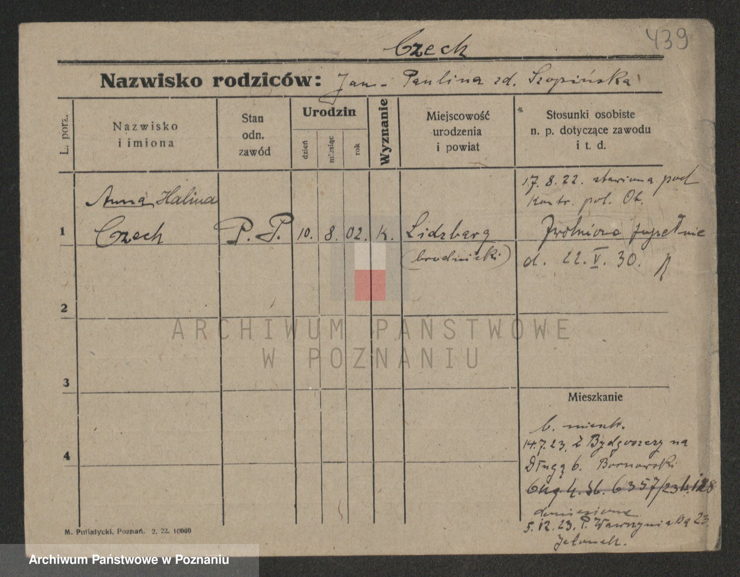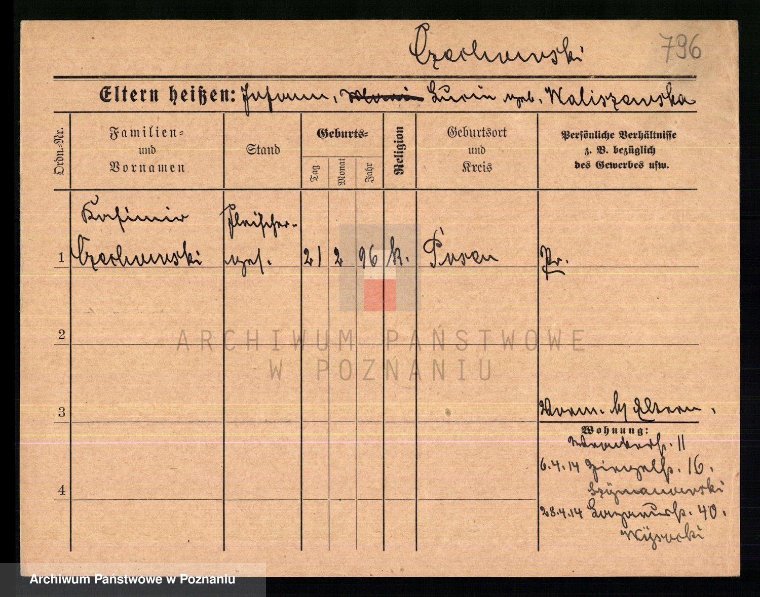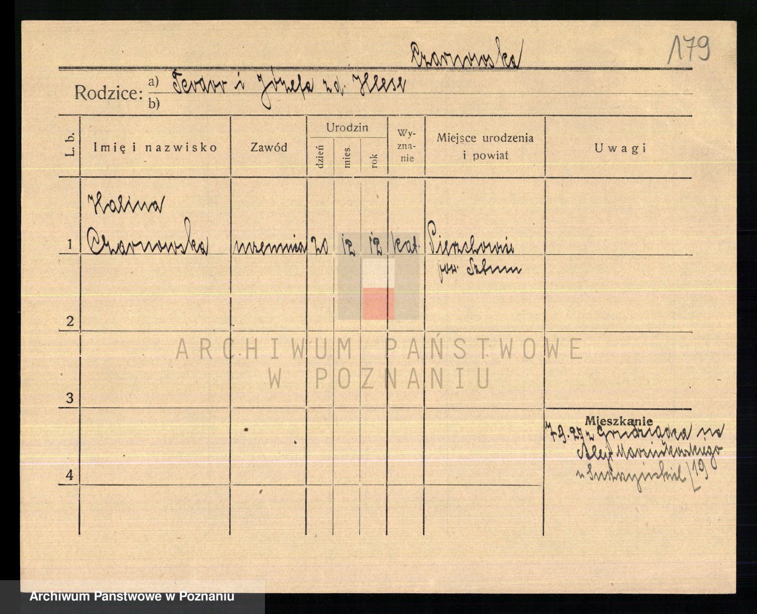 Podgląd karty osobowej dostępny jest po kliknięciu na nazwisko lub ikonkę karty. Można dokonywać powiększenia (ikony na górze) lub przechodzić między kolejnymi skanami (strzałki po bokach).