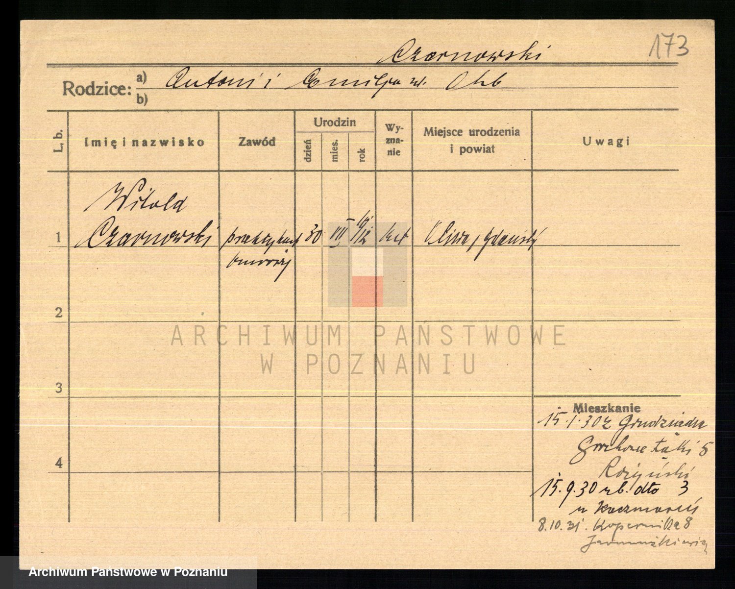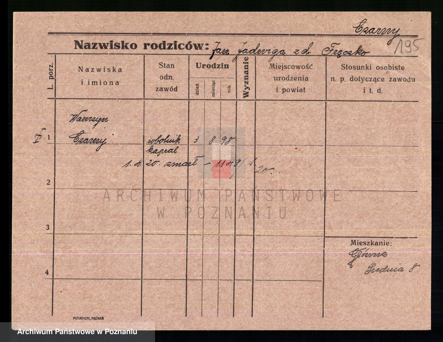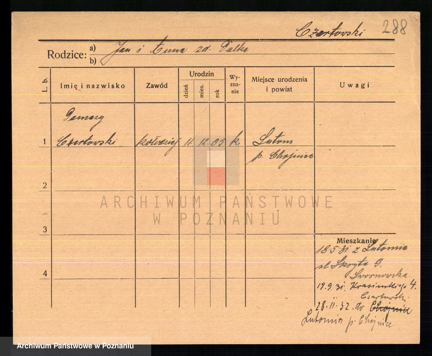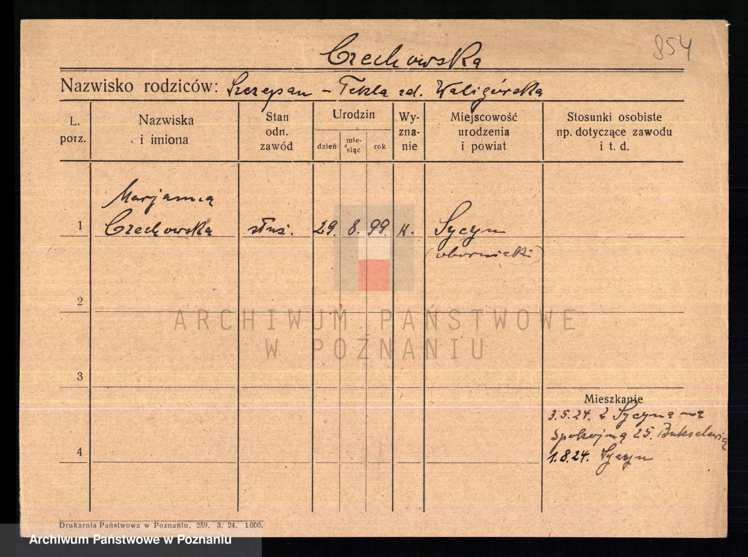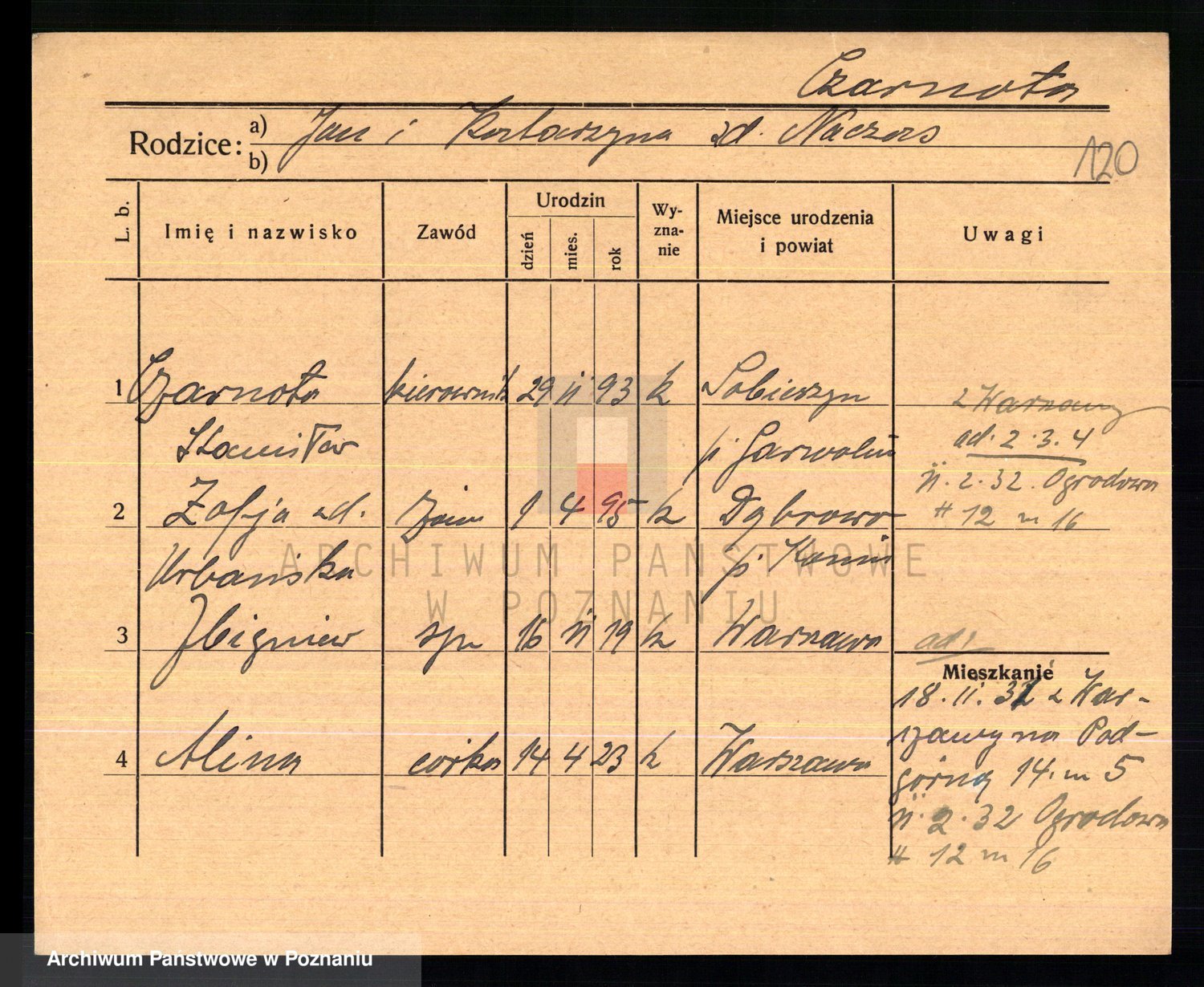 Podgląd karty osobowej dostępny jest po kliknięciu na nazwisko lub ikonkę karty. Można dokonywać powiększenia (ikony na górze) lub przechodzić między kolejnymi skanami (strzałki po bokach).