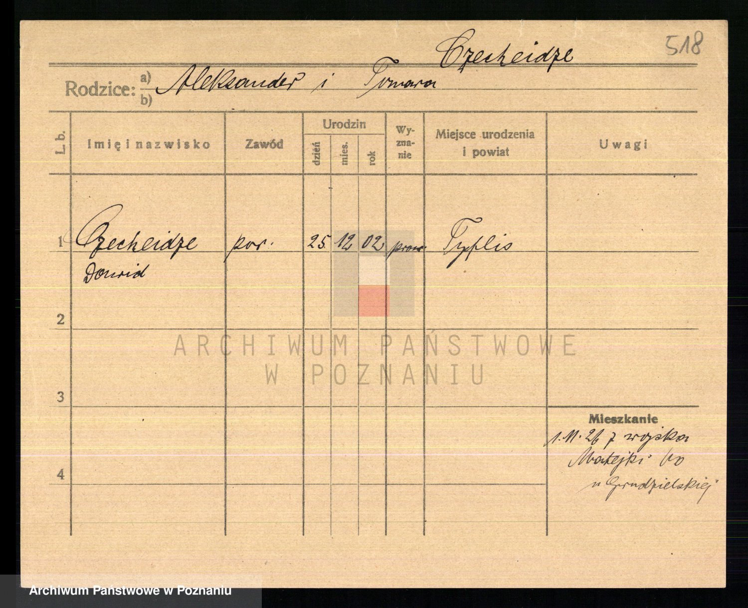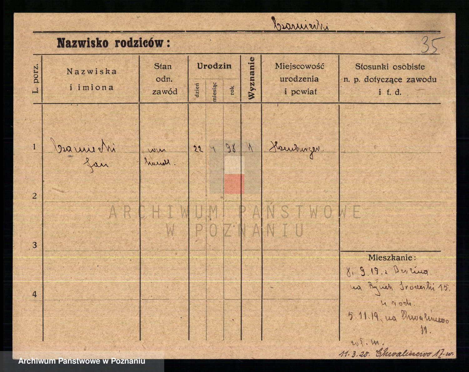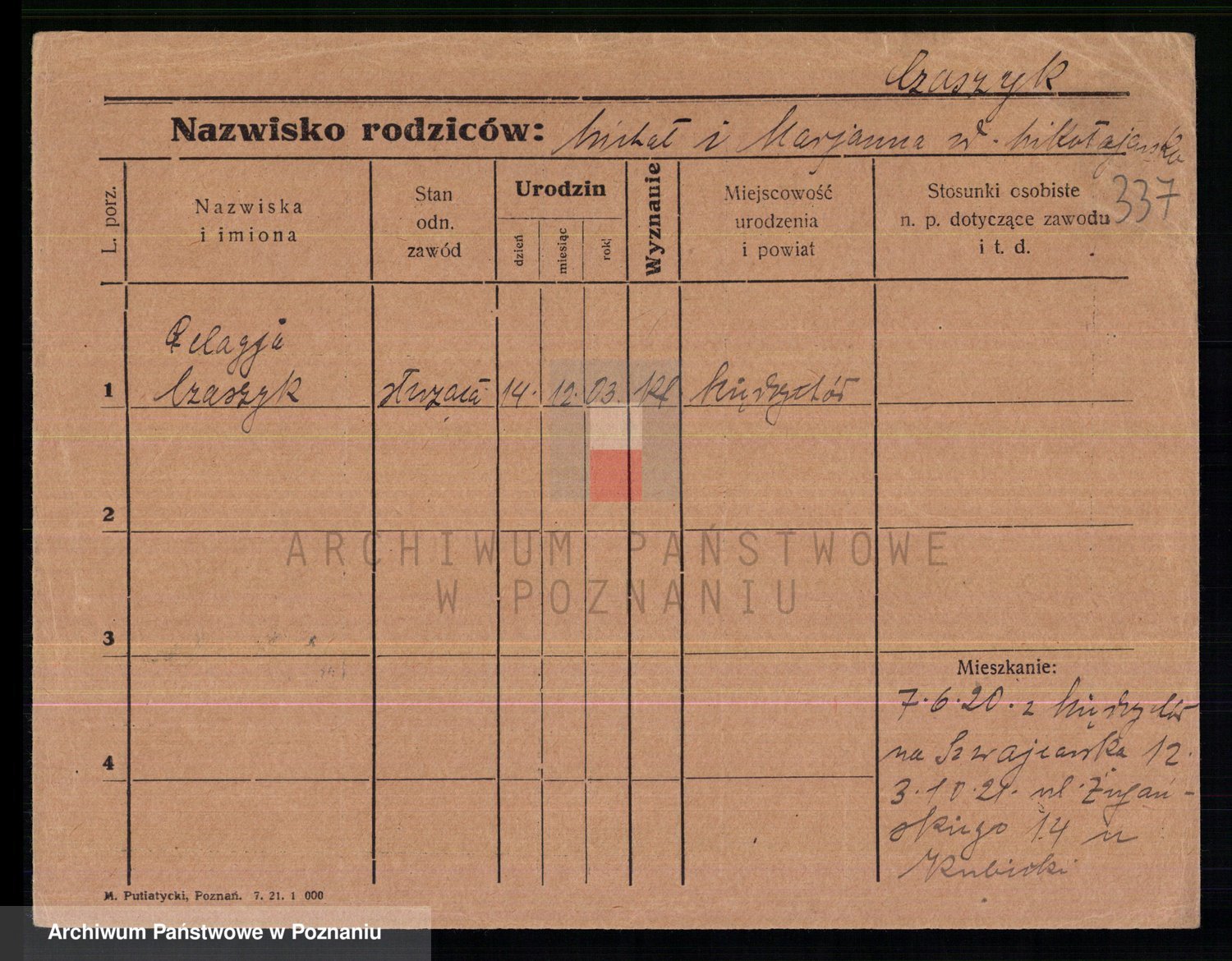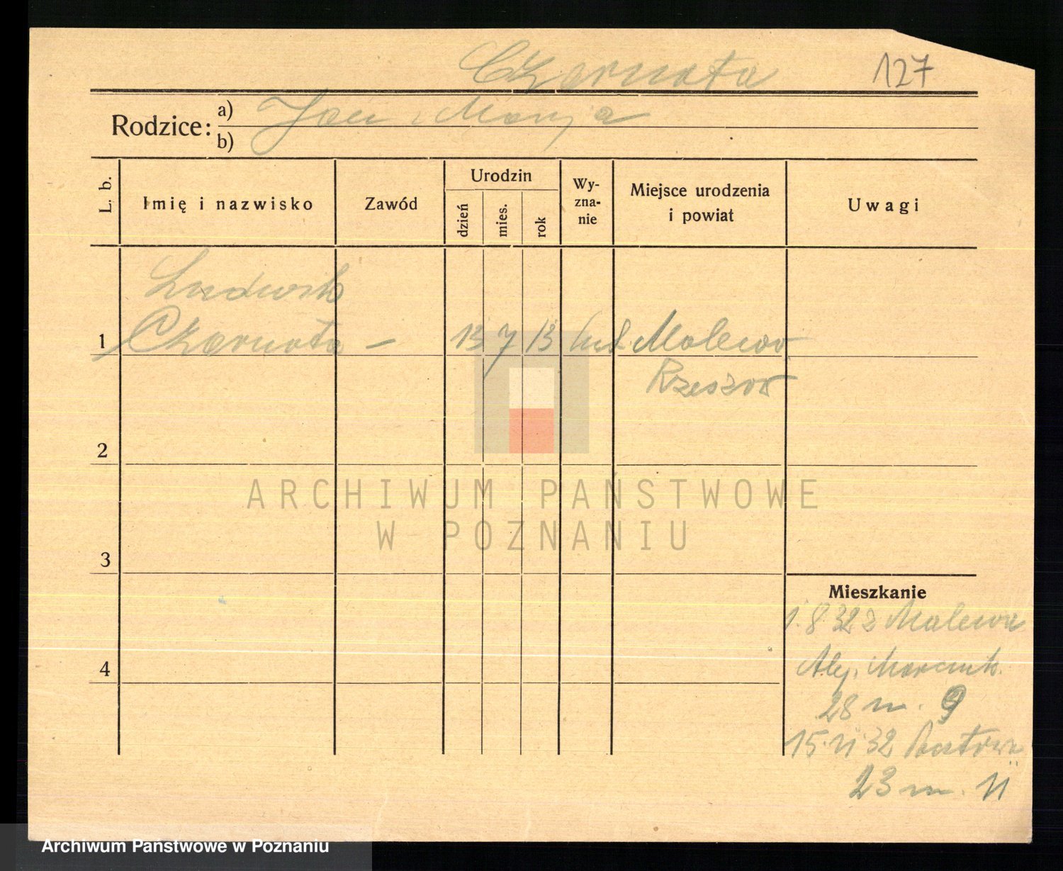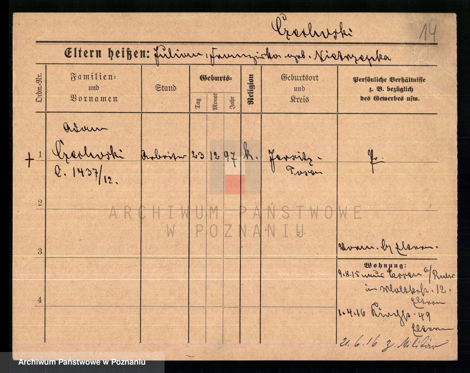 Podgląd karty osobowej dostępny jest po kliknięciu na nazwisko lub ikonkę karty. Można dokonywać powiększenia (ikony na górze) lub przechodzić między kolejnymi skanami (strzałki po bokach).