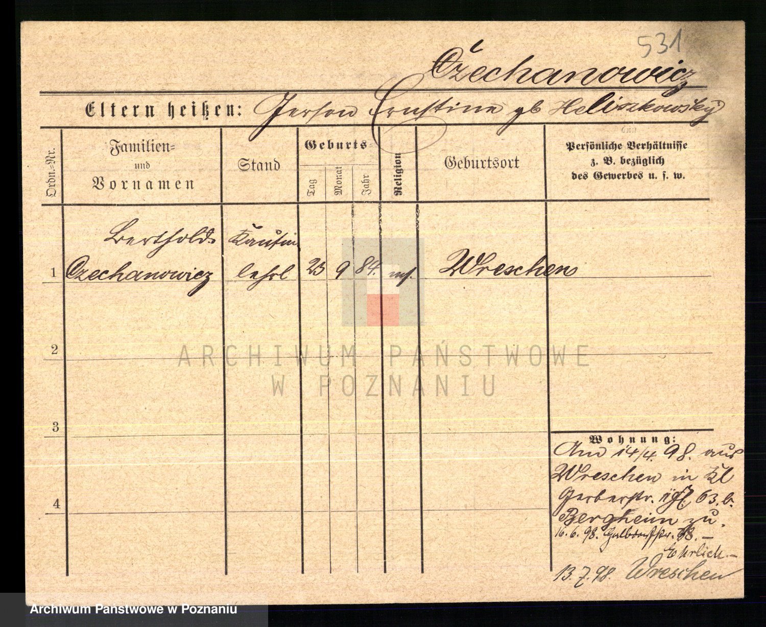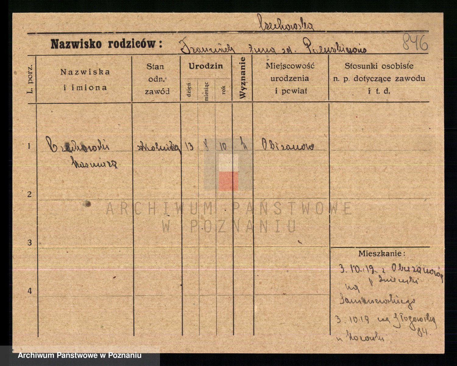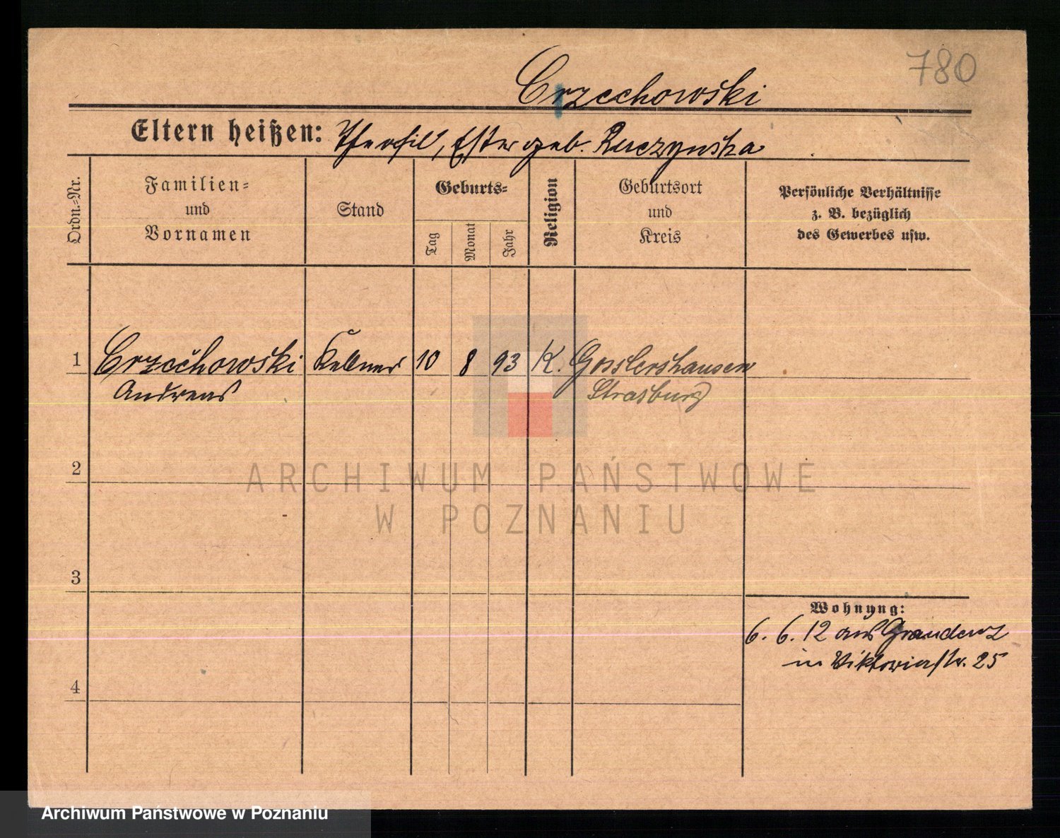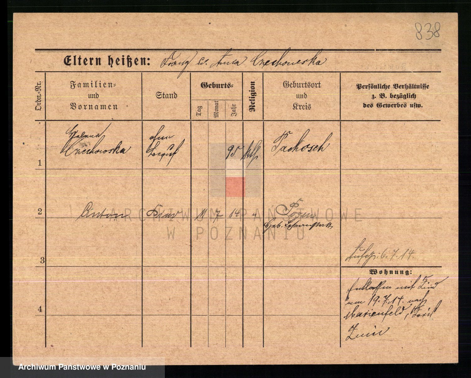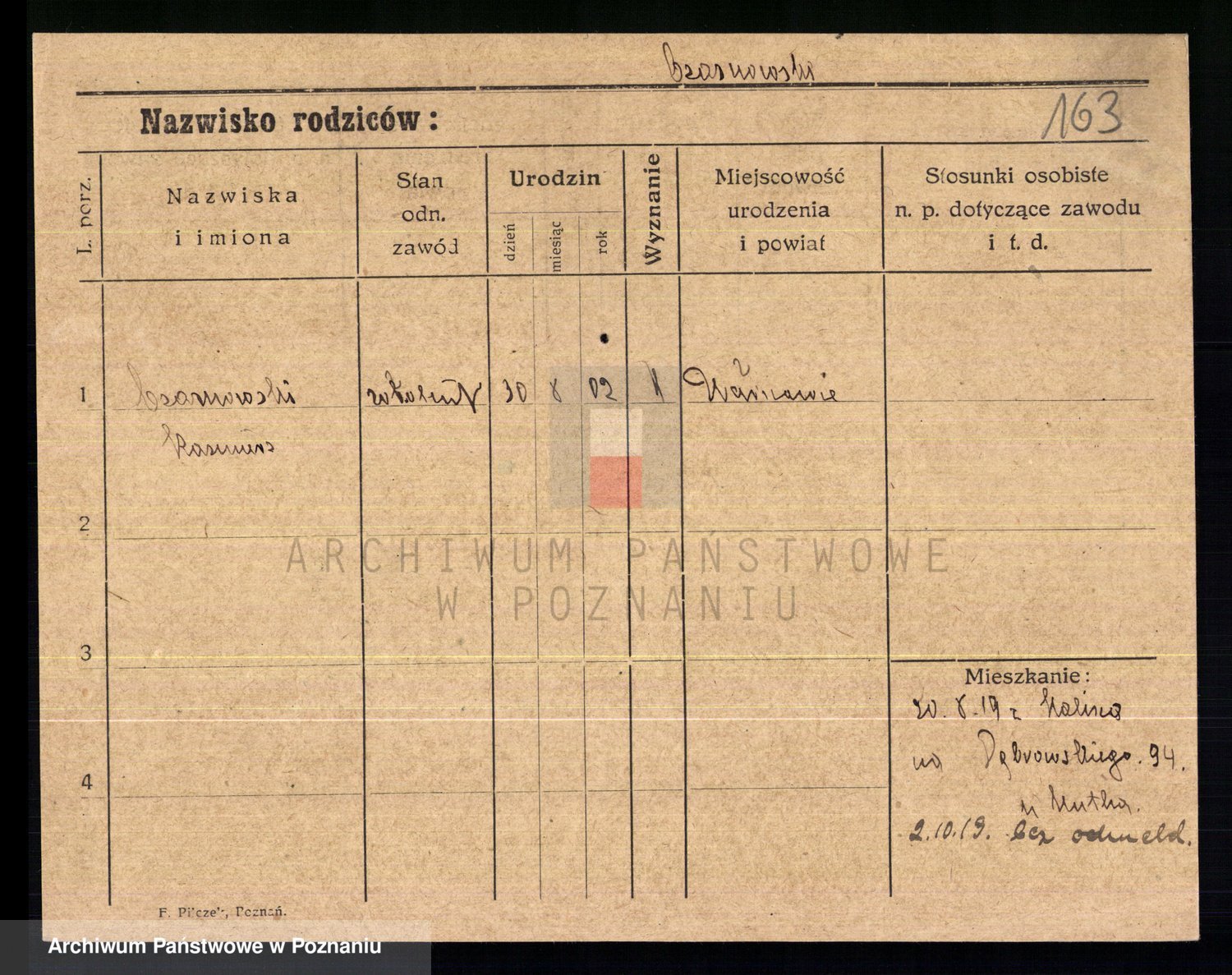 Podgląd karty osobowej dostępny jest po kliknięciu na nazwisko lub ikonkę karty. Można dokonywać powiększenia (ikony na górze) lub przechodzić między kolejnymi skanami (strzałki po bokach).