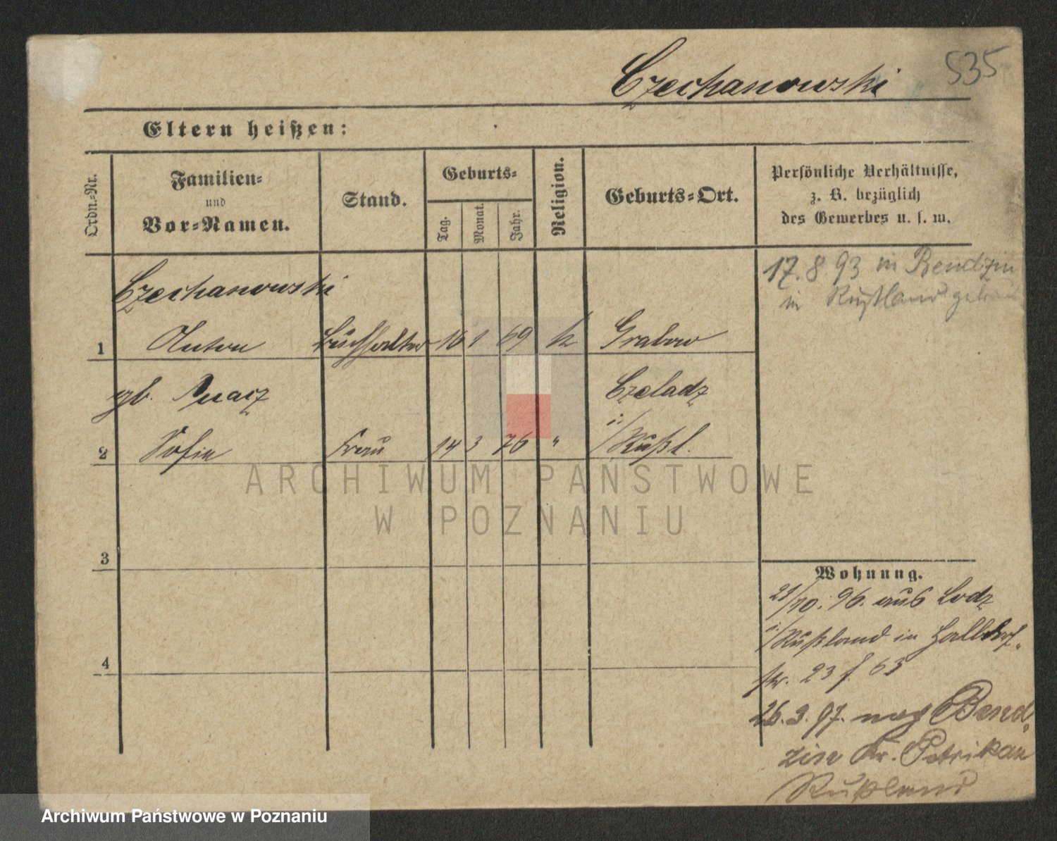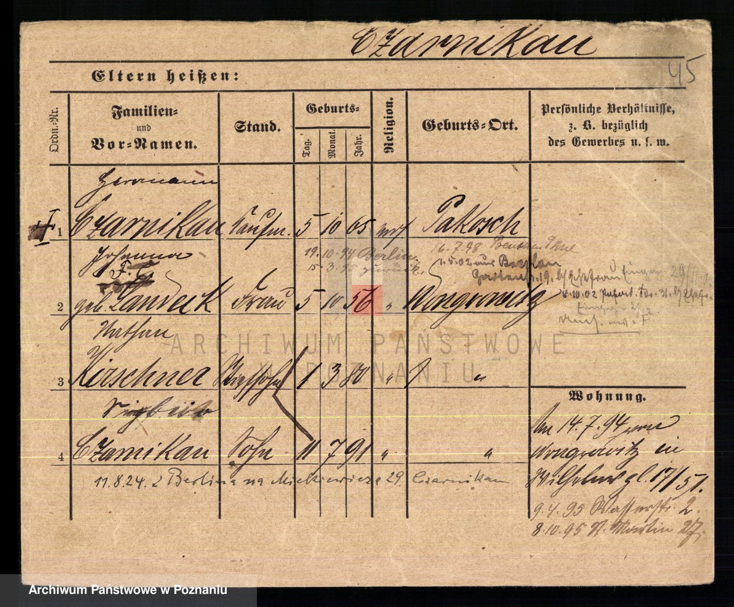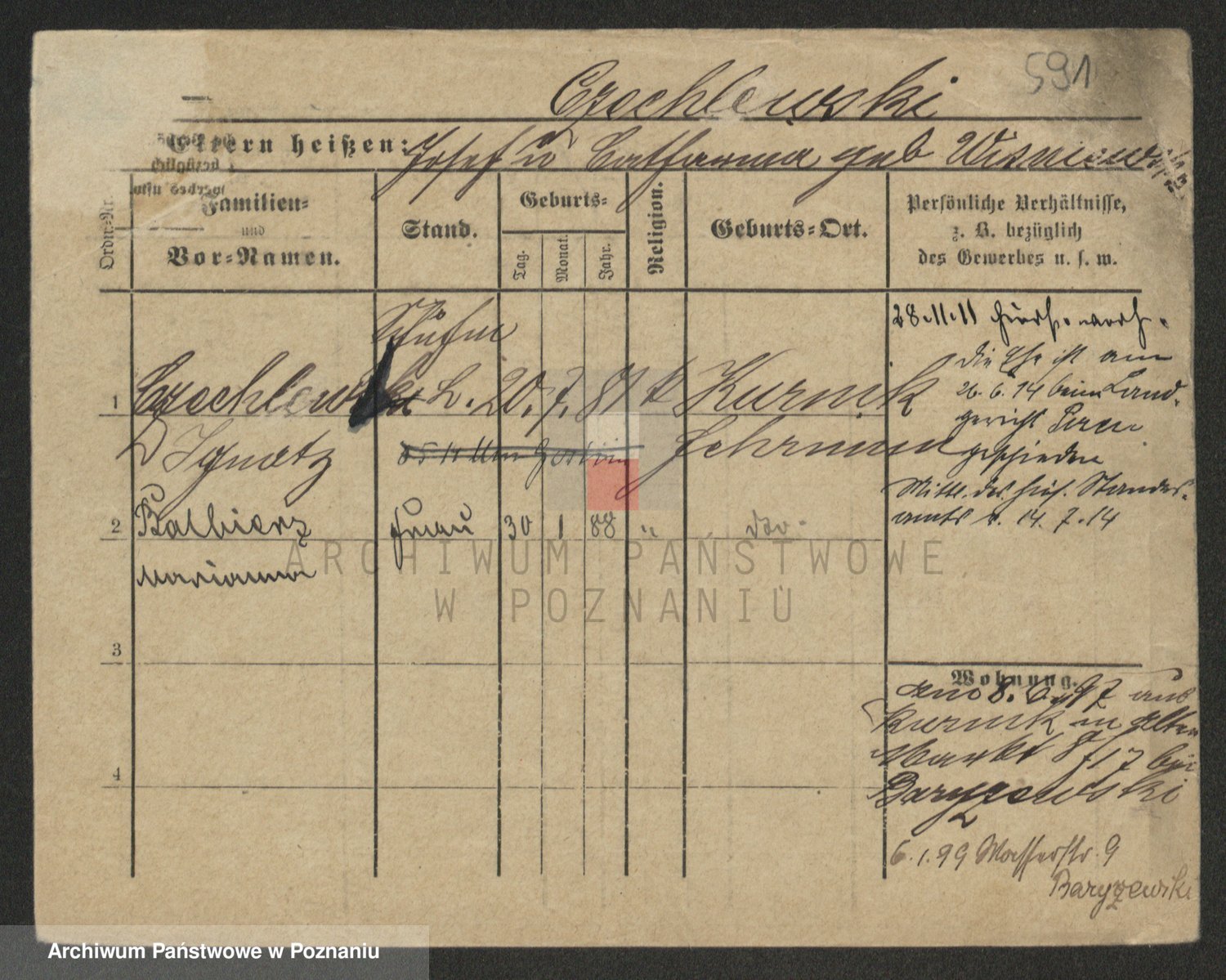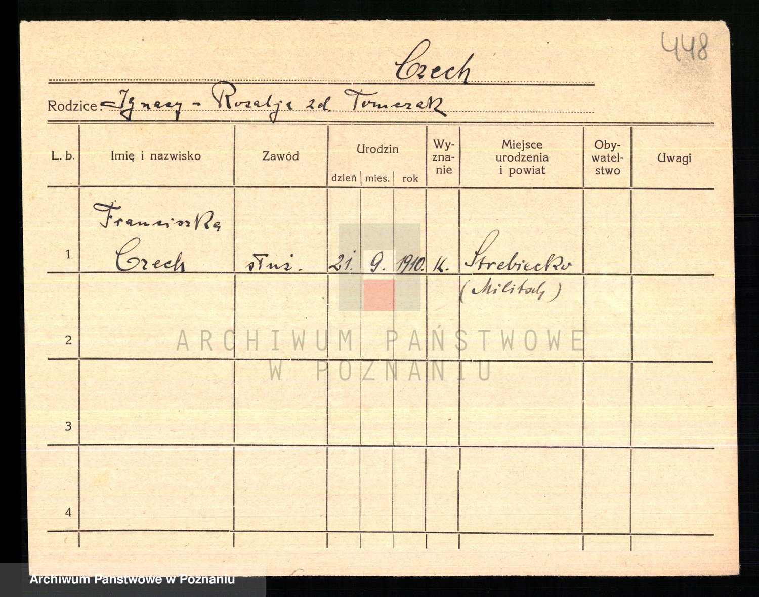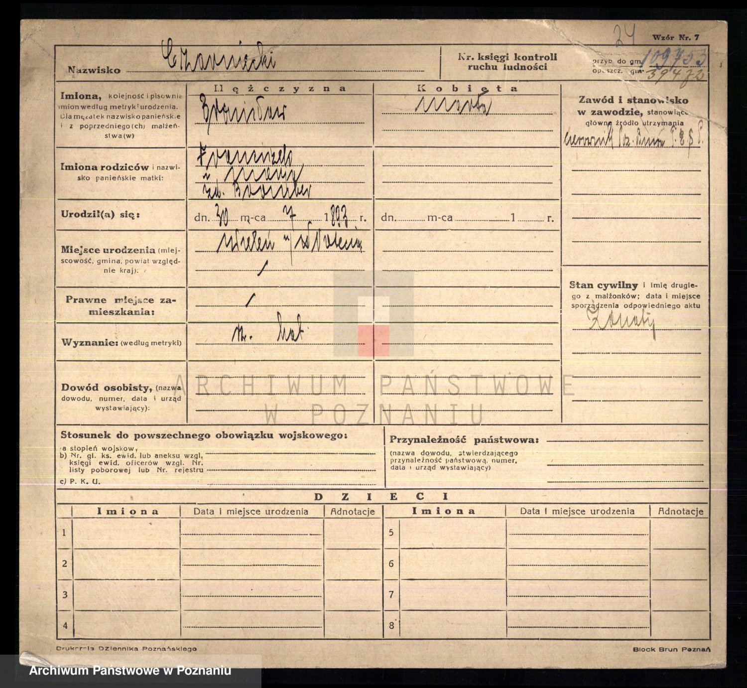 Podgląd karty osobowej dostępny jest po kliknięciu na nazwisko lub ikonkę karty. Można dokonywać powiększenia (ikony na górze) lub przechodzić między kolejnymi skanami (strzałki po bokach).