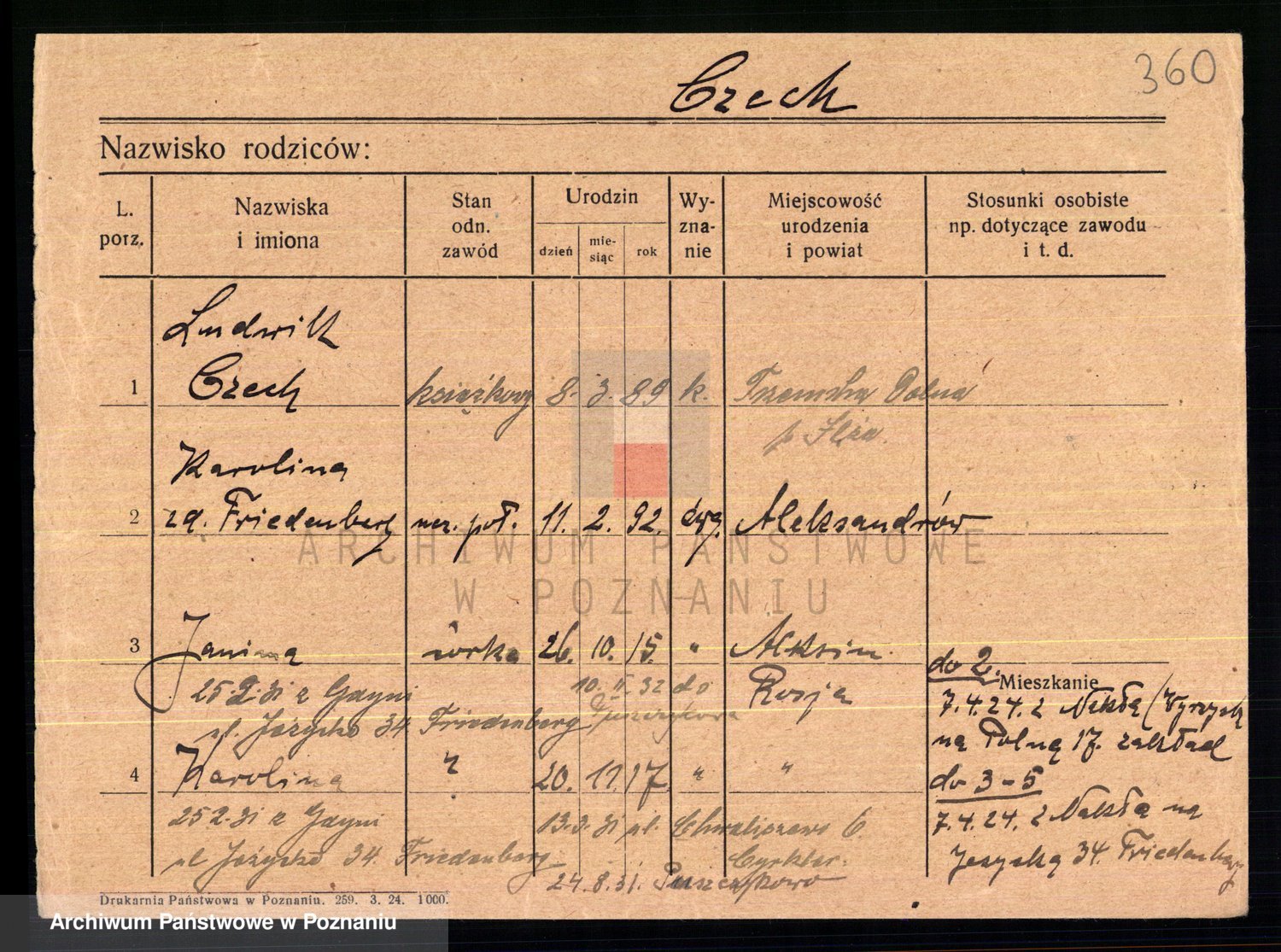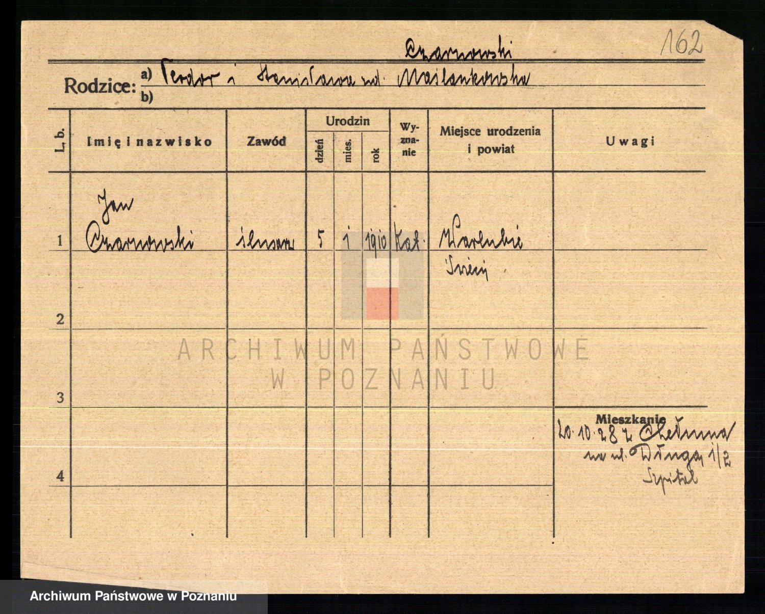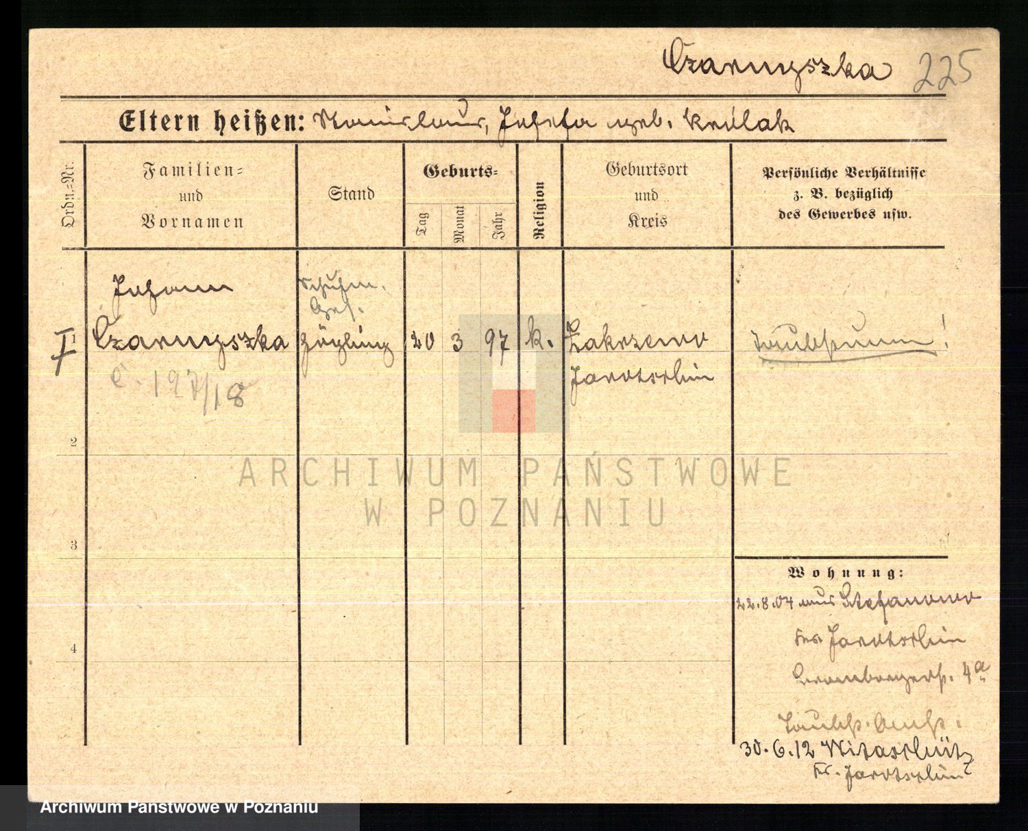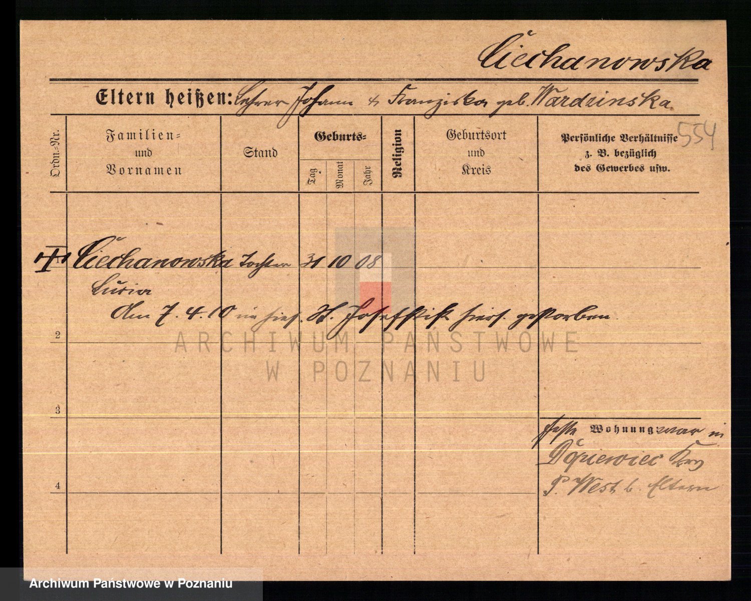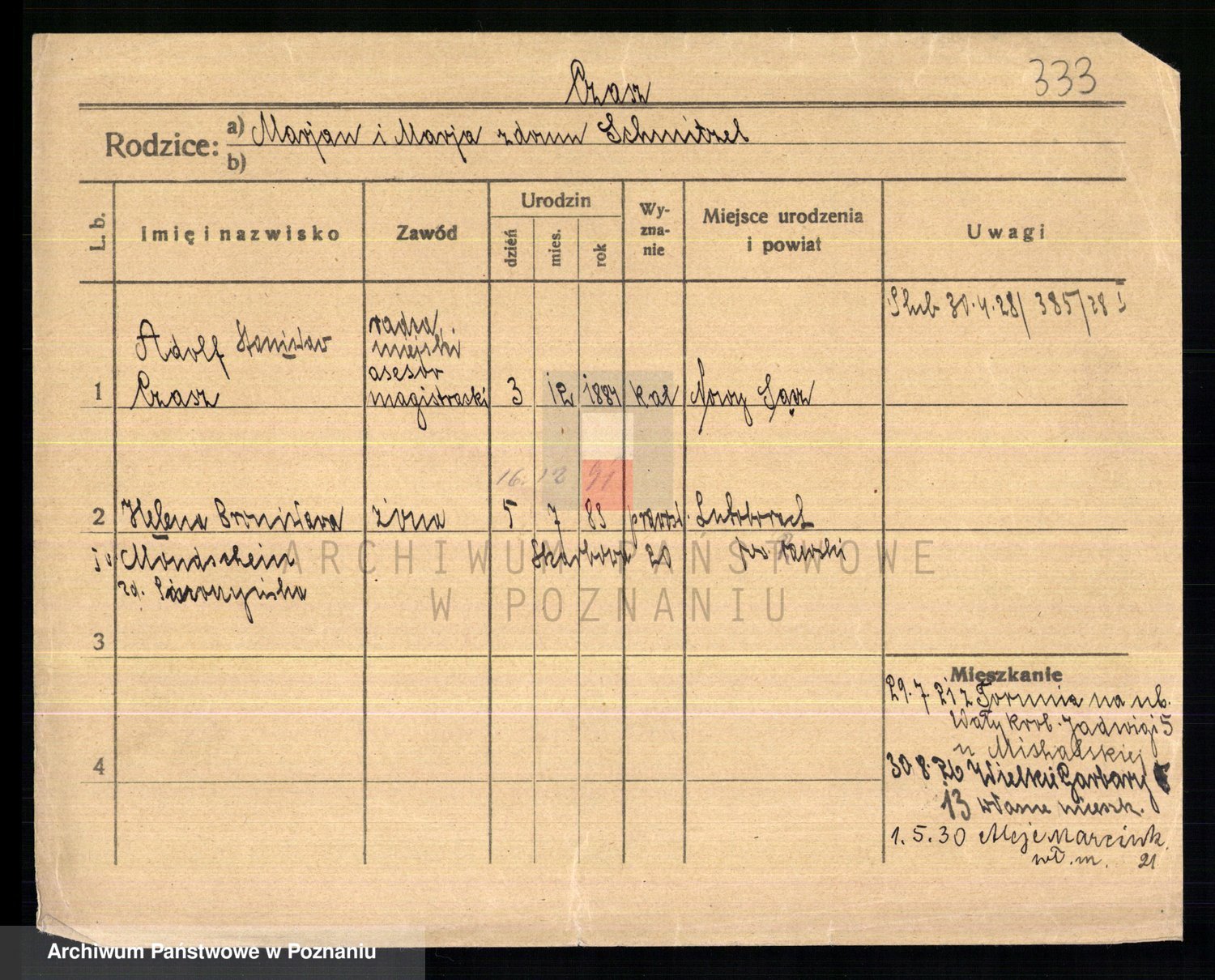 Podgląd karty osobowej dostępny jest po kliknięciu na nazwisko lub ikonkę karty. Można dokonywać powiększenia (ikony na górze) lub przechodzić między kolejnymi skanami (strzałki po bokach).