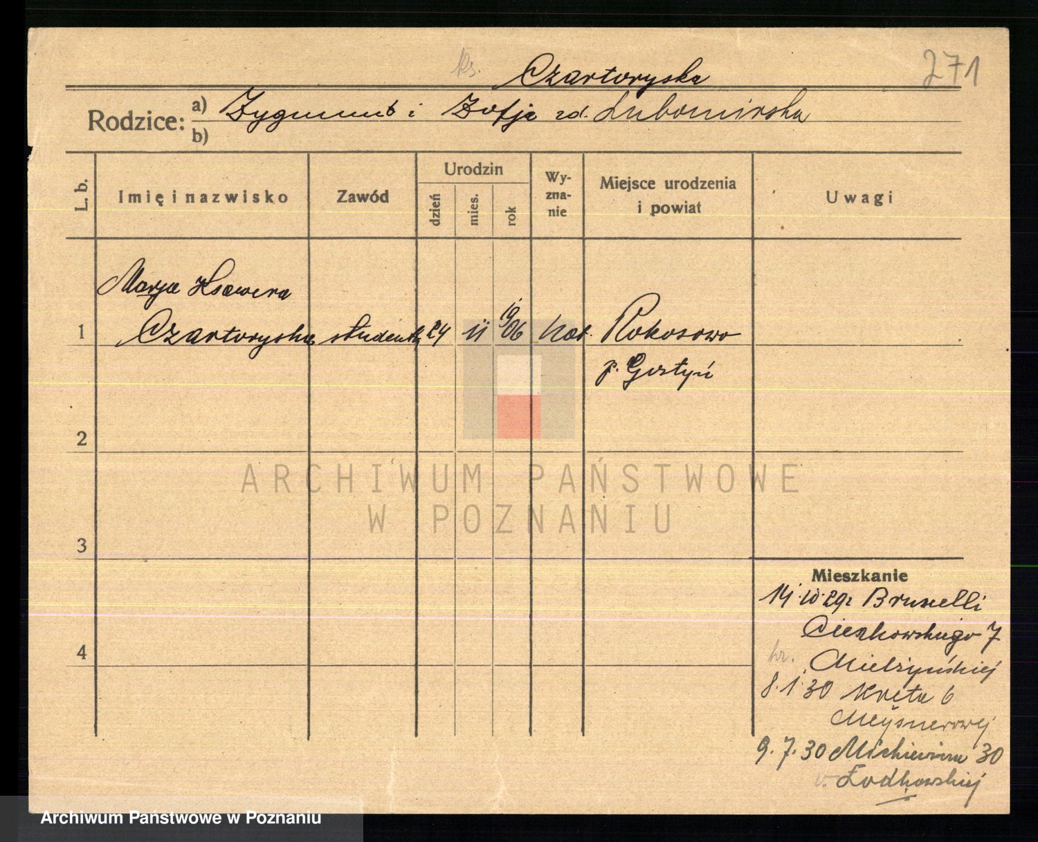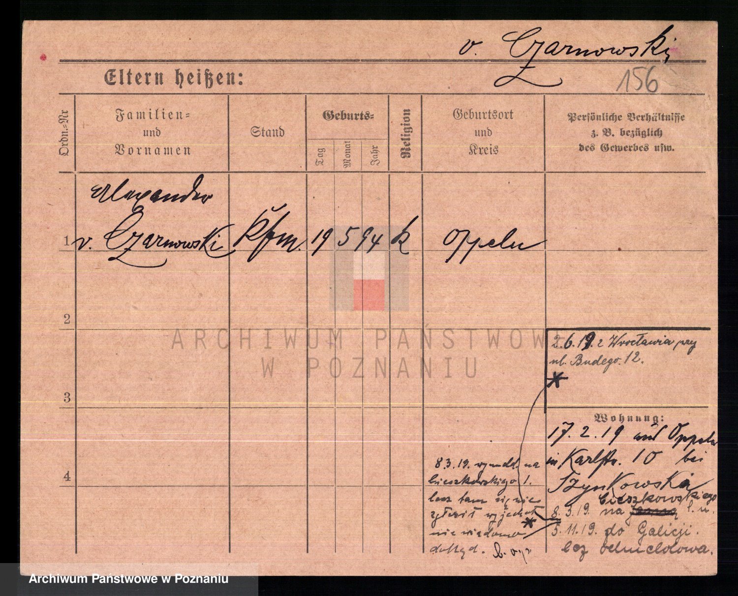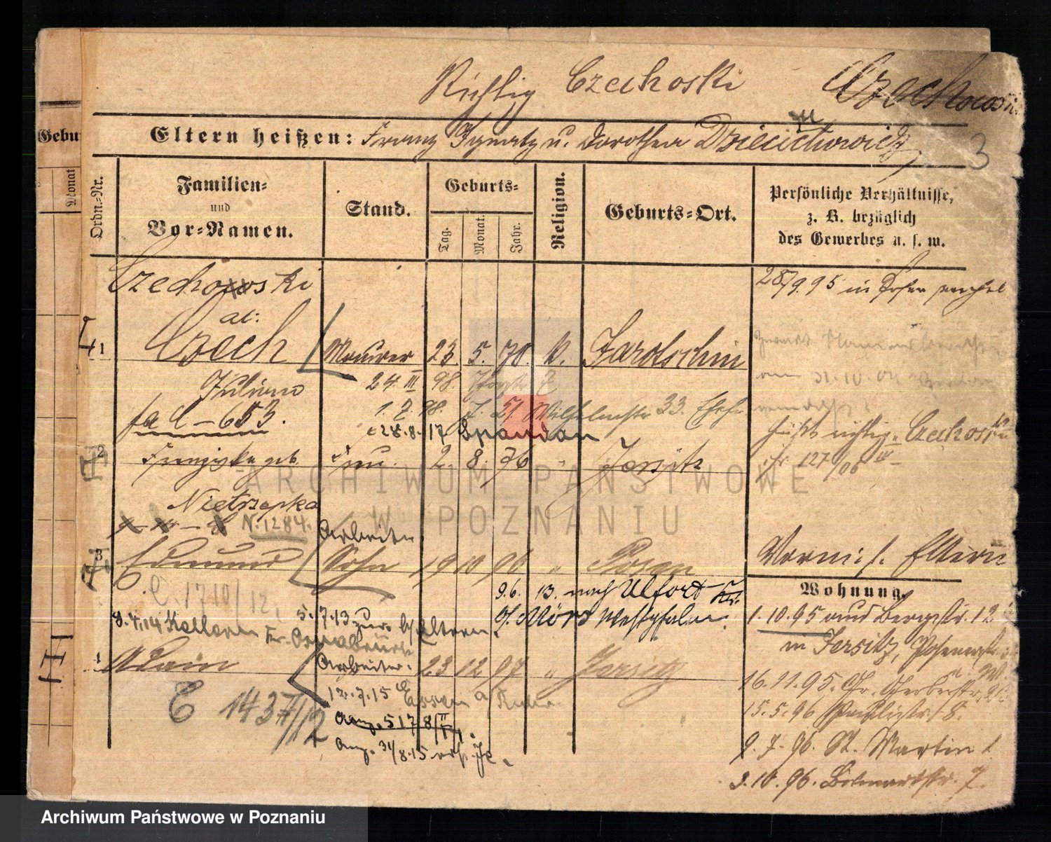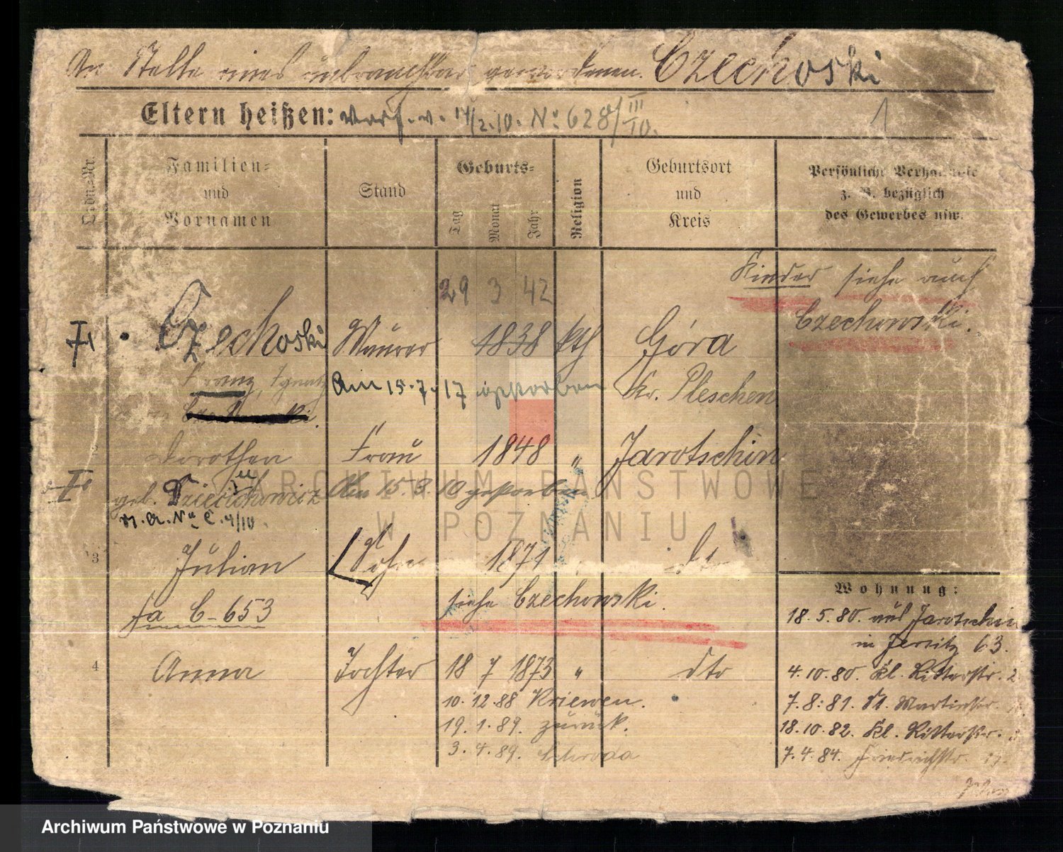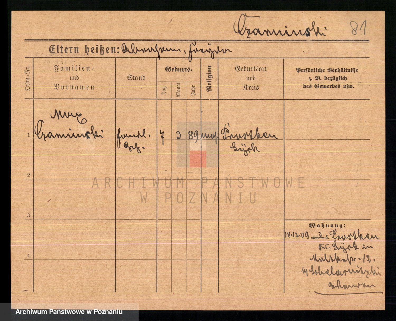 Podgląd karty osobowej dostępny jest po kliknięciu na nazwisko lub ikonkę karty. Można dokonywać powiększenia (ikony na górze) lub przechodzić między kolejnymi skanami (strzałki po bokach).