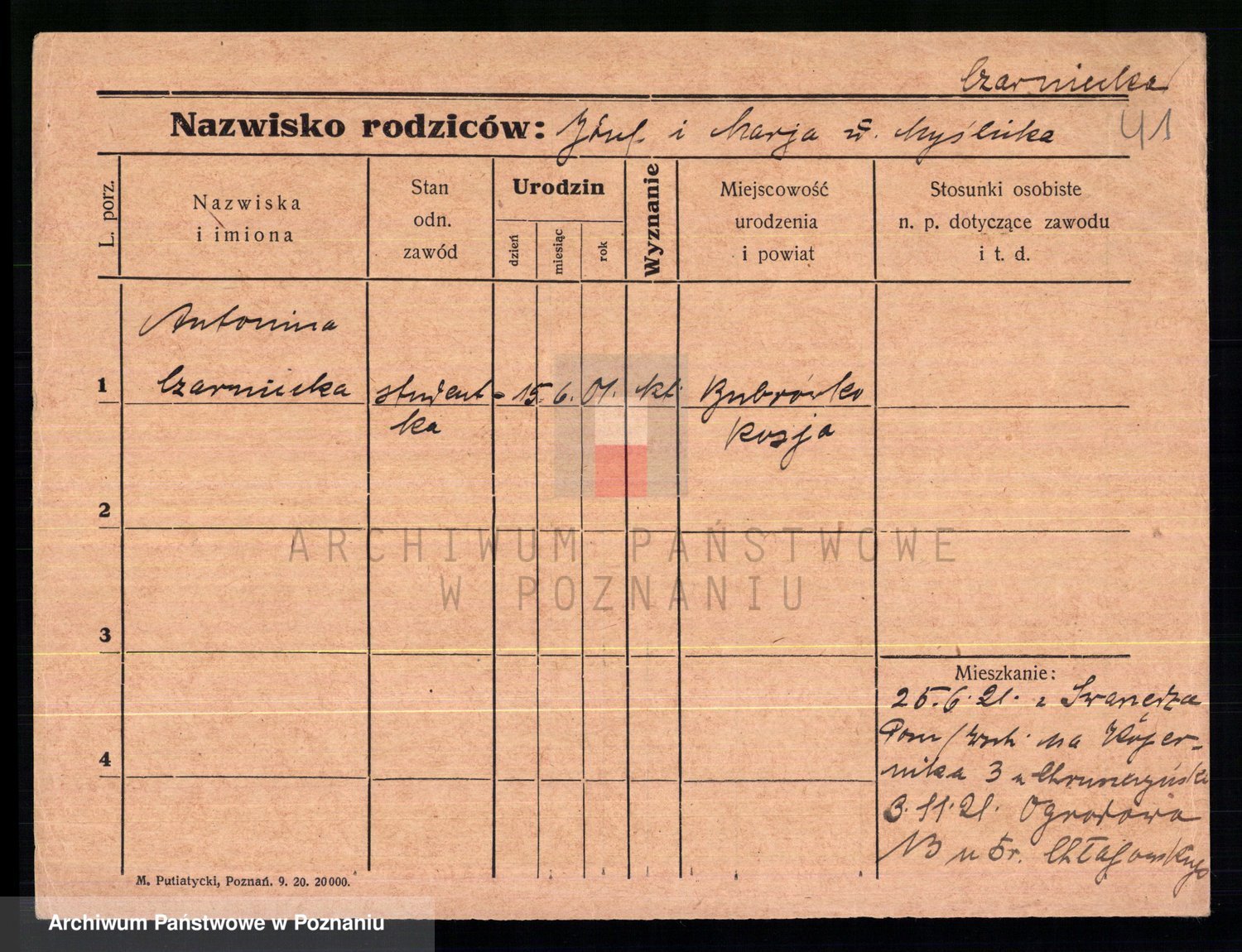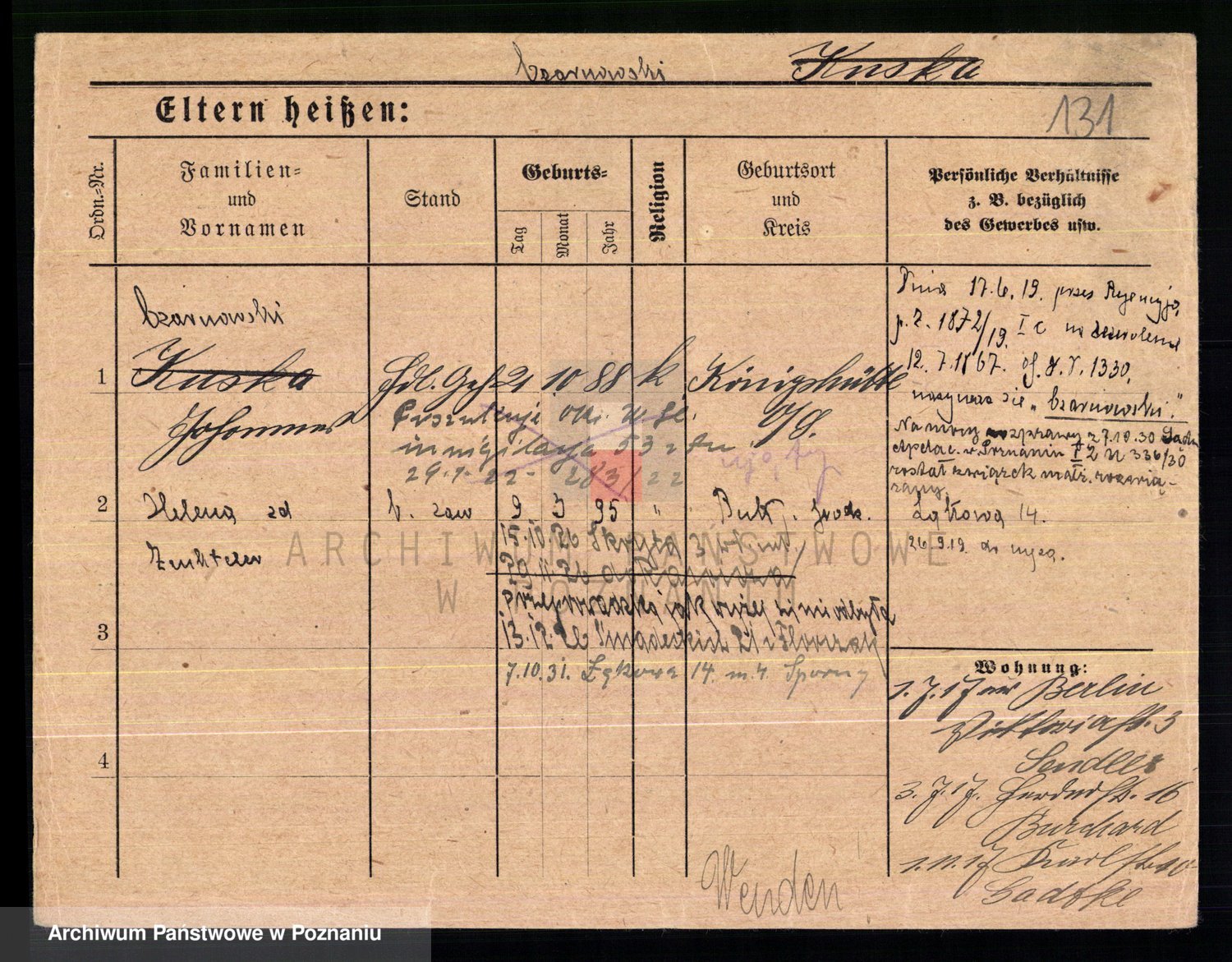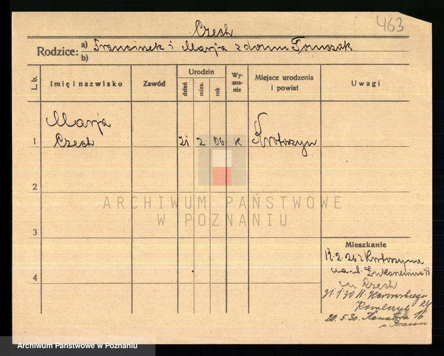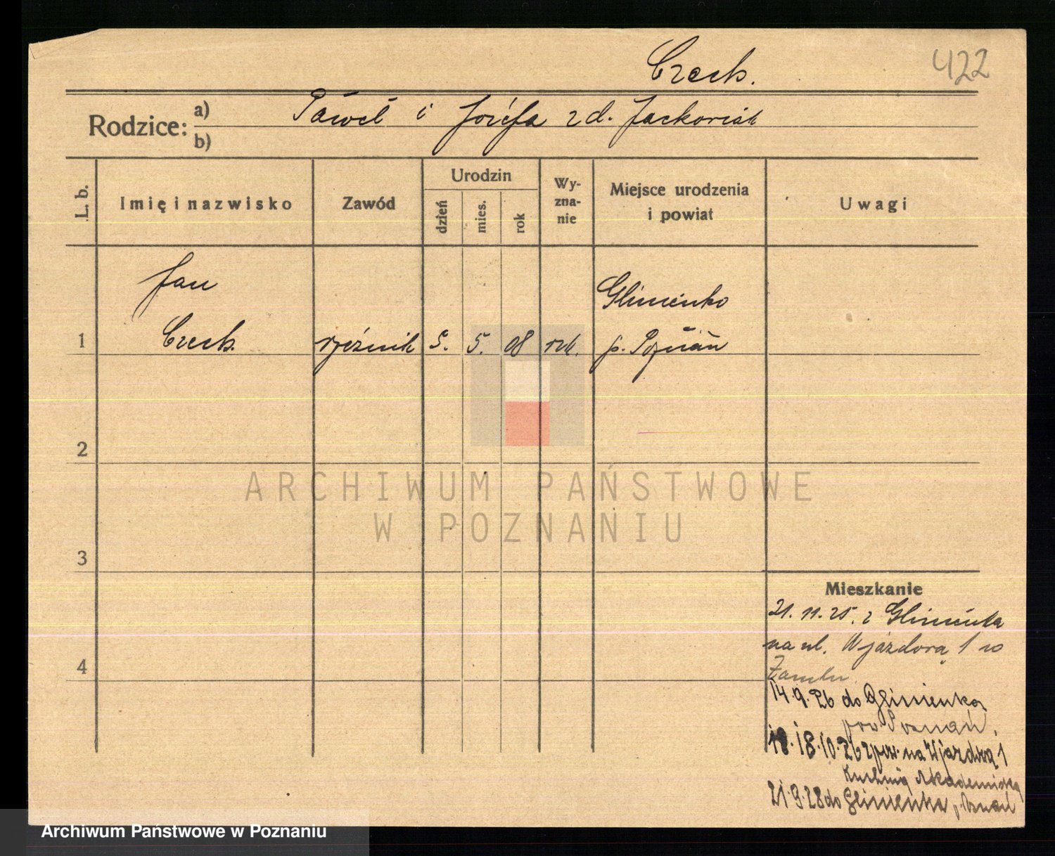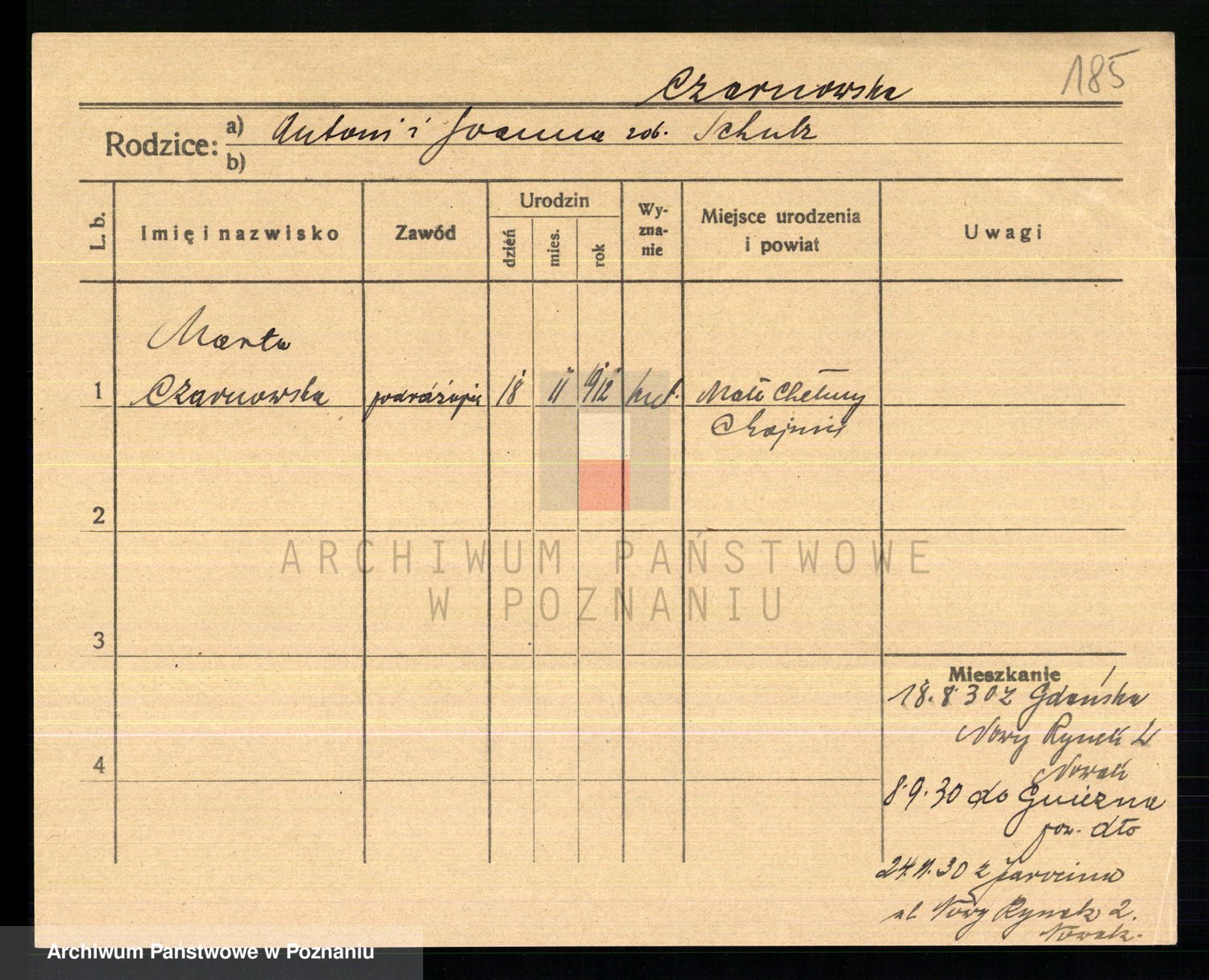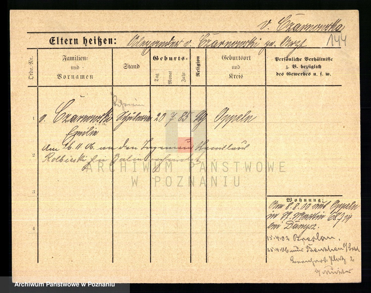 Podgląd karty osobowej dostępny jest po kliknięciu na nazwisko lub ikonkę karty. Można dokonywać powiększenia (ikony na górze) lub przechodzić między kolejnymi skanami (strzałki po bokach).