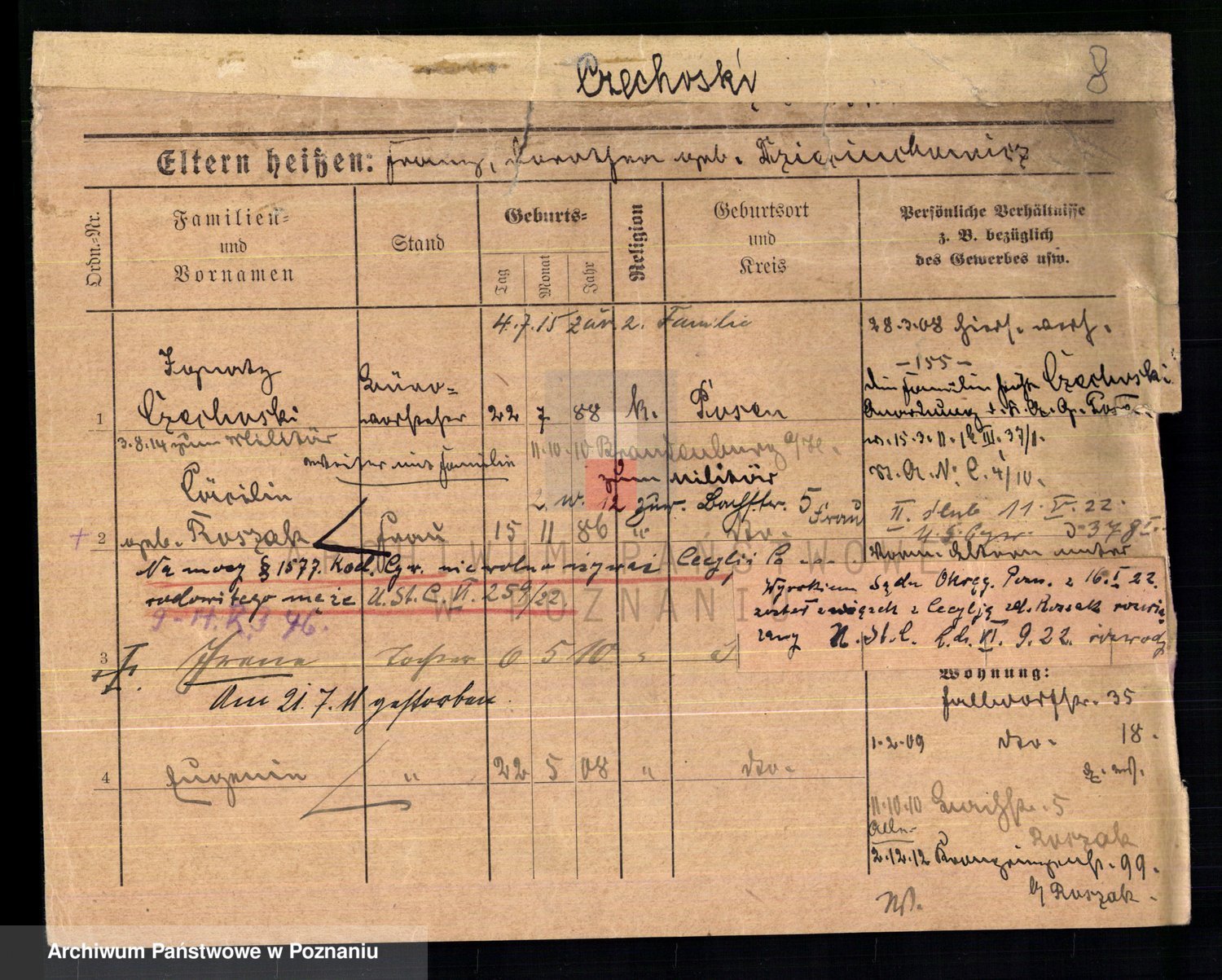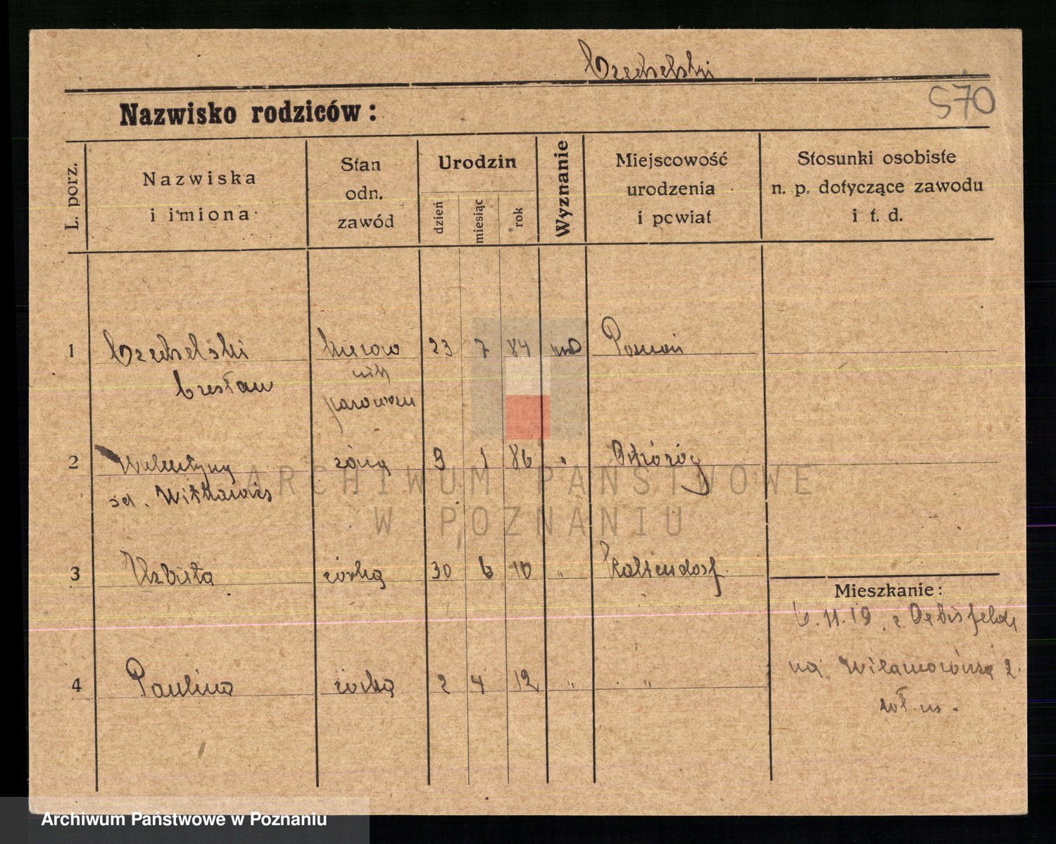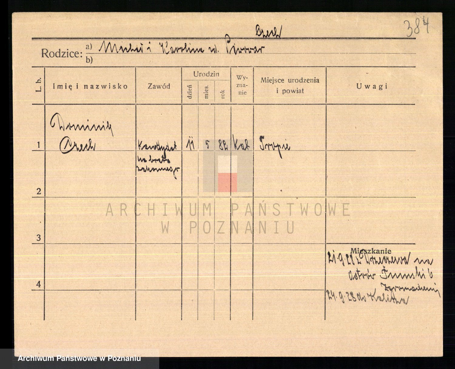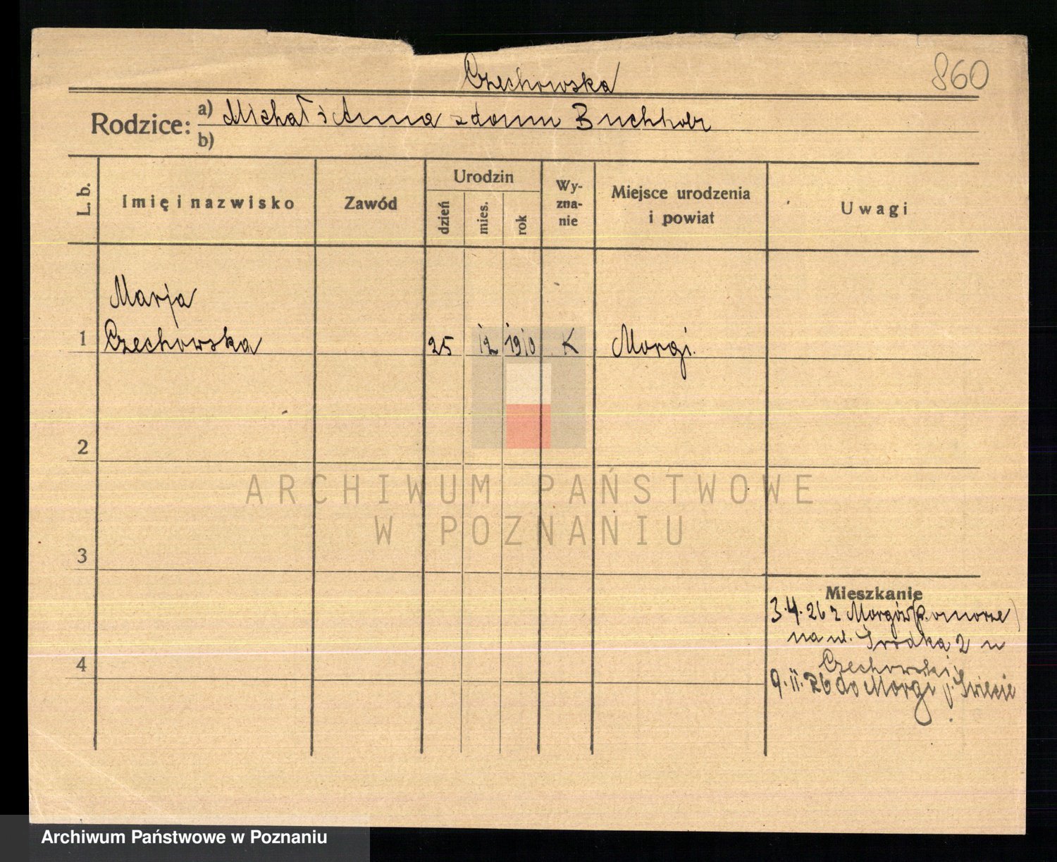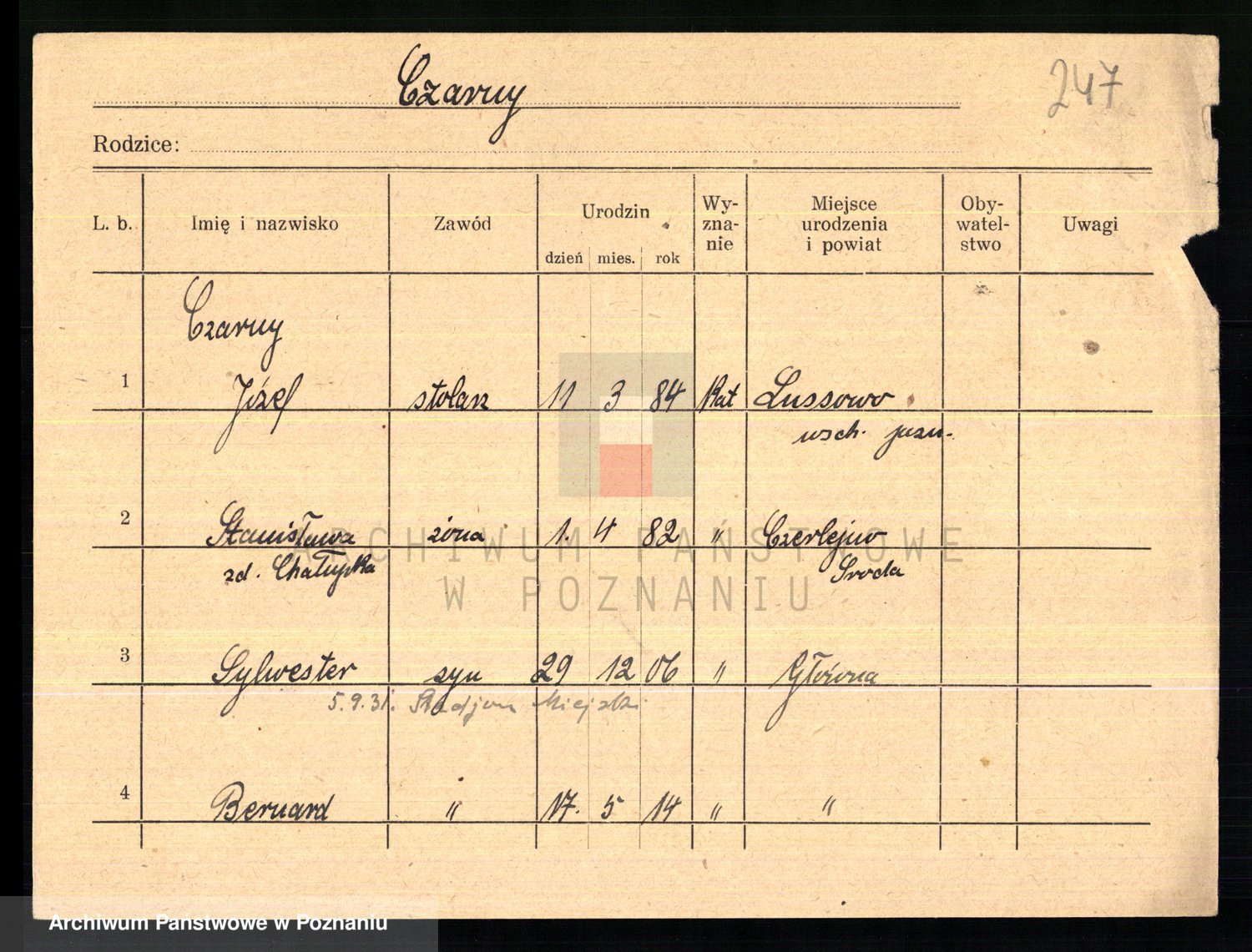 Podgląd karty osobowej dostępny jest po kliknięciu na nazwisko lub ikonkę karty. Można dokonywać powiększenia (ikony na górze) lub przechodzić między kolejnymi skanami (strzałki po bokach).