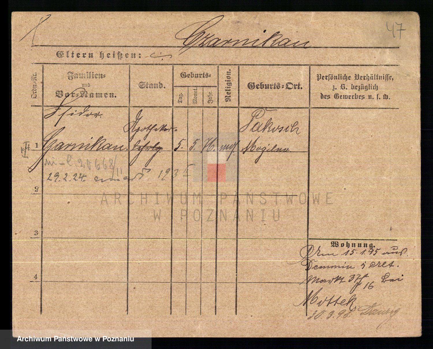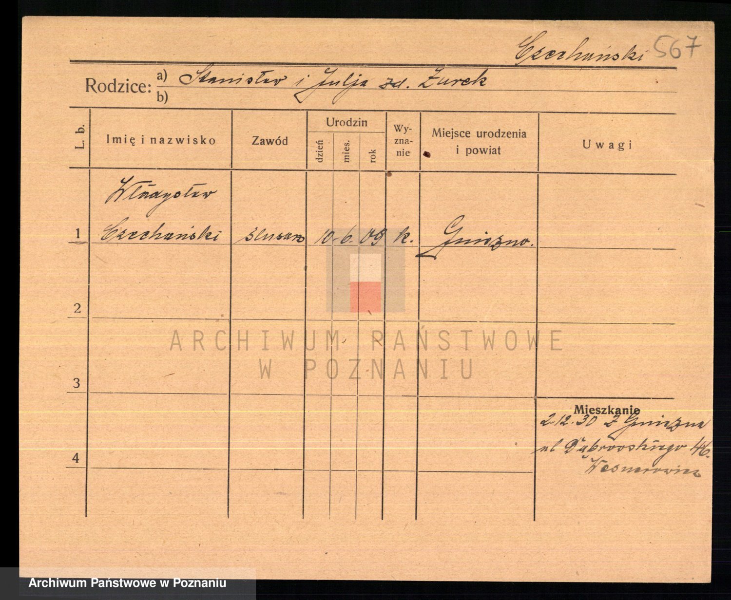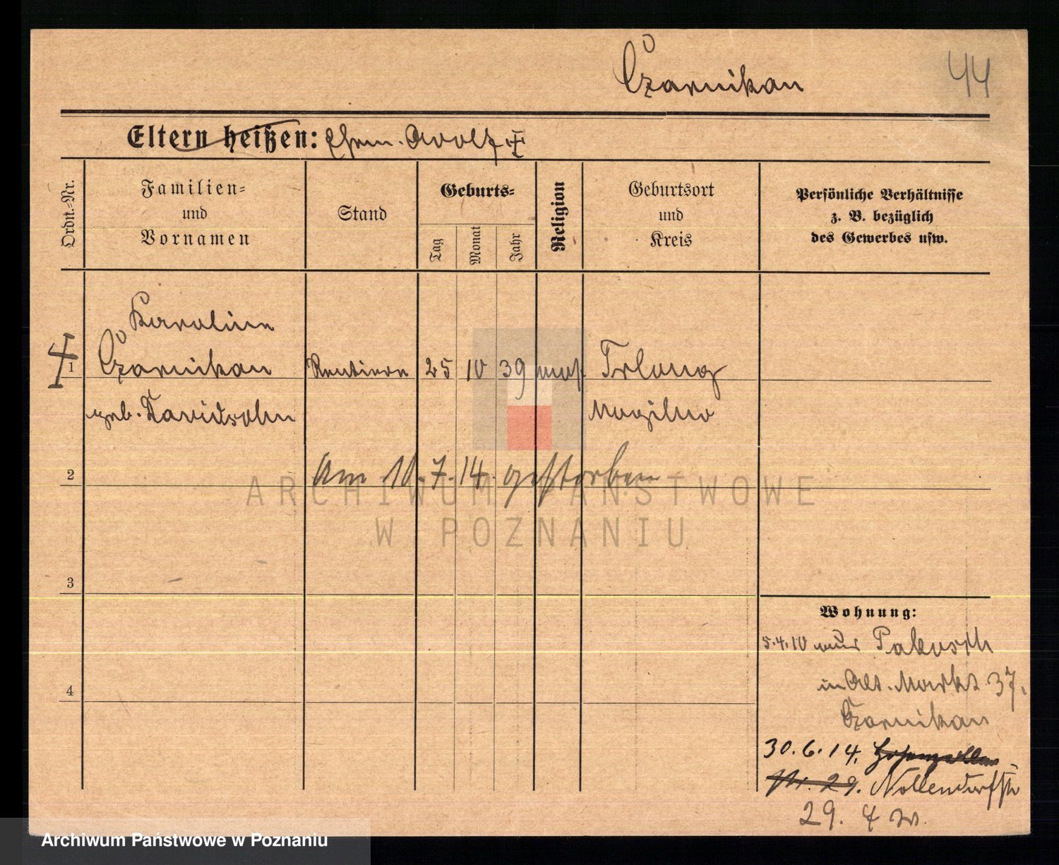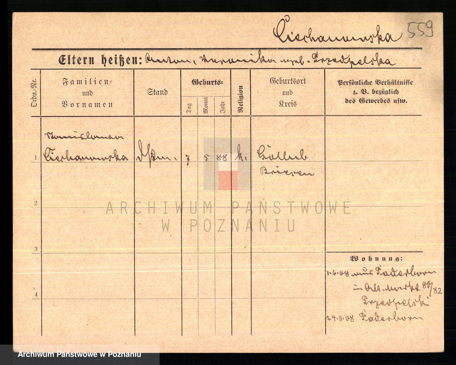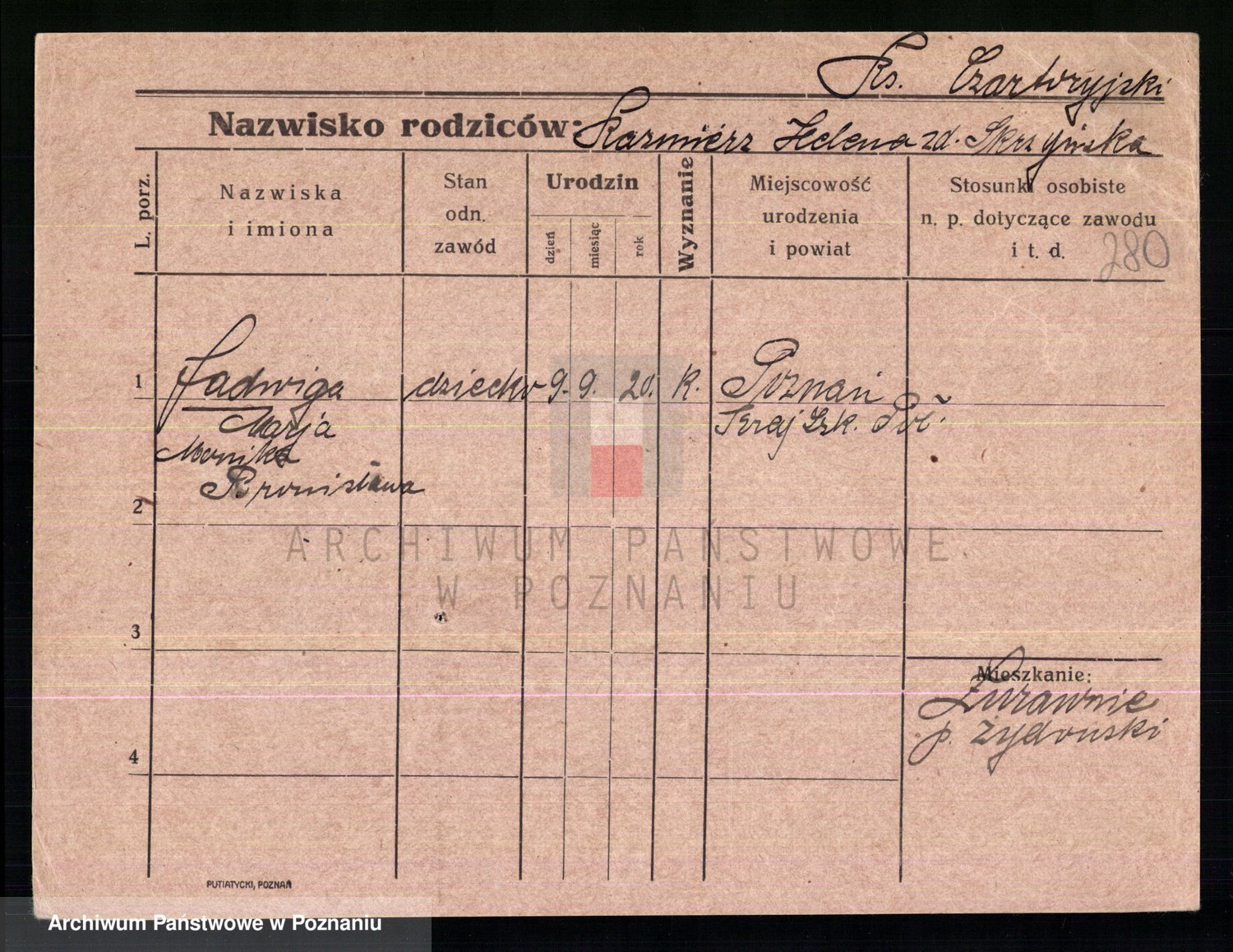Podgląd karty osobowej dostępny jest po kliknięciu na nazwisko lub ikonkę karty. Można dokonywać powiększenia (ikony na górze) lub przechodzić między kolejnymi skanami (strzałki po bokach).