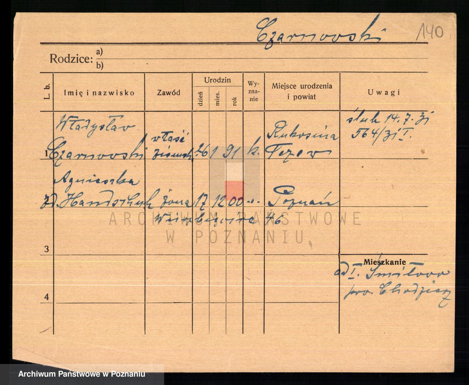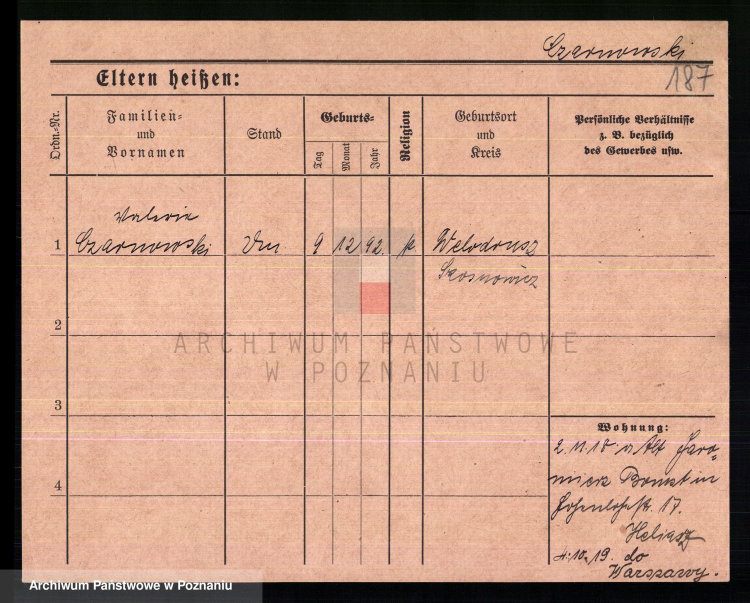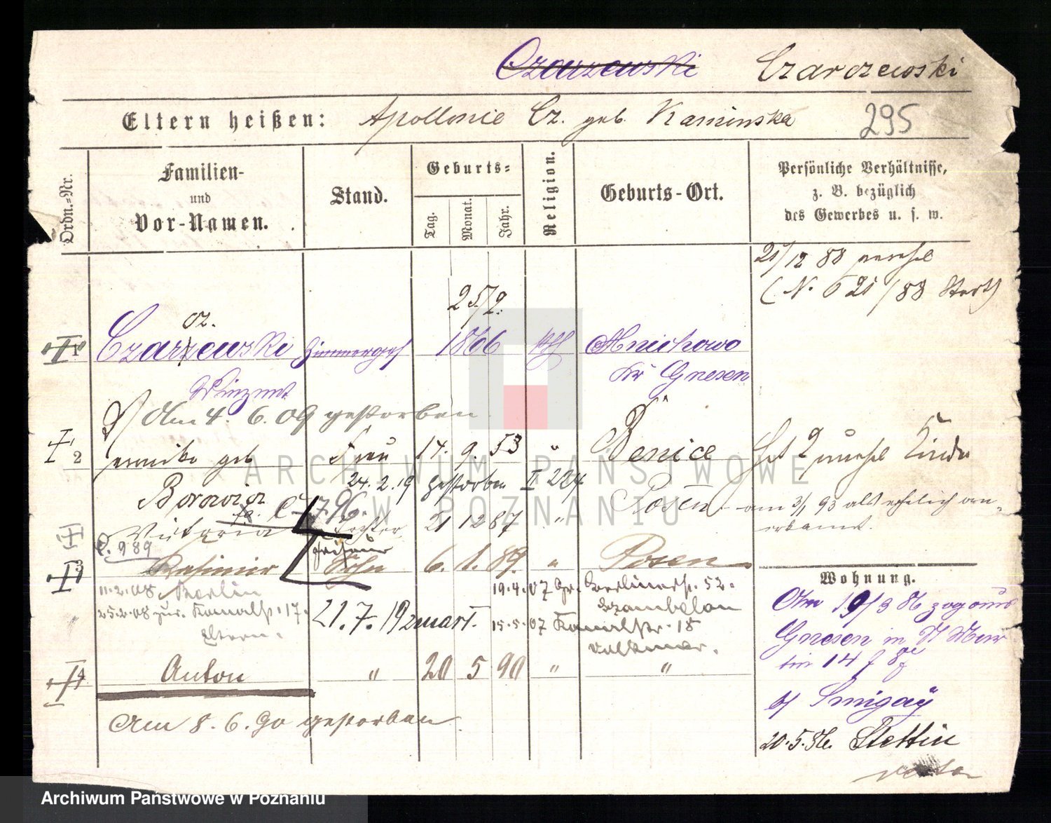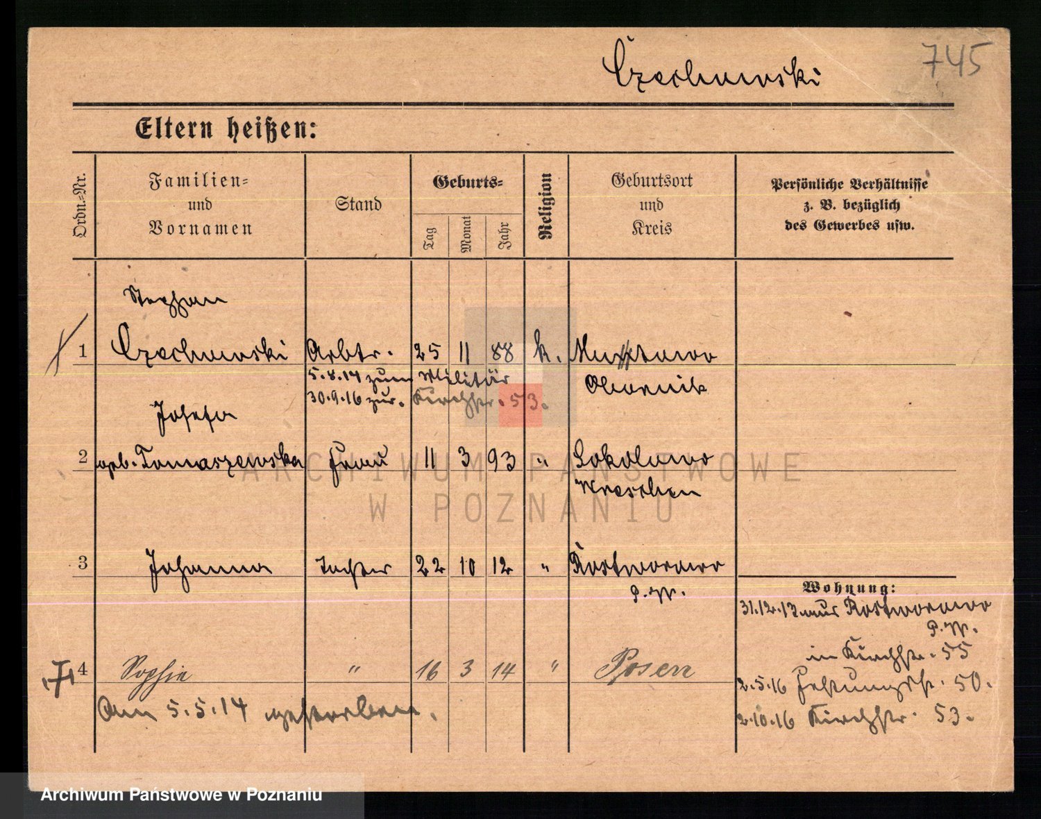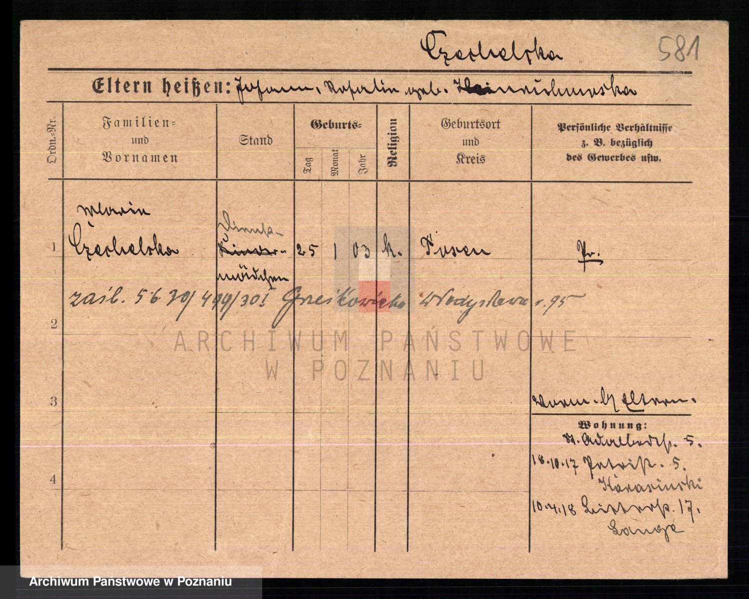 Podgląd karty osobowej dostępny jest po kliknięciu na nazwisko lub ikonkę karty. Można dokonywać powiększenia (ikony na górze) lub przechodzić między kolejnymi skanami (strzałki po bokach).