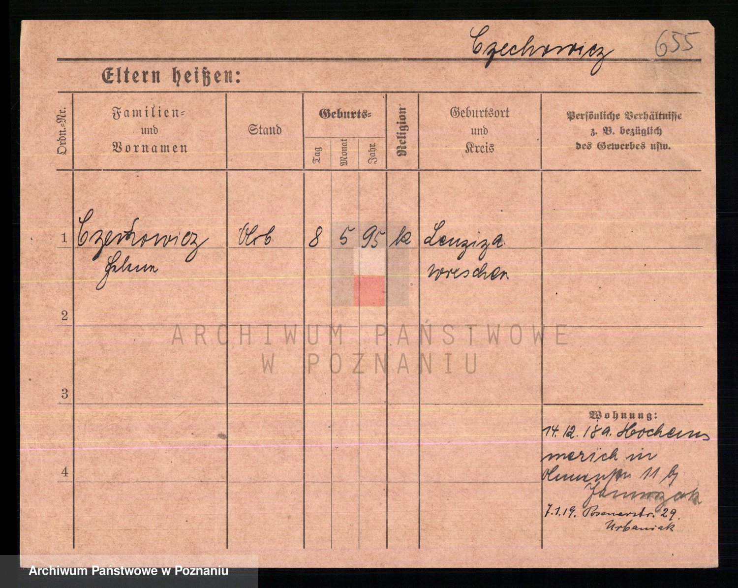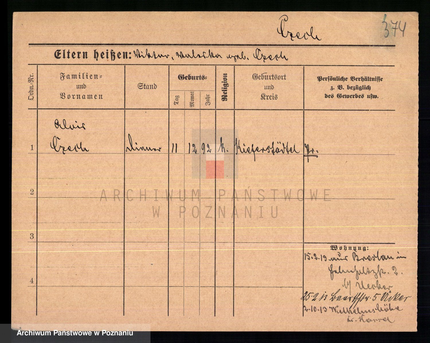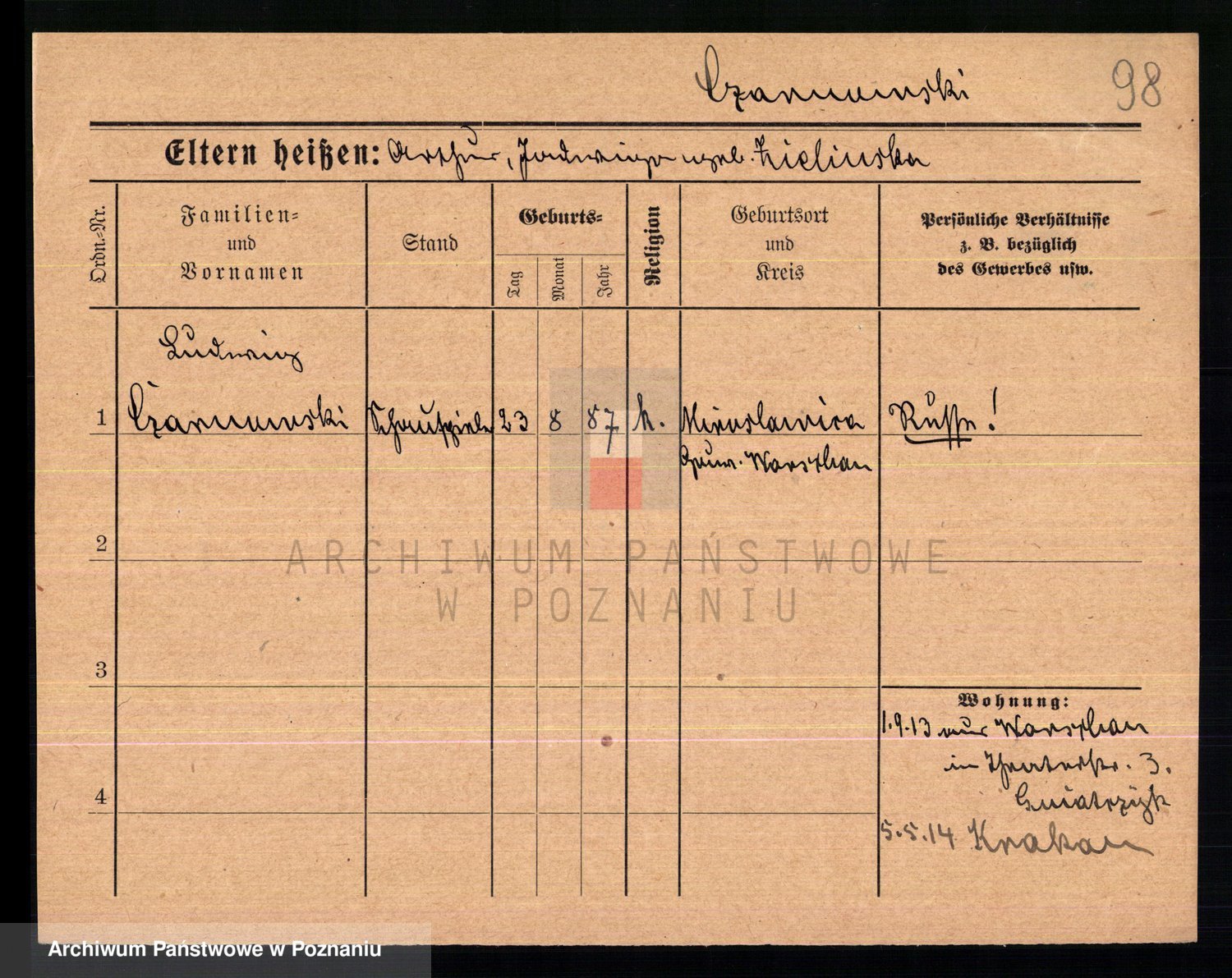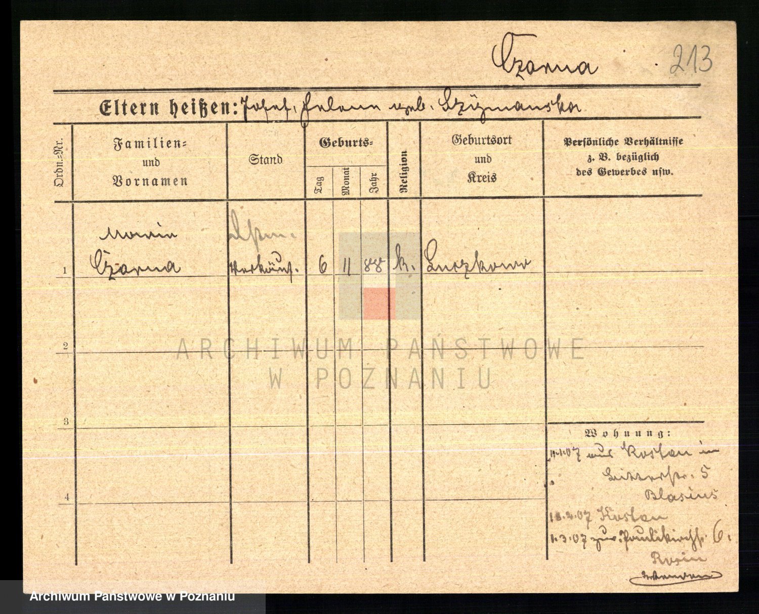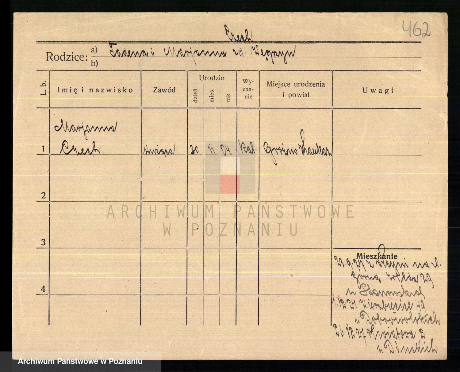 Podgląd karty osobowej dostępny jest po kliknięciu na nazwisko lub ikonkę karty. Można dokonywać powiększenia (ikony na górze) lub przechodzić między kolejnymi skanami (strzałki po bokach).