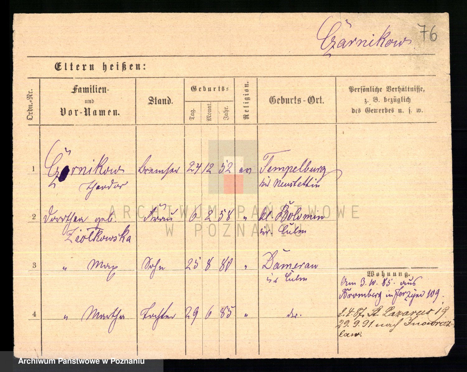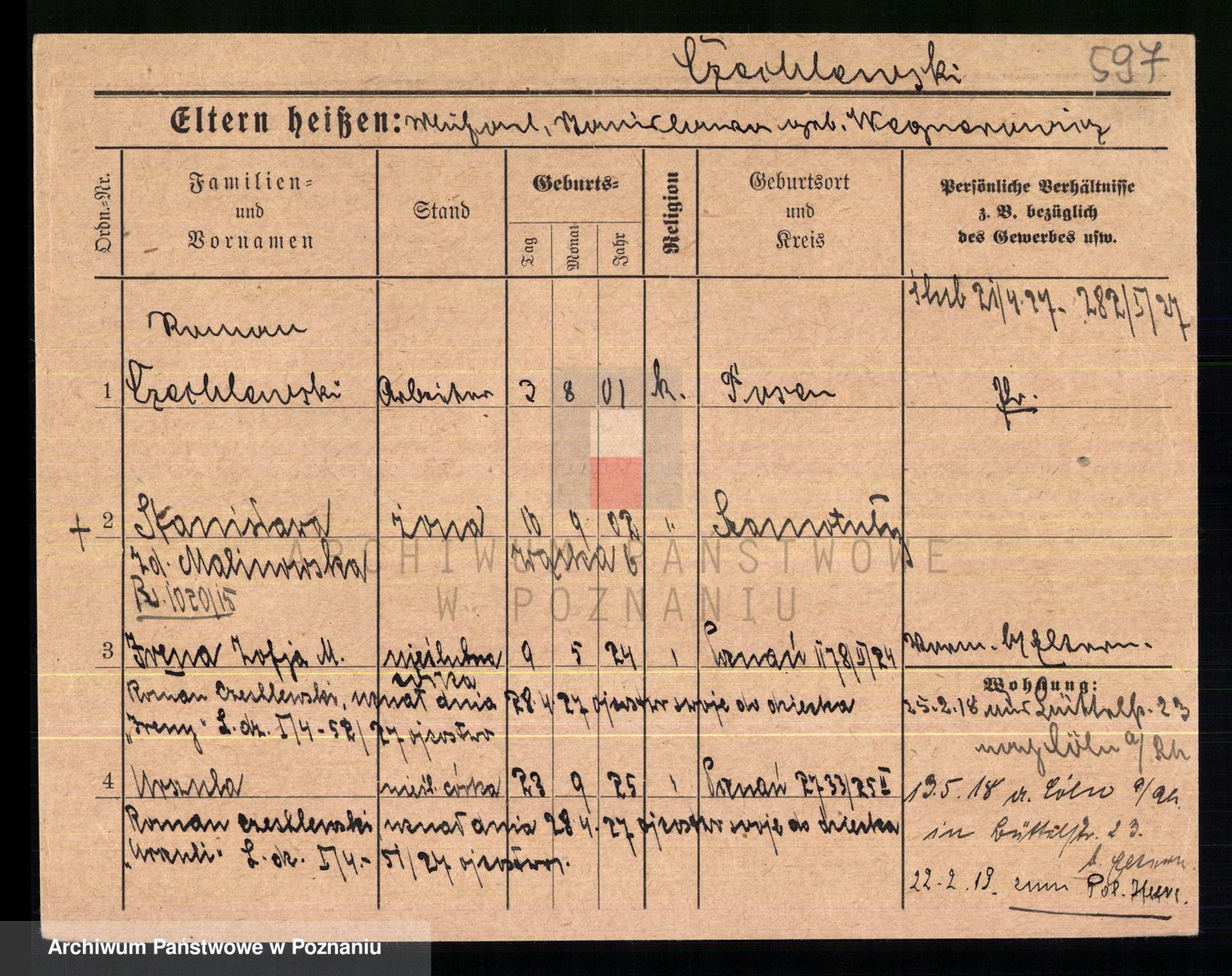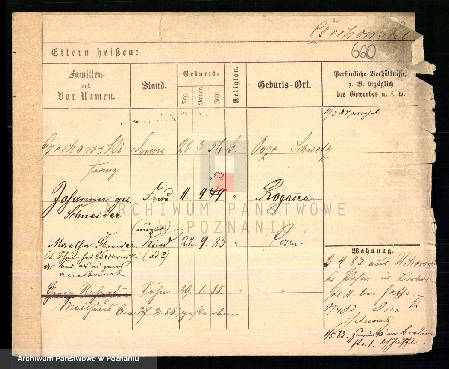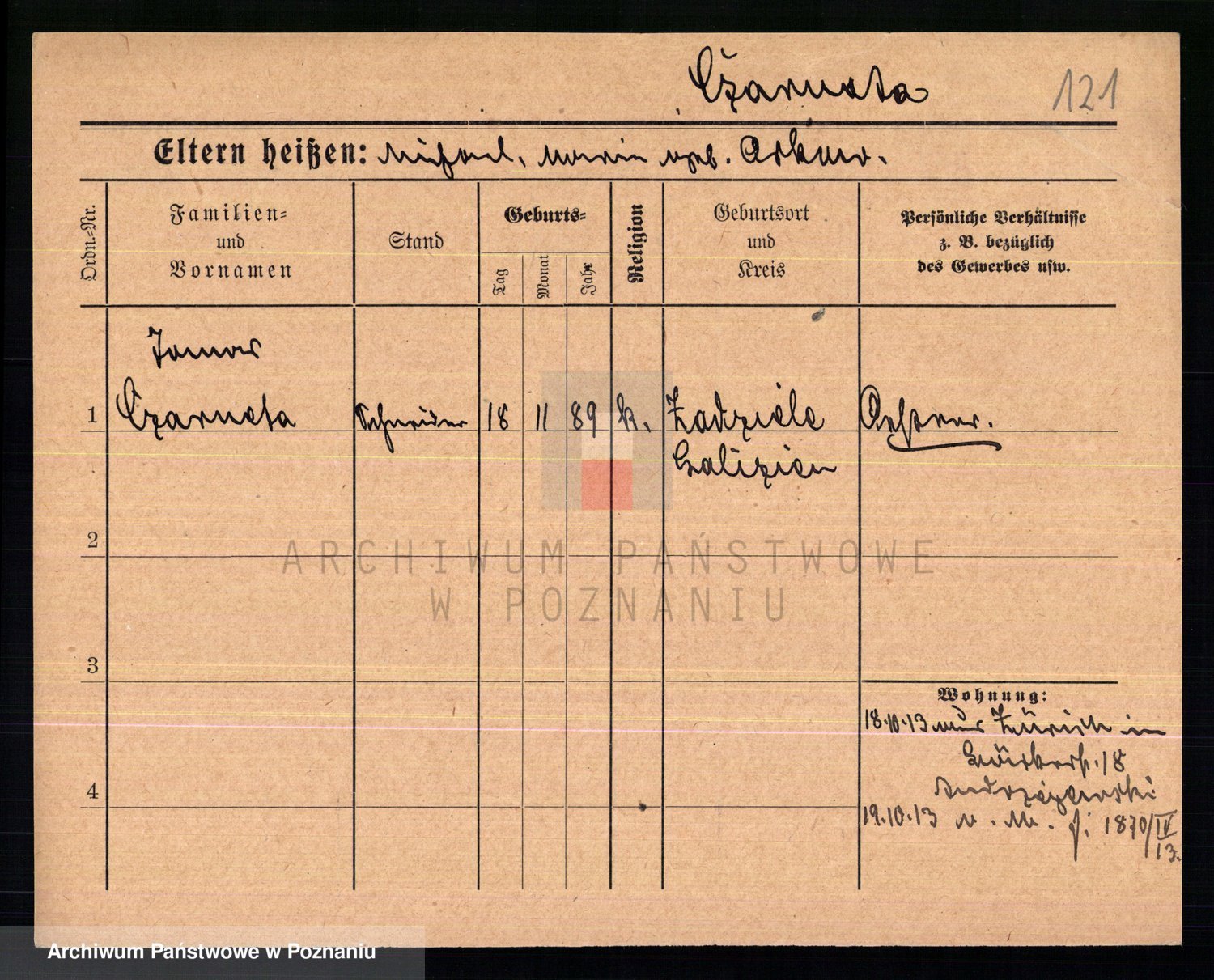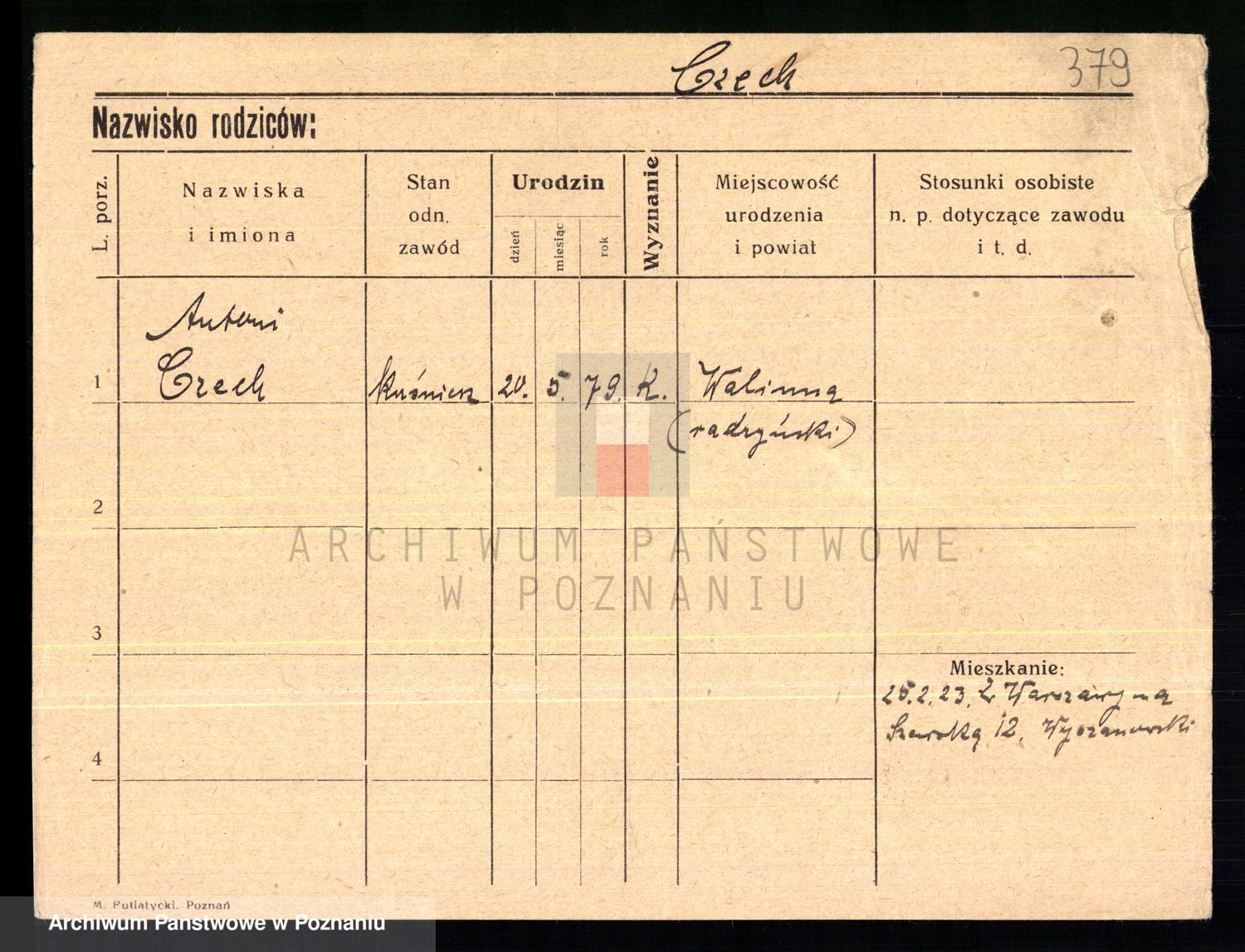 Podgląd karty osobowej dostępny jest po kliknięciu na nazwisko lub ikonkę karty. Można dokonywać powiększenia (ikony na górze) lub przechodzić między kolejnymi skanami (strzałki po bokach).