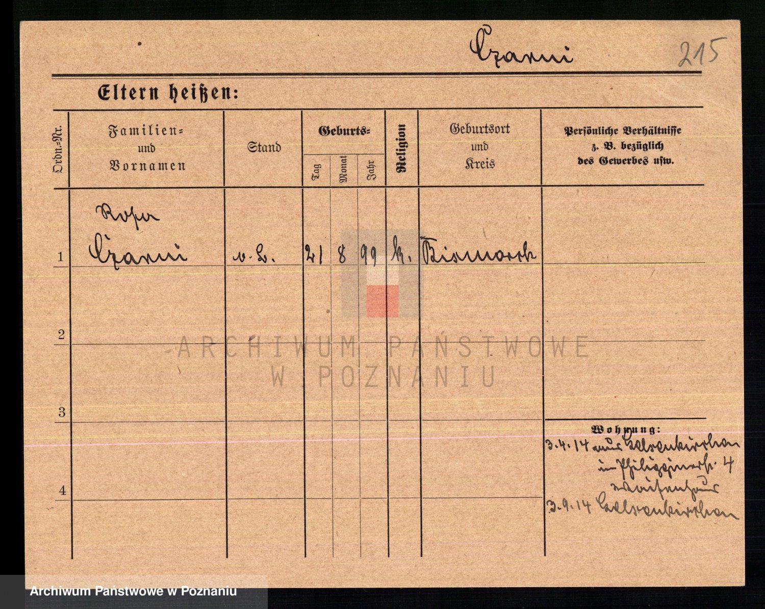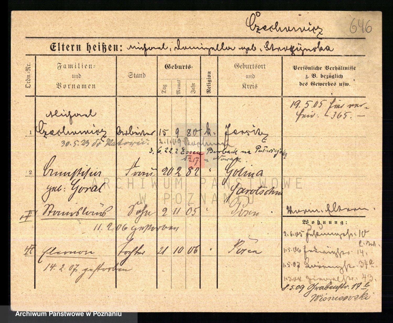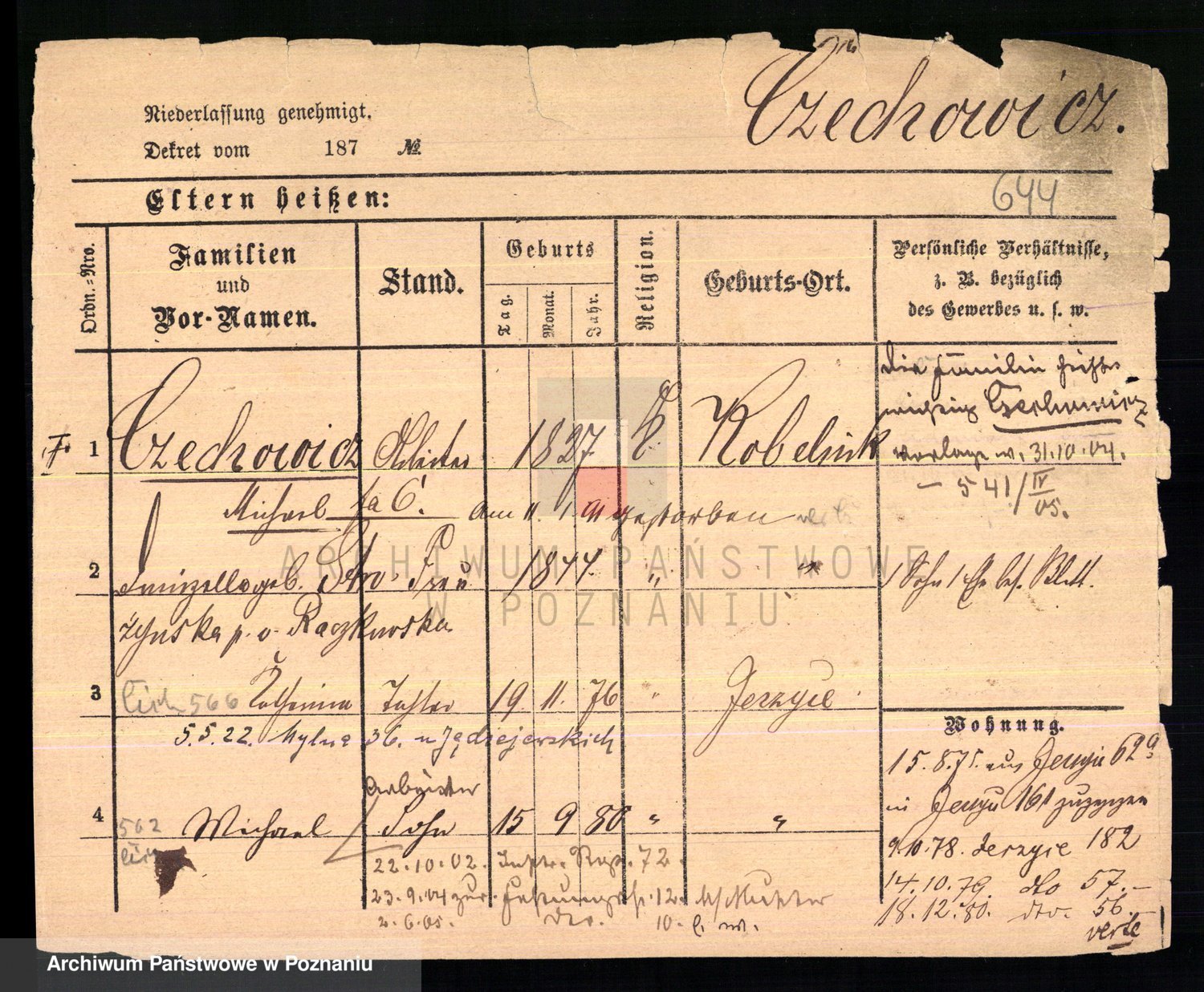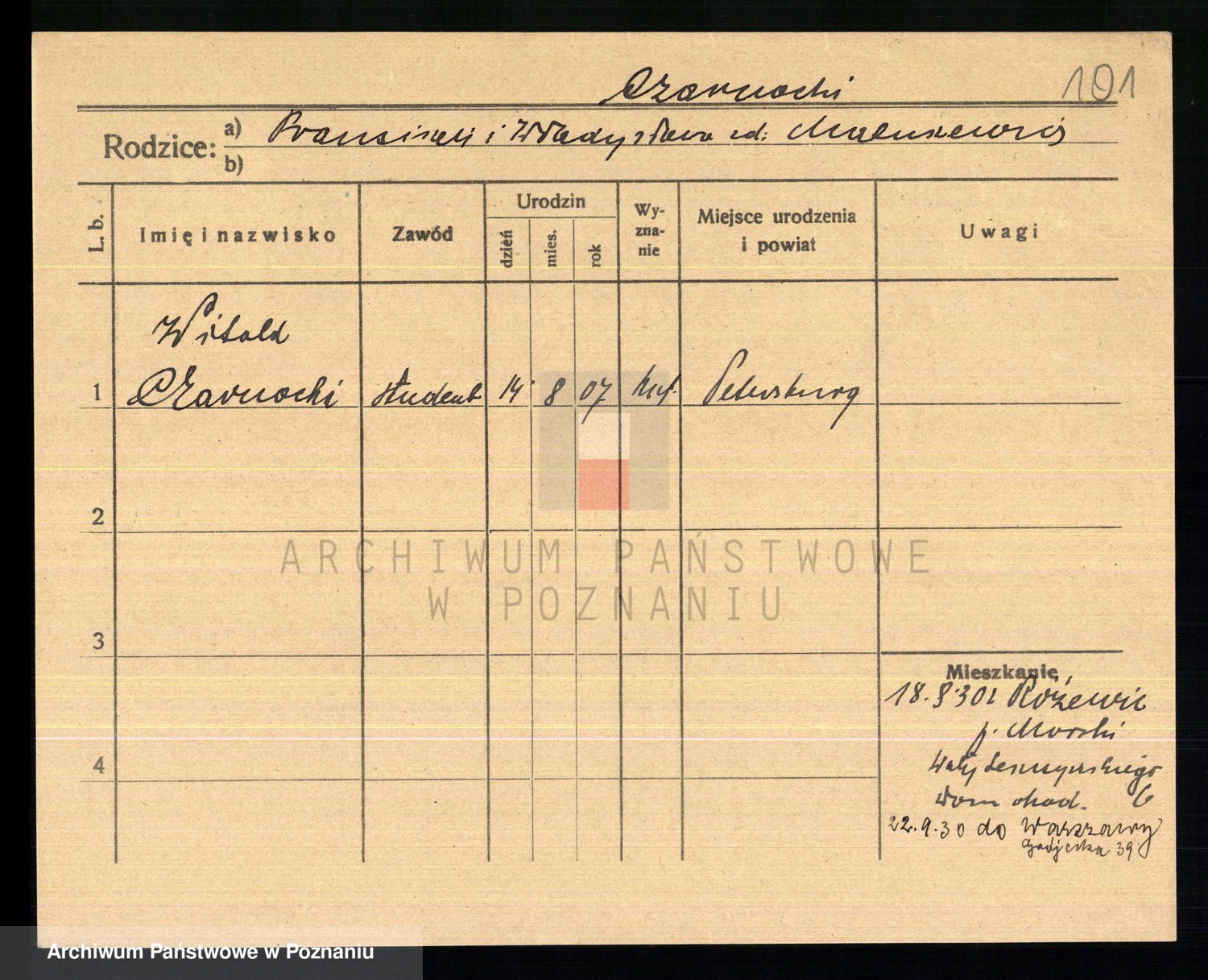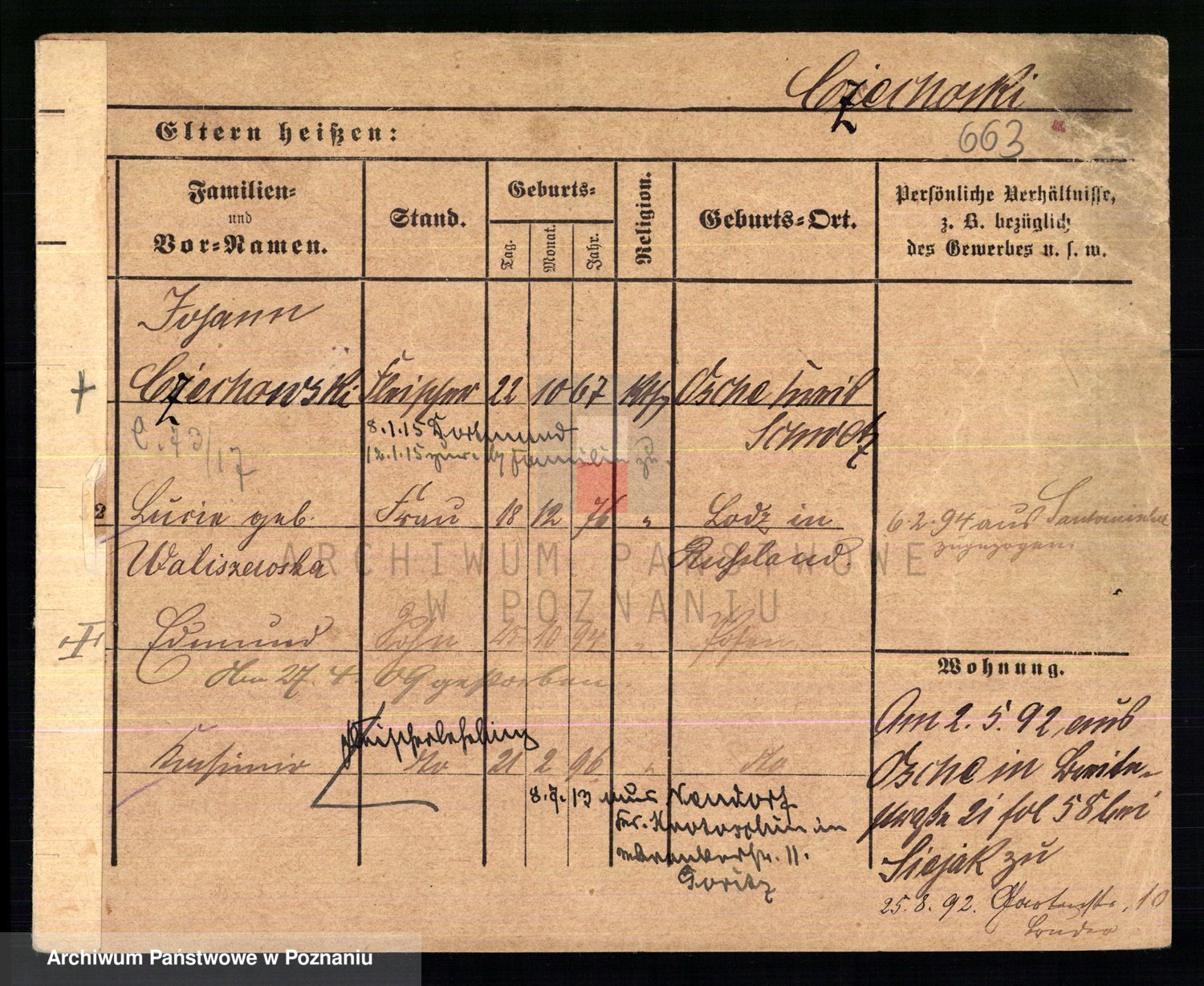 Podgląd karty osobowej dostępny jest po kliknięciu na nazwisko lub ikonkę karty. Można dokonywać powiększenia (ikony na górze) lub przechodzić między kolejnymi skanami (strzałki po bokach).