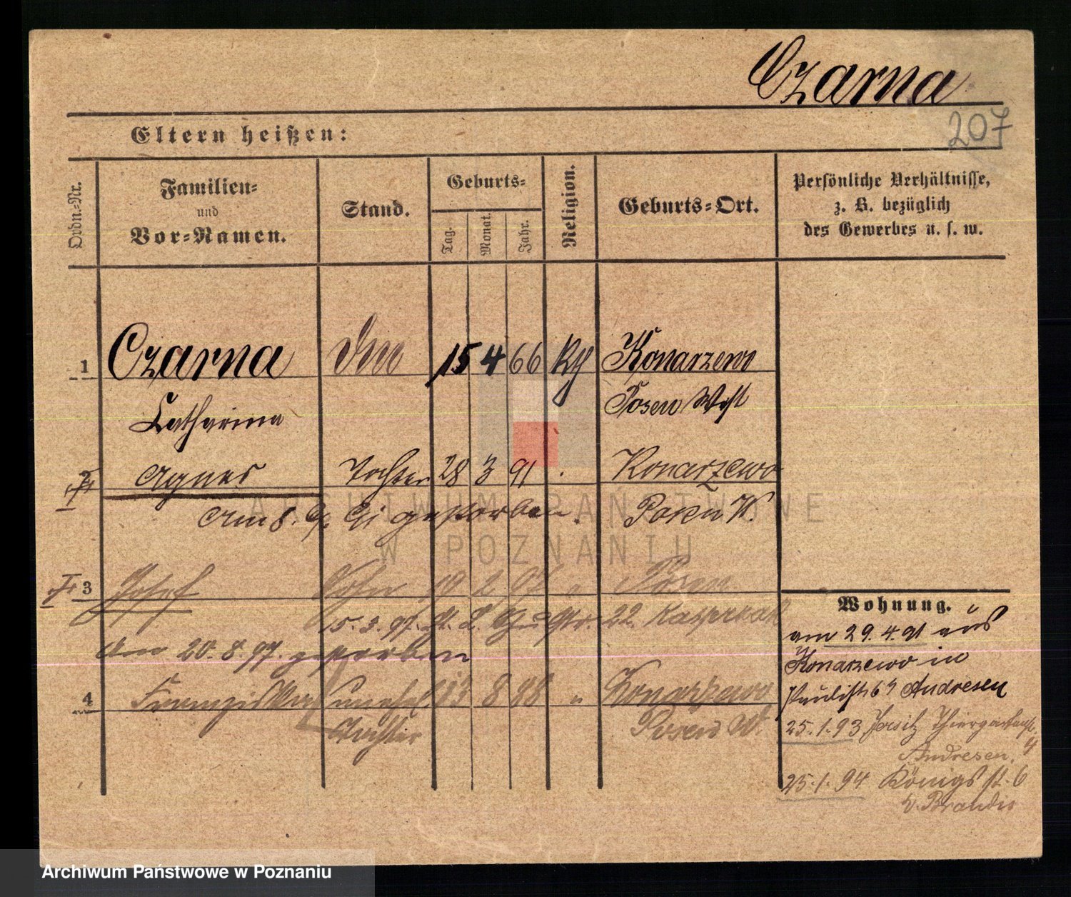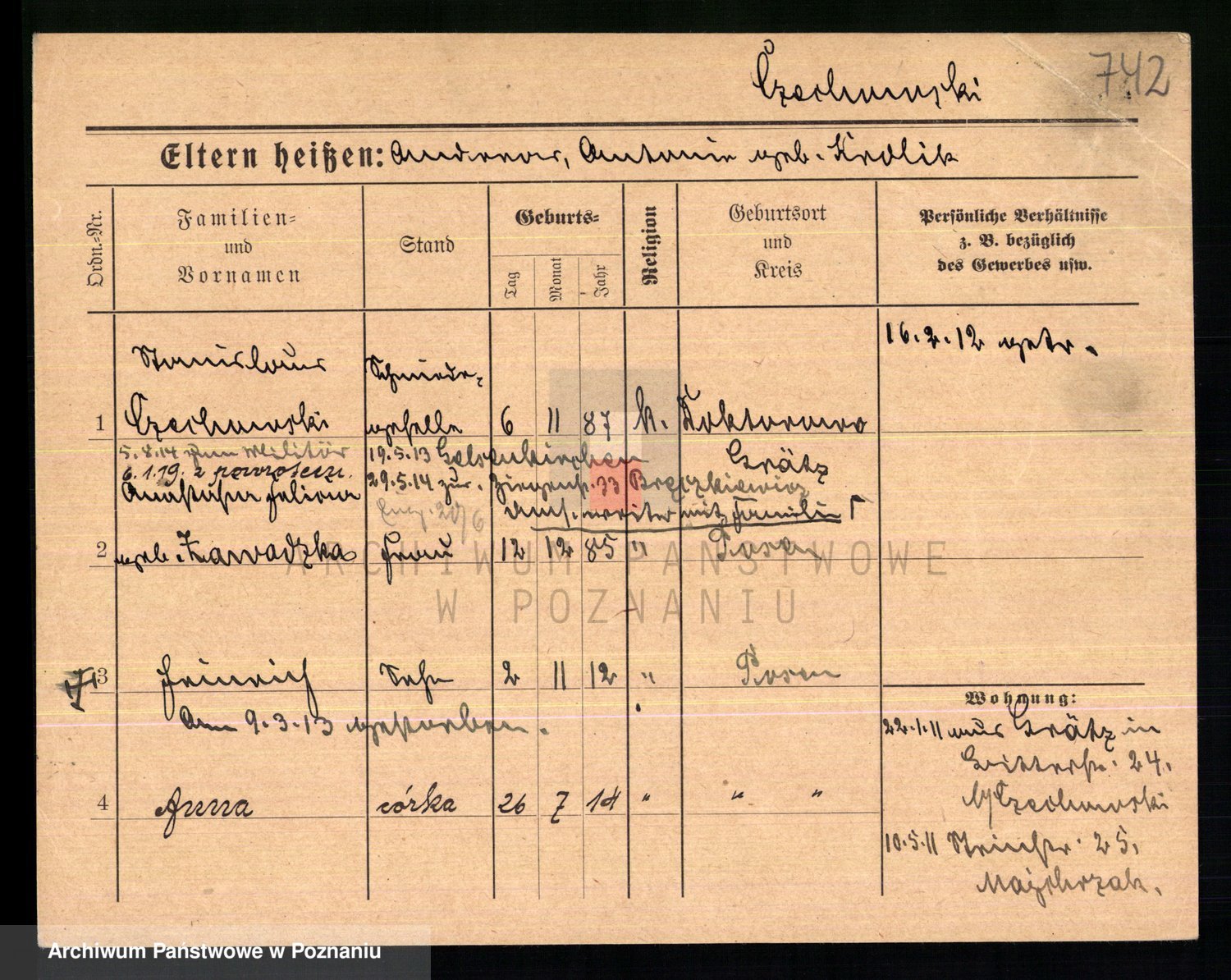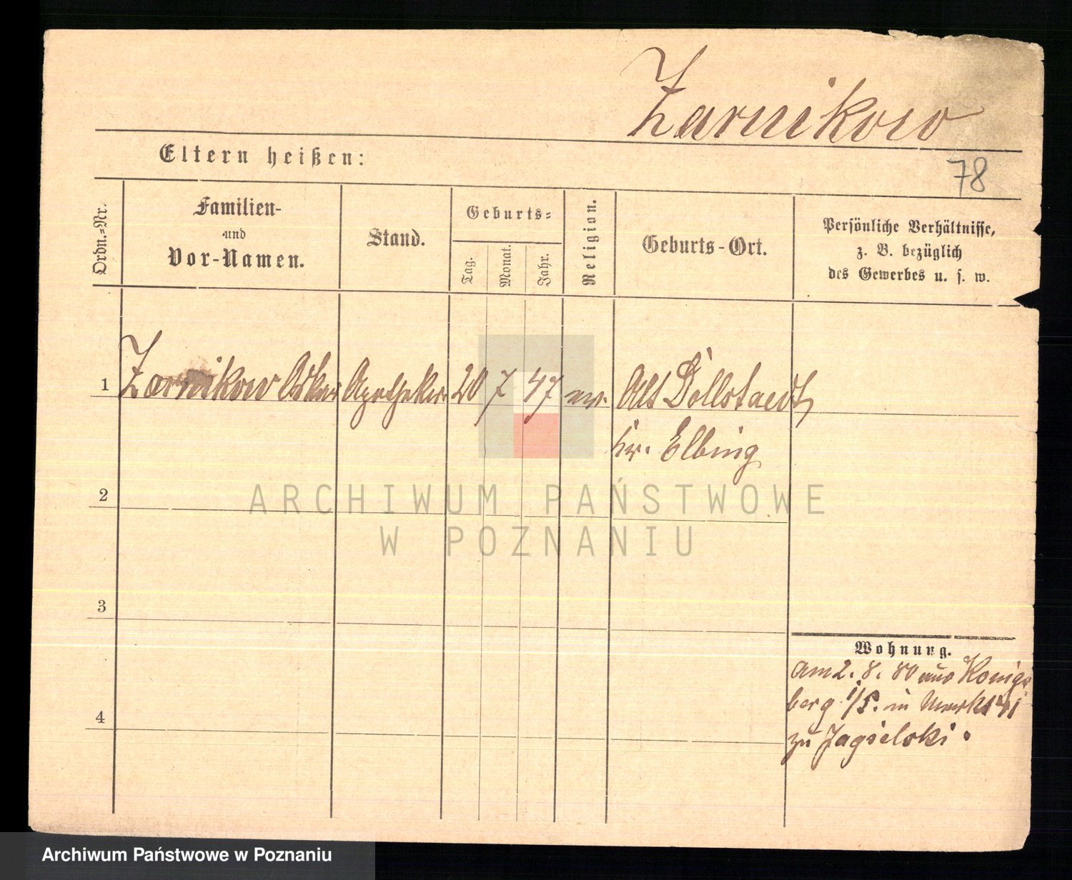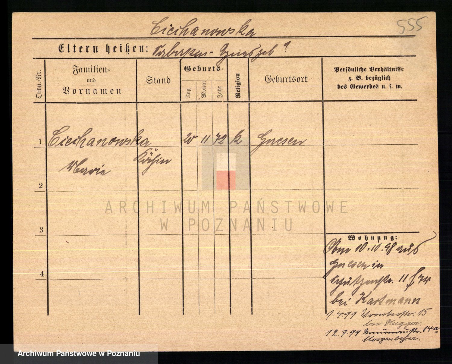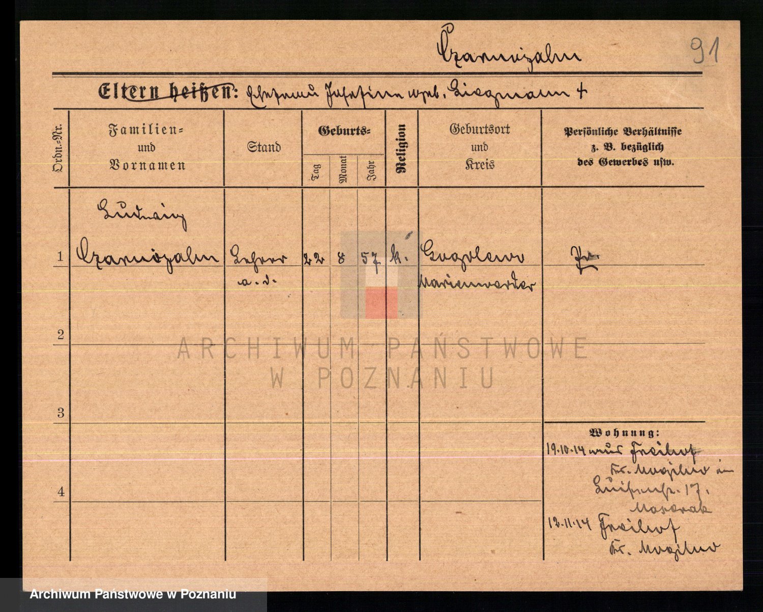 Podgląd karty osobowej dostępny jest po kliknięciu na nazwisko lub ikonkę karty. Można dokonywać powiększenia (ikony na górze) lub przechodzić między kolejnymi skanami (strzałki po bokach).
