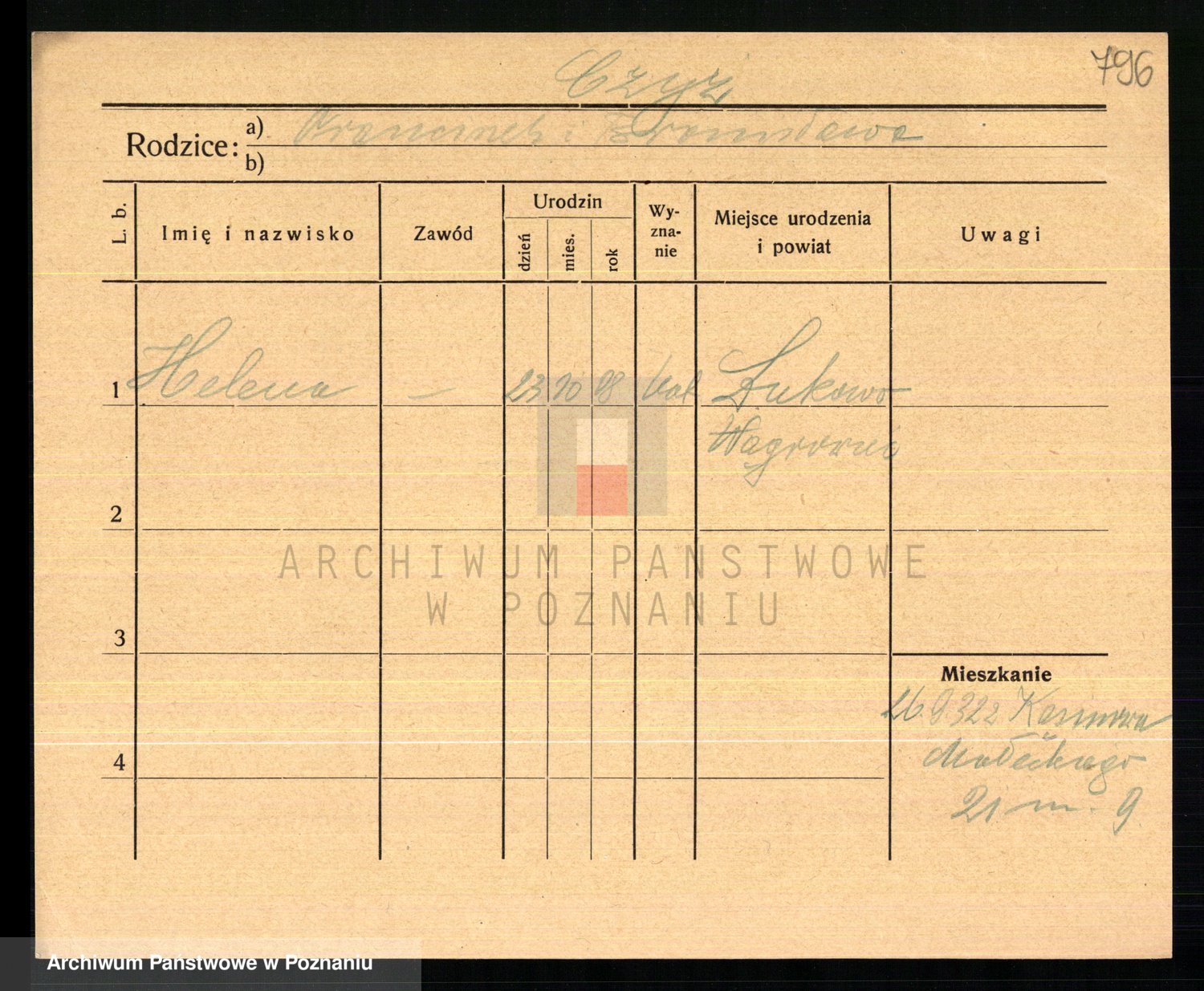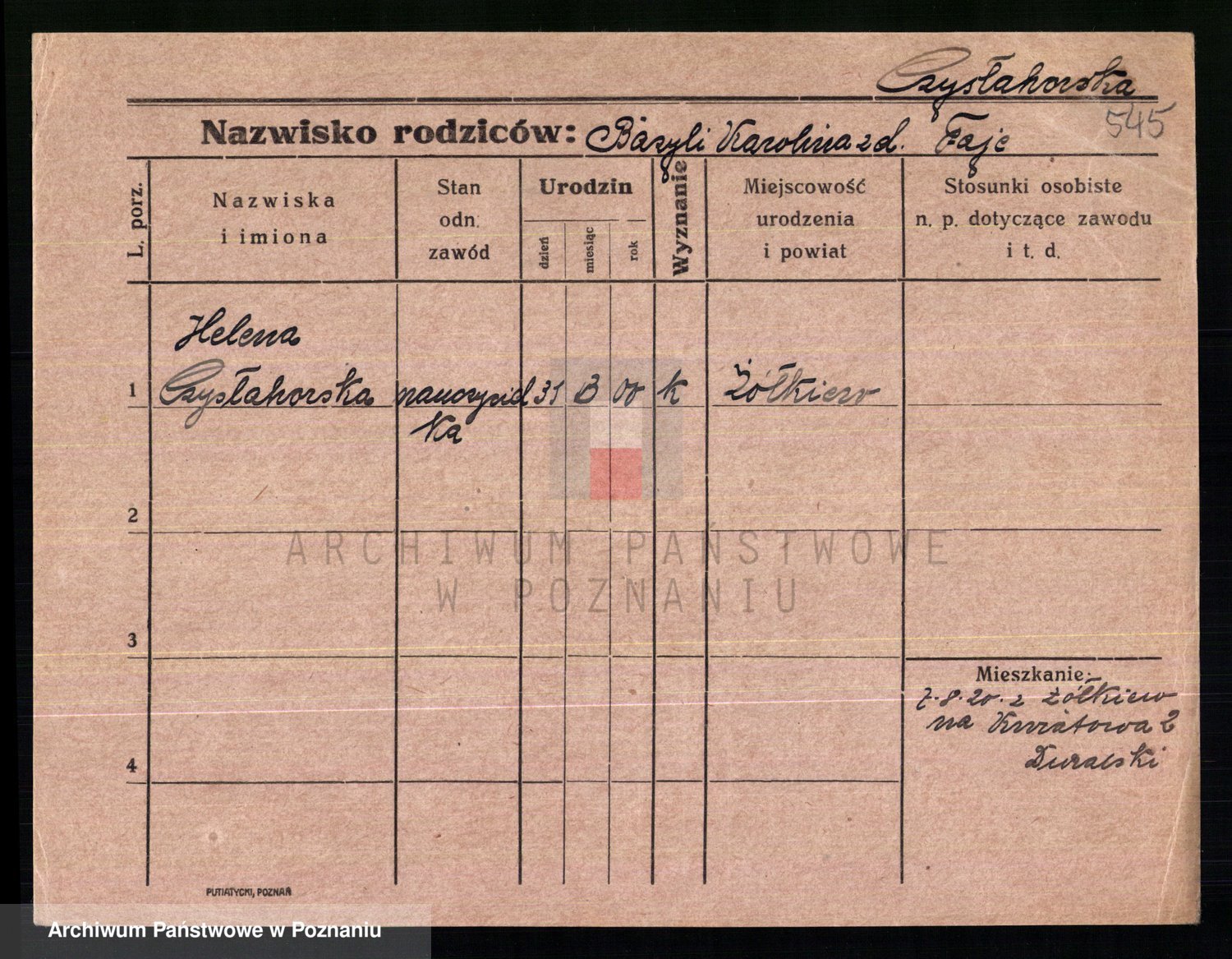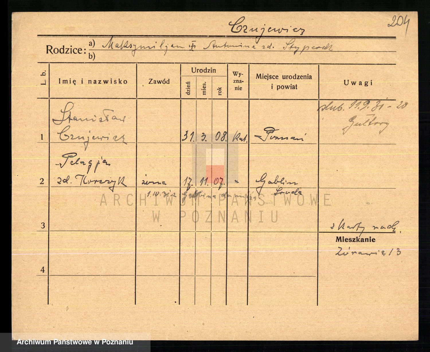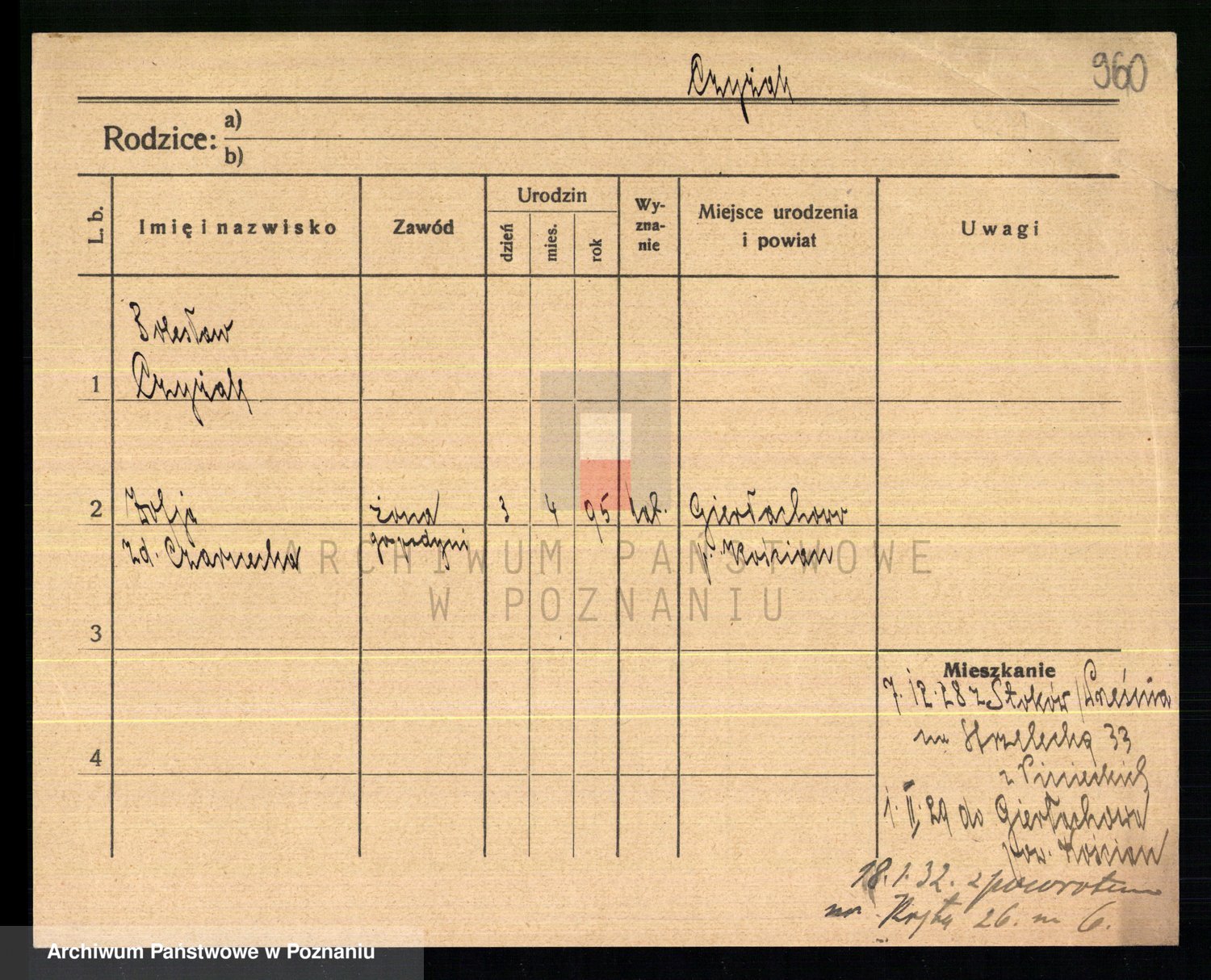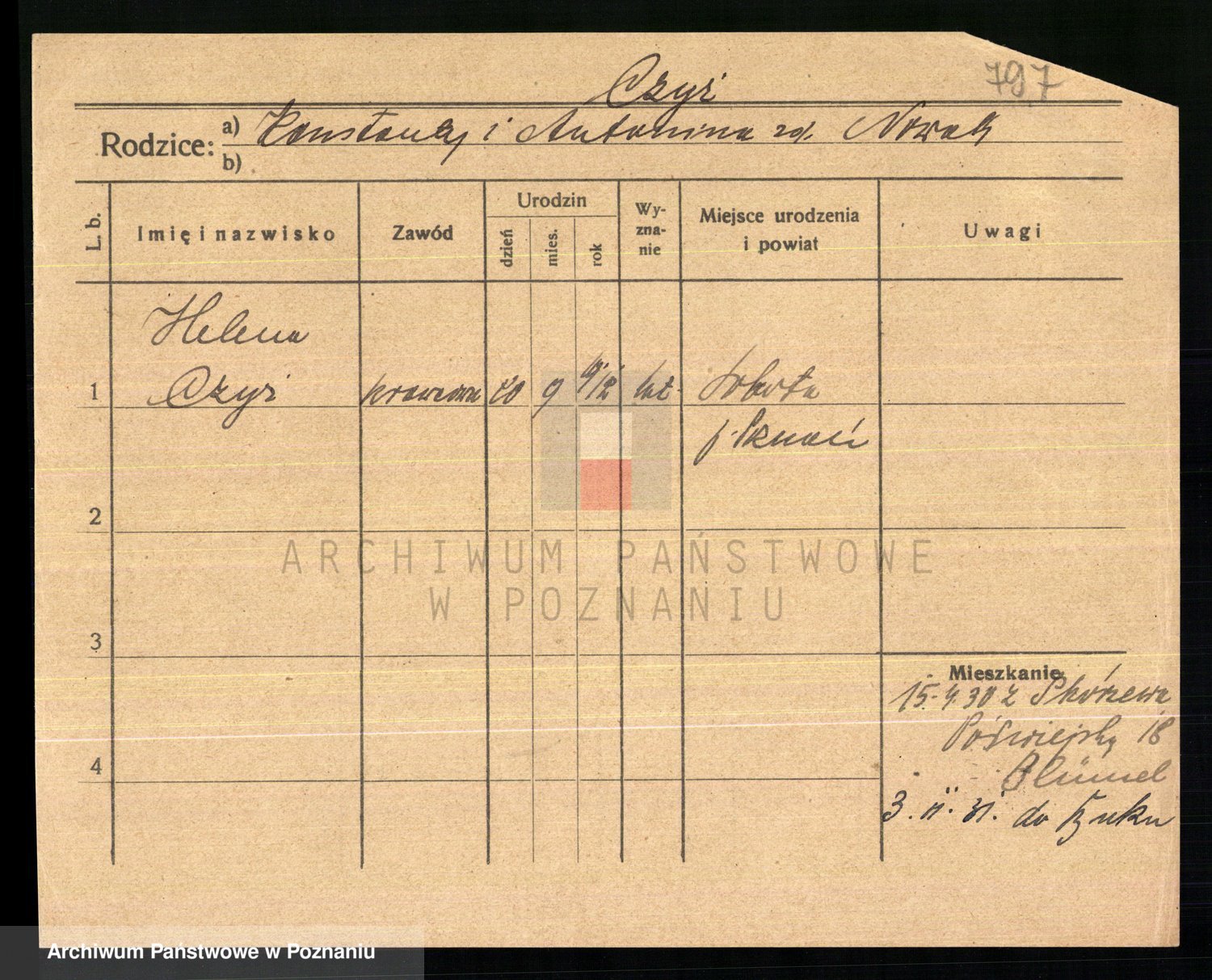 Podgląd karty osobowej dostępny jest po kliknięciu na nazwisko lub ikonkę karty. Można dokonywać powiększenia (ikony na górze) lub przechodzić między kolejnymi skanami (strzałki po bokach).