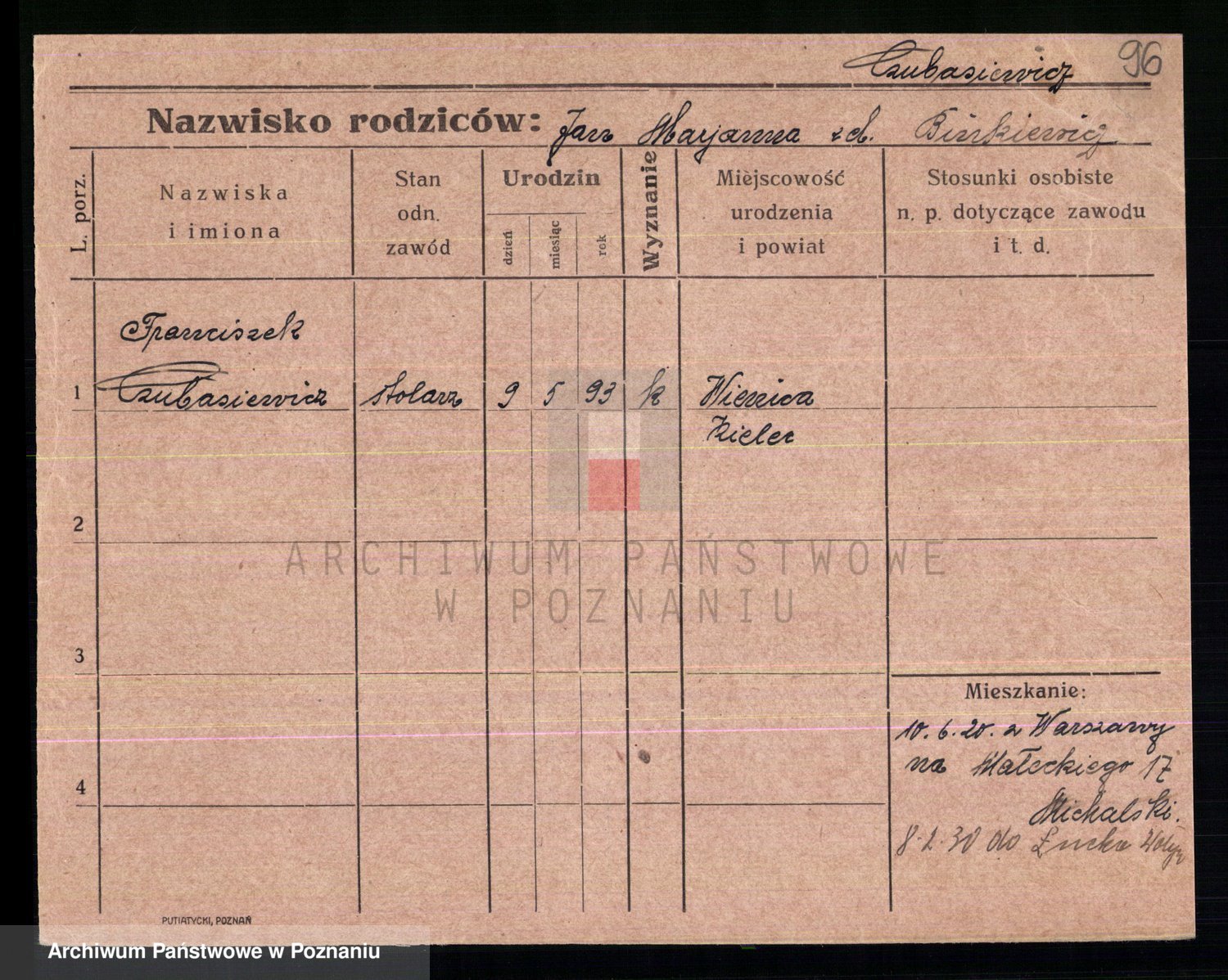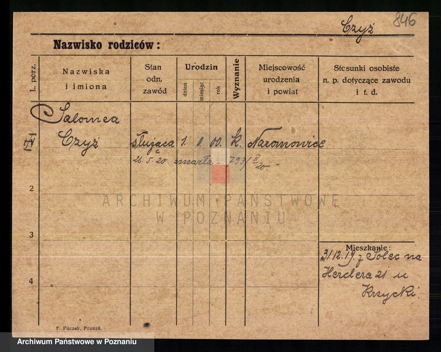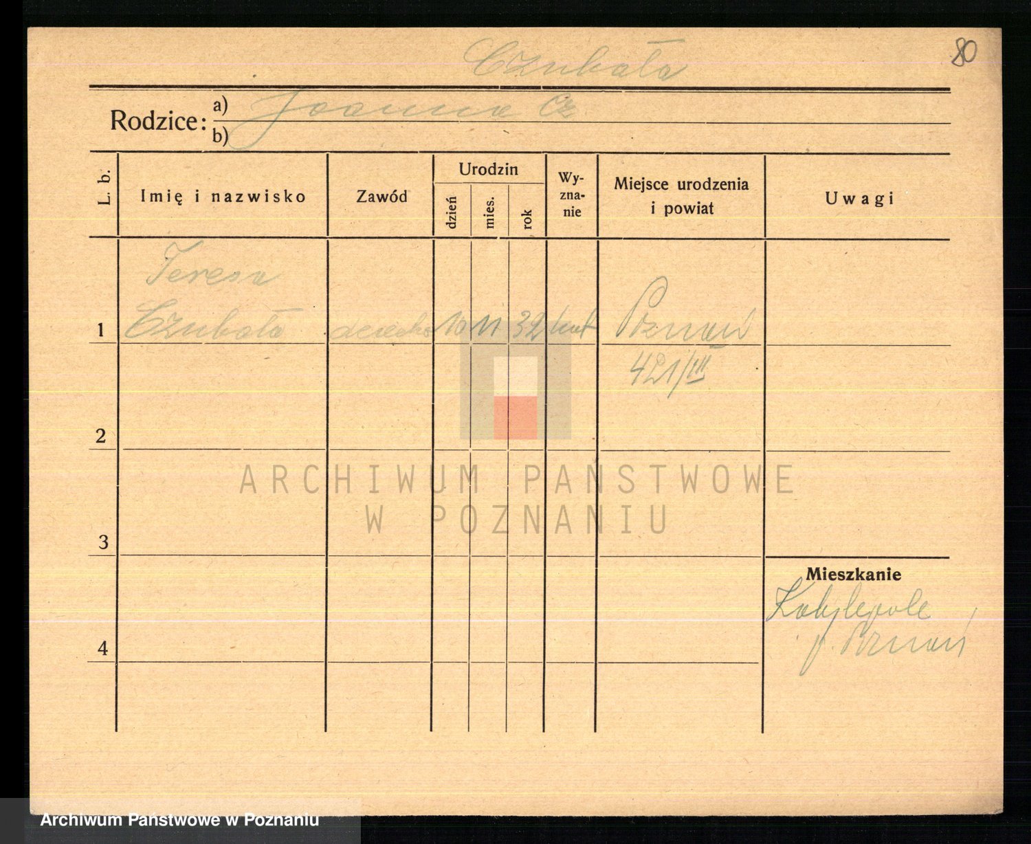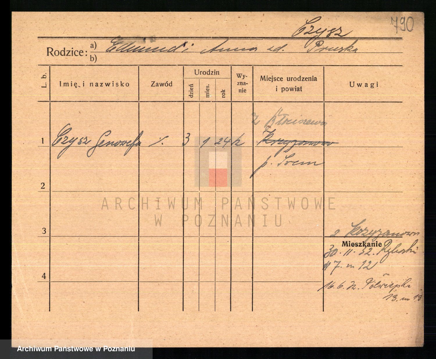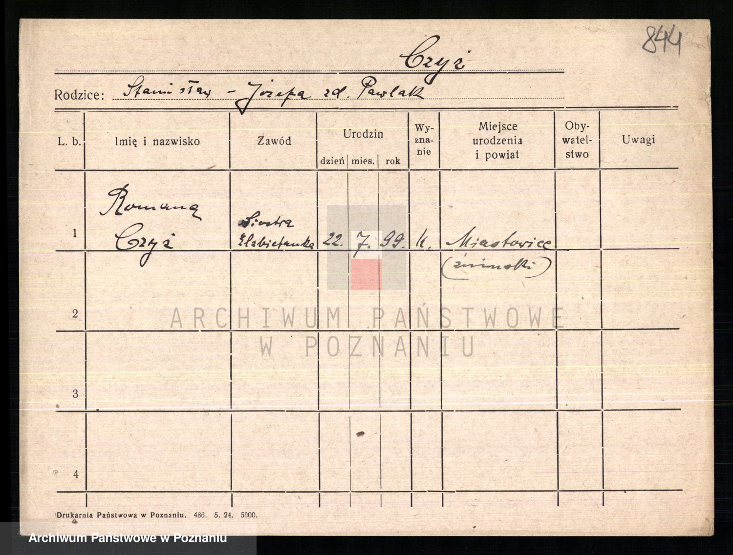 Podgląd karty osobowej dostępny jest po kliknięciu na nazwisko lub ikonkę karty. Można dokonywać powiększenia (ikony na górze) lub przechodzić między kolejnymi skanami (strzałki po bokach).
