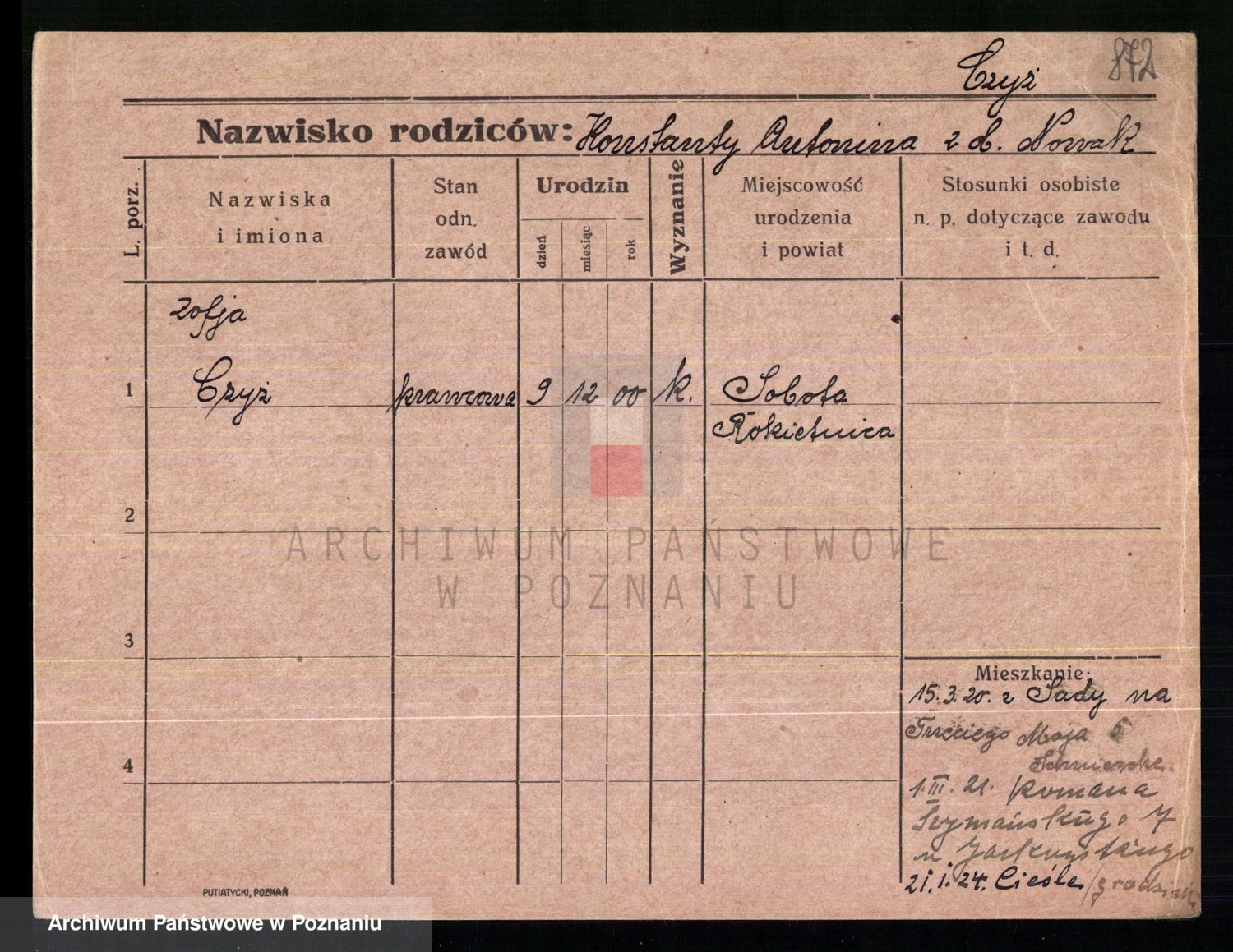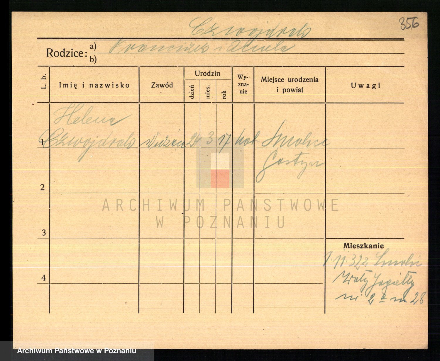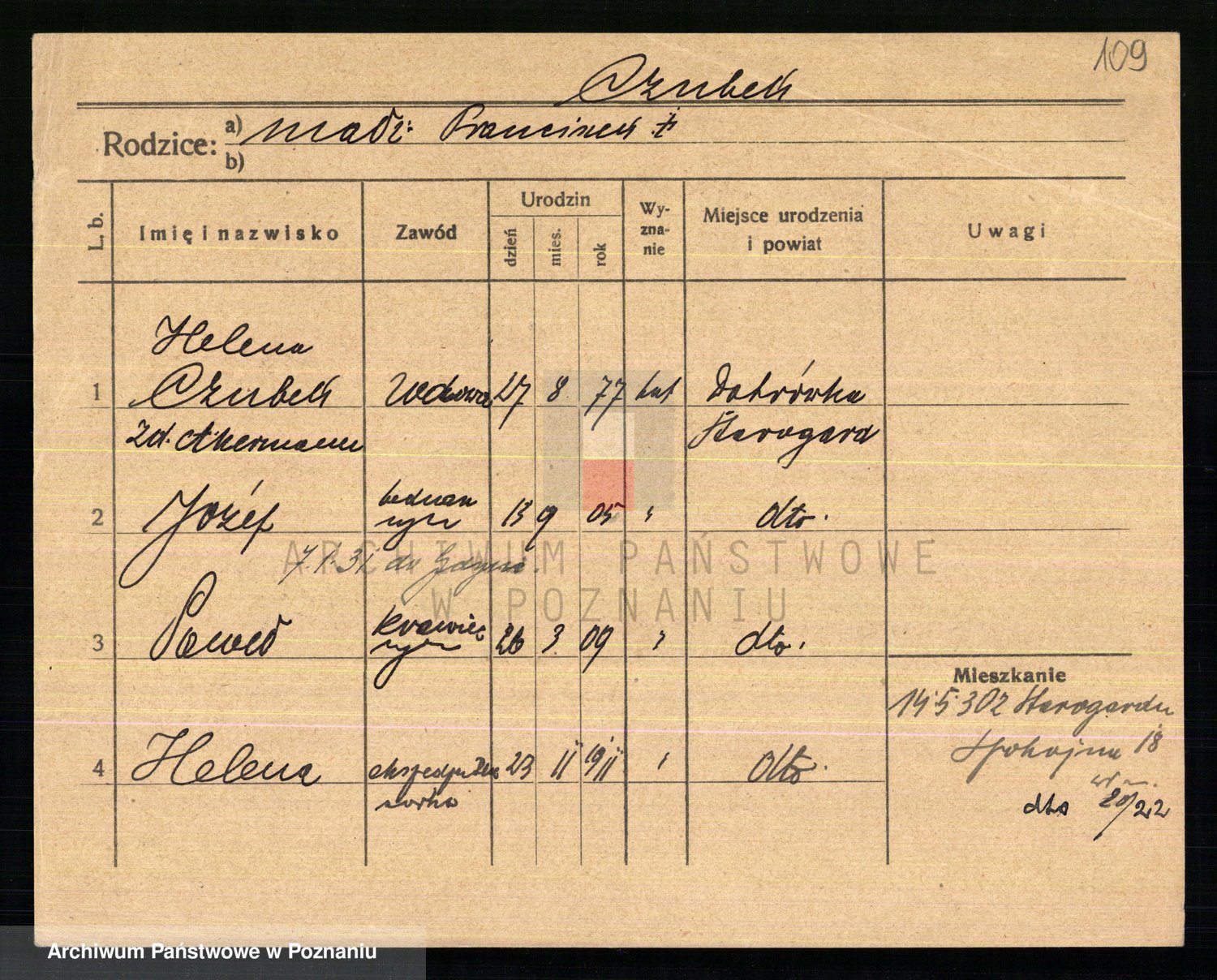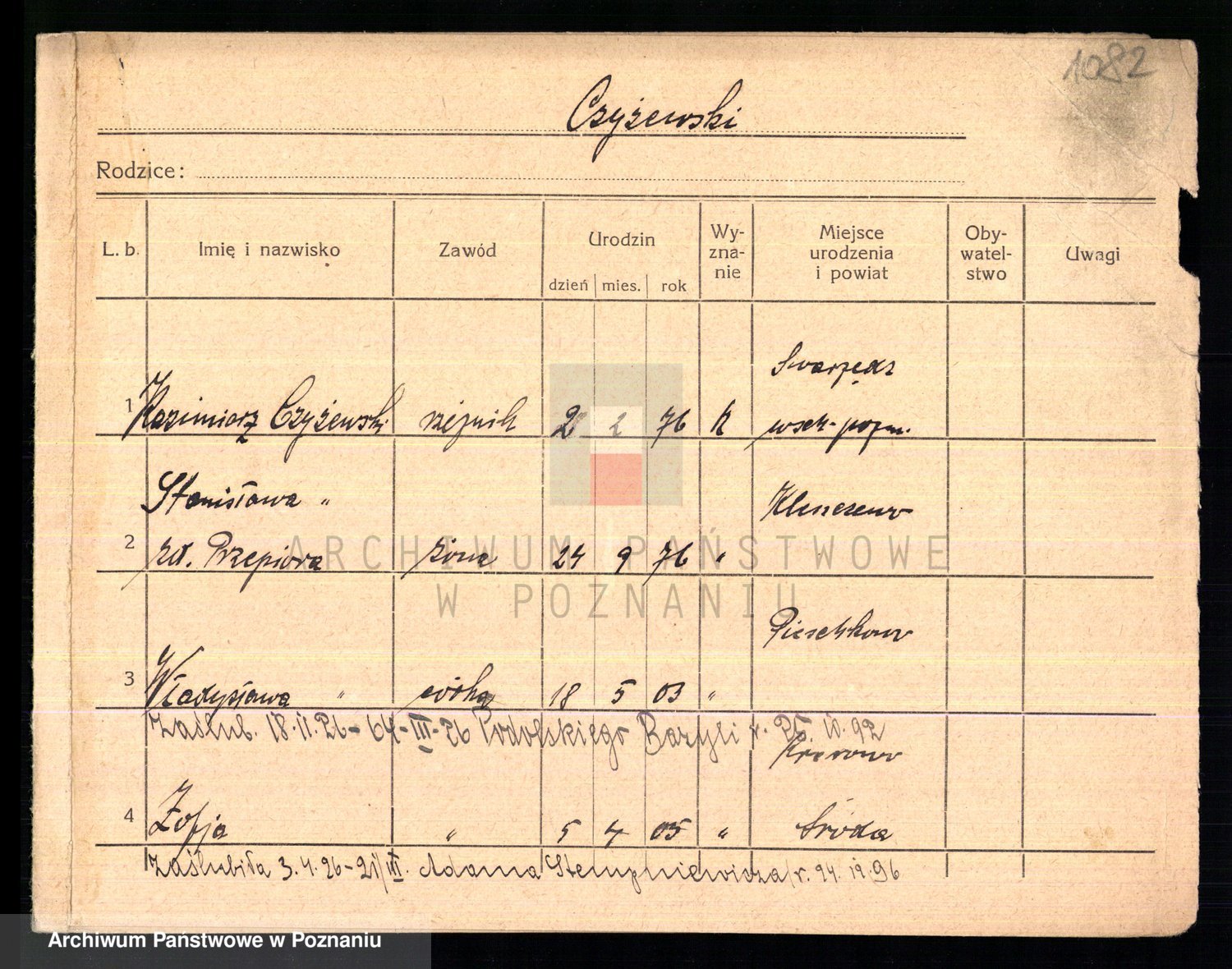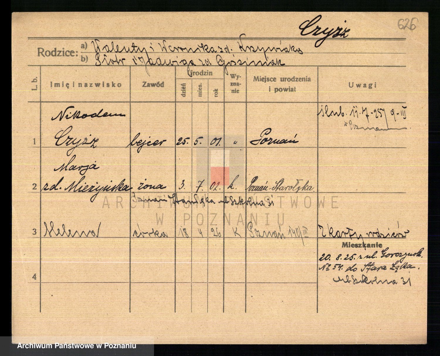 Podgląd karty osobowej dostępny jest po kliknięciu na nazwisko lub ikonkę karty. Można dokonywać powiększenia (ikony na górze) lub przechodzić między kolejnymi skanami (strzałki po bokach).