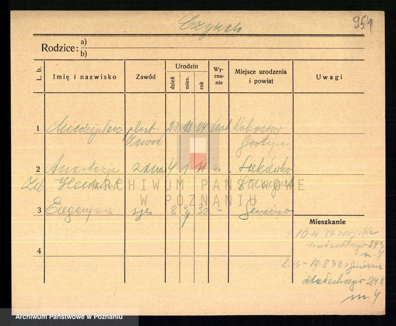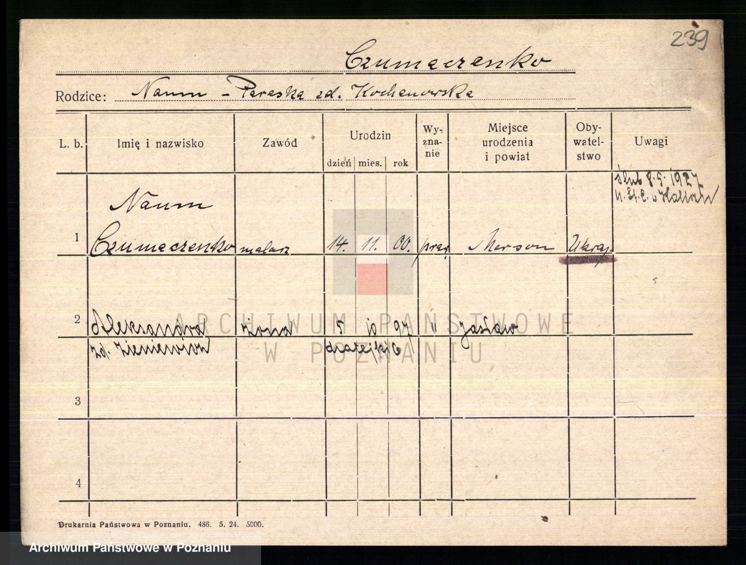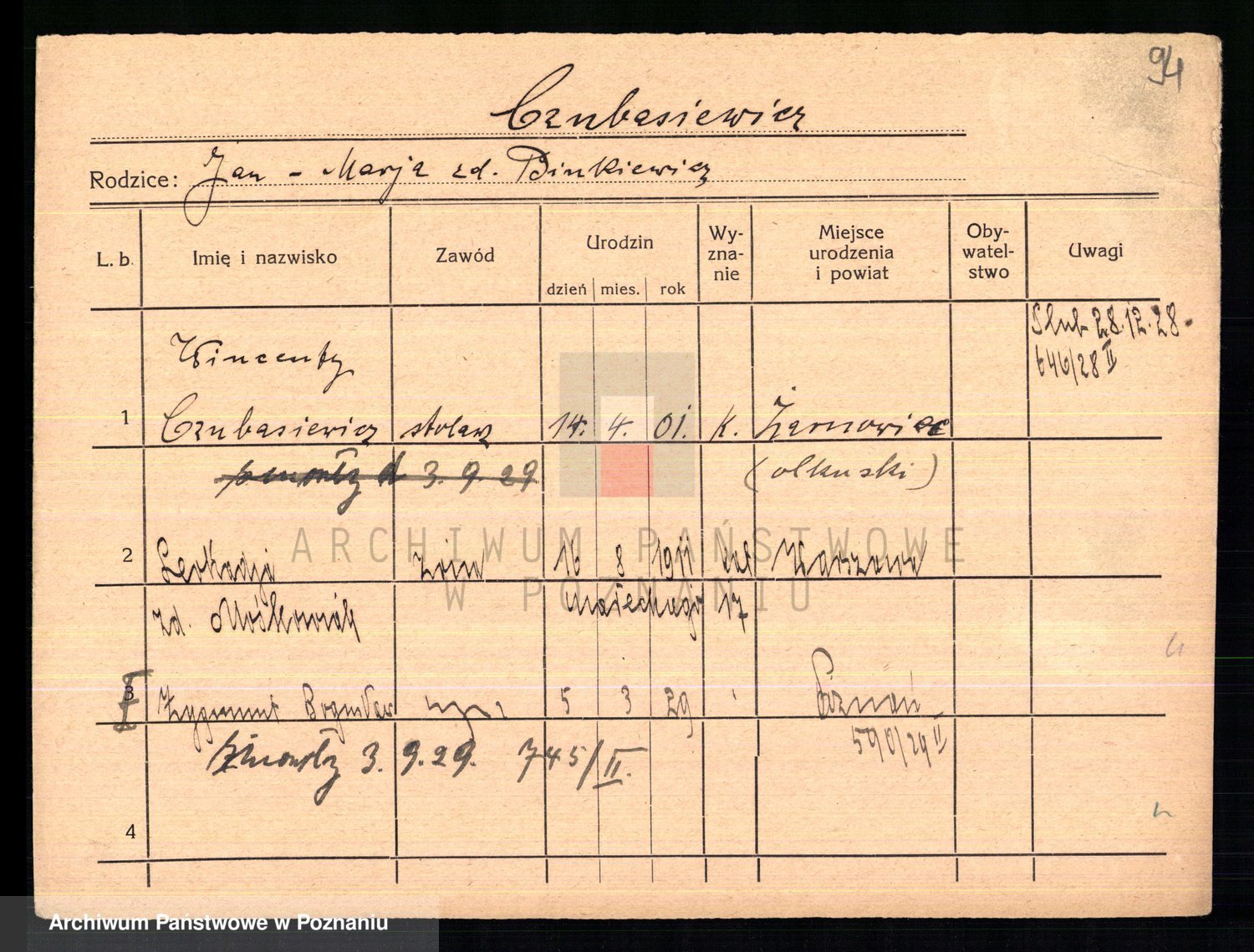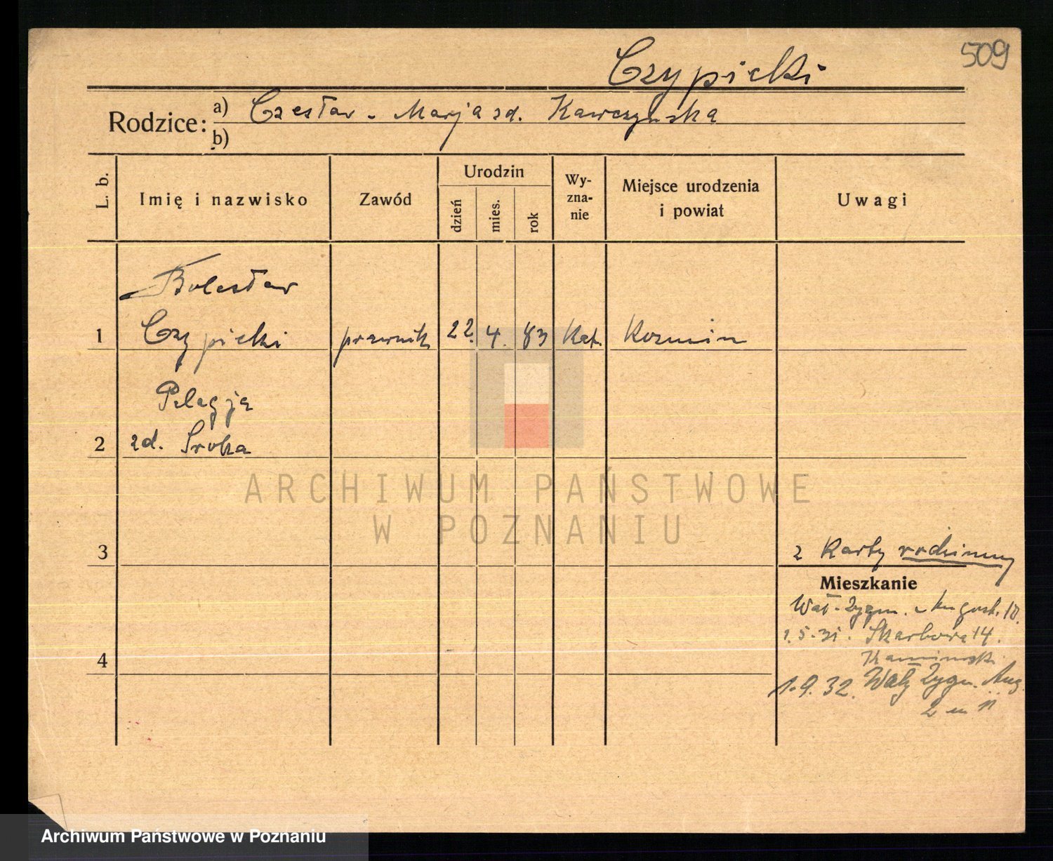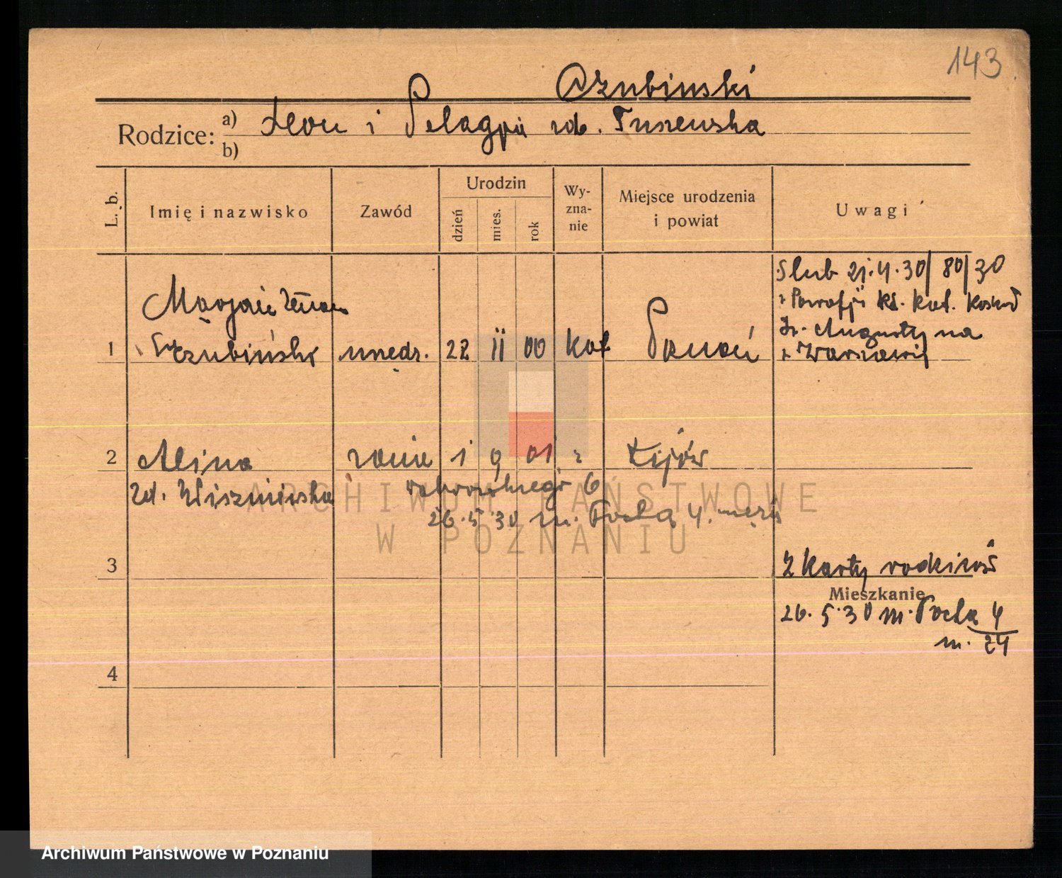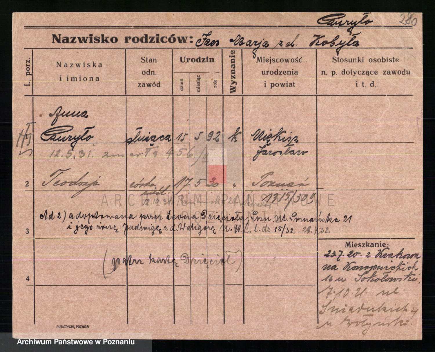 Podgląd karty osobowej dostępny jest po kliknięciu na nazwisko lub ikonkę karty. Można dokonywać powiększenia (ikony na górze) lub przechodzić między kolejnymi skanami (strzałki po bokach).