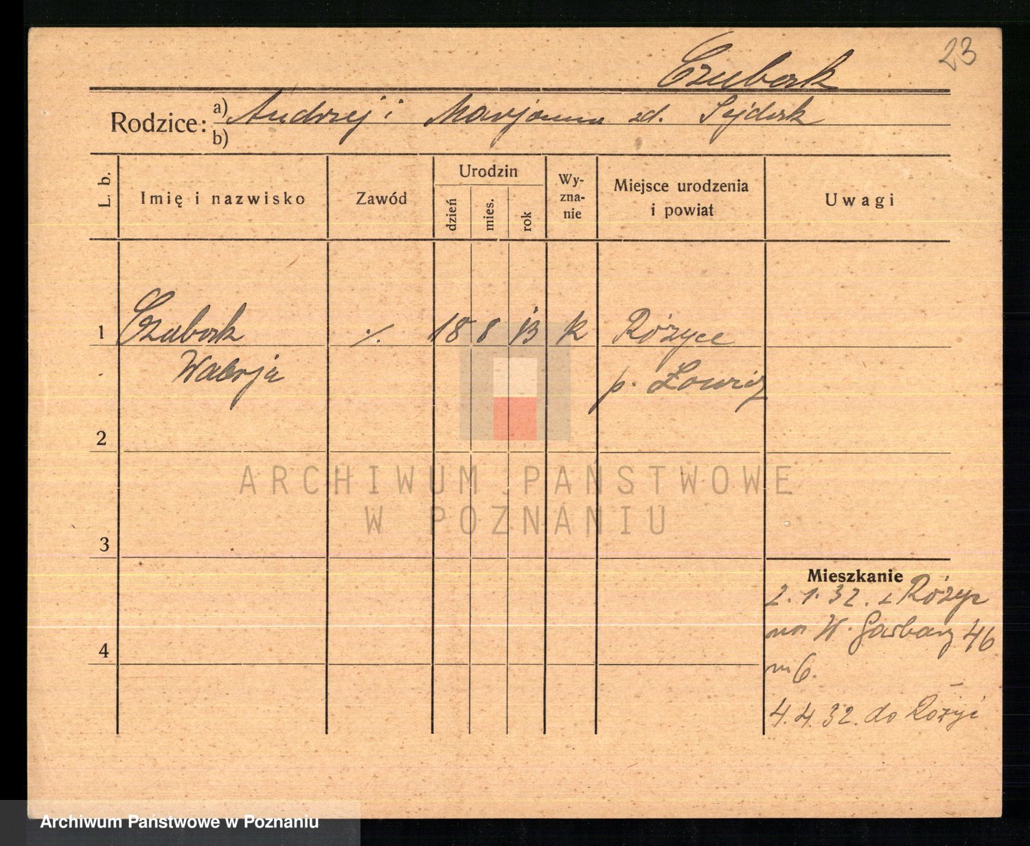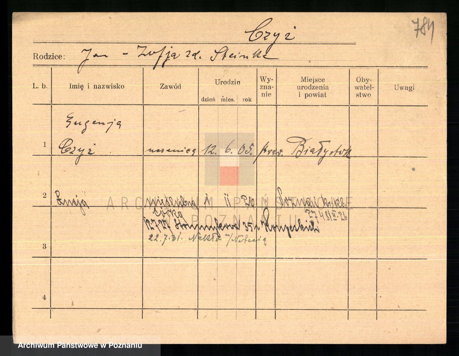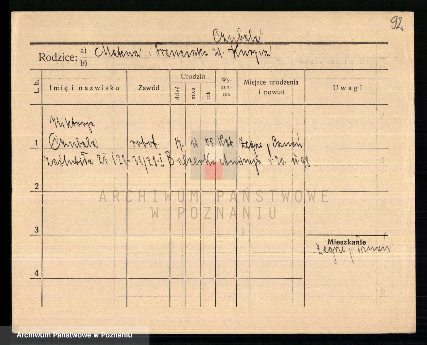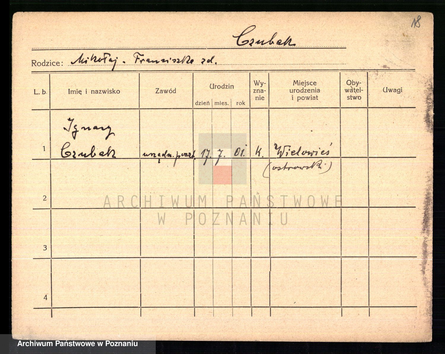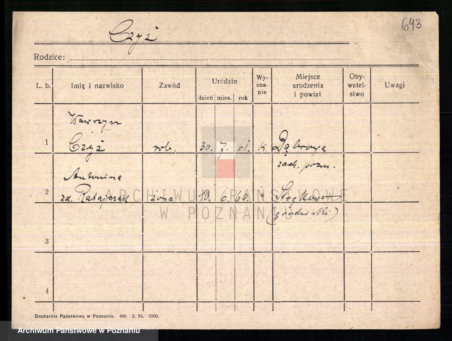 Podgląd karty osobowej dostępny jest po kliknięciu na nazwisko lub ikonkę karty. Można dokonywać powiększenia (ikony na górze) lub przechodzić między kolejnymi skanami (strzałki po bokach).