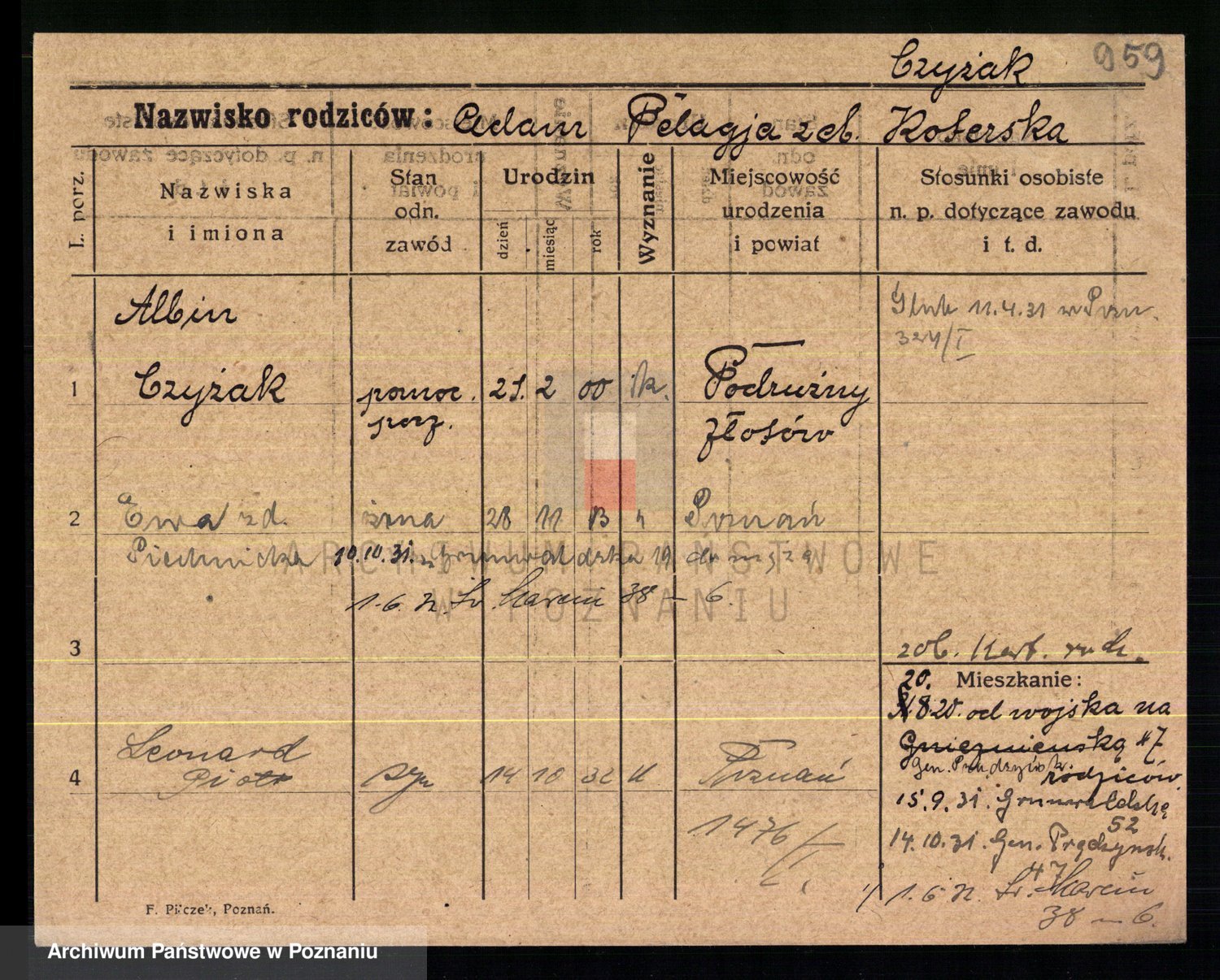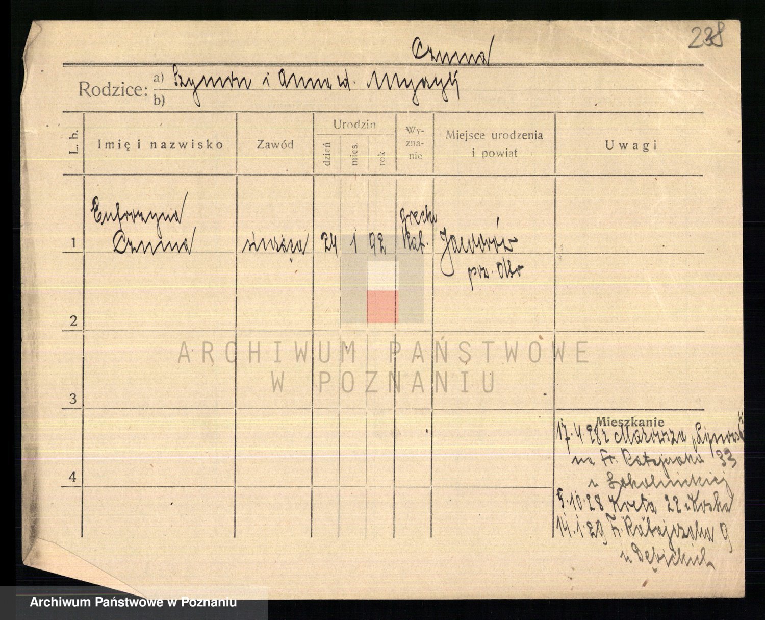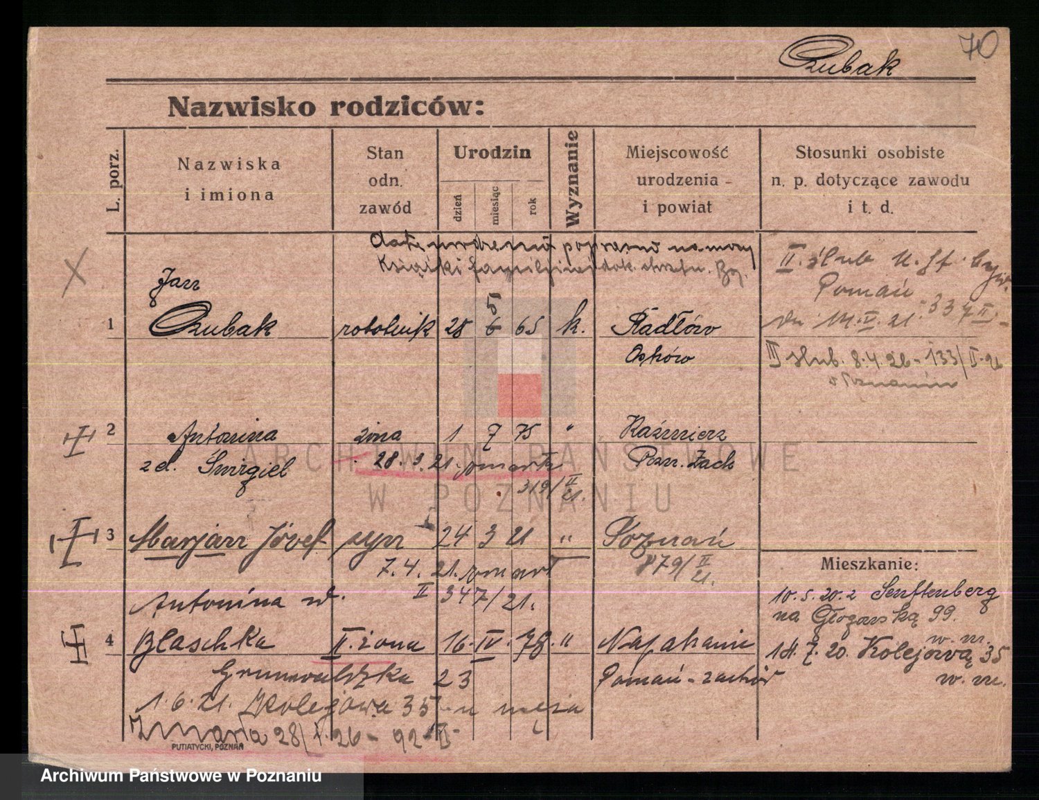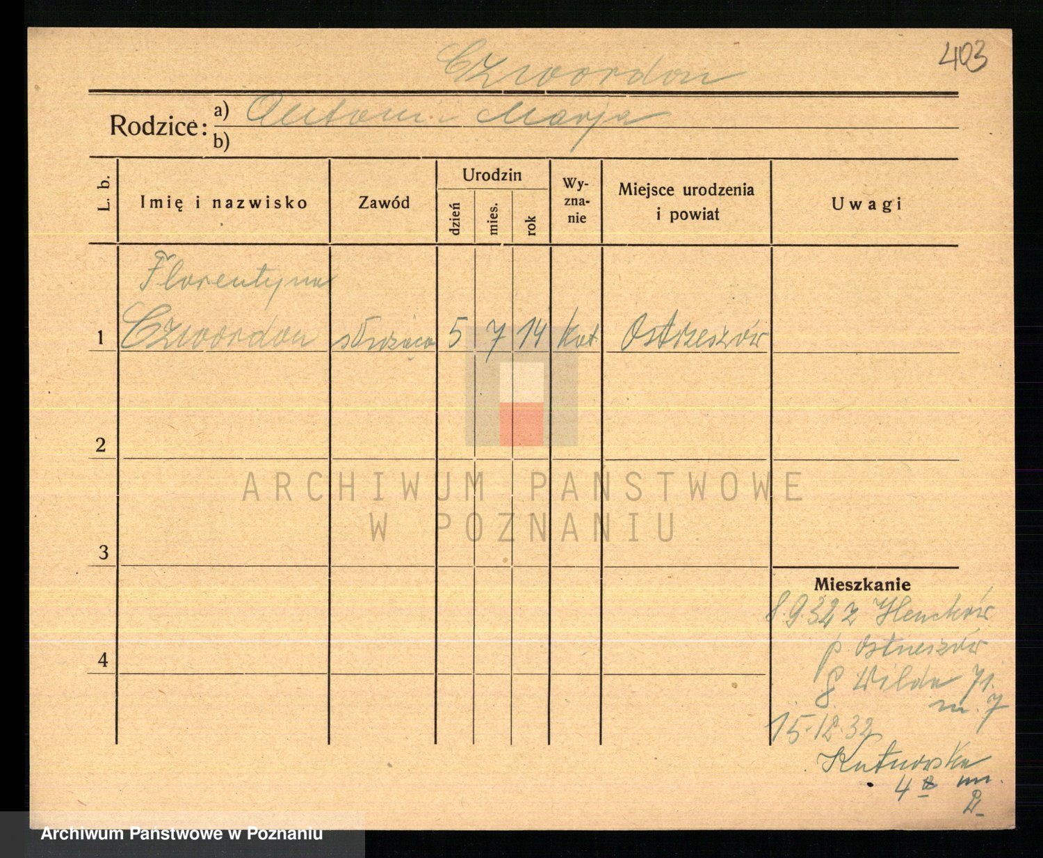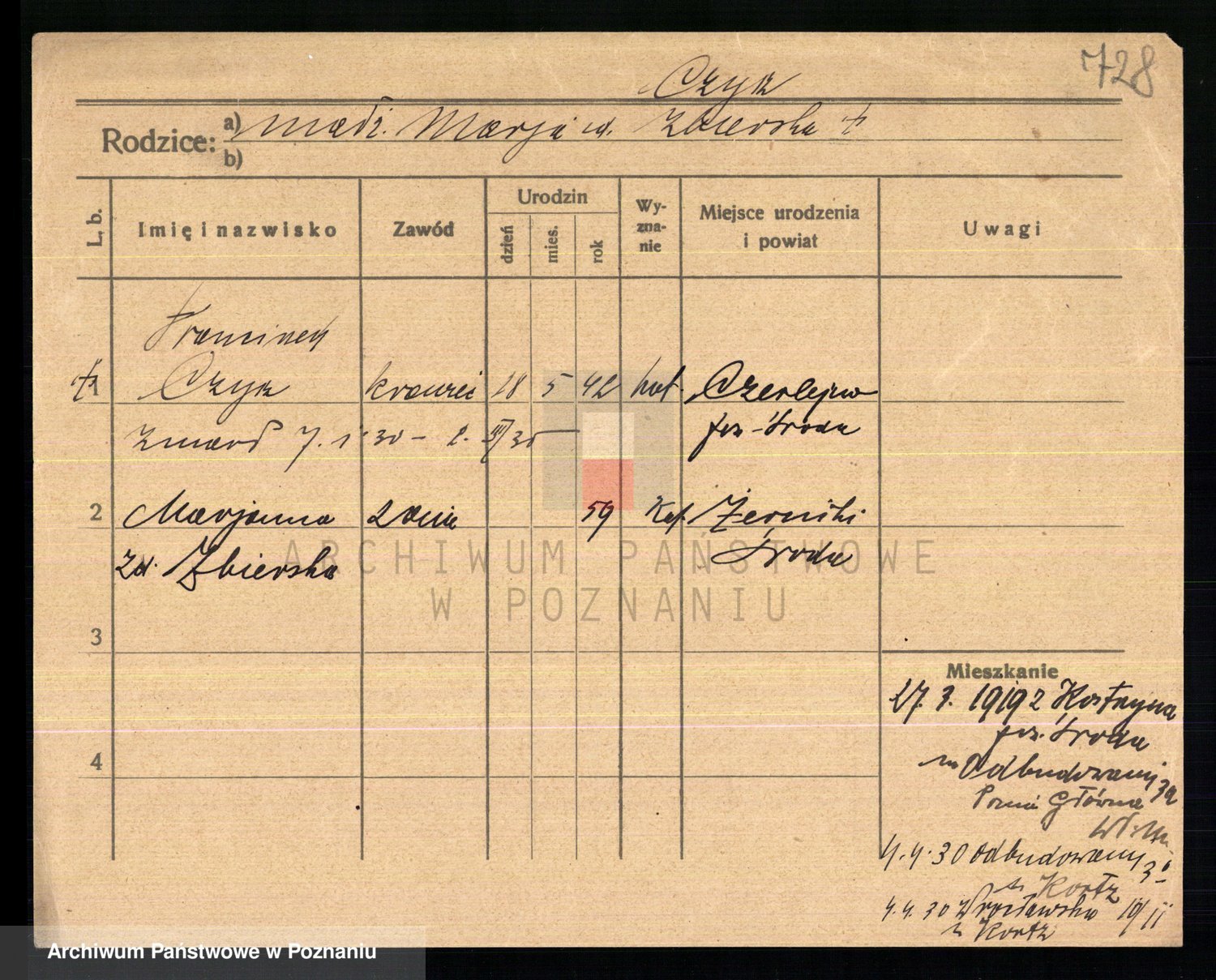 Podgląd karty osobowej dostępny jest po kliknięciu na nazwisko lub ikonkę karty. Można dokonywać powiększenia (ikony na górze) lub przechodzić między kolejnymi skanami (strzałki po bokach).