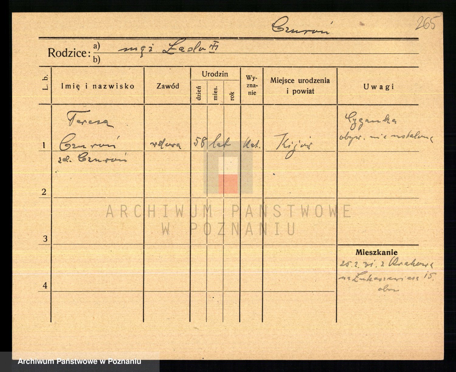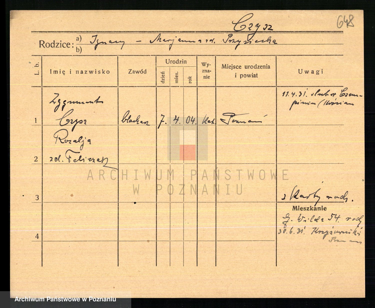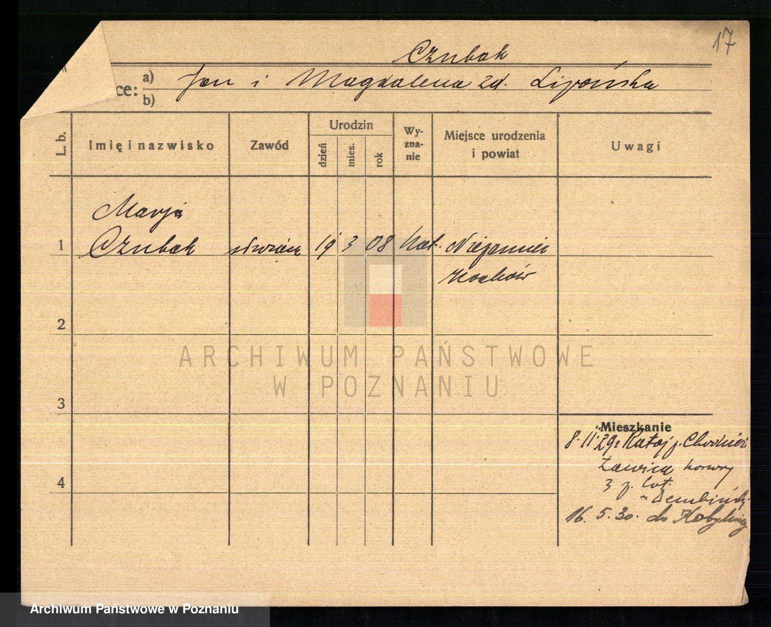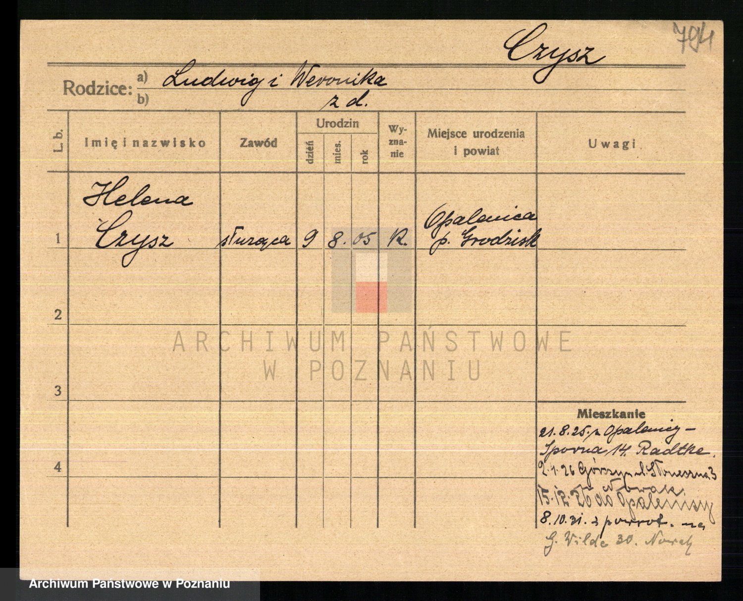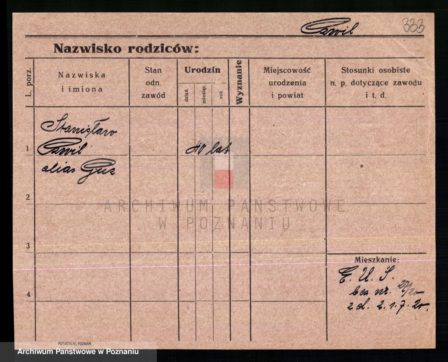 Podgląd karty osobowej dostępny jest po kliknięciu na nazwisko lub ikonkę karty. Można dokonywać powiększenia (ikony na górze) lub przechodzić między kolejnymi skanami (strzałki po bokach).