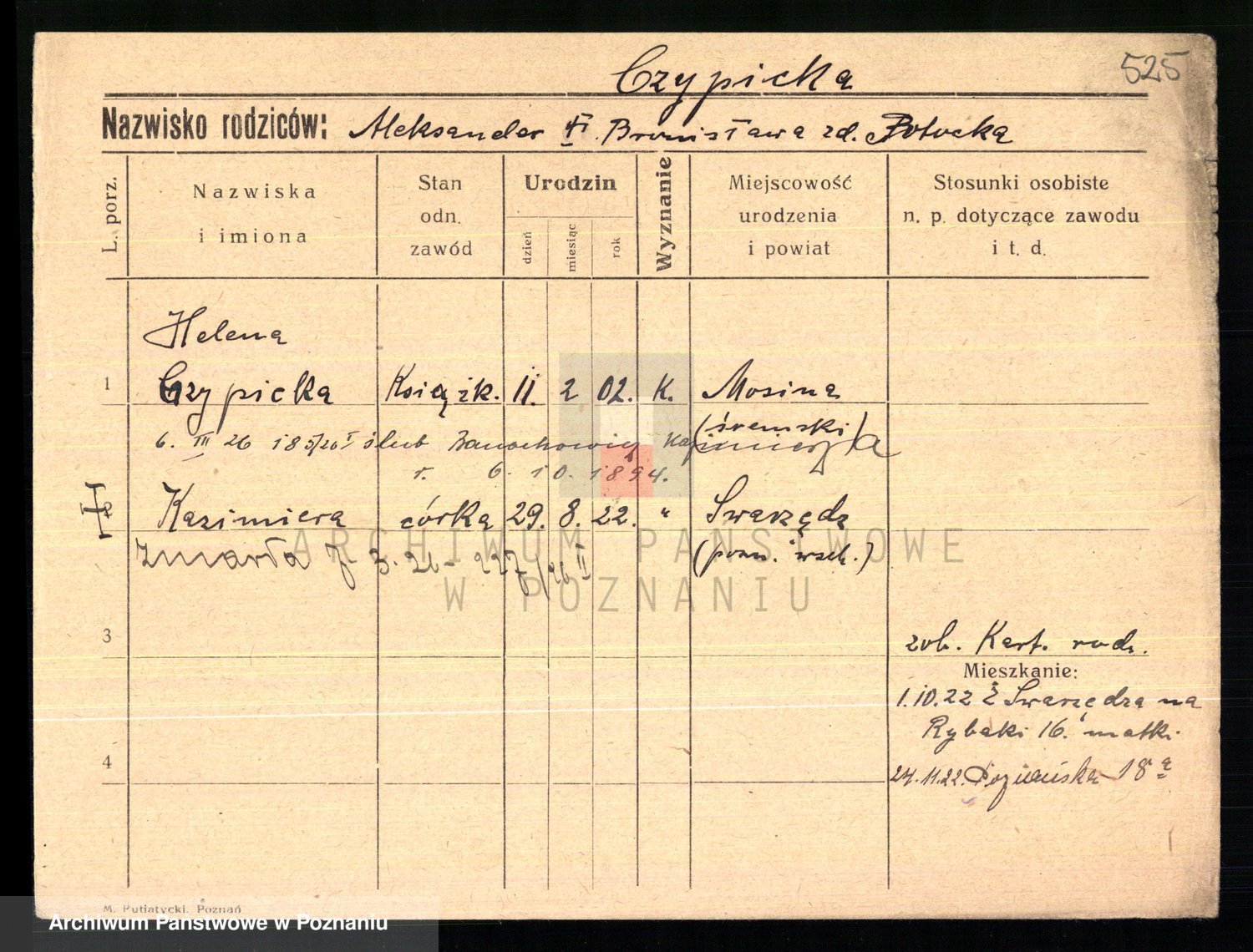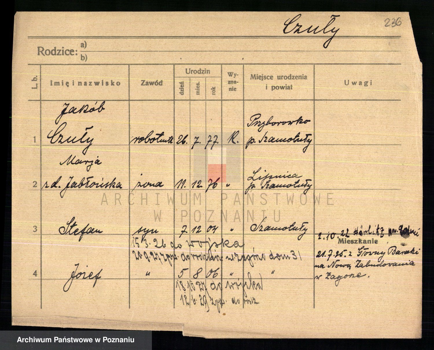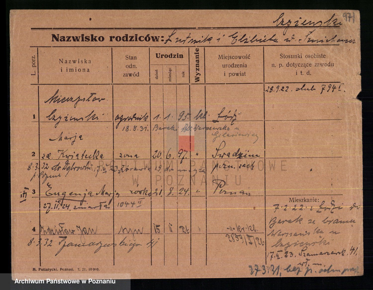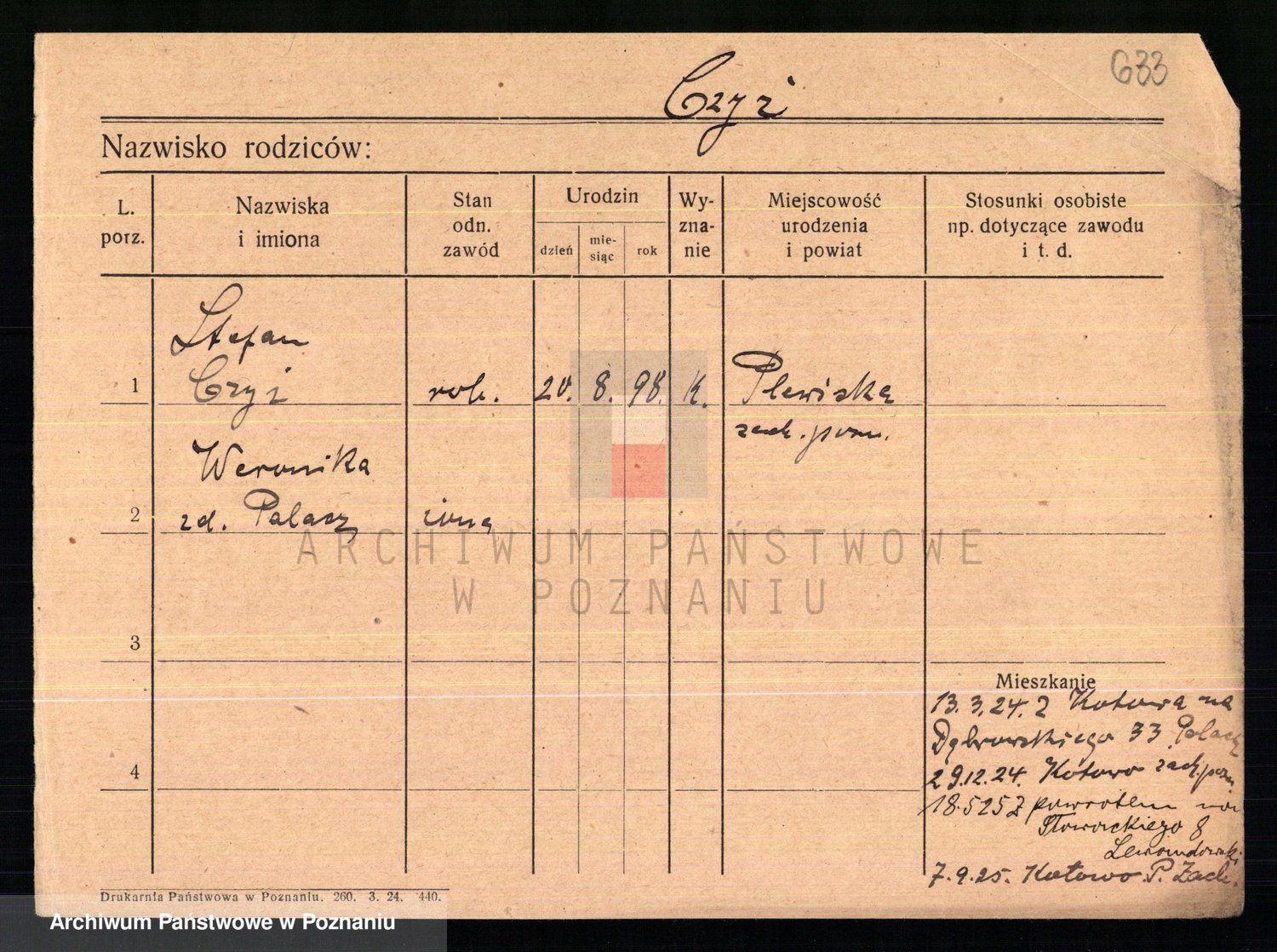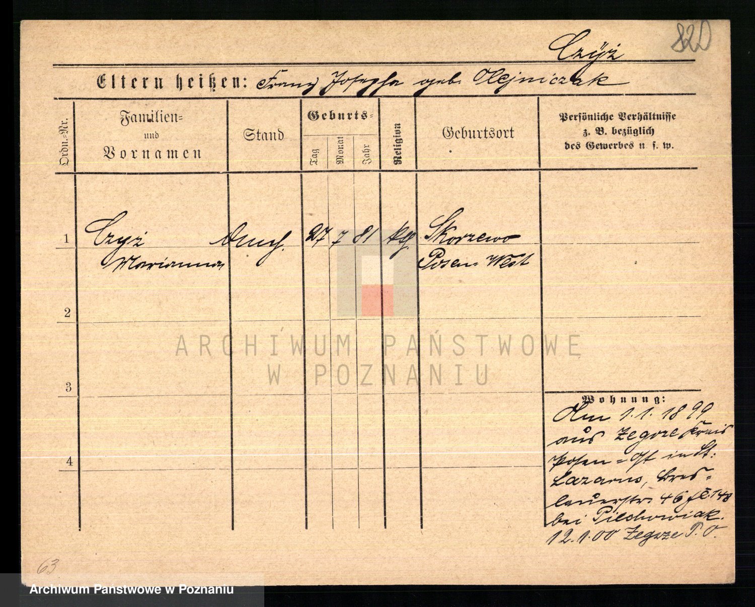 Podgląd karty osobowej dostępny jest po kliknięciu na nazwisko lub ikonkę karty. Można dokonywać powiększenia (ikony na górze) lub przechodzić między kolejnymi skanami (strzałki po bokach).
