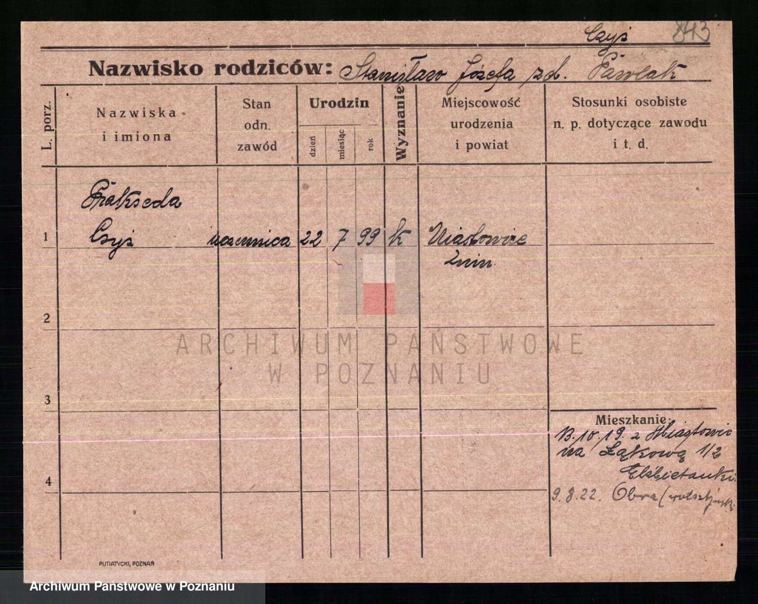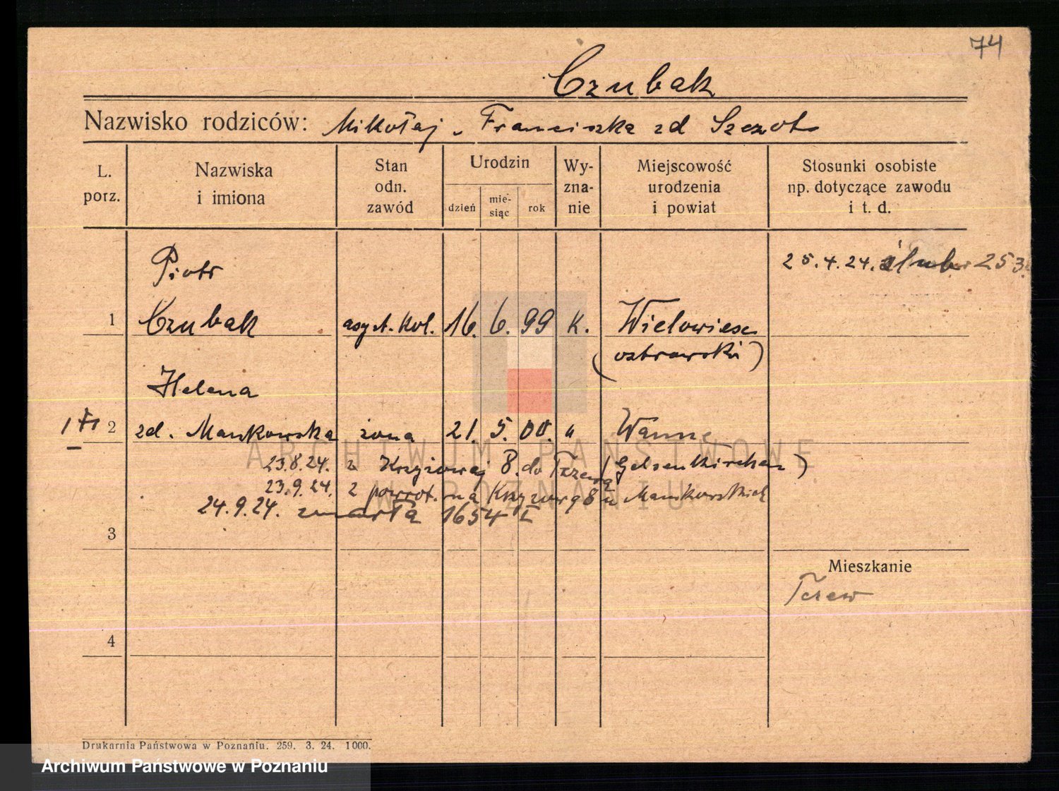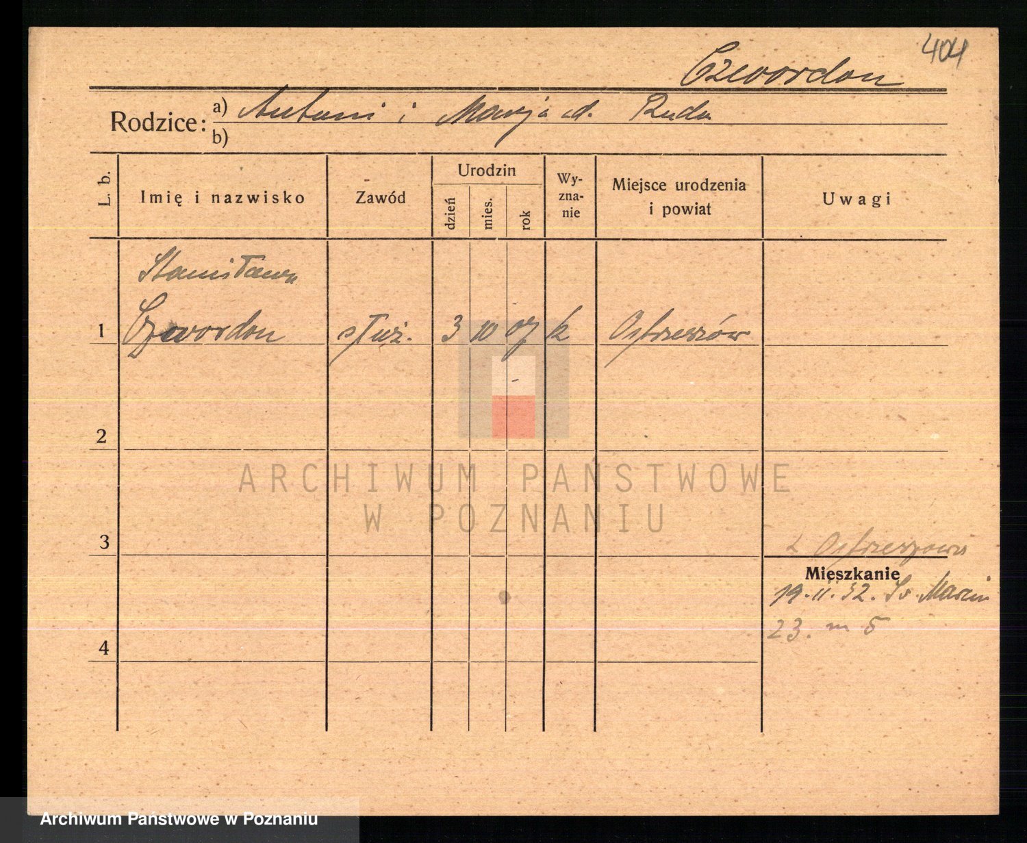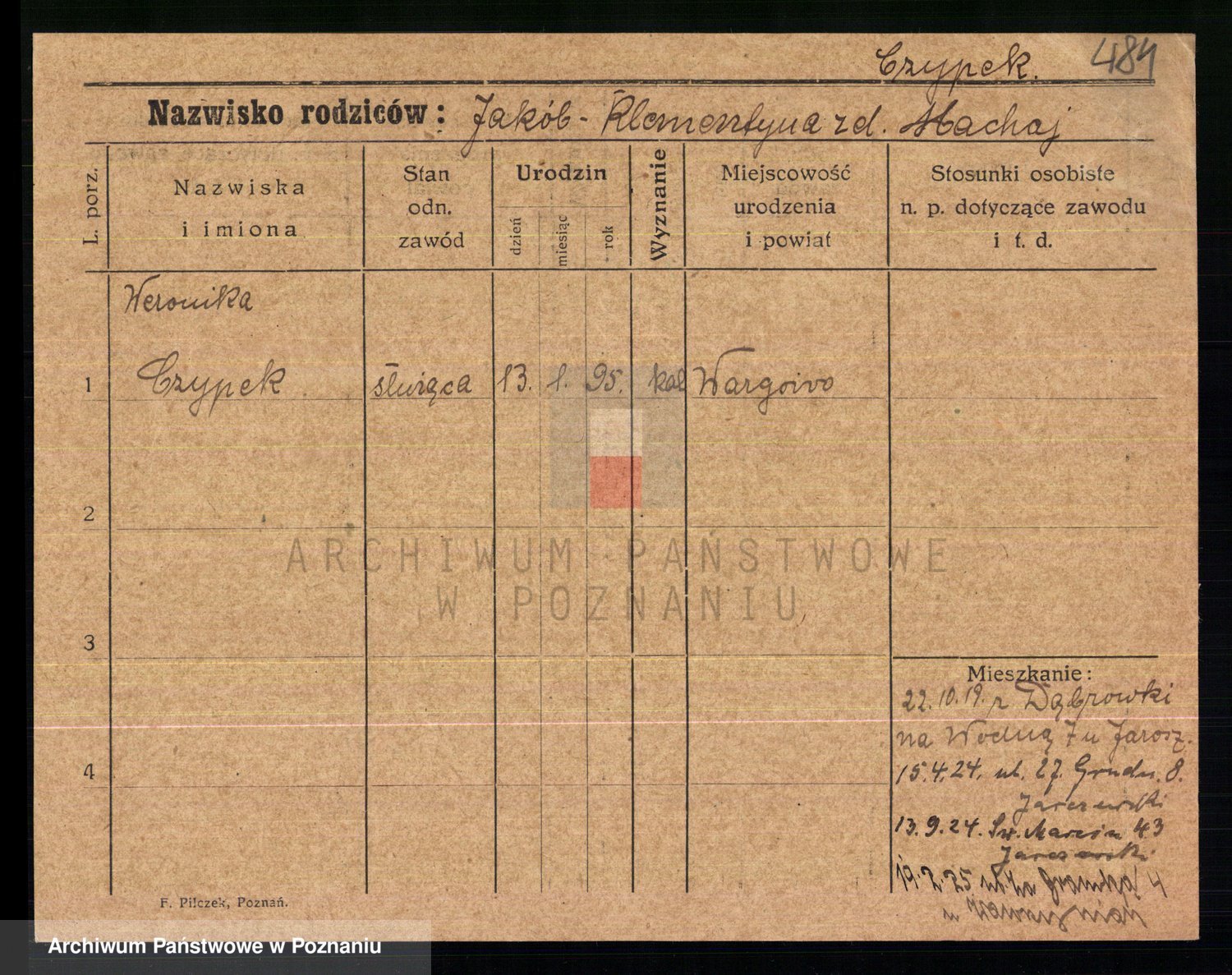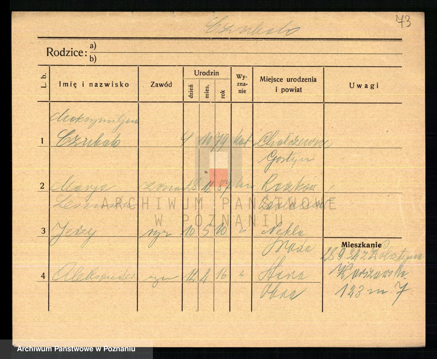 Podgląd karty osobowej dostępny jest po kliknięciu na nazwisko lub ikonkę karty. Można dokonywać powiększenia (ikony na górze) lub przechodzić między kolejnymi skanami (strzałki po bokach).