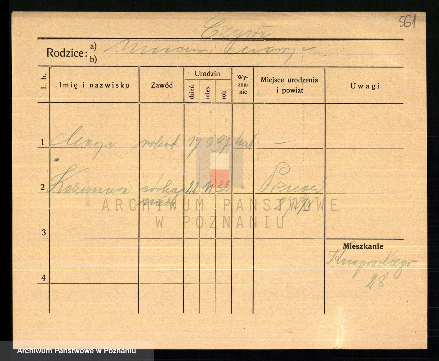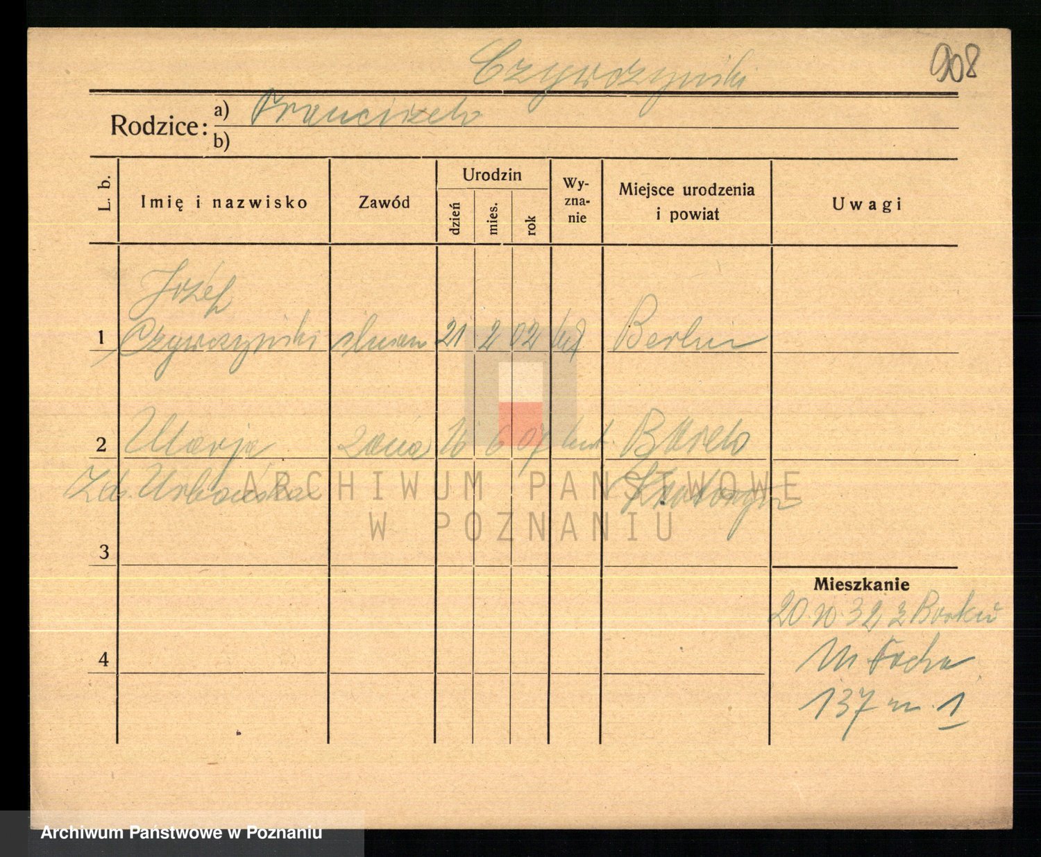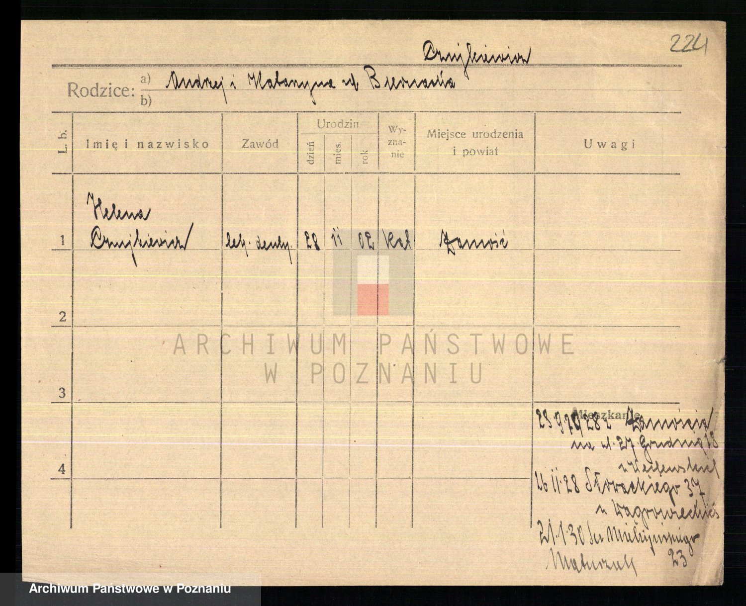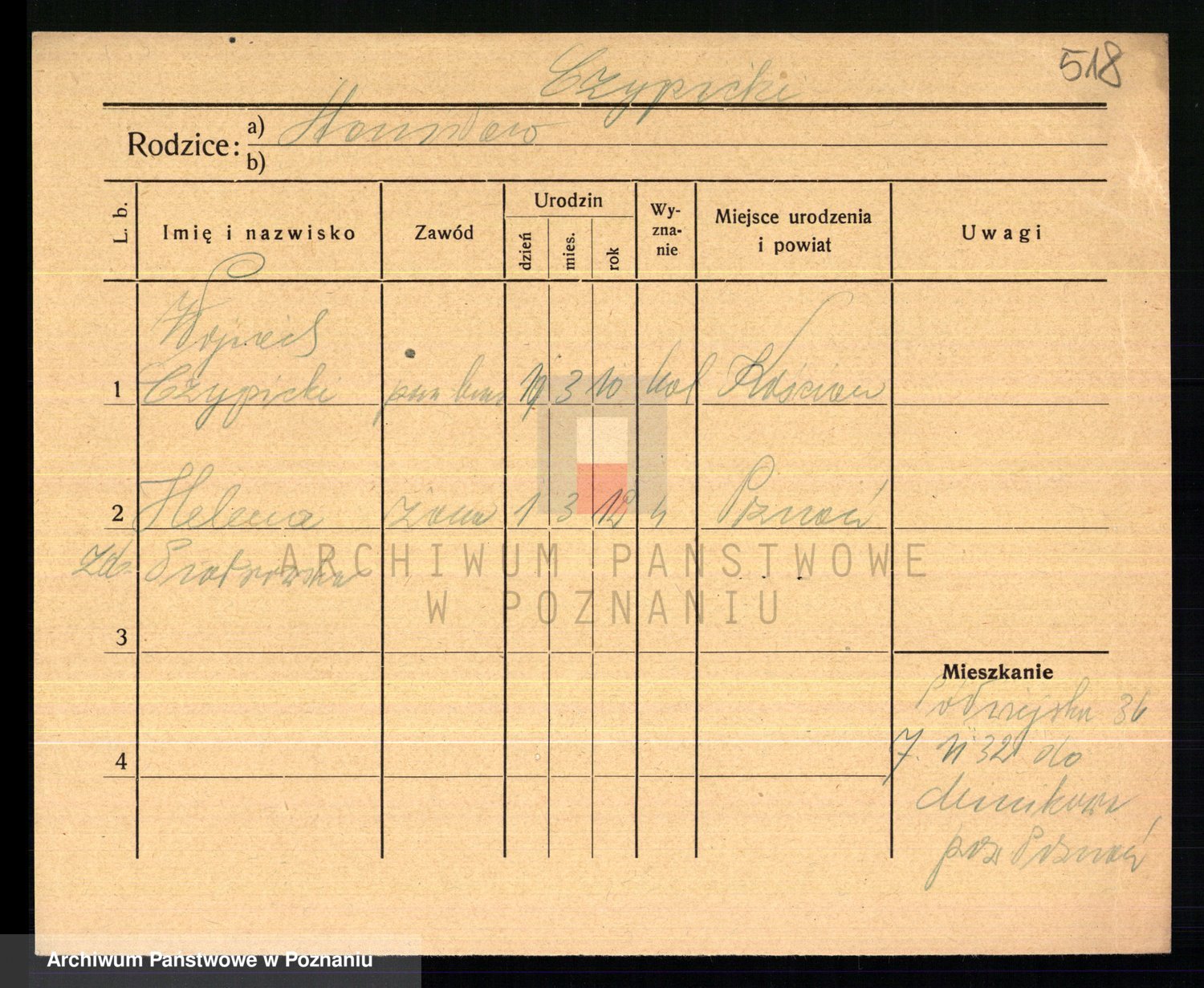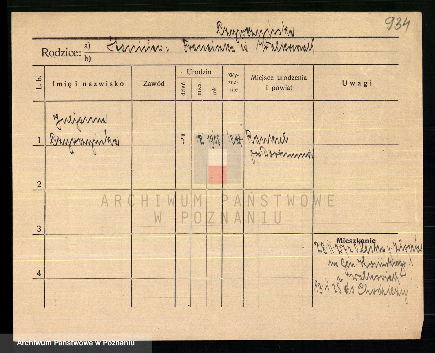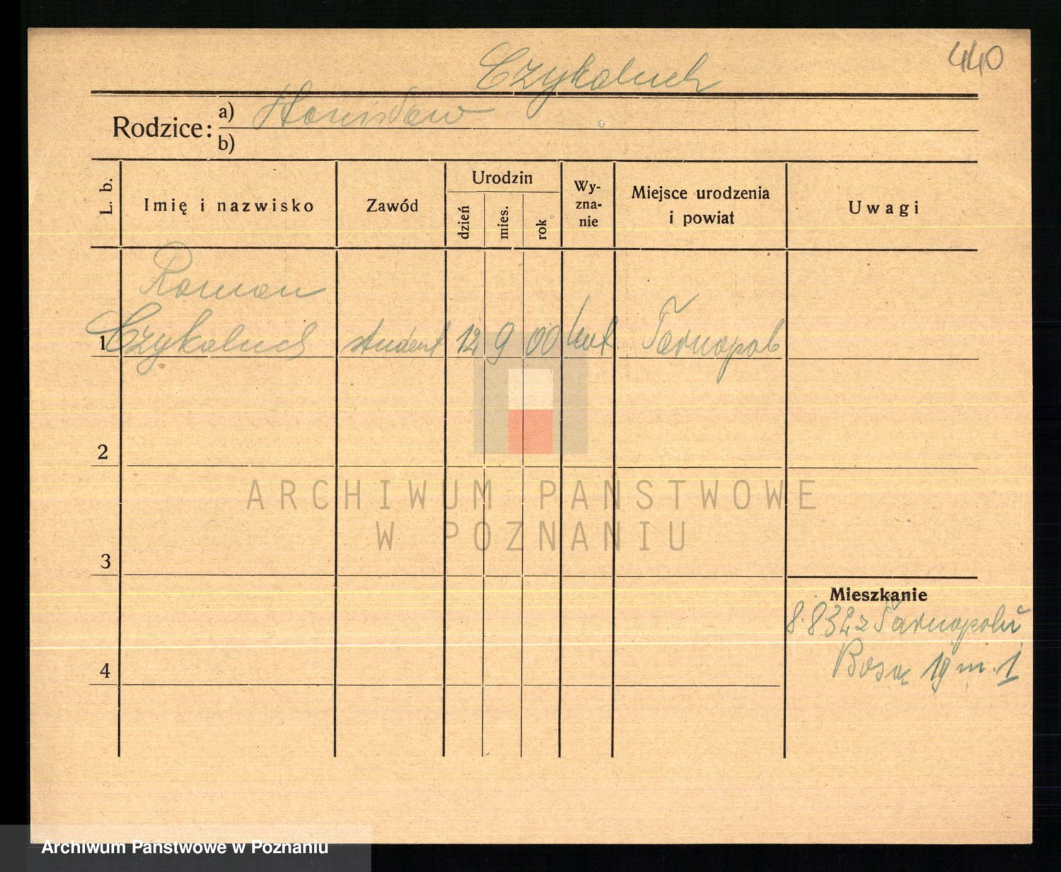 Podgląd karty osobowej dostępny jest po kliknięciu na nazwisko lub ikonkę karty. Można dokonywać powiększenia (ikony na górze) lub przechodzić między kolejnymi skanami (strzałki po bokach).