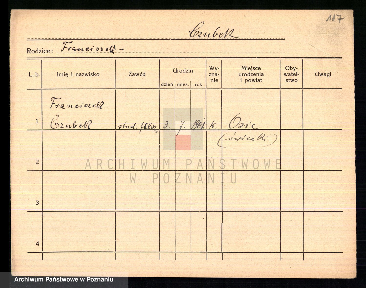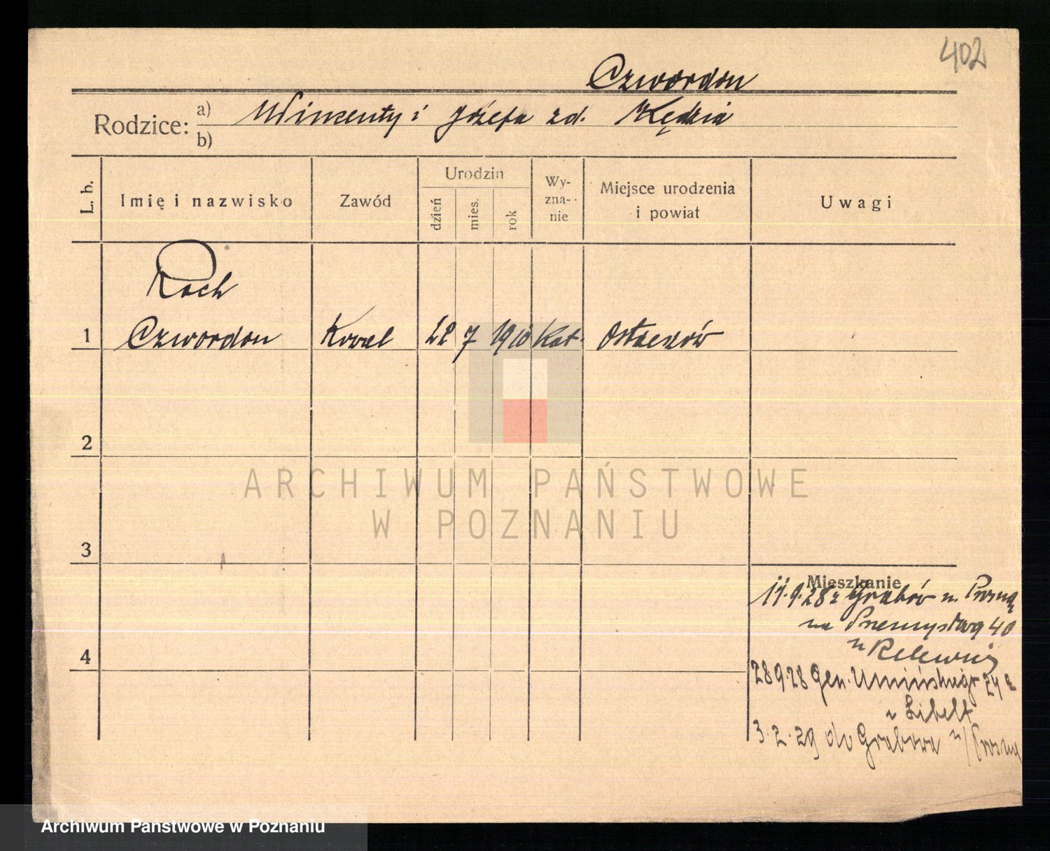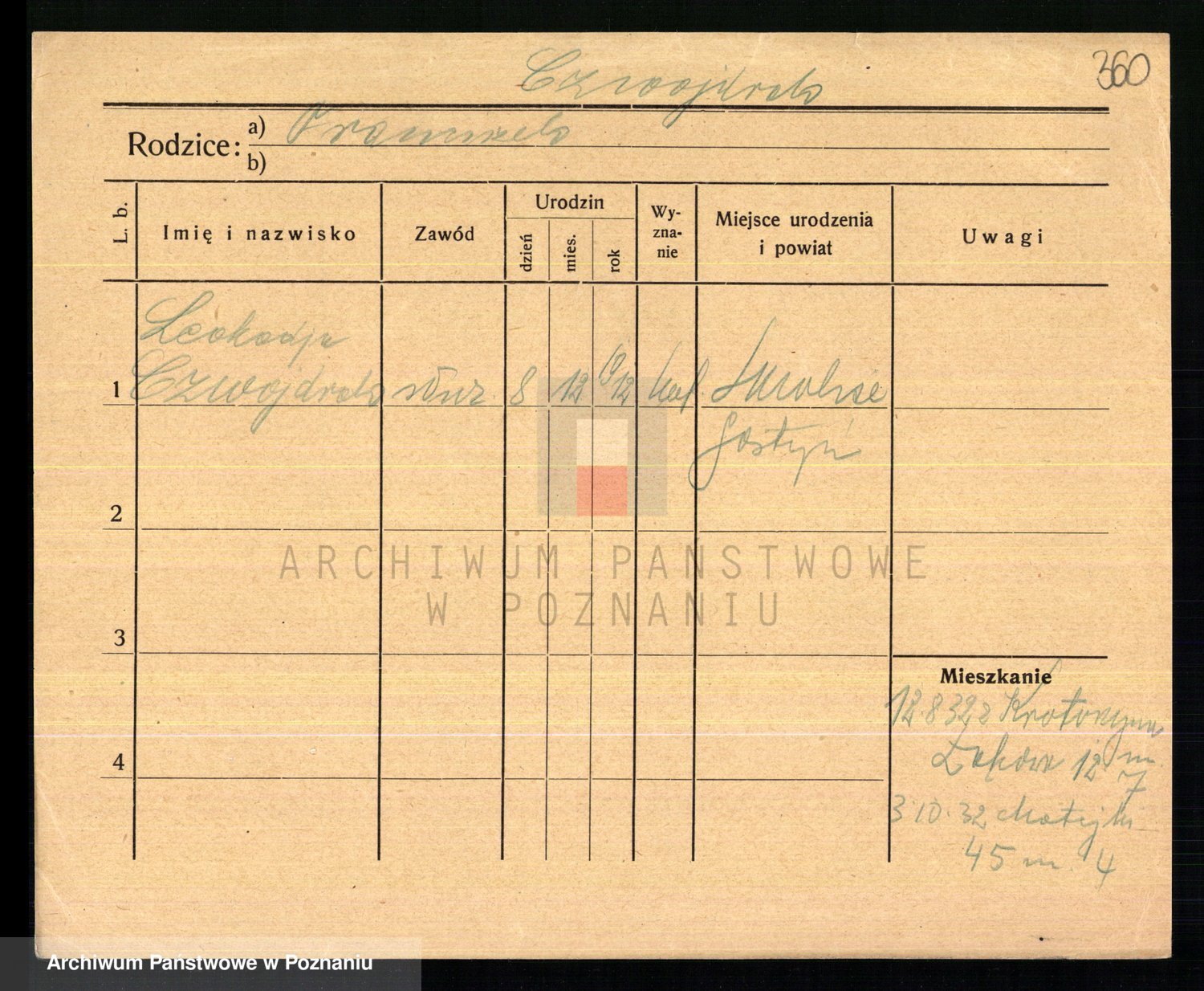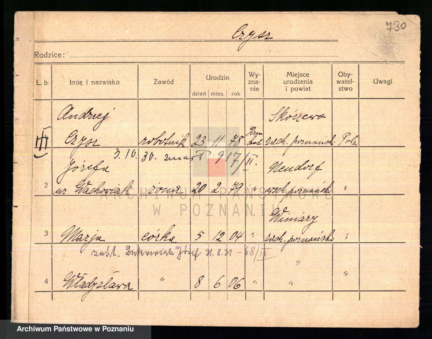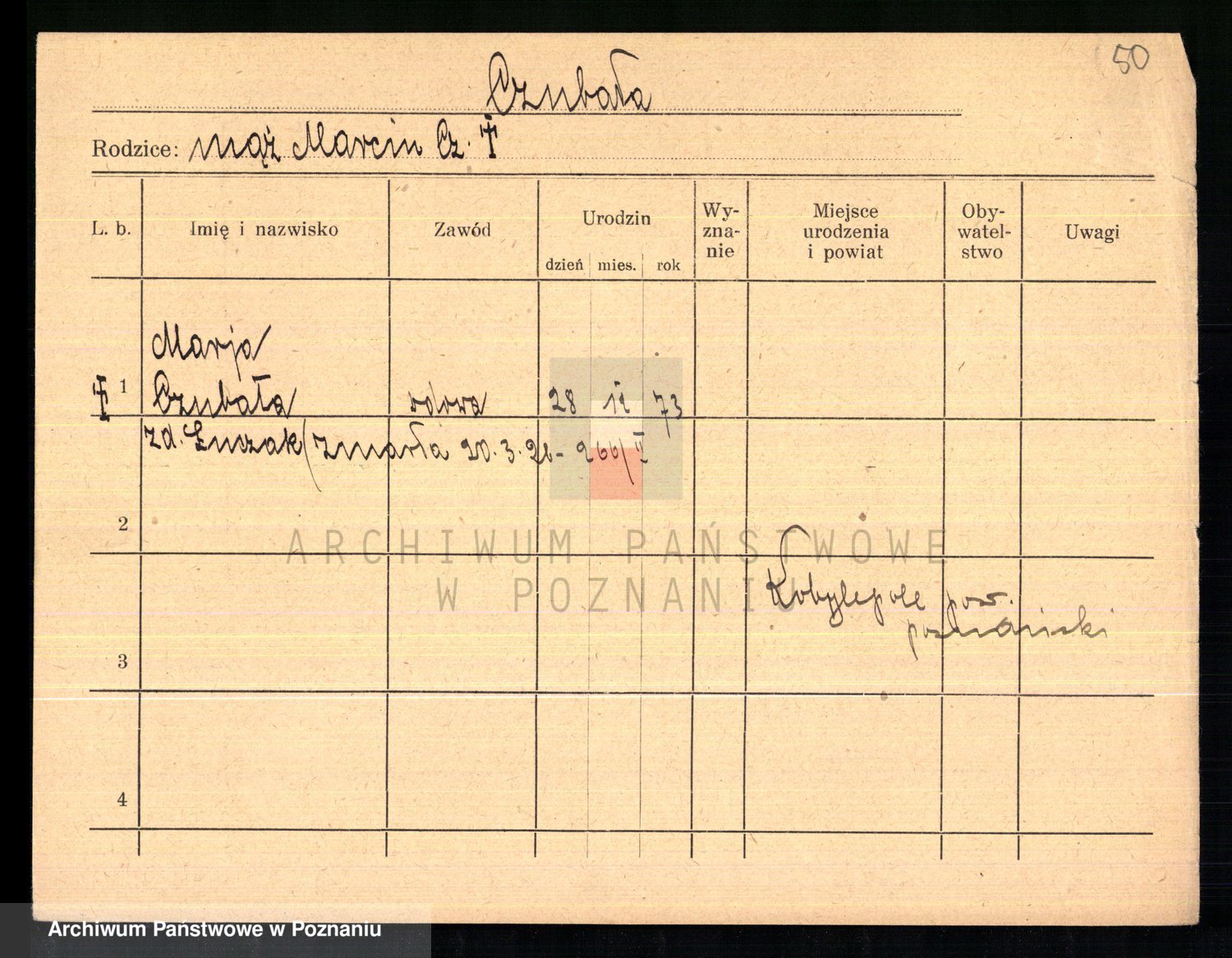 Podgląd karty osobowej dostępny jest po kliknięciu na nazwisko lub ikonkę karty. Można dokonywać powiększenia (ikony na górze) lub przechodzić między kolejnymi skanami (strzałki po bokach).