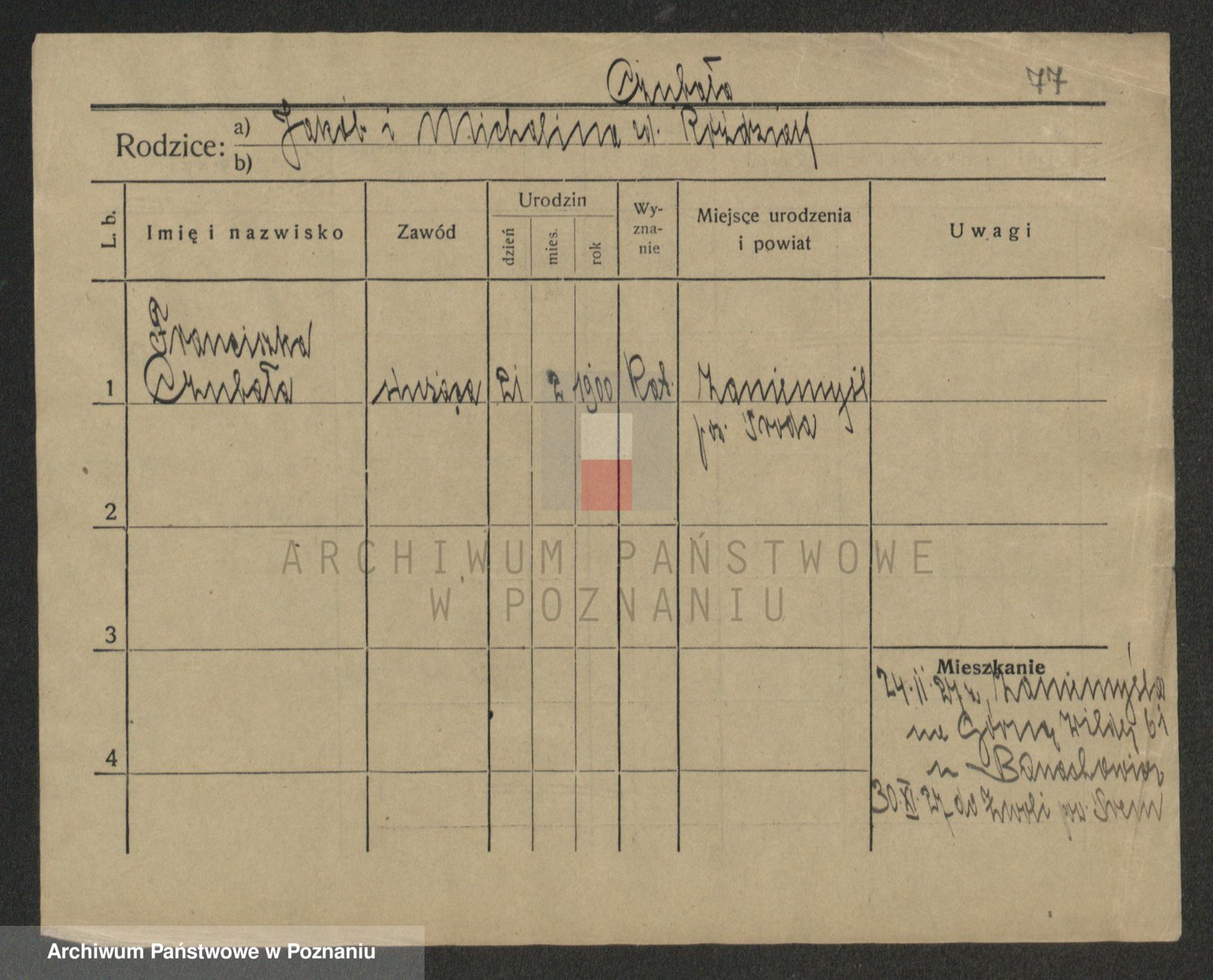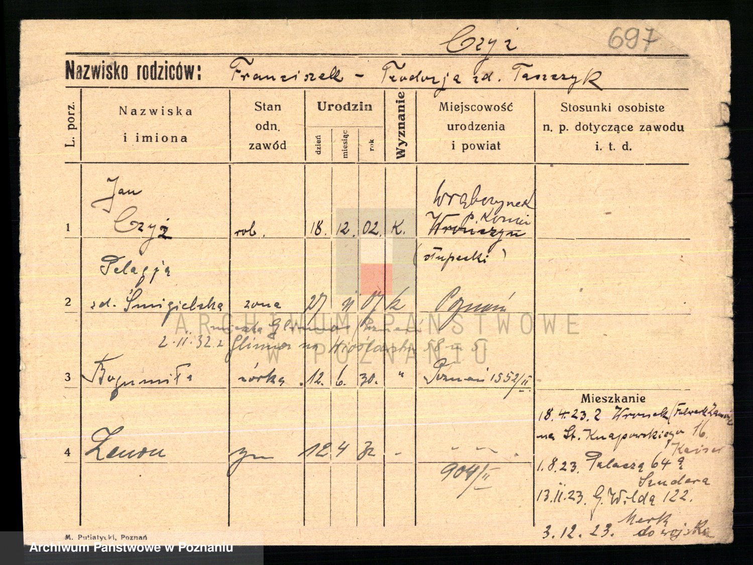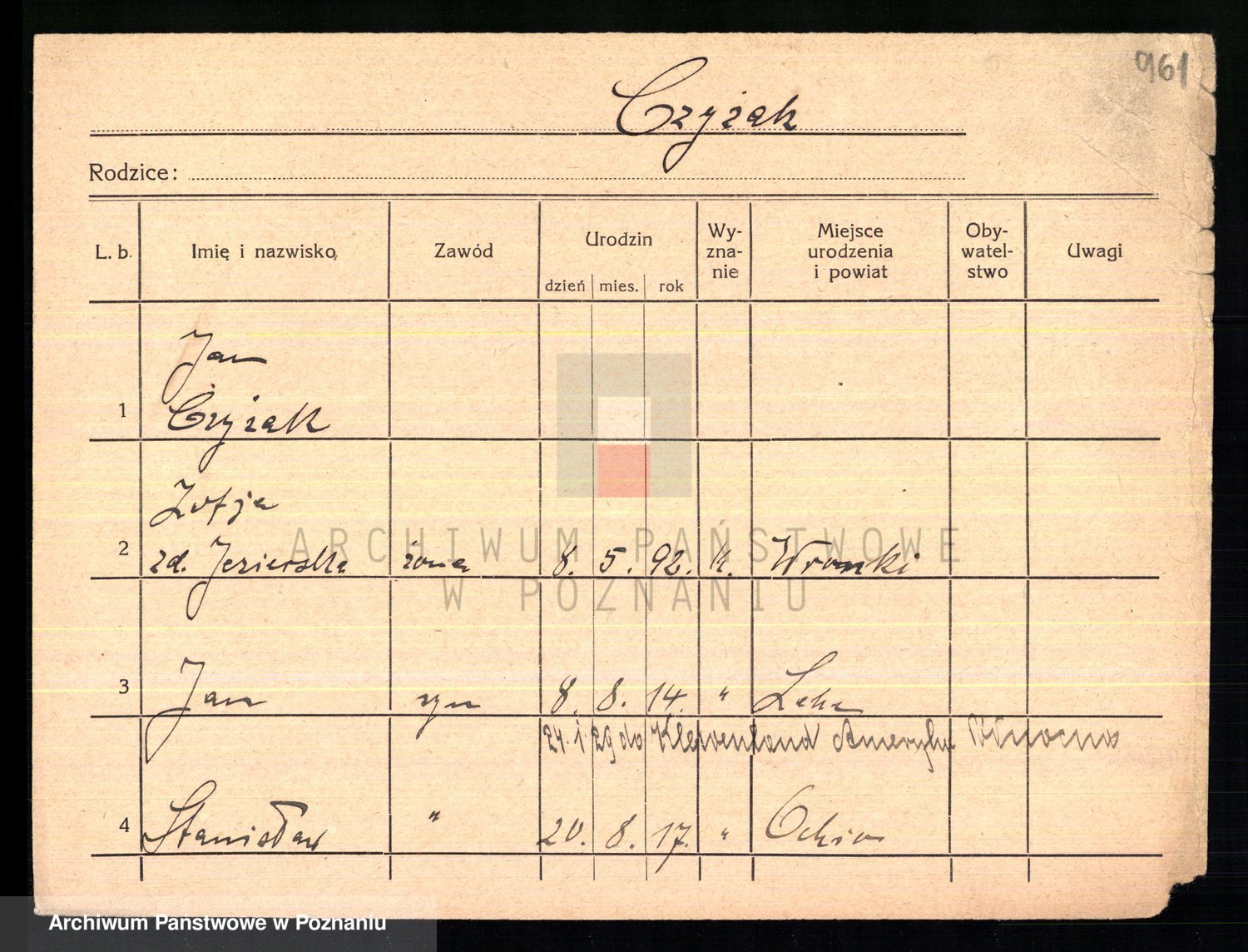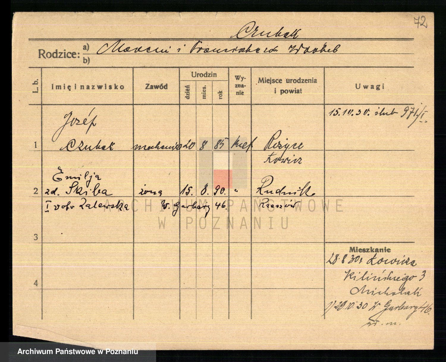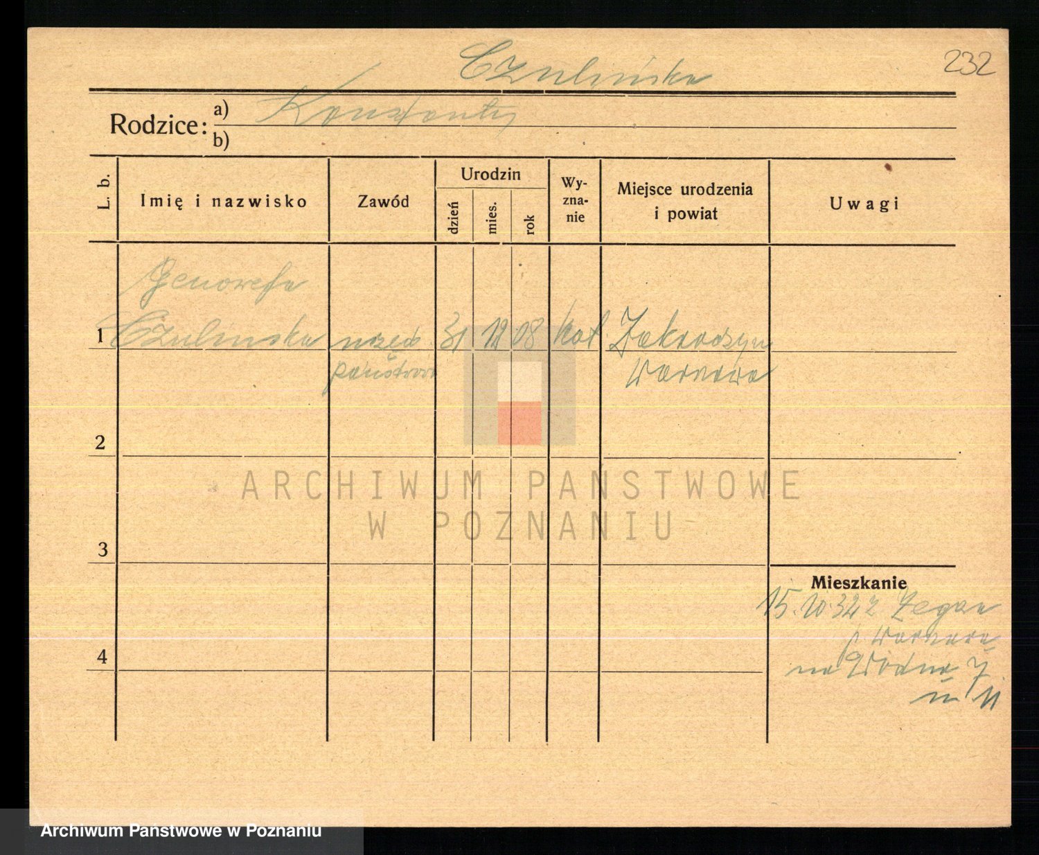 Podgląd karty osobowej dostępny jest po kliknięciu na nazwisko lub ikonkę karty. Można dokonywać powiększenia (ikony na górze) lub przechodzić między kolejnymi skanami (strzałki po bokach).