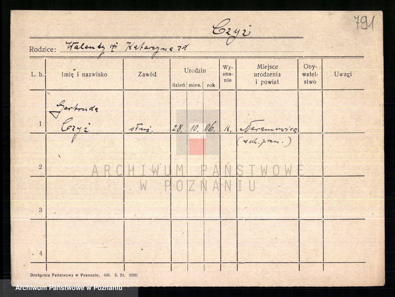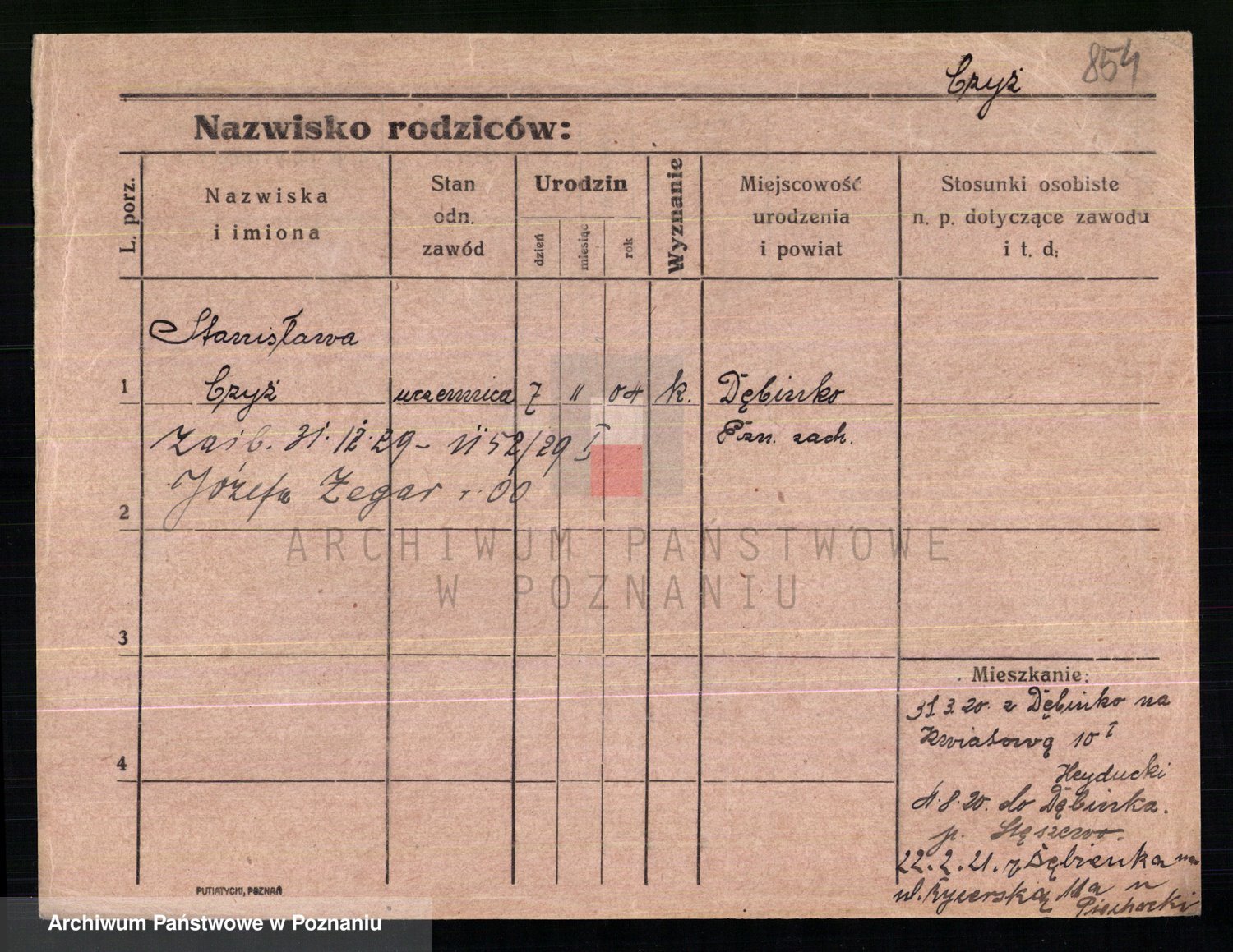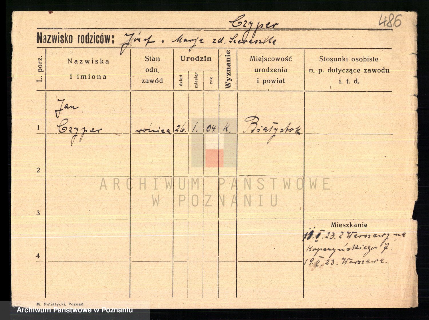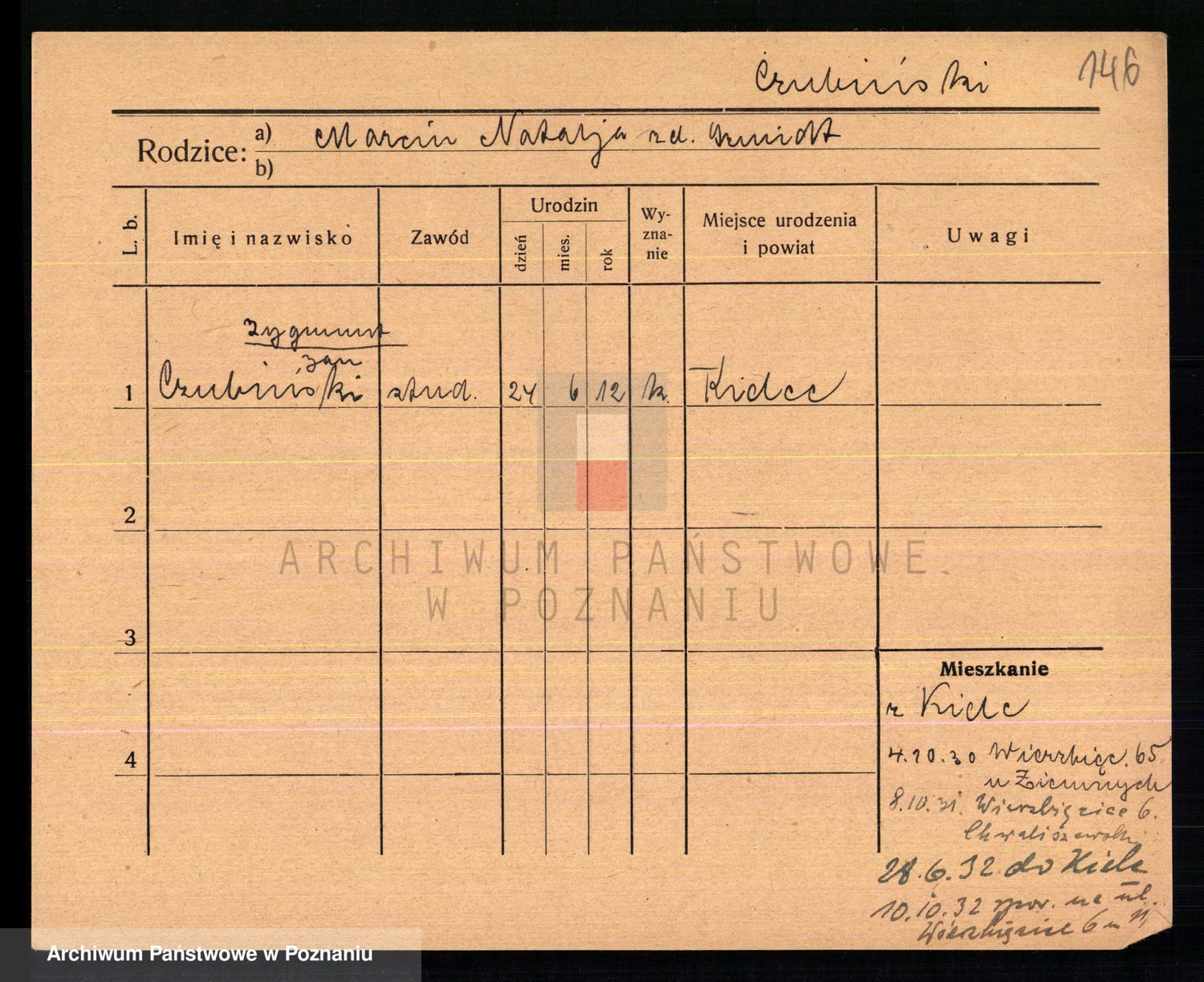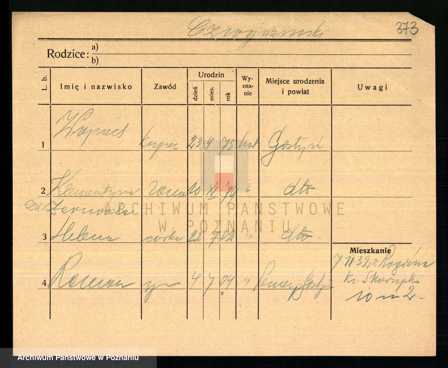 Podgląd karty osobowej dostępny jest po kliknięciu na nazwisko lub ikonkę karty. Można dokonywać powiększenia (ikony na górze) lub przechodzić między kolejnymi skanami (strzałki po bokach).