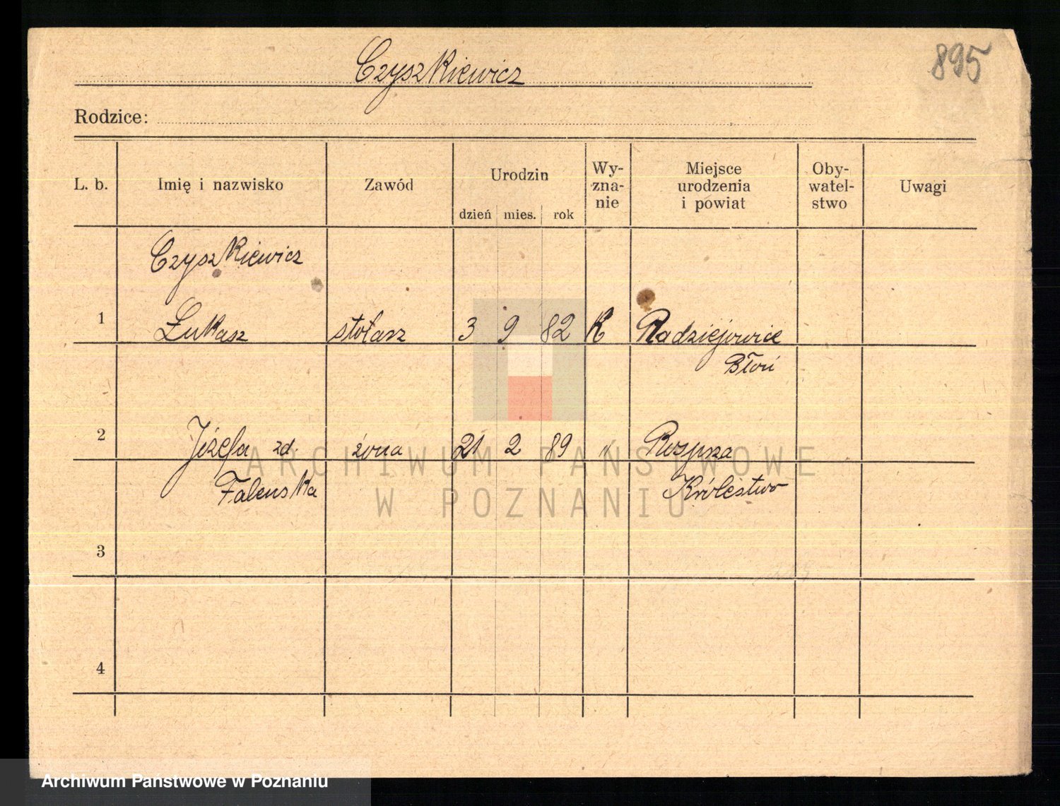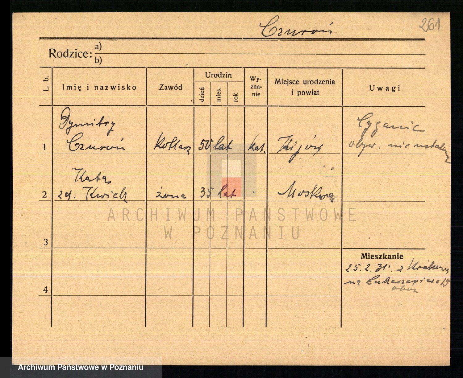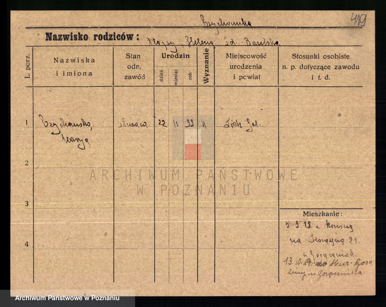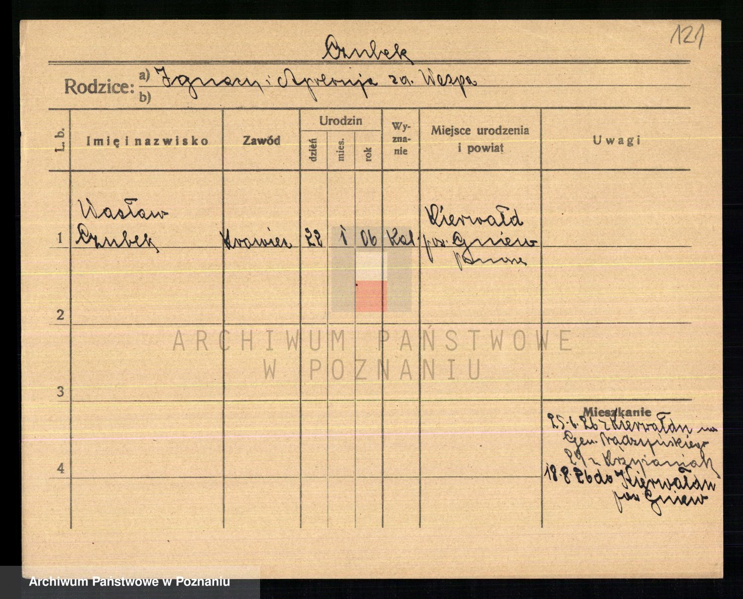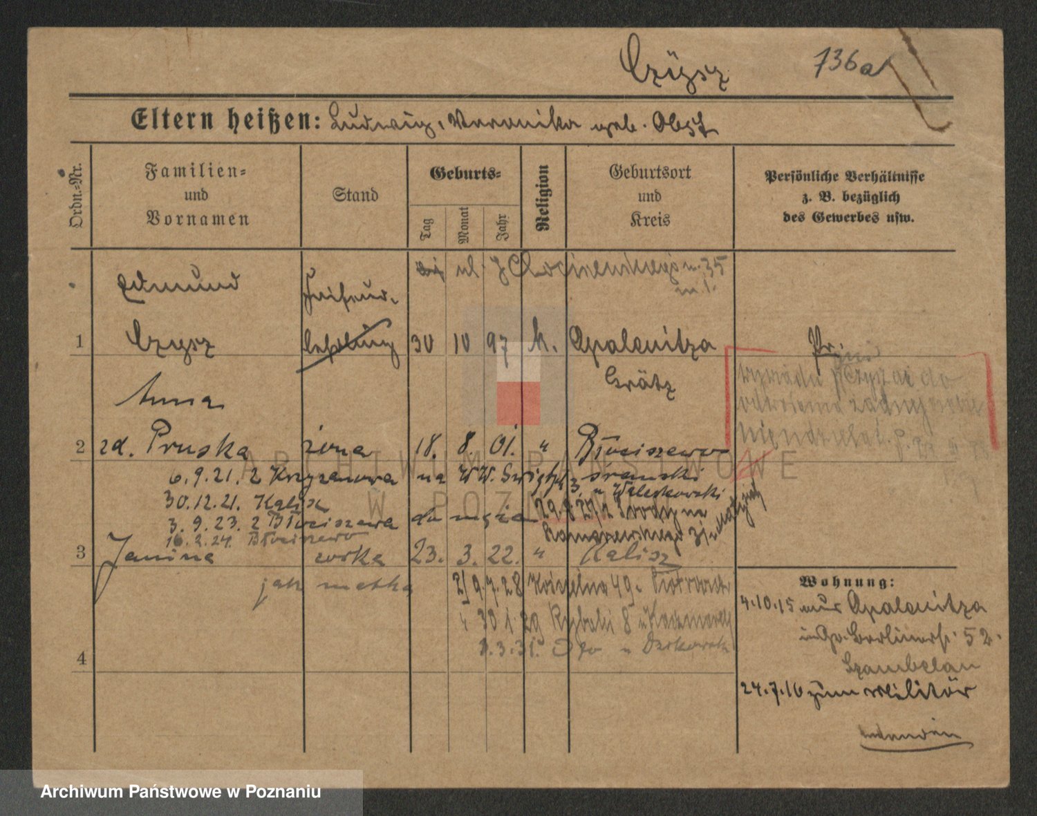 Podgląd karty osobowej dostępny jest po kliknięciu na nazwisko lub ikonkę karty. Można dokonywać powiększenia (ikony na górze) lub przechodzić między kolejnymi skanami (strzałki po bokach).