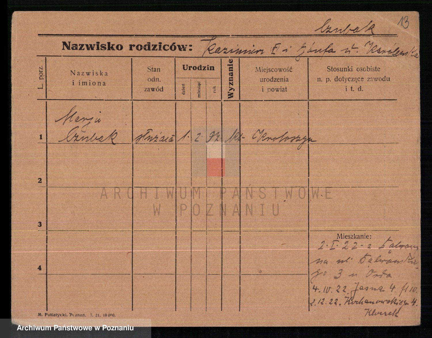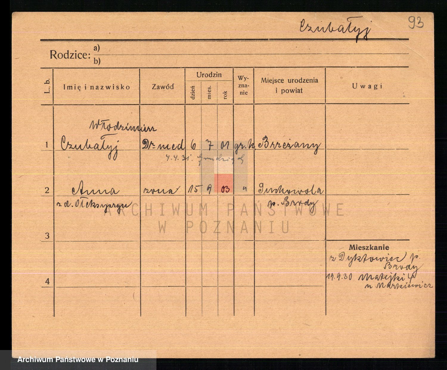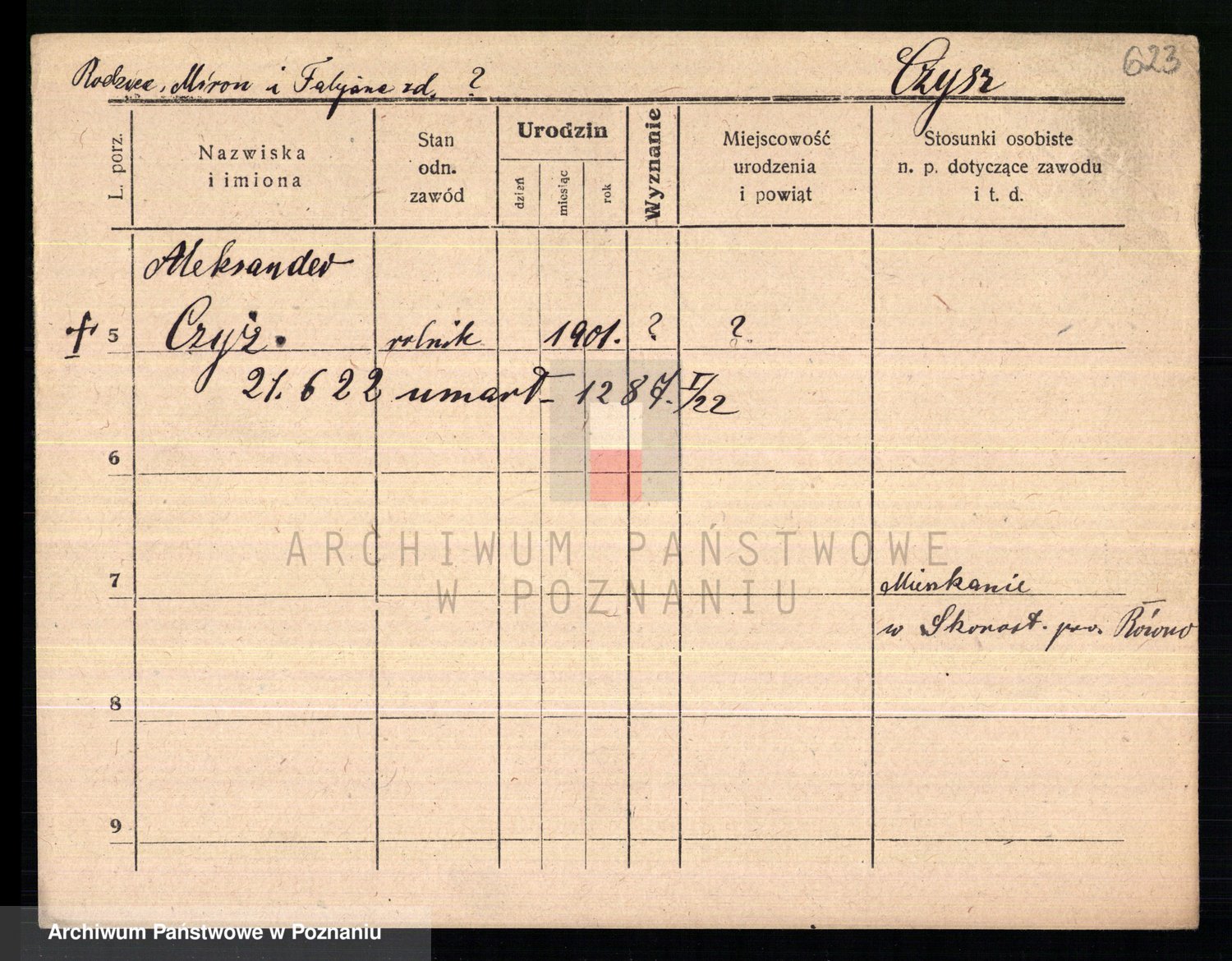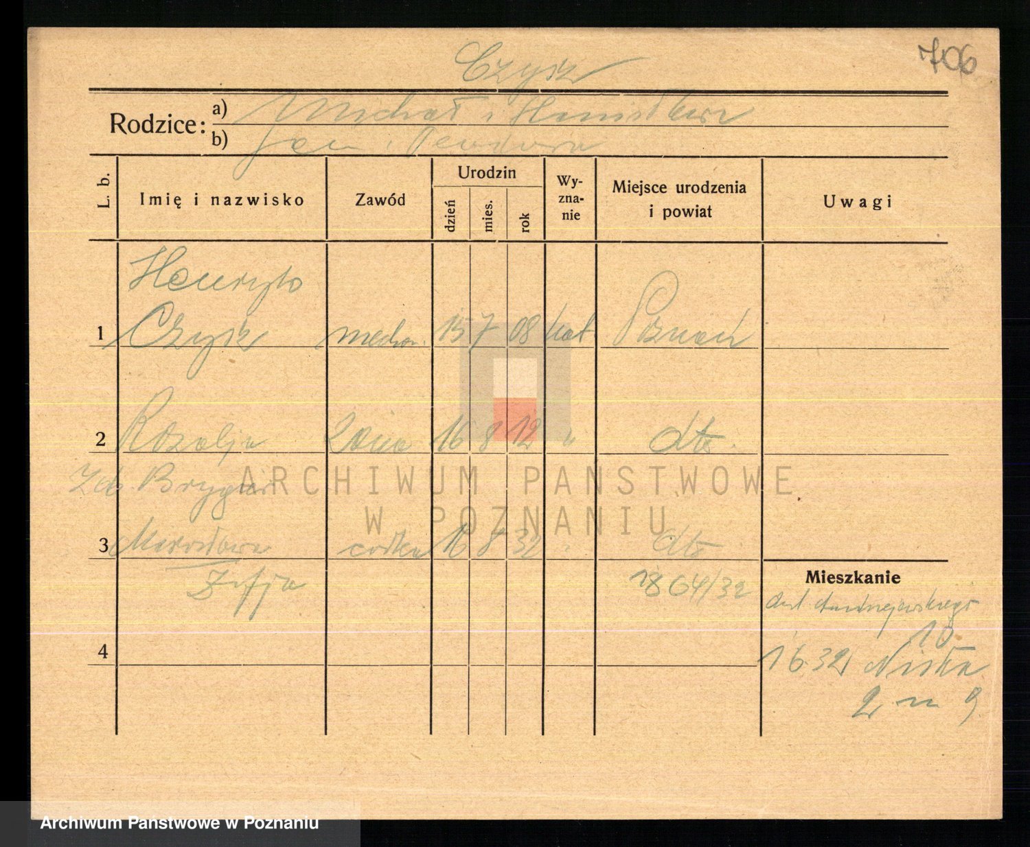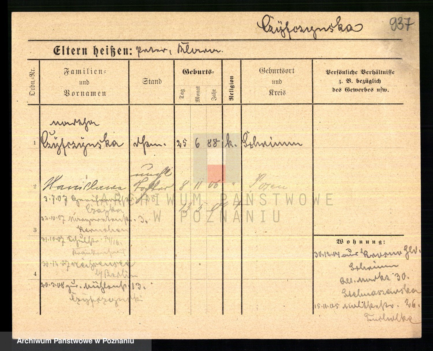Podgląd karty osobowej dostępny jest po kliknięciu na nazwisko lub ikonkę karty. Można dokonywać powiększenia (ikony na górze) lub przechodzić między kolejnymi skanami (strzałki po bokach).