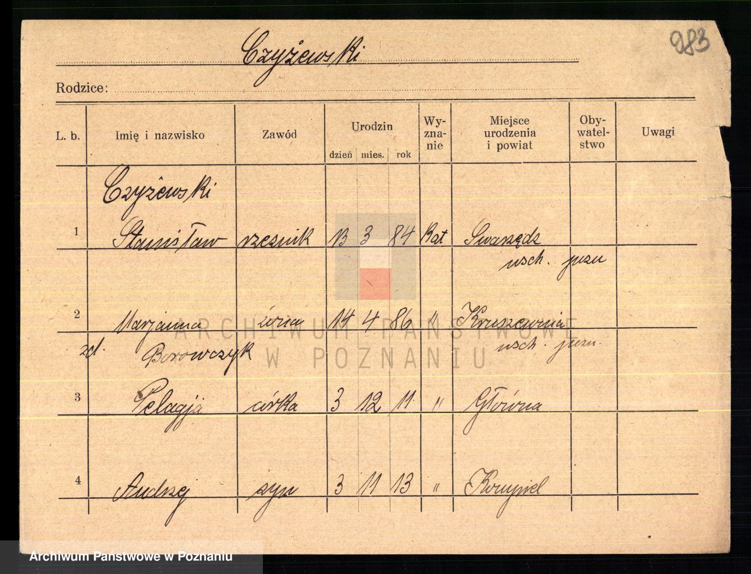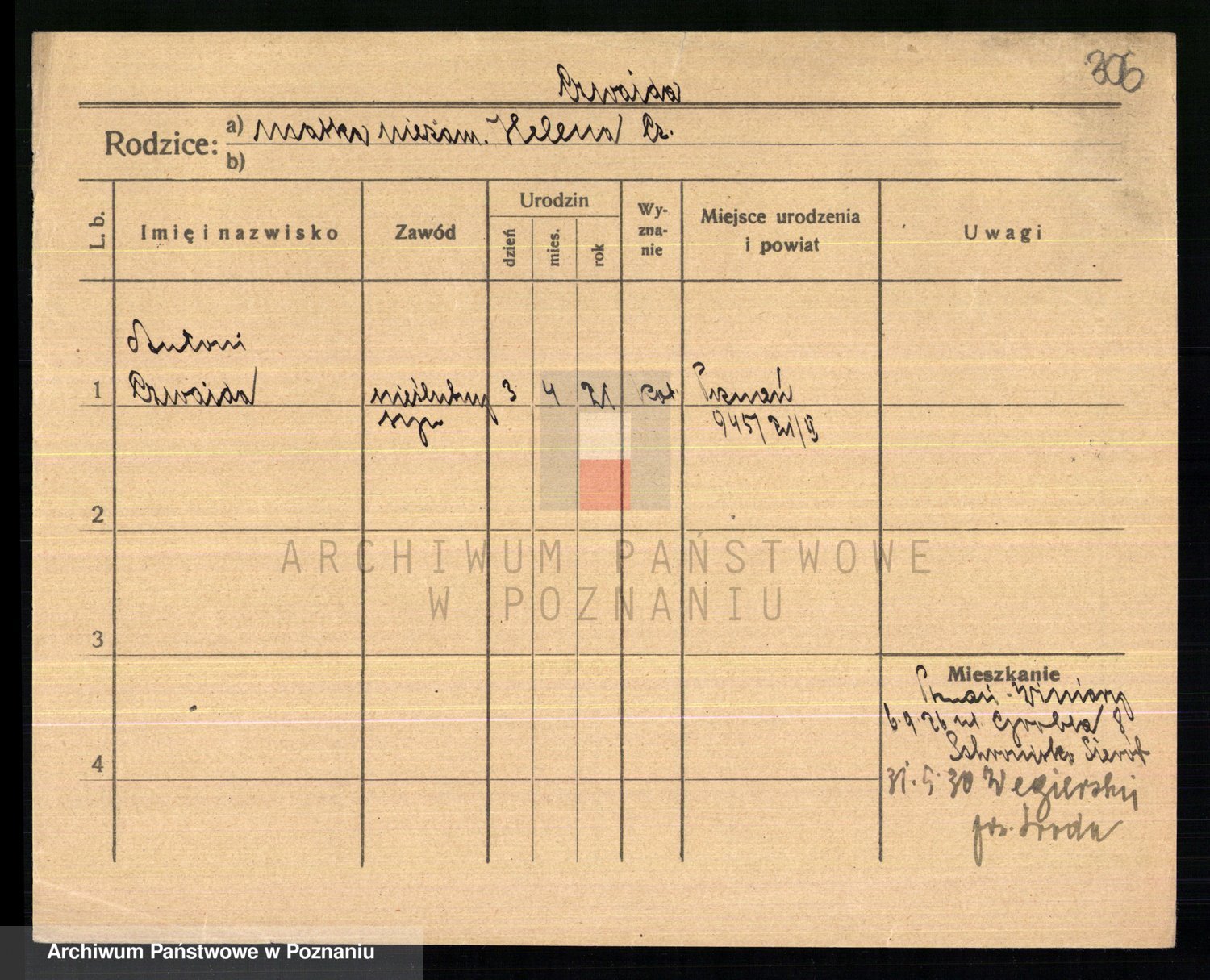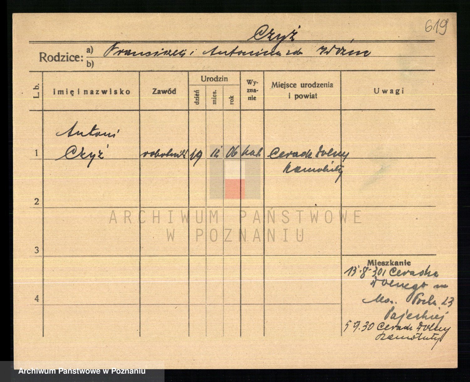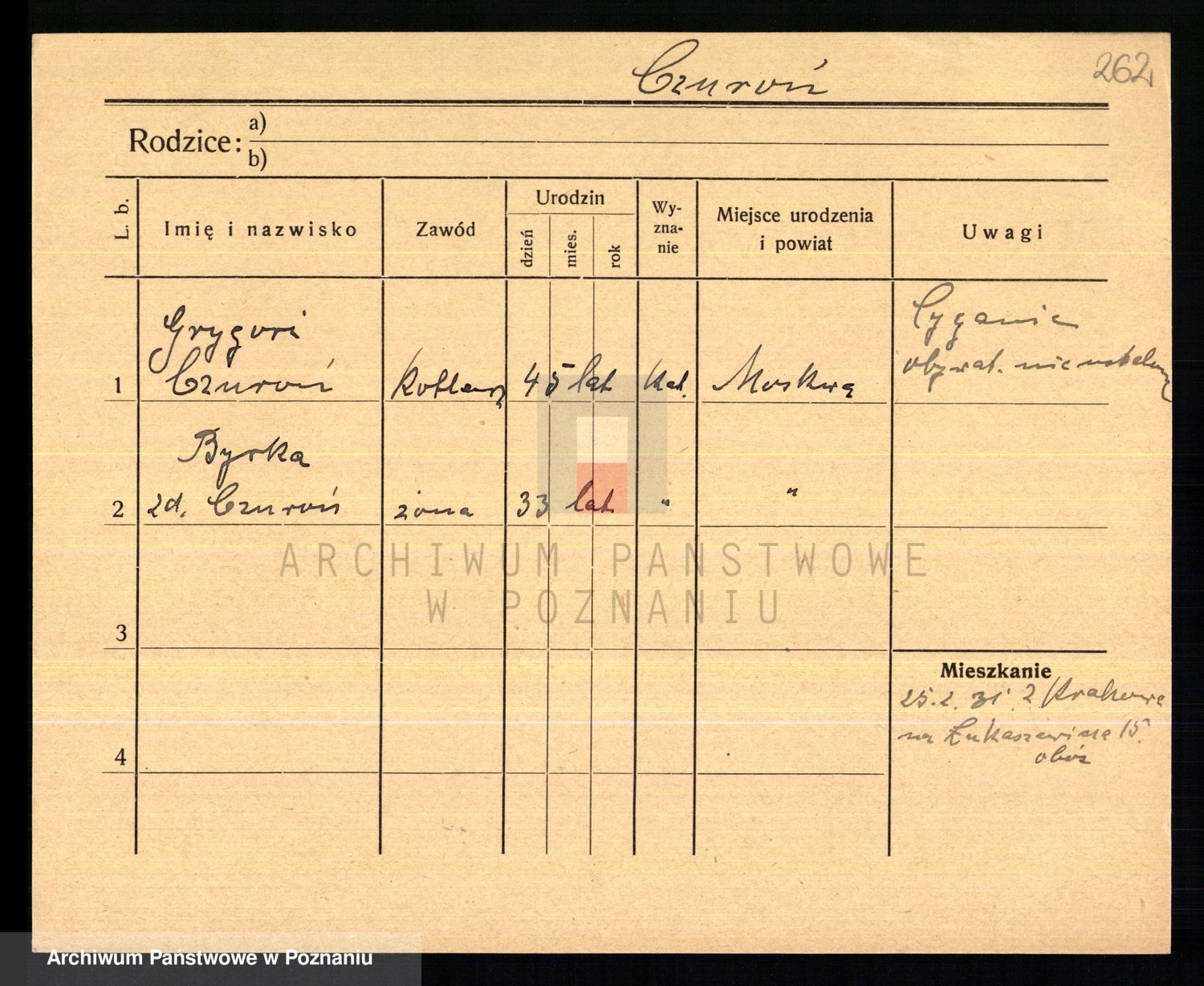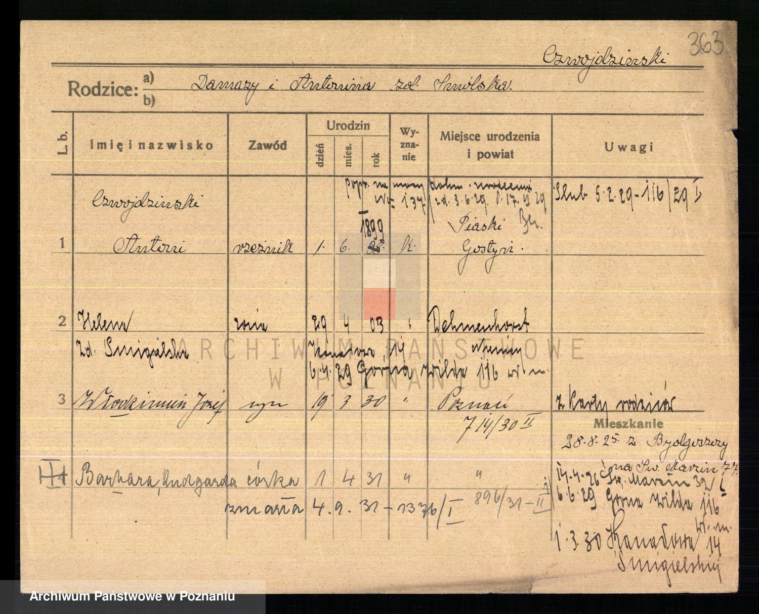 Podgląd karty osobowej dostępny jest po kliknięciu na nazwisko lub ikonkę karty. Można dokonywać powiększenia (ikony na górze) lub przechodzić między kolejnymi skanami (strzałki po bokach).
