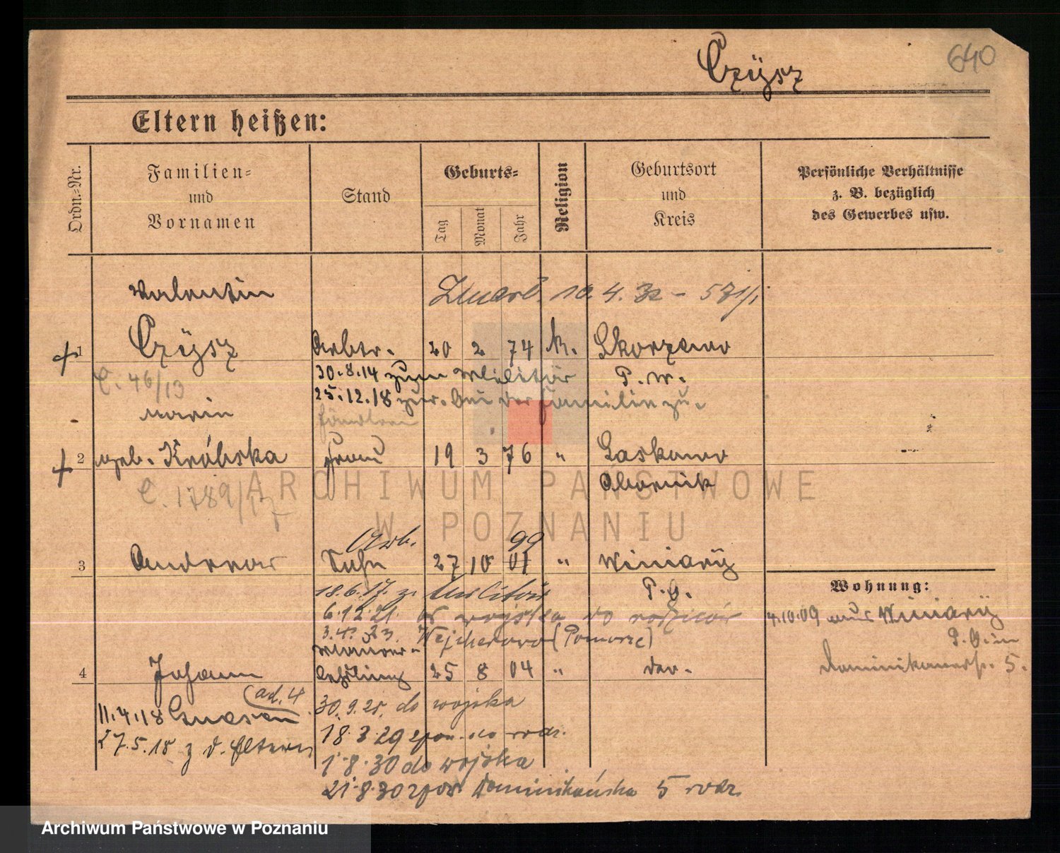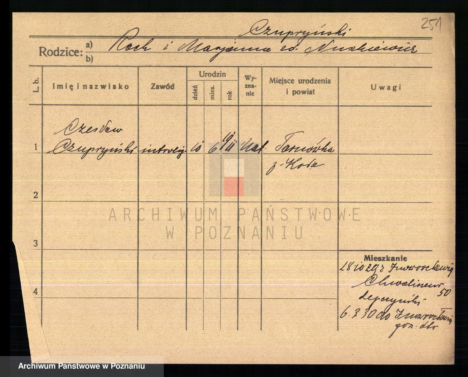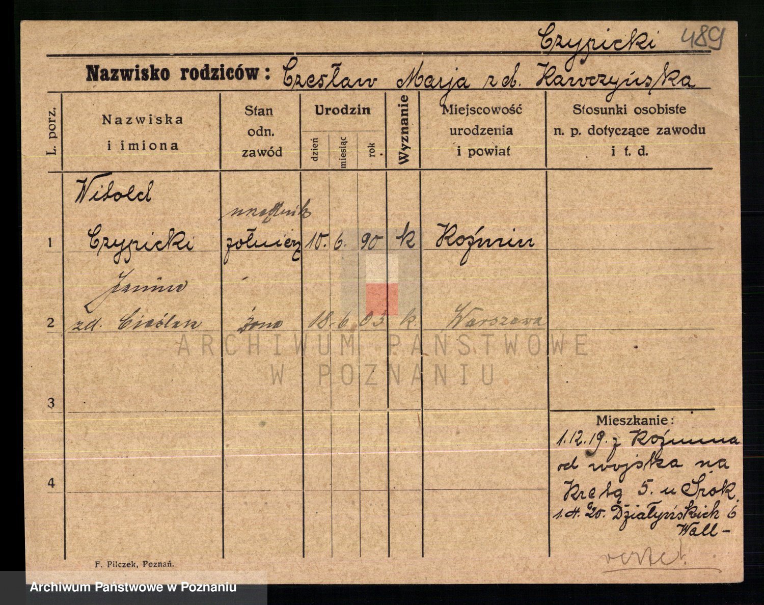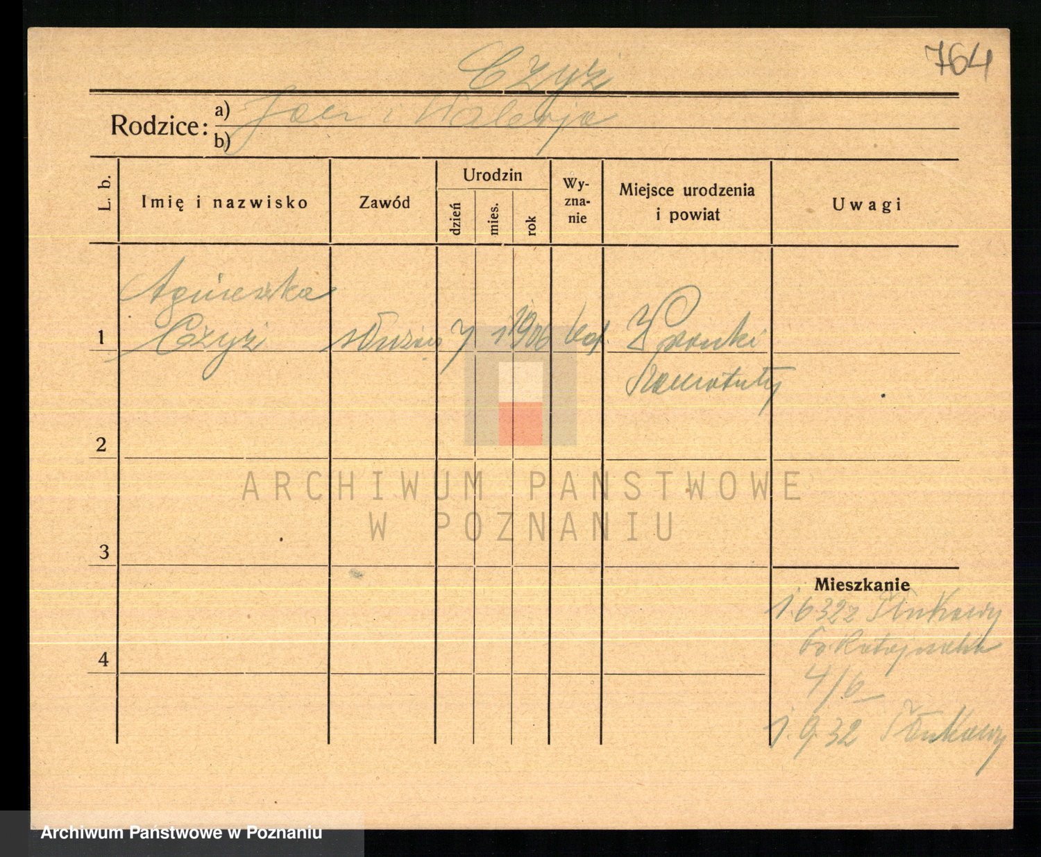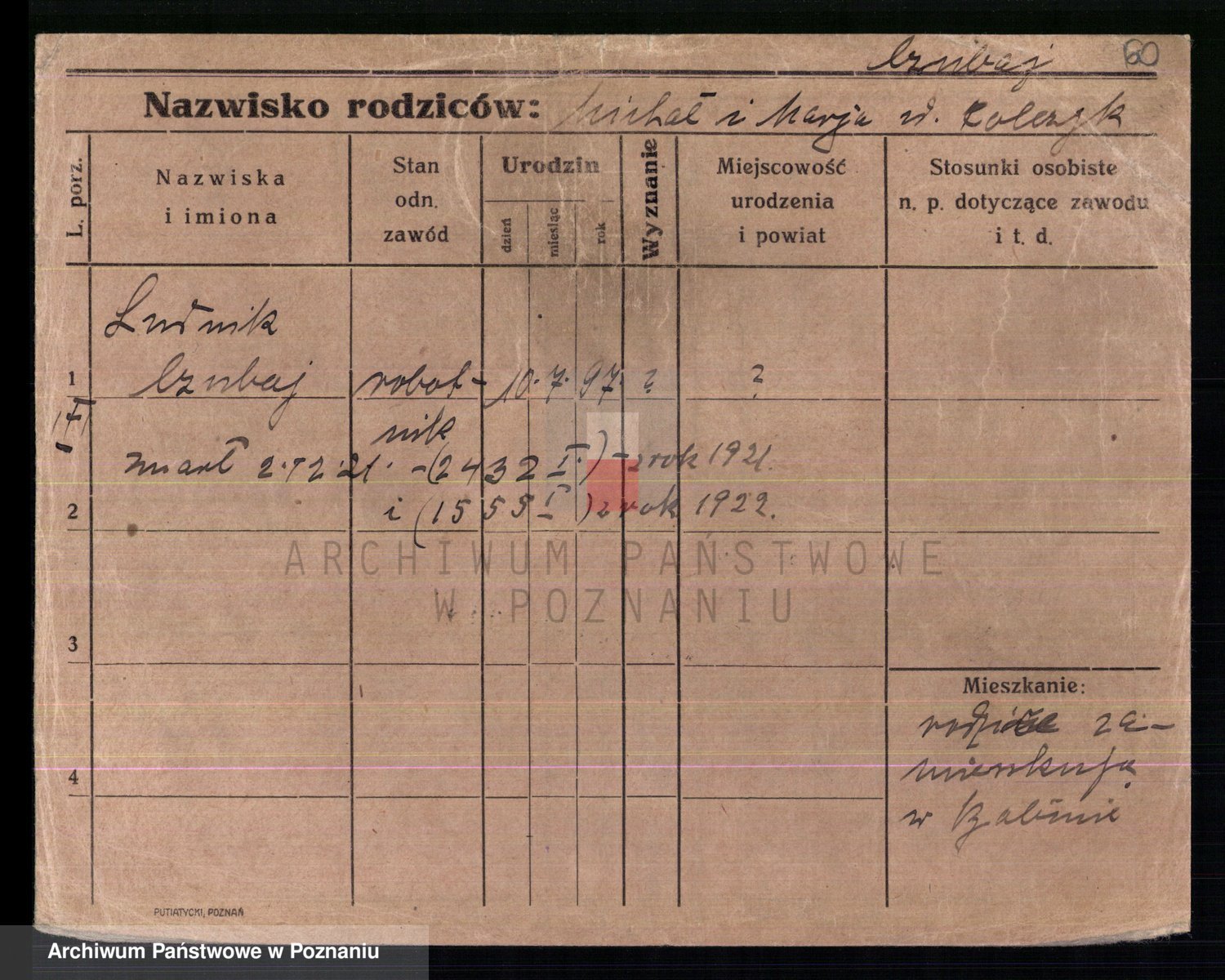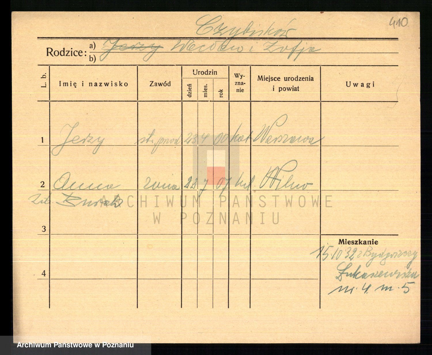 Podgląd karty osobowej dostępny jest po kliknięciu na nazwisko lub ikonkę karty. Można dokonywać powiększenia (ikony na górze) lub przechodzić między kolejnymi skanami (strzałki po bokach).