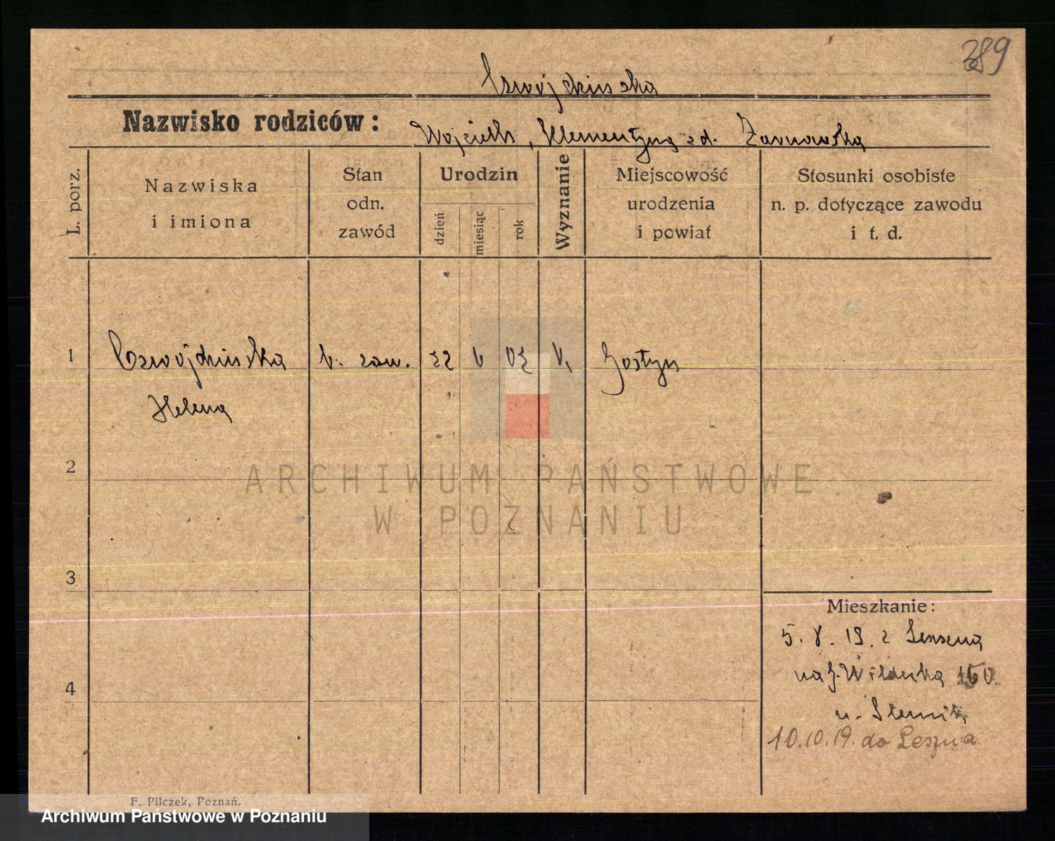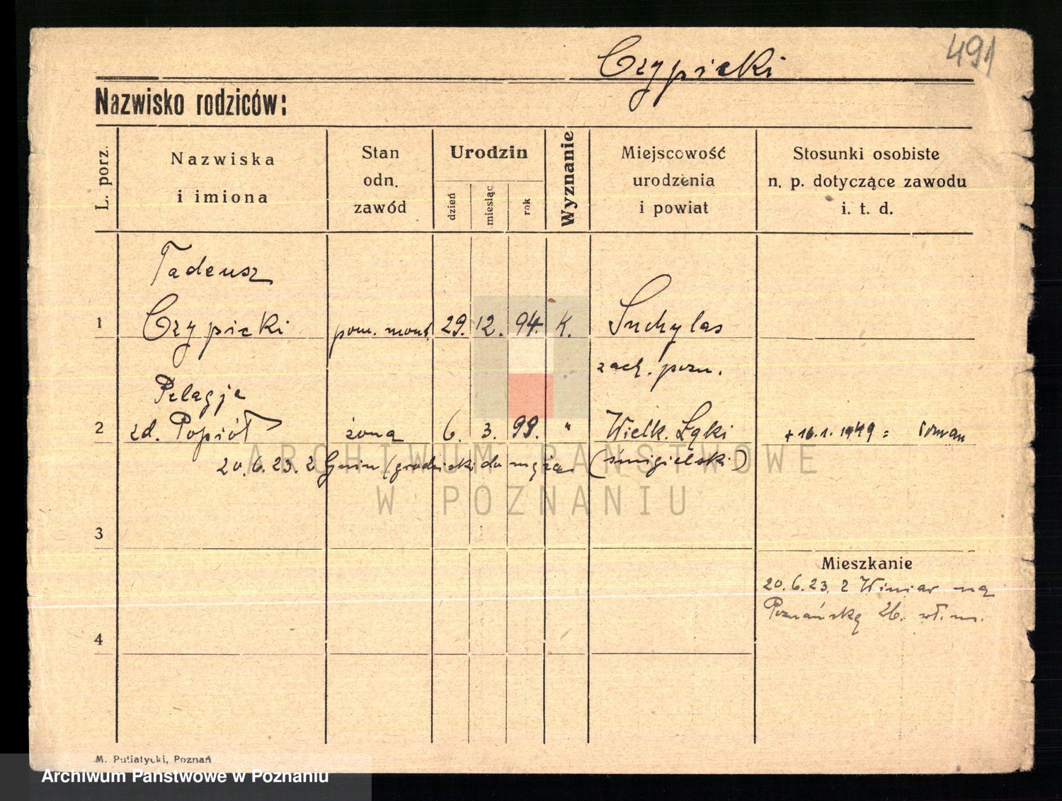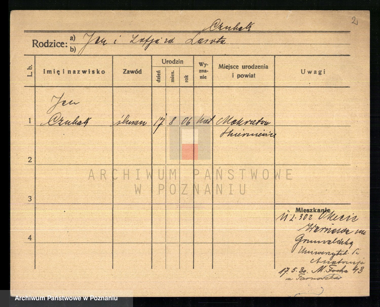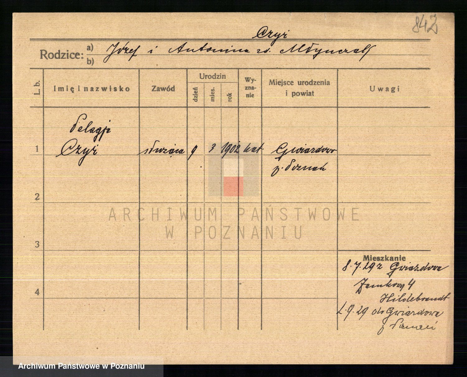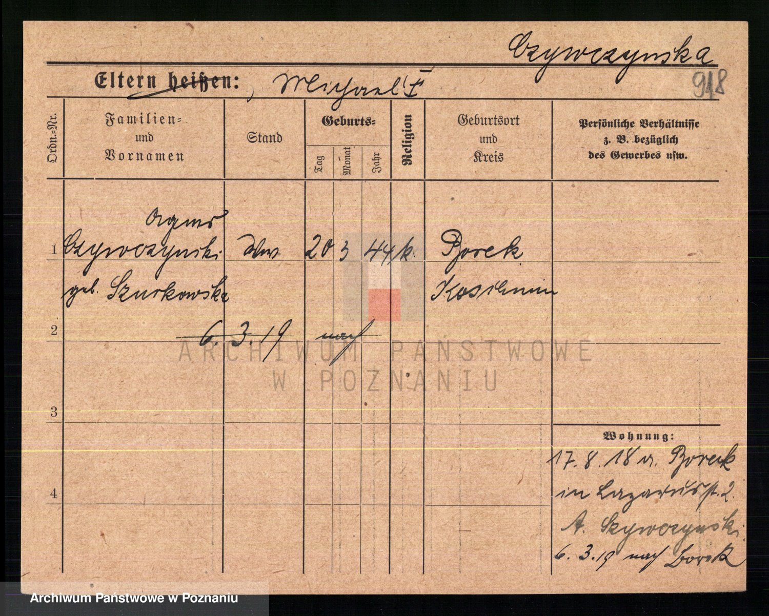 Podgląd karty osobowej dostępny jest po kliknięciu na nazwisko lub ikonkę karty. Można dokonywać powiększenia (ikony na górze) lub przechodzić między kolejnymi skanami (strzałki po bokach).