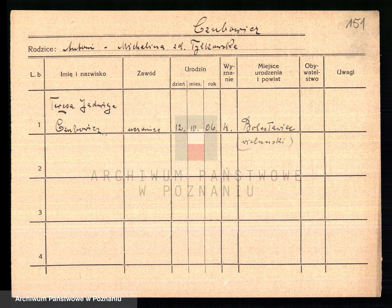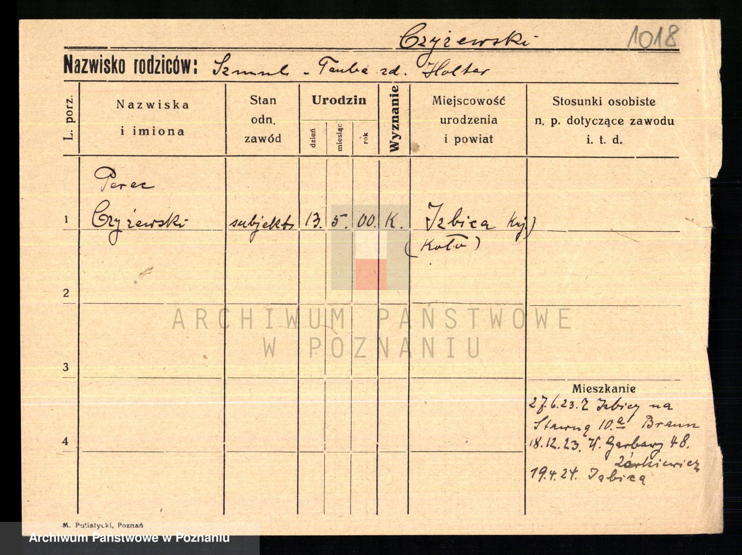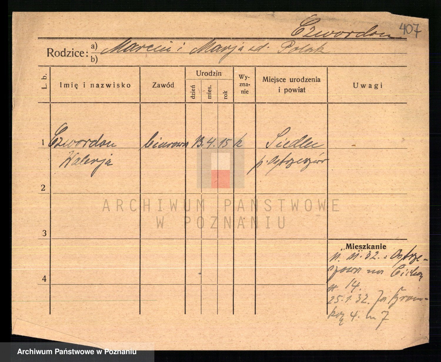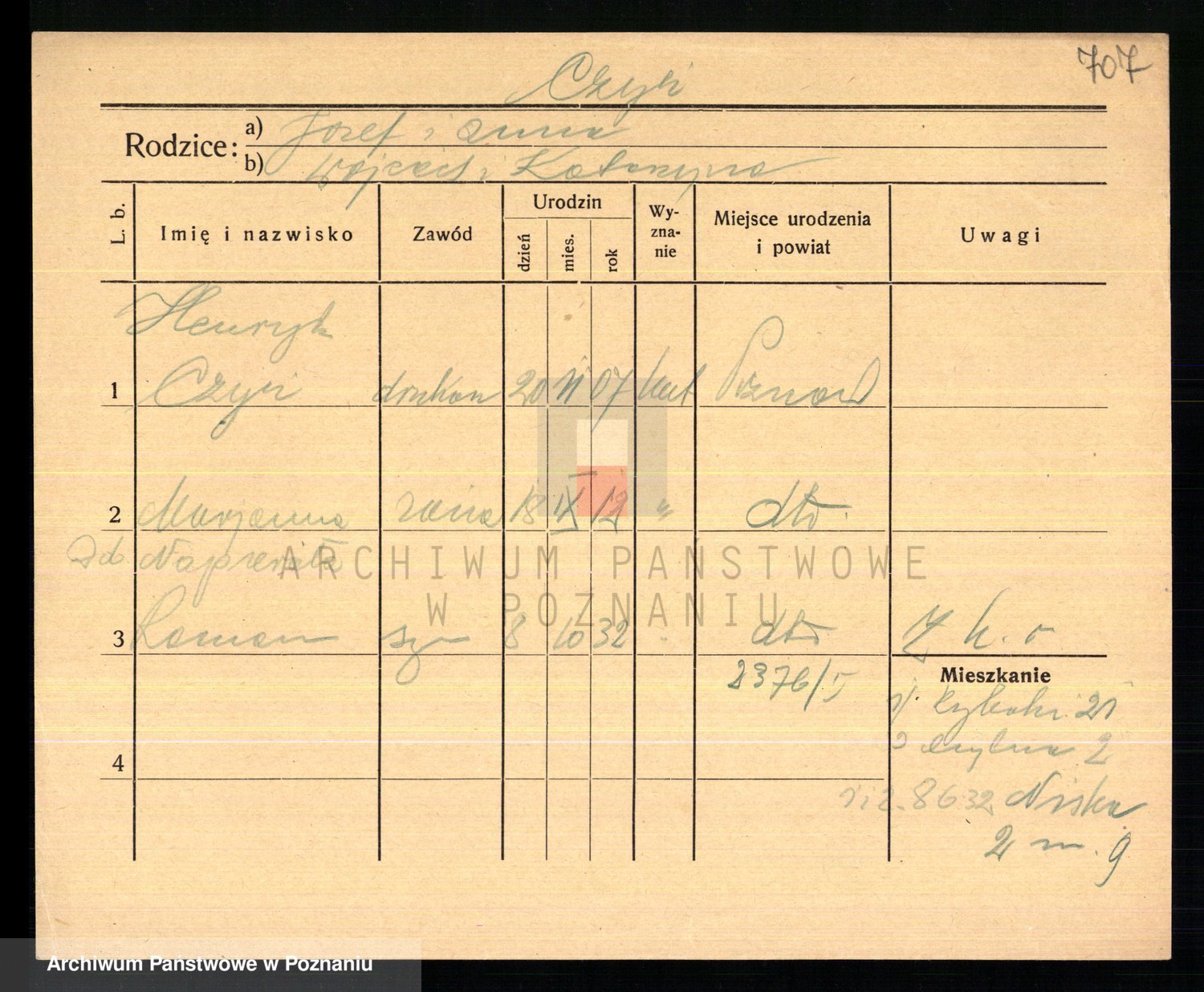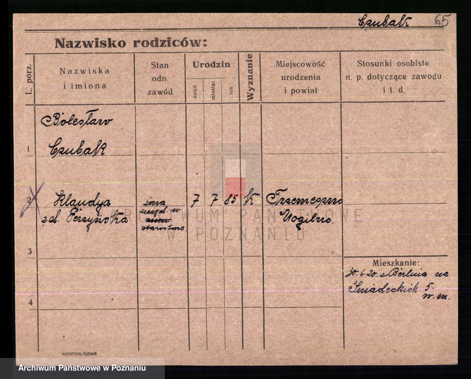 Podgląd karty osobowej dostępny jest po kliknięciu na nazwisko lub ikonkę karty. Można dokonywać powiększenia (ikony na górze) lub przechodzić między kolejnymi skanami (strzałki po bokach).