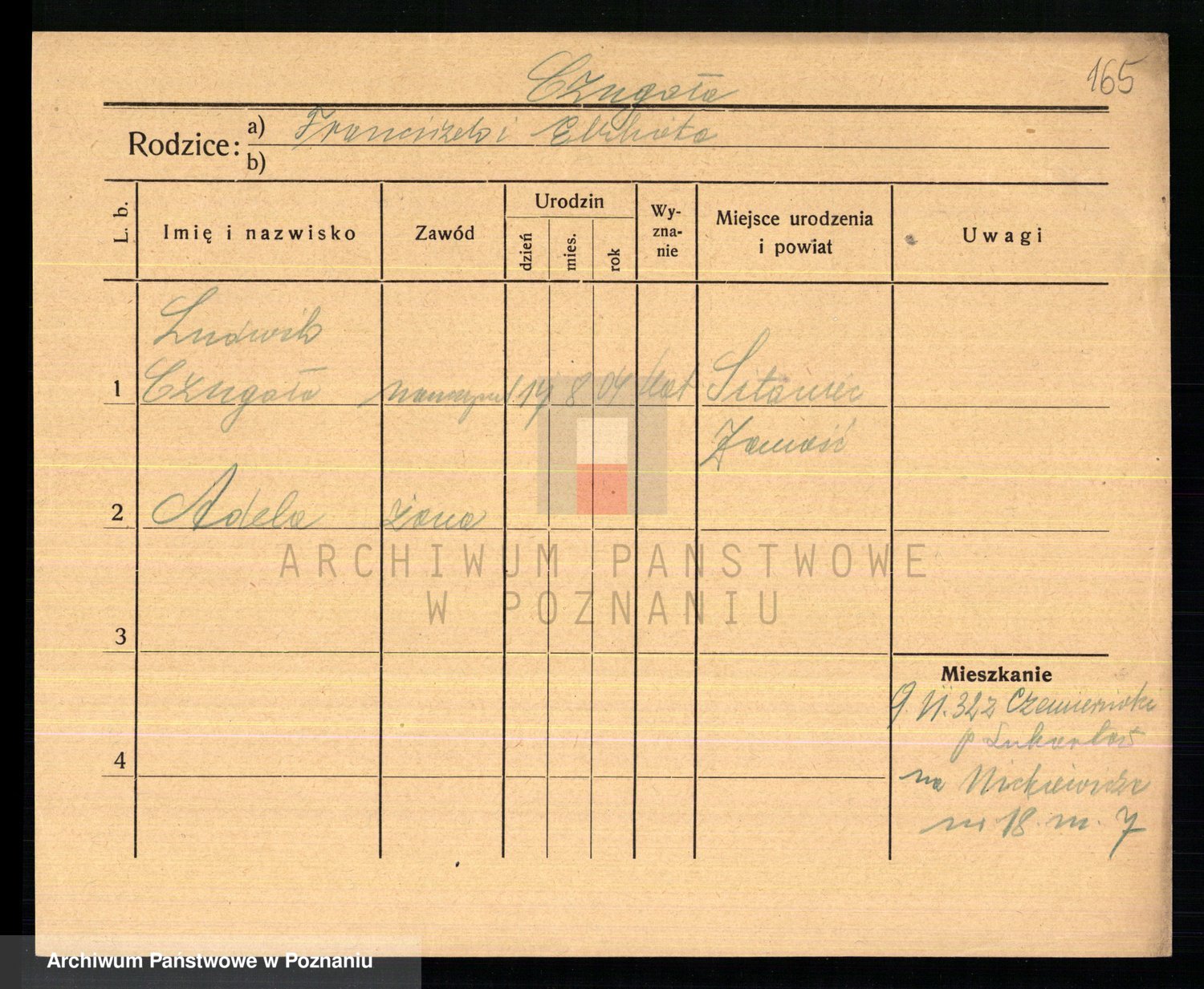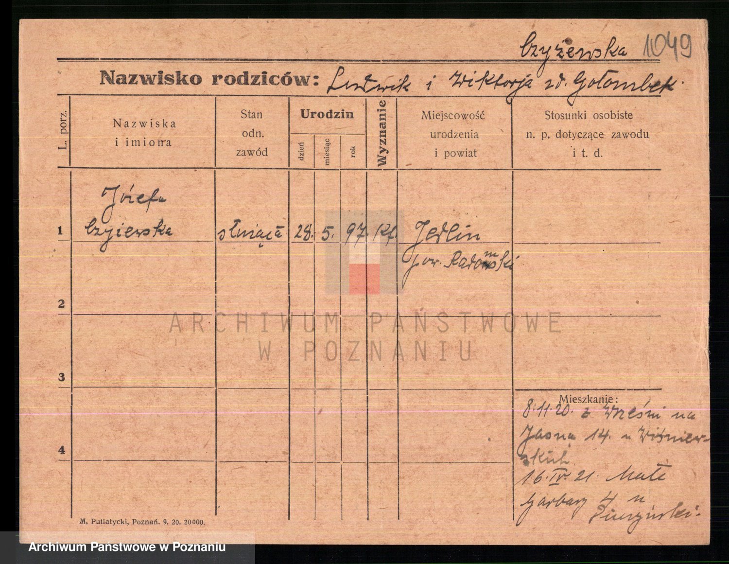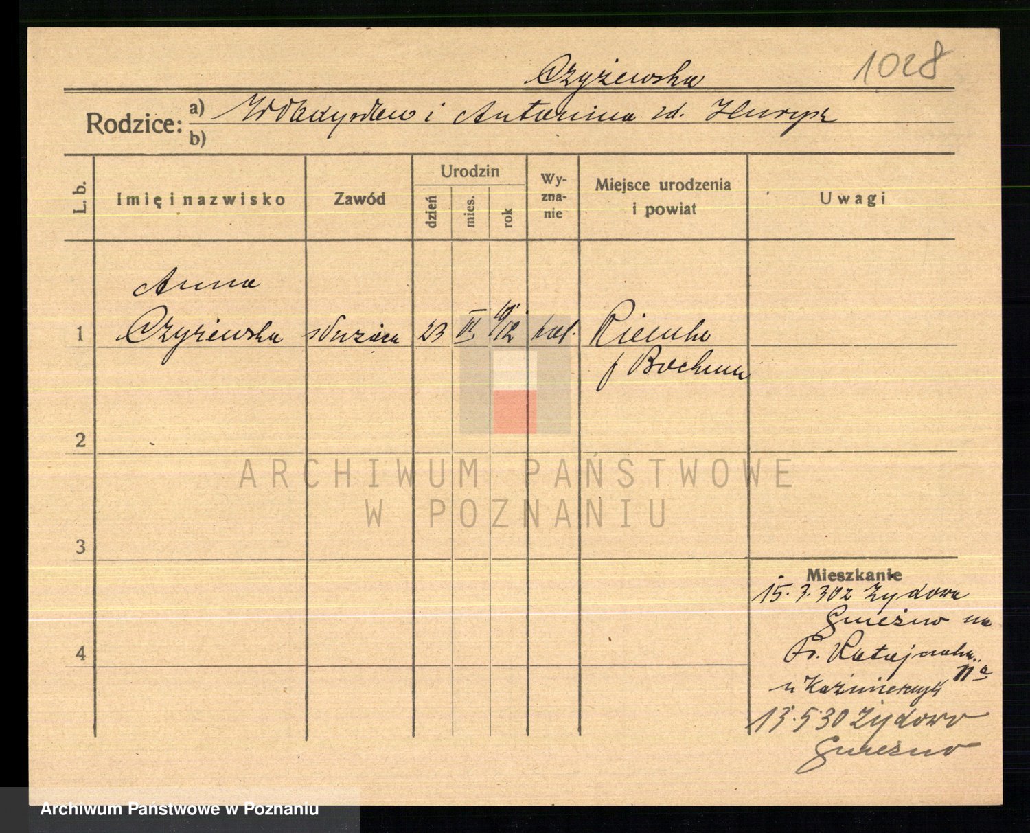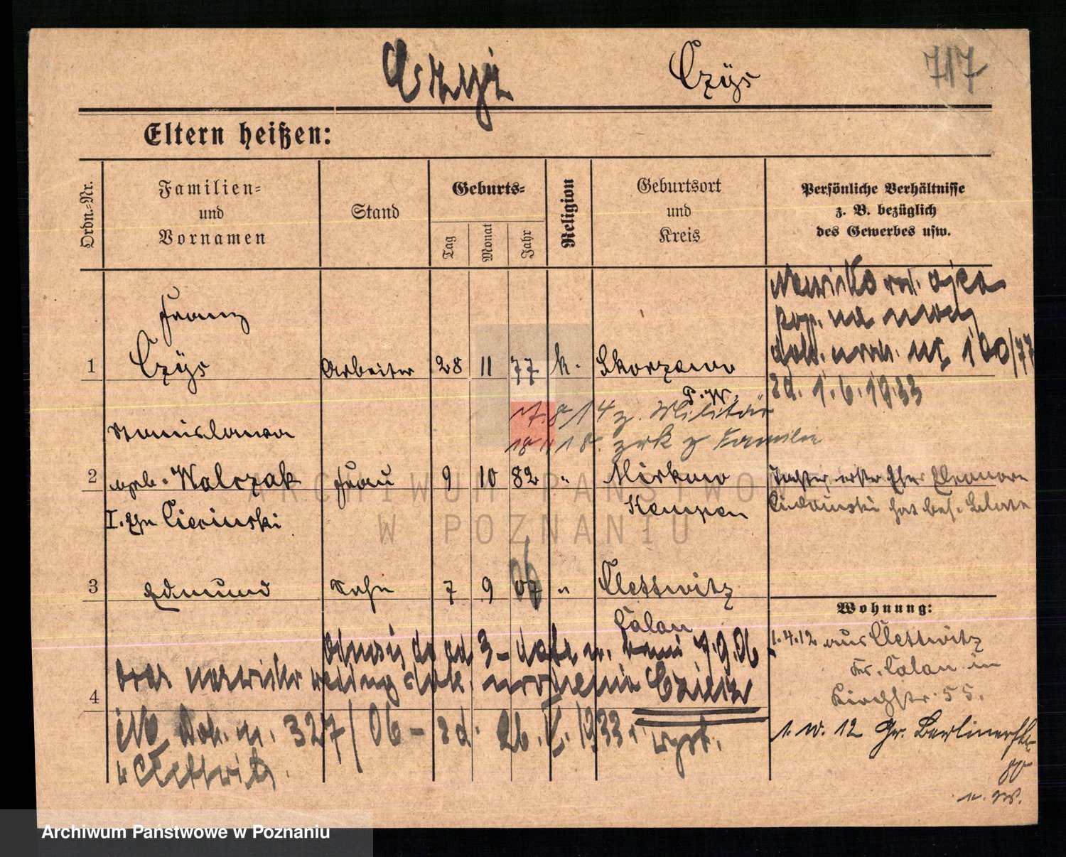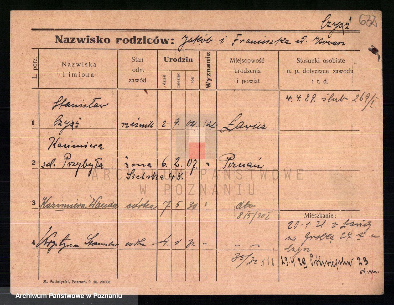 Podgląd karty osobowej dostępny jest po kliknięciu na nazwisko lub ikonkę karty. Można dokonywać powiększenia (ikony na górze) lub przechodzić między kolejnymi skanami (strzałki po bokach).