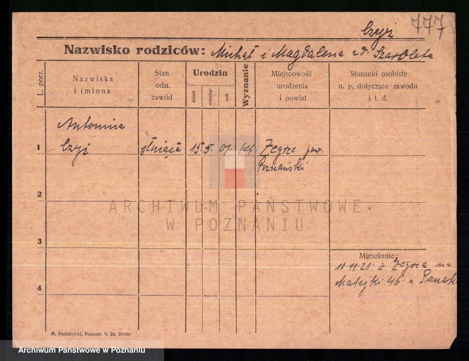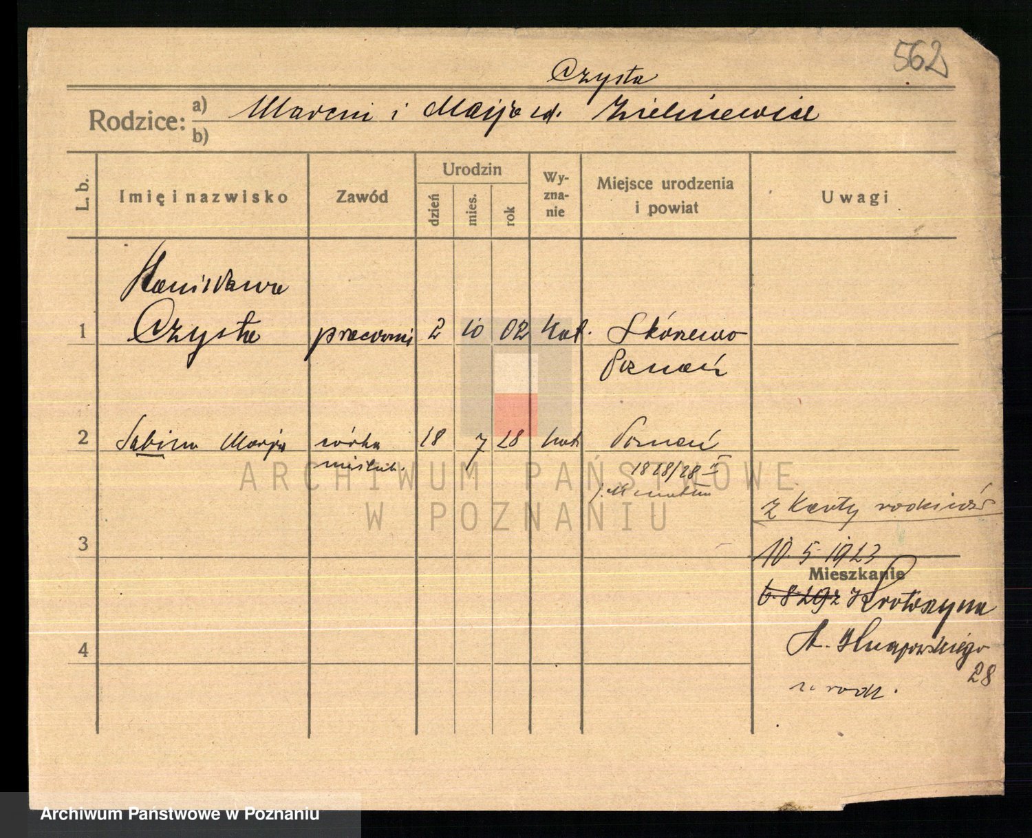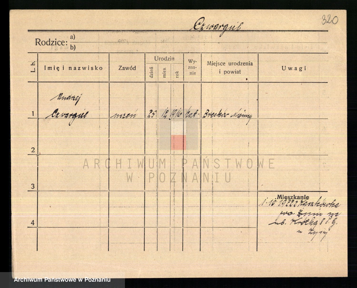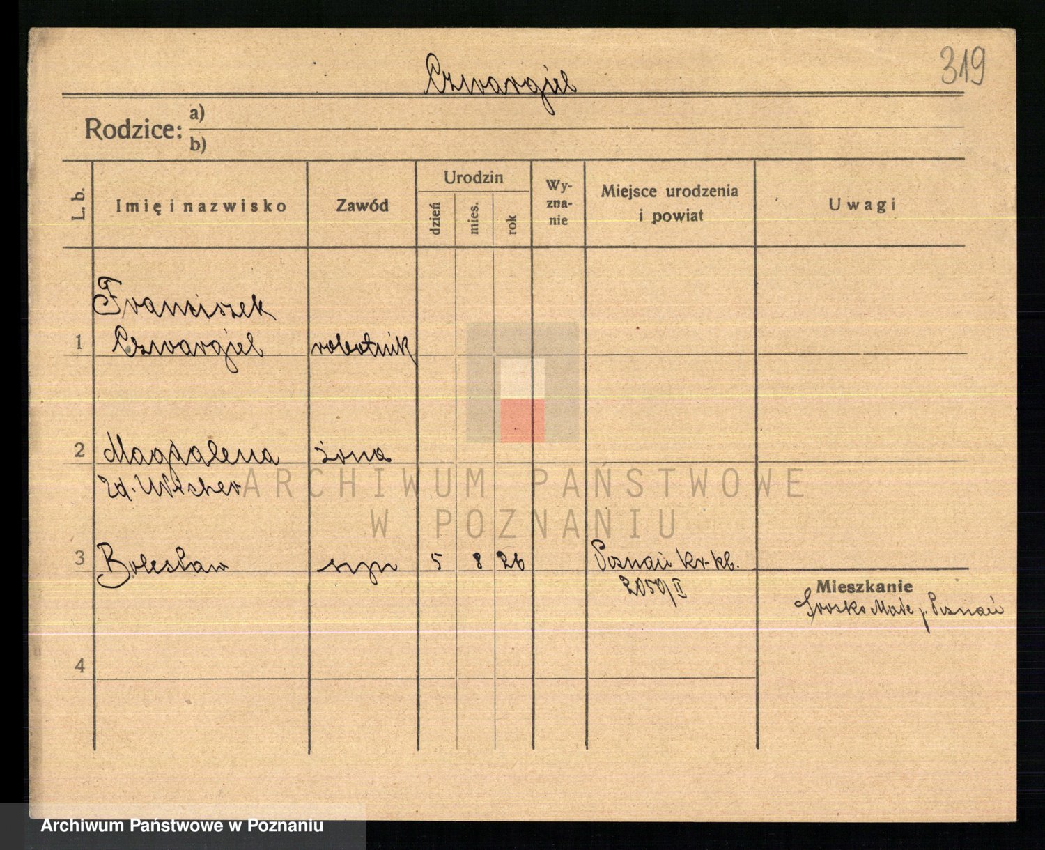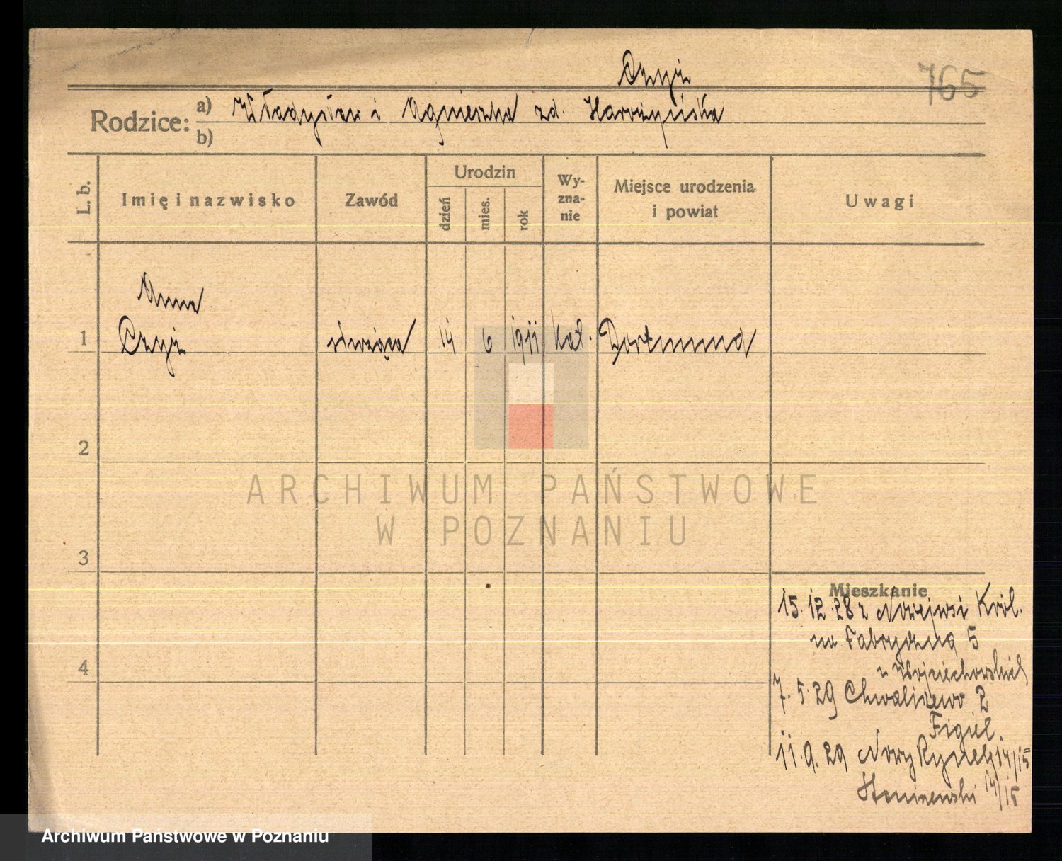 Podgląd karty osobowej dostępny jest po kliknięciu na nazwisko lub ikonkę karty. Można dokonywać powiększenia (ikony na górze) lub przechodzić między kolejnymi skanami (strzałki po bokach).