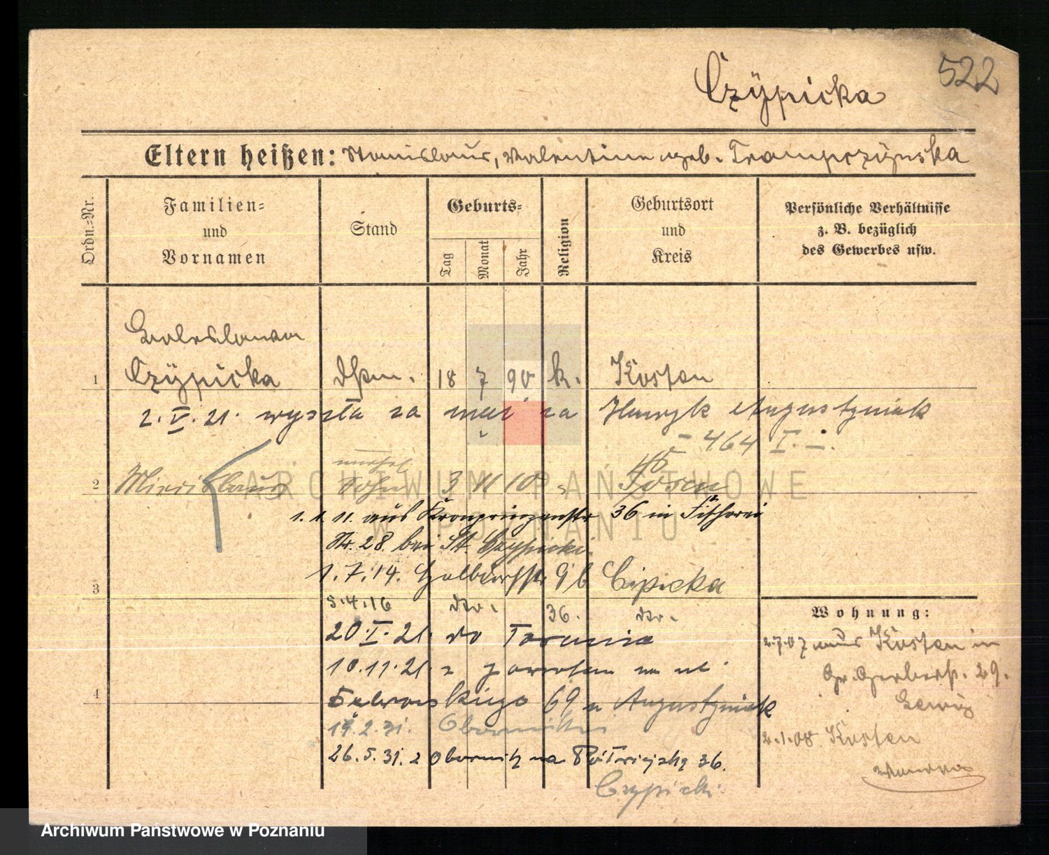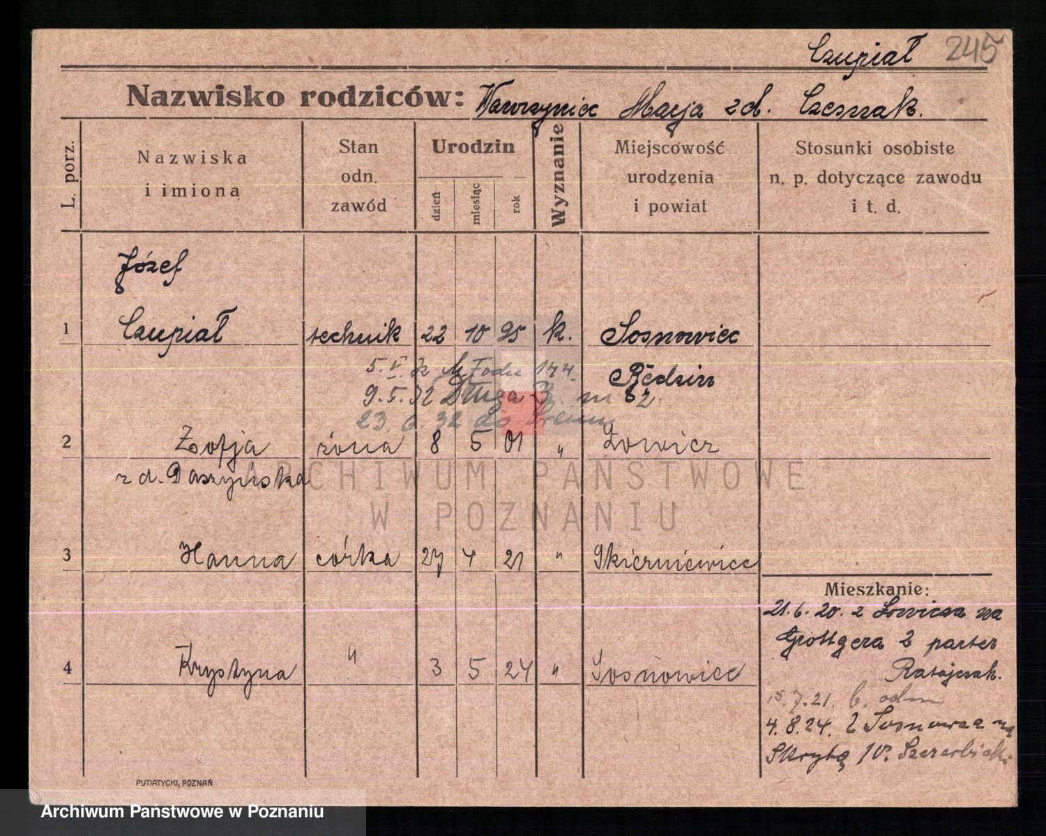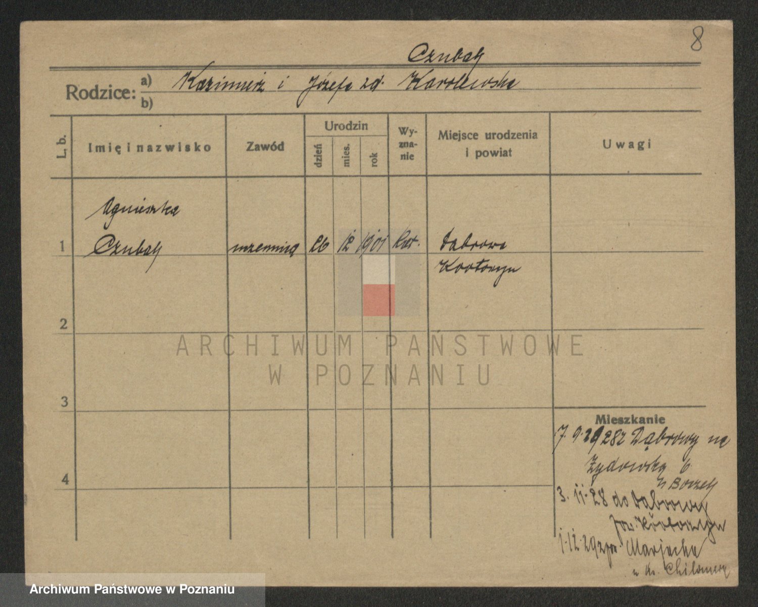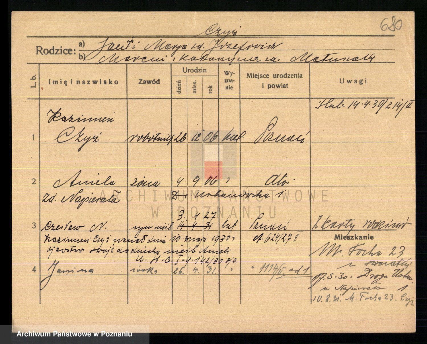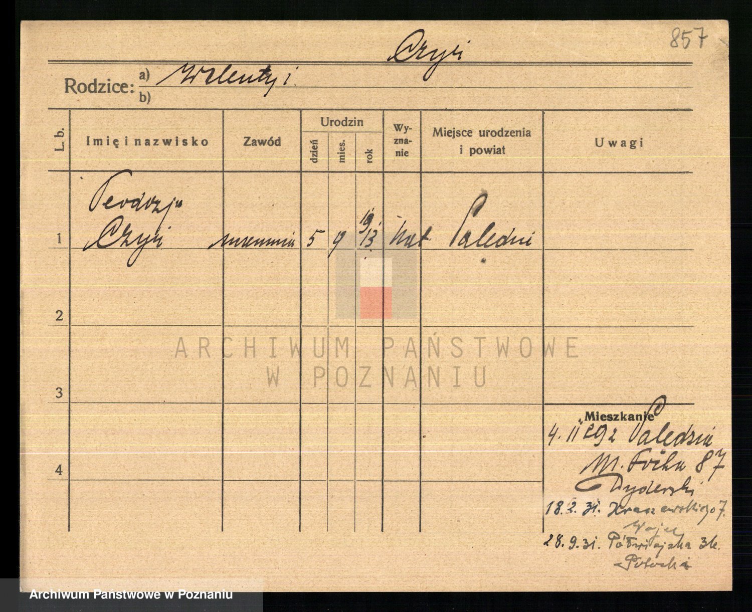 Podgląd karty osobowej dostępny jest po kliknięciu na nazwisko lub ikonkę karty. Można dokonywać powiększenia (ikony na górze) lub przechodzić między kolejnymi skanami (strzałki po bokach).