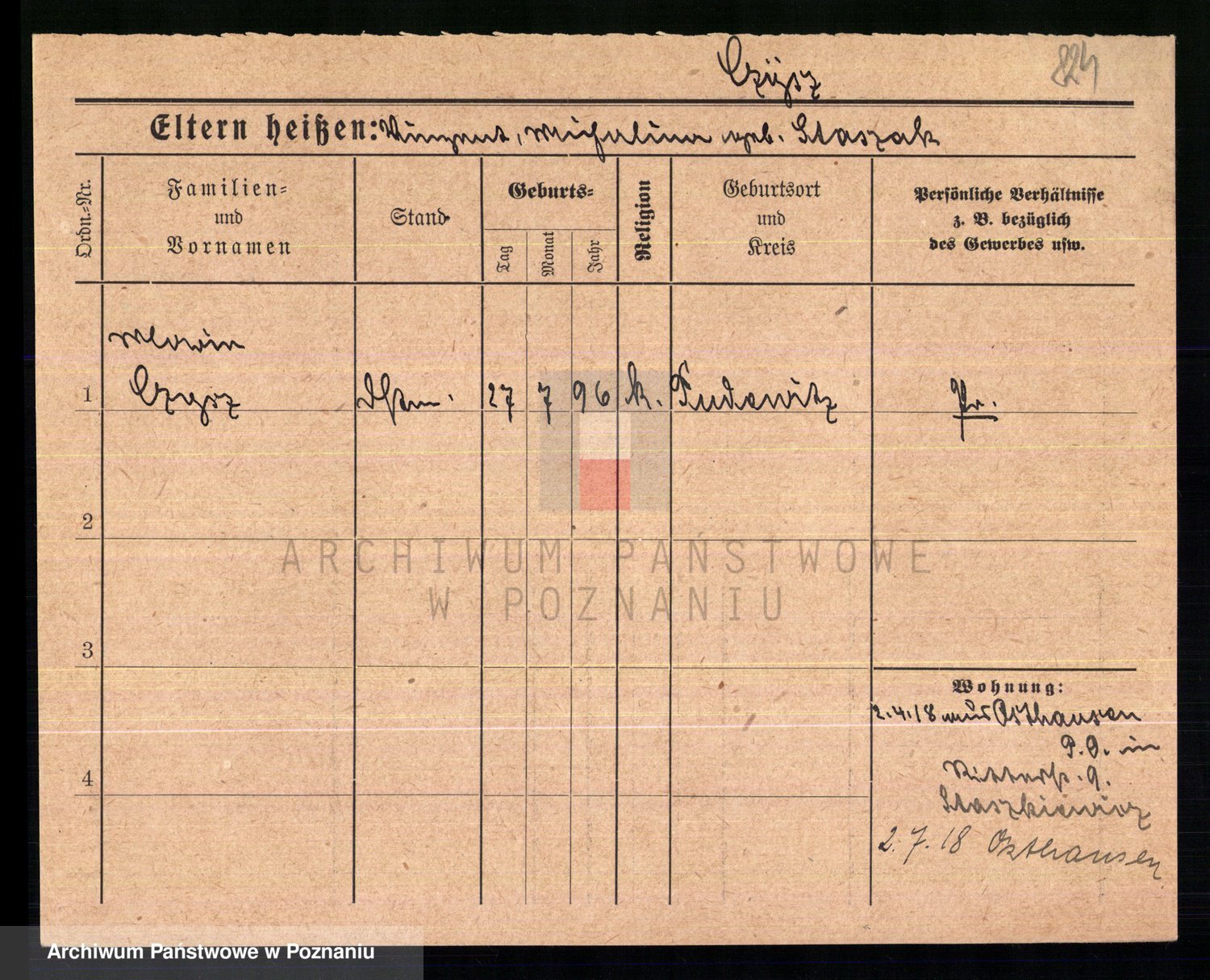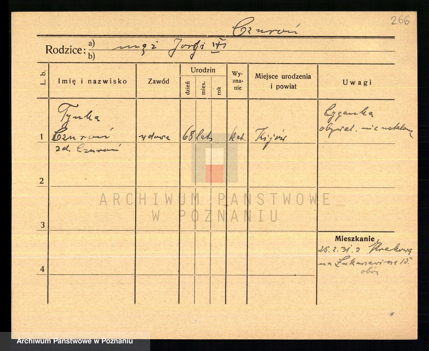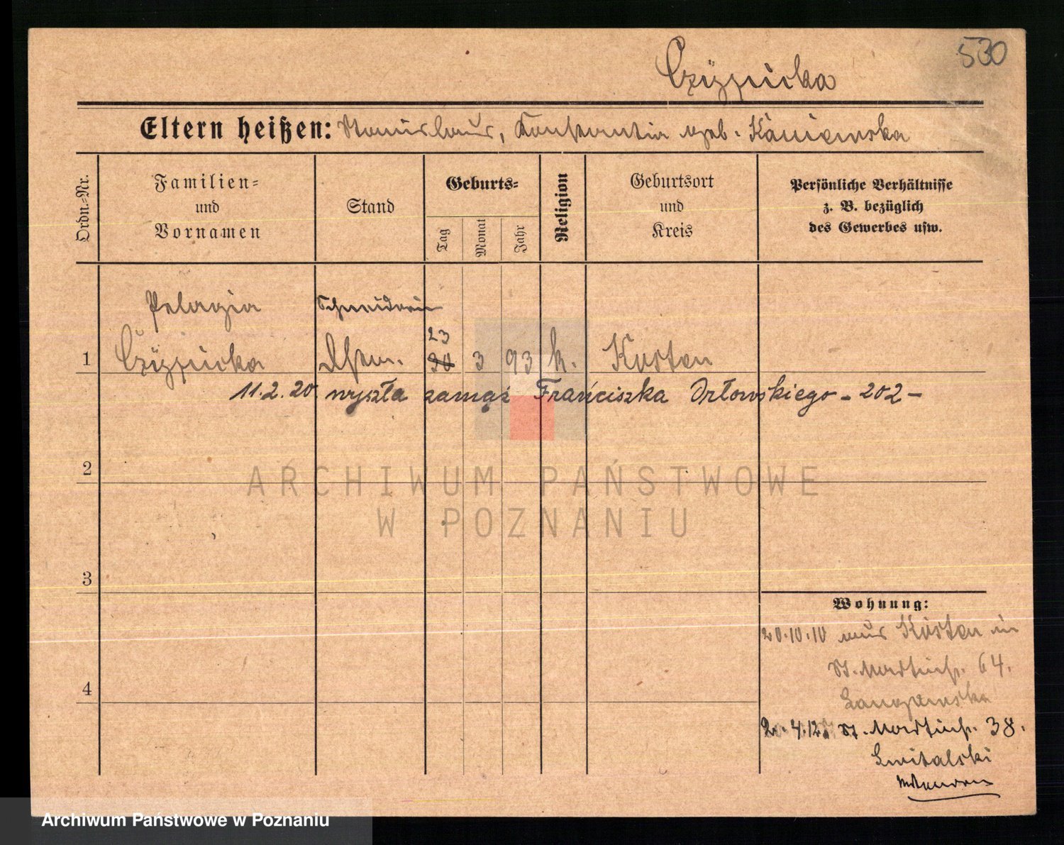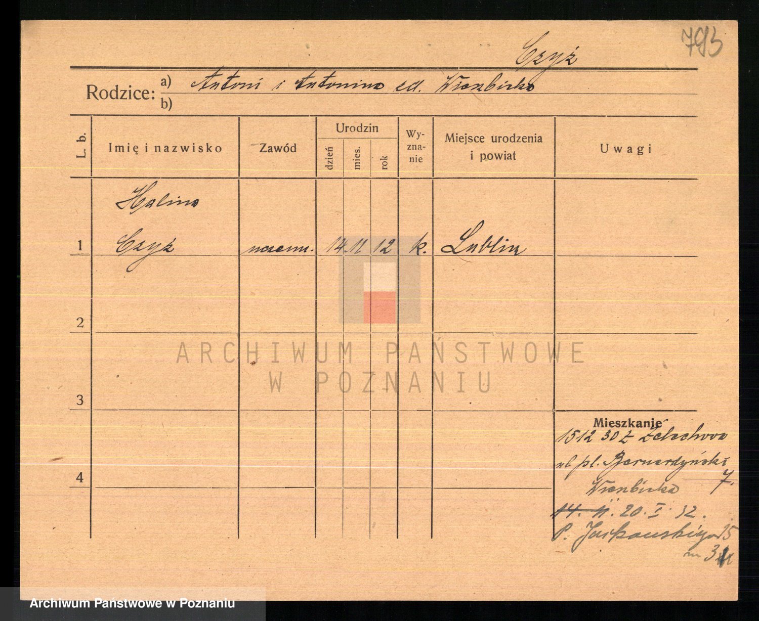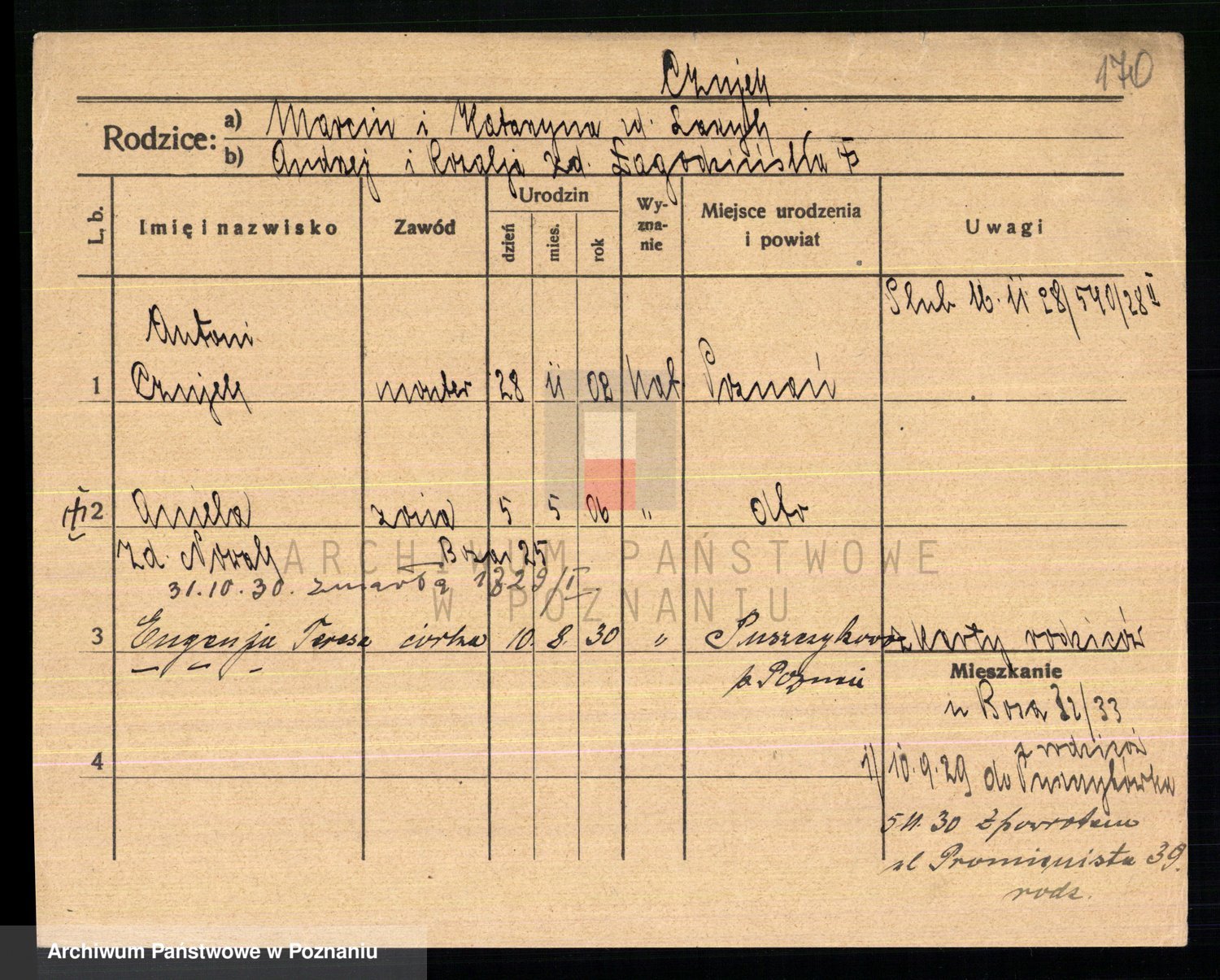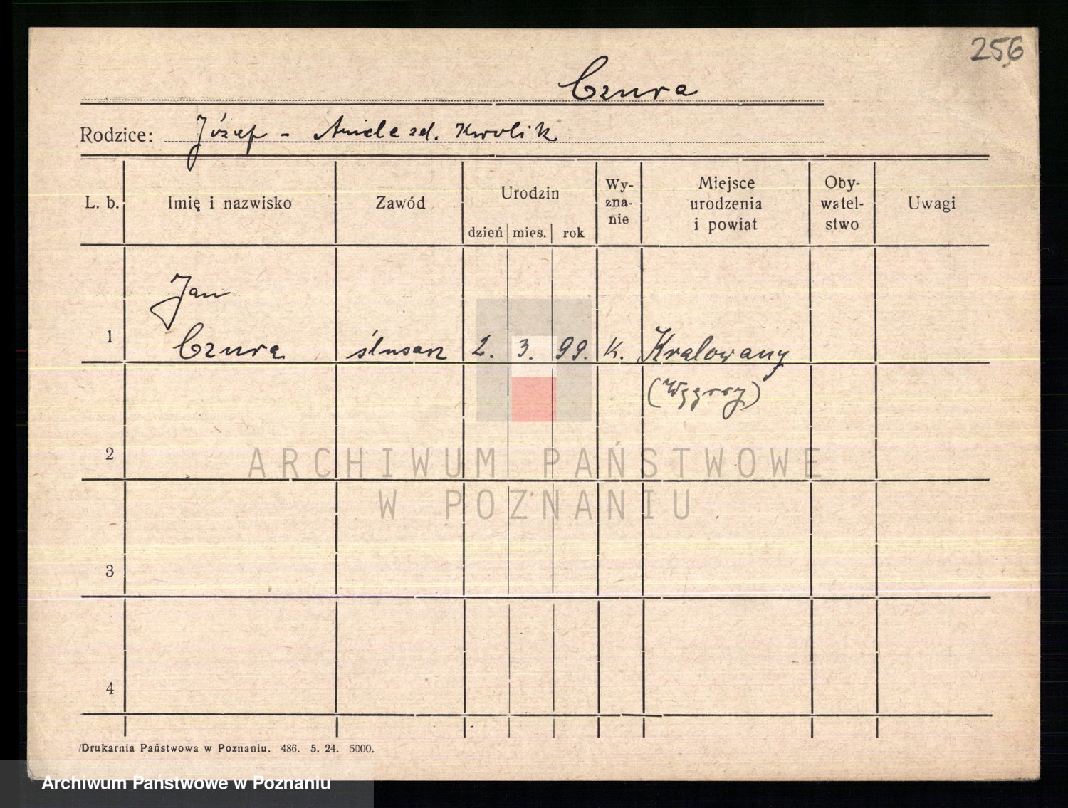 Podgląd karty osobowej dostępny jest po kliknięciu na nazwisko lub ikonkę karty. Można dokonywać powiększenia (ikony na górze) lub przechodzić między kolejnymi skanami (strzałki po bokach).