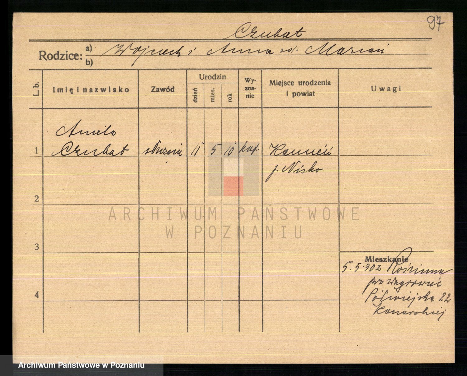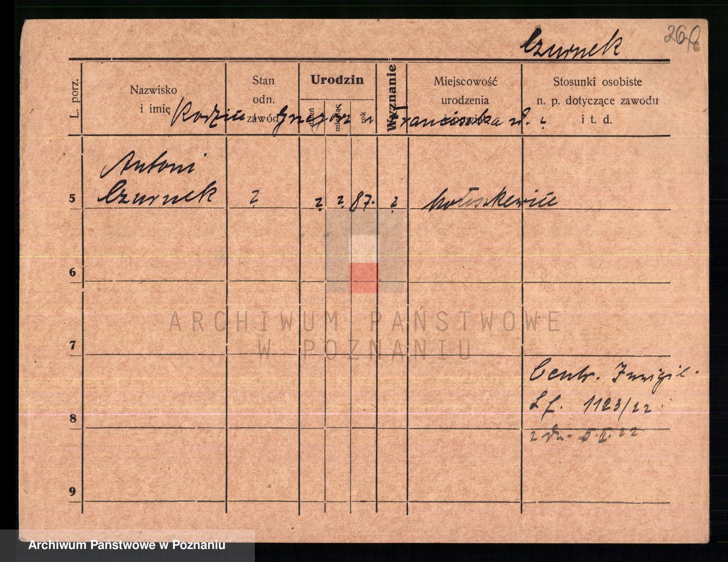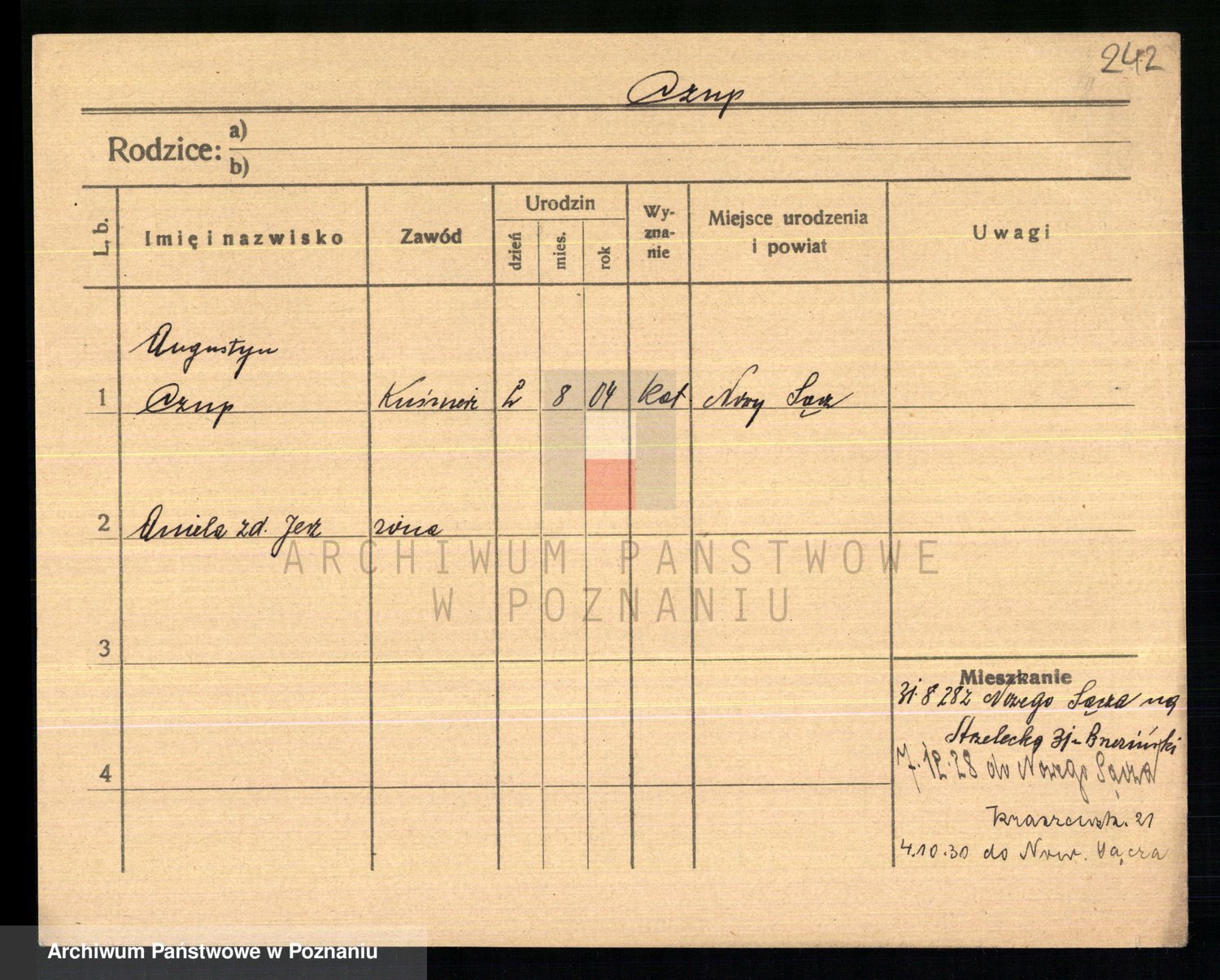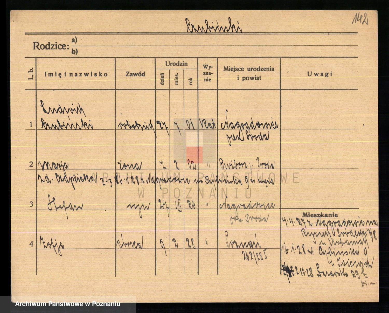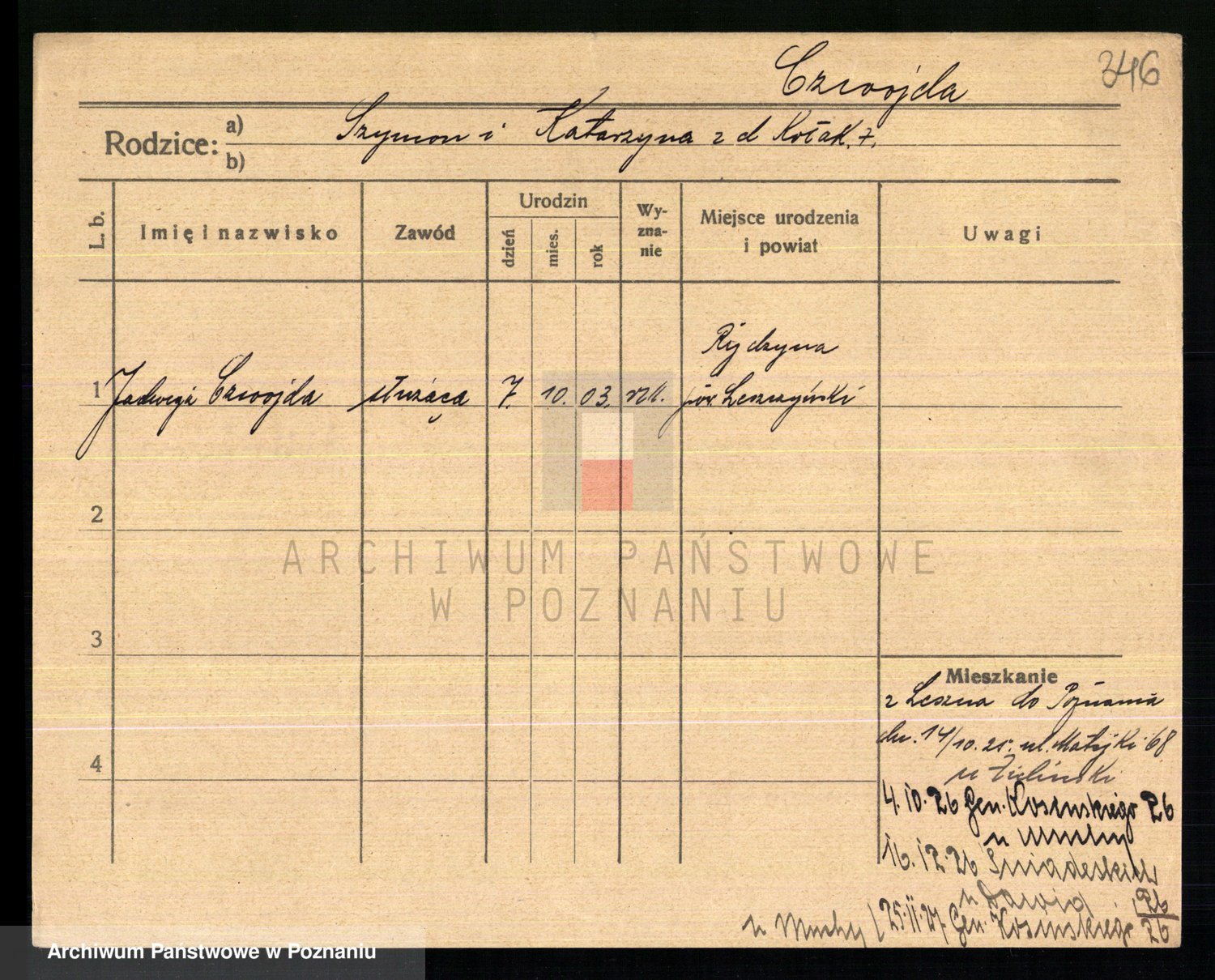 Podgląd karty osobowej dostępny jest po kliknięciu na nazwisko lub ikonkę karty. Można dokonywać powiększenia (ikony na górze) lub przechodzić między kolejnymi skanami (strzałki po bokach).