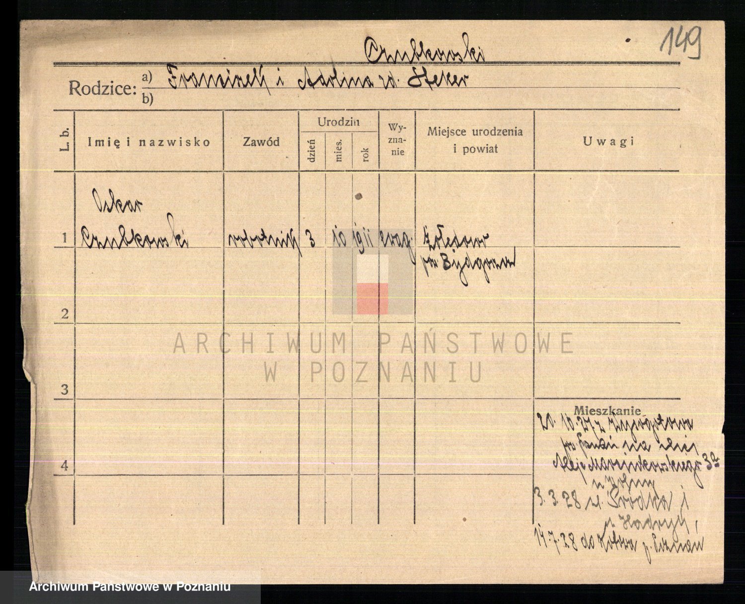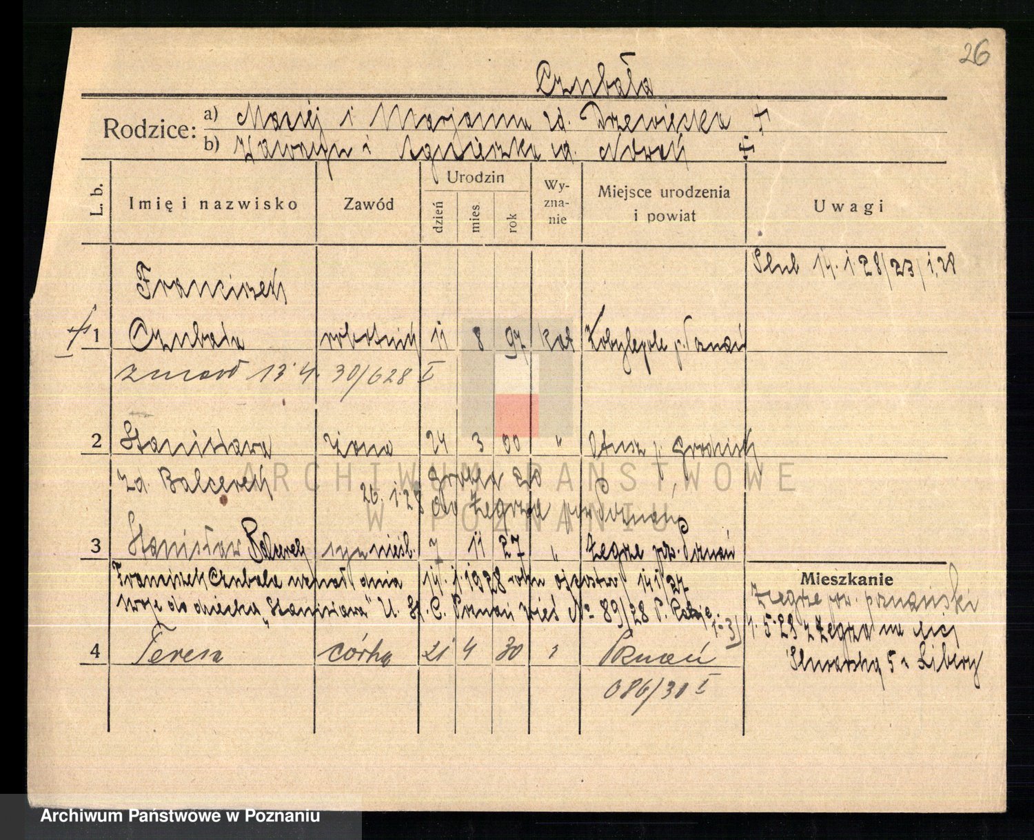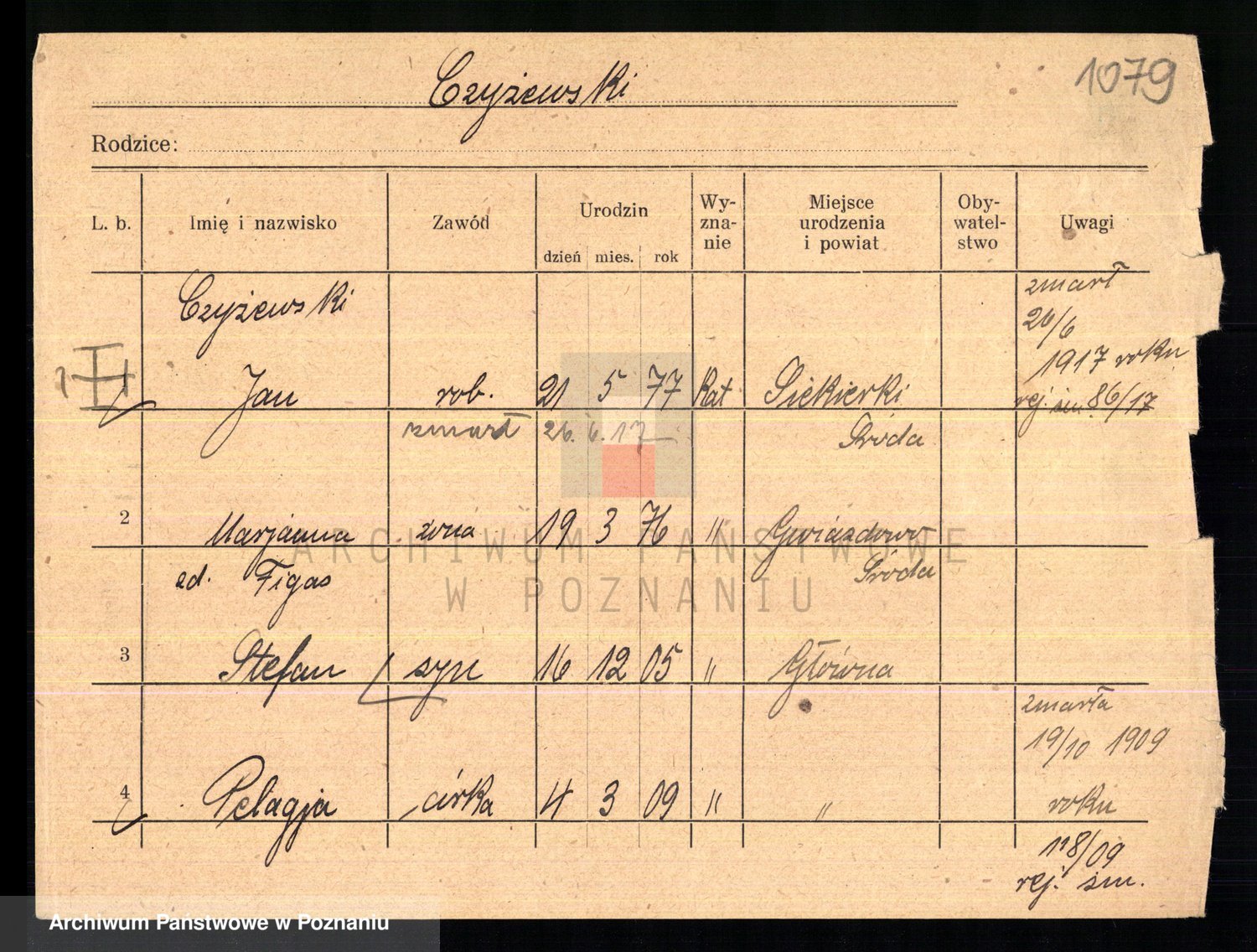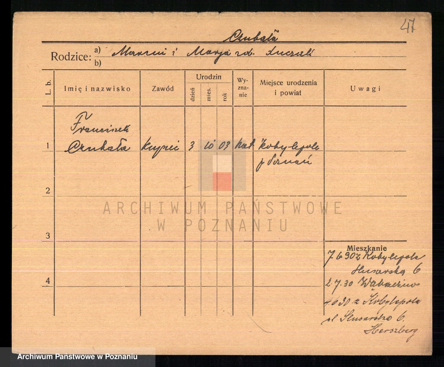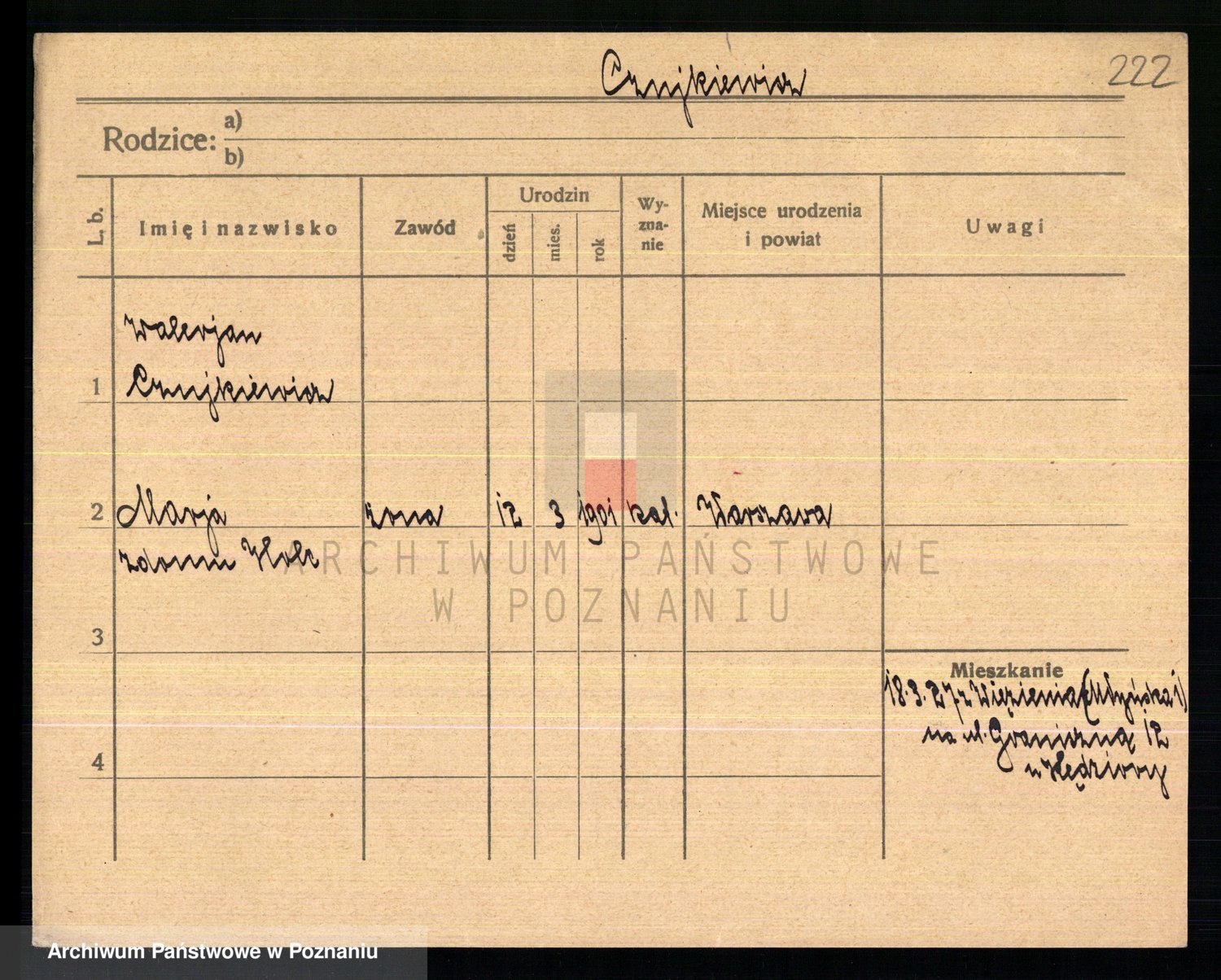 Podgląd karty osobowej dostępny jest po kliknięciu na nazwisko lub ikonkę karty. Można dokonywać powiększenia (ikony na górze) lub przechodzić między kolejnymi skanami (strzałki po bokach).