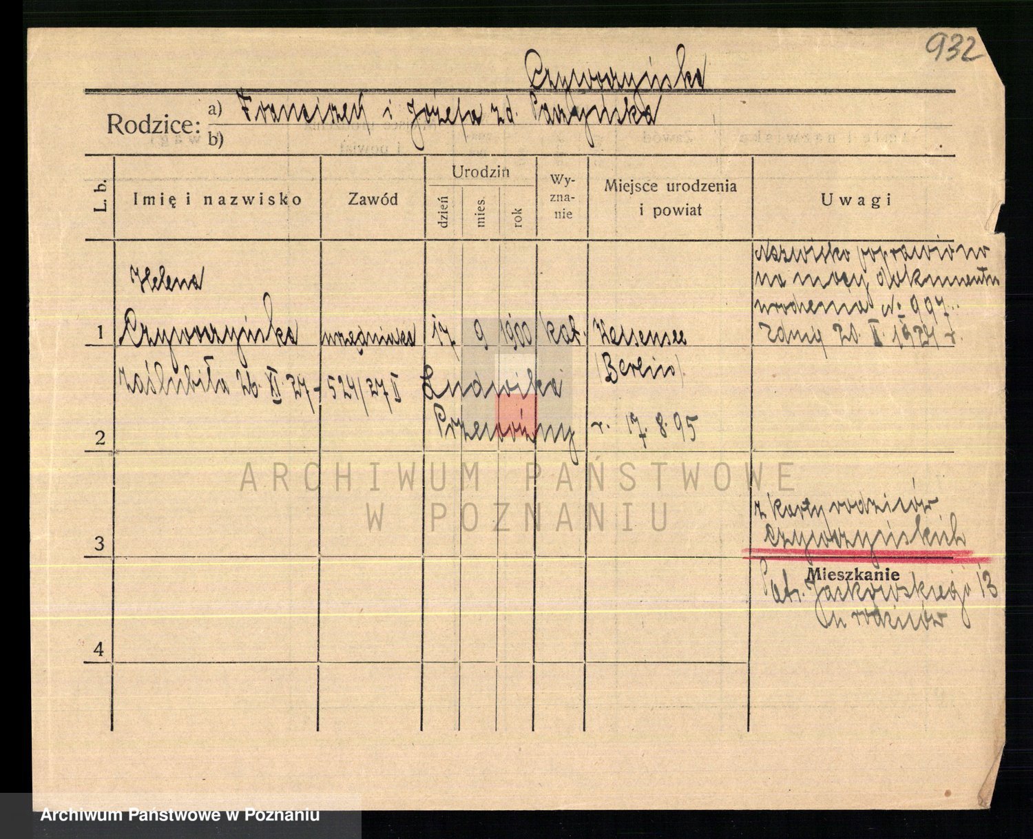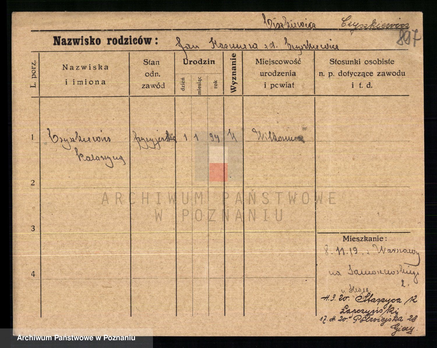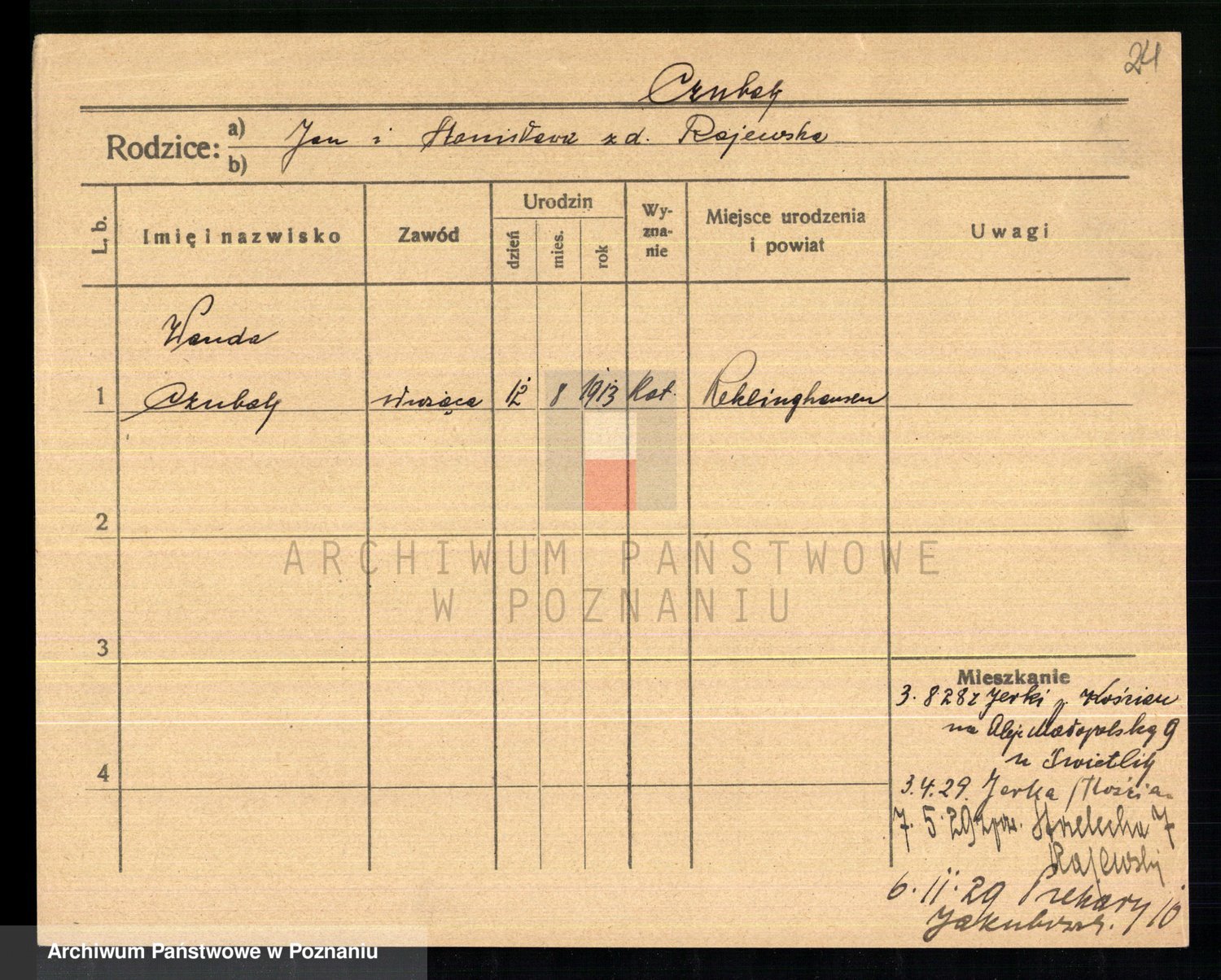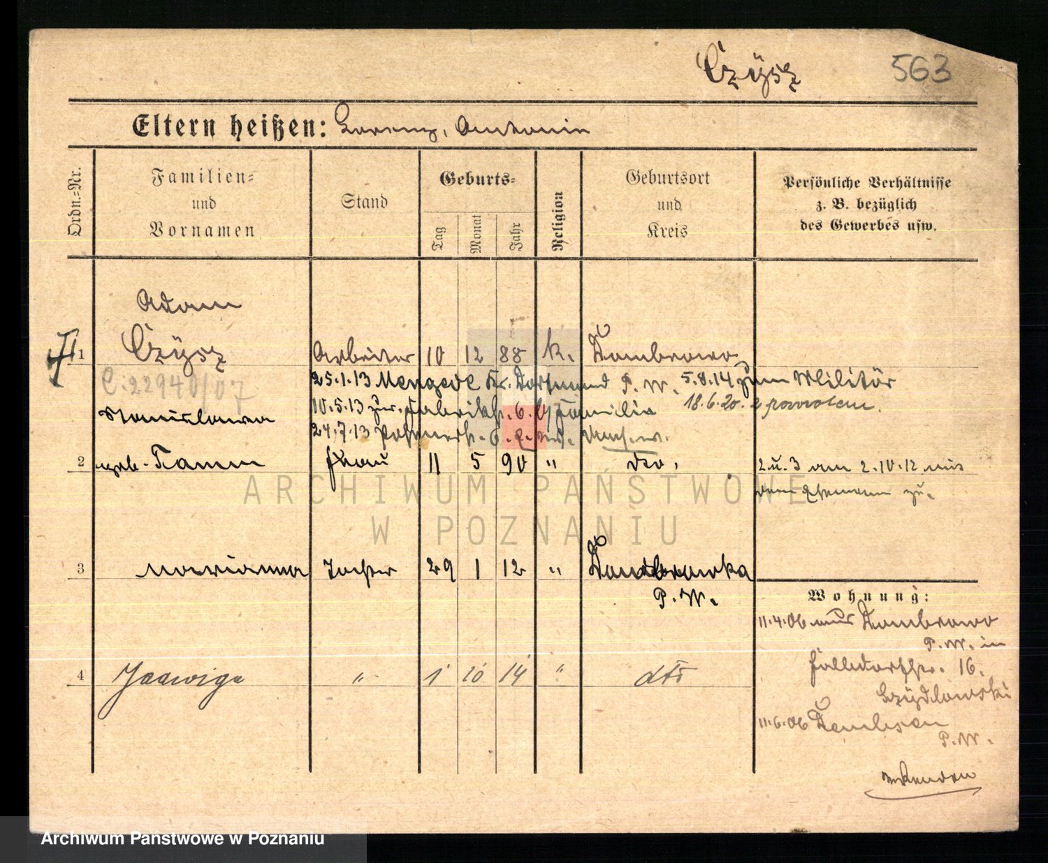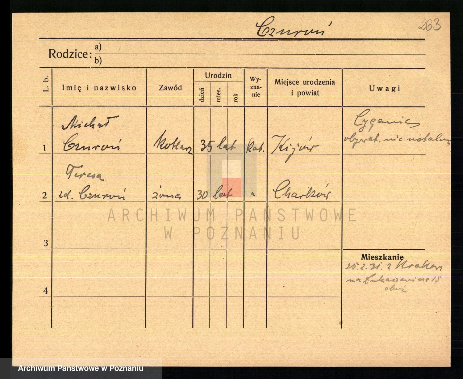 Podgląd karty osobowej dostępny jest po kliknięciu na nazwisko lub ikonkę karty. Można dokonywać powiększenia (ikony na górze) lub przechodzić między kolejnymi skanami (strzałki po bokach).