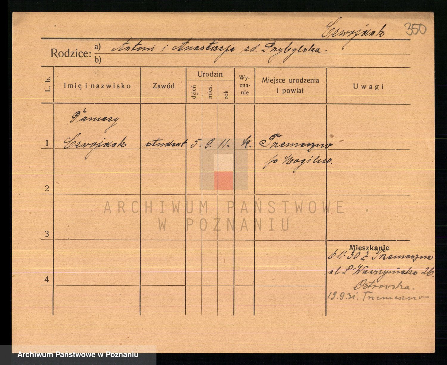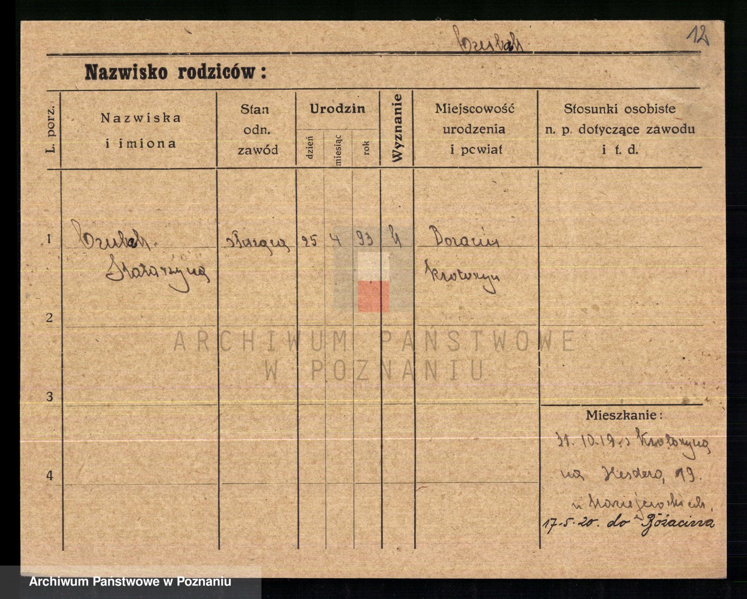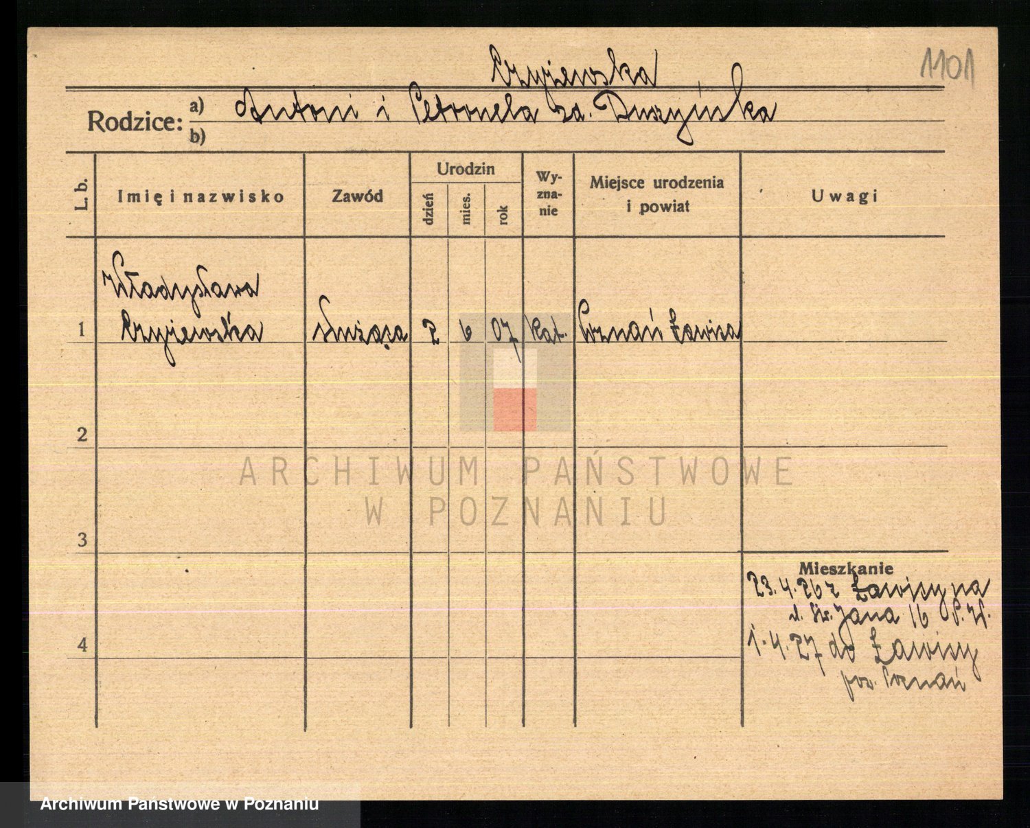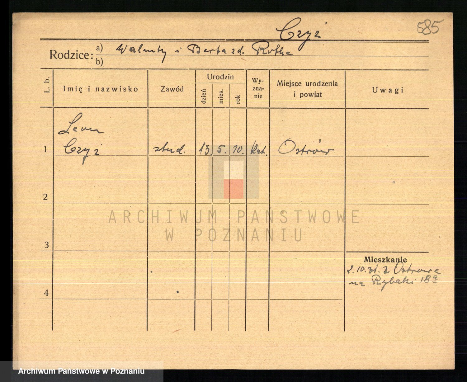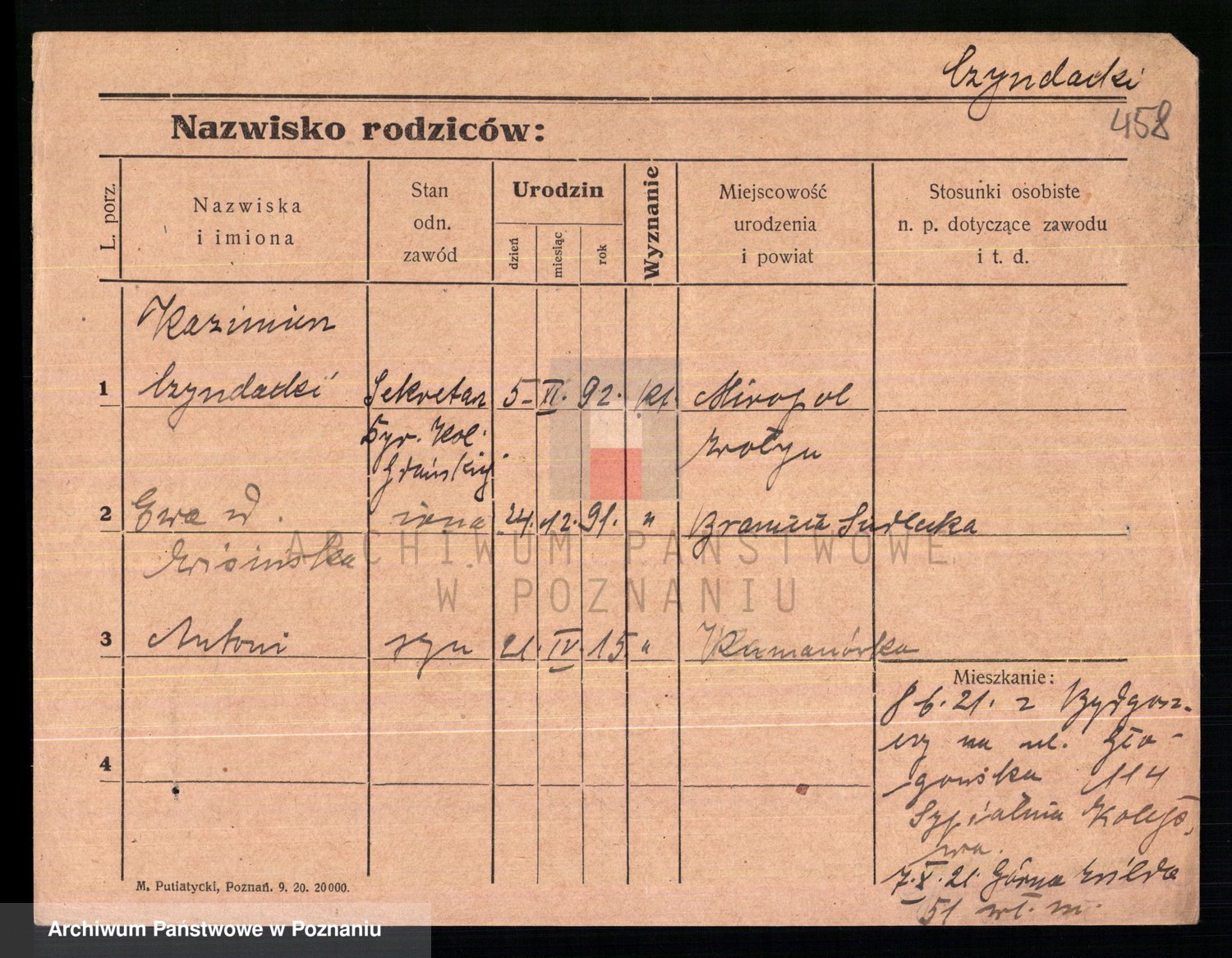 Podgląd karty osobowej dostępny jest po kliknięciu na nazwisko lub ikonkę karty. Można dokonywać powiększenia (ikony na górze) lub przechodzić między kolejnymi skanami (strzałki po bokach).